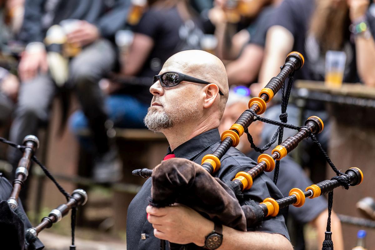 Ich habe Donnerstag Freunde auf dem Campingplatz A besucht und hatte das Glück den ersten musikalischen Auftakt auf dem Festivl miterleben zu dürfen. Eine Handvoll Musiker von der Gruppe Barbarossa Pipes & Drums spielen auf dem Campingplatz ein kurzes Stück und ziehen dann runter zur Bühne. Zusammen mit dem Rest der Gruppe begeben sich die Musiker geschlossen in die Burg. Vor der Bühne stellt sich die Gruppe kurz vor und spielt dann mehrere Stücke als Opener des Festivals. Dabei spielen sie auf den Dudelsäcken althergebrachten Stücke, wie "Flower of Scottland", und moderne Stücke, wie "Smoke on the Water". Manche der modernen Stücke klappen nicht so ganz auf diesem Instrument, aber unterhaltsam ist es allemal und sie ernten eine Menge Applaus dafür. Für mich ein gelungener Auftakt für die nächsten drei Tage.