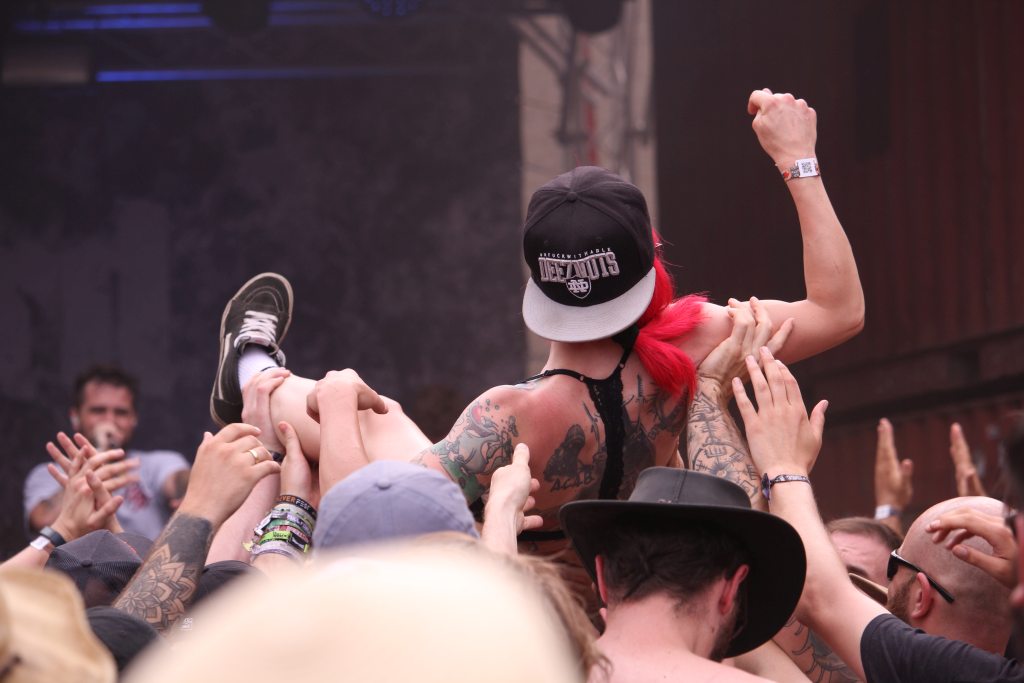 Zum Glück konnte anschließend jegliche Irritation an der Mad Max wieder abgetanzt werden – bei Stick To Your Guns! Das Publikum nahm es dankend an und erschien zahlreich. Die Amis aus Orange County bauten mächtig Druck auf und ließen diesen rücksichtslos auf die feiernde Meute niederprasseln. Insgesamt unglaublich fetter Sound, heftiger Auftritt und geile Stimmung.