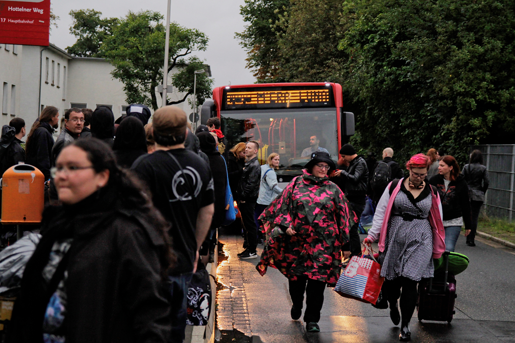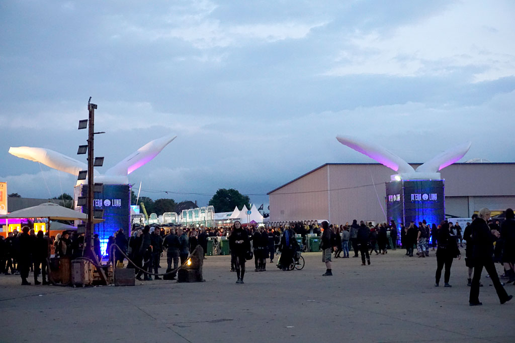 Der Regen hatte das M´era Luna 2017 fest im Griff. Bereits vor Beginn des 17. Familientreffens der Schwarzen Szene hatte Starkregen das Festivalgelände am Hildesheimer Flugplatz dermaßen aufgeweicht, dass sich die Anreise schwierig gestaltete. Festgefahrene Wohnmobile und die darauffolgende Rolle rückwärts der Veranstalter, die weiteren Anreisenden spontan umzuleiten, bescherten ganz Hildesheim verstopfte Straßen und der A7 zudem einen 10 km Stau. Am Abend gab es zur Entlastung die mehr als gut besuchte Lesung von Markus Heitz, Alexander Wohnhaas (Megaherz) und Christian von Aster. Anschließend bat das M´era Luna-Team zur obligatorischen Warm-Up Disko.