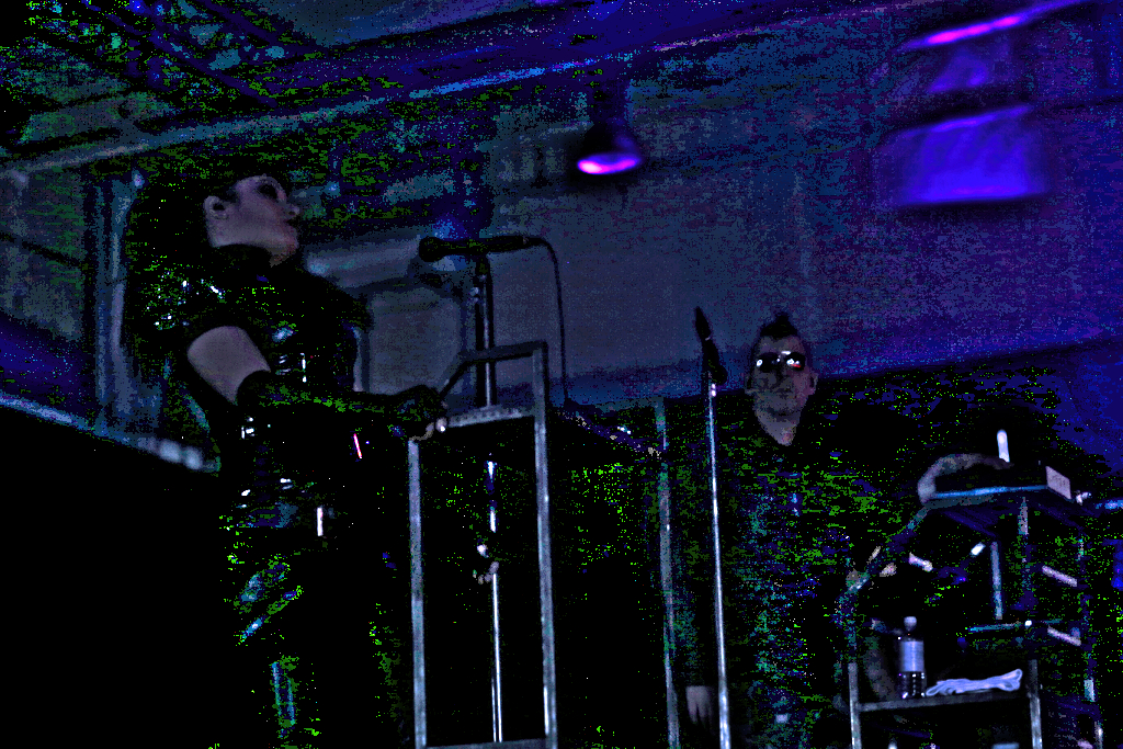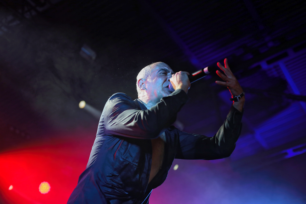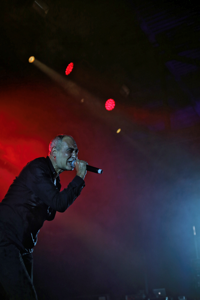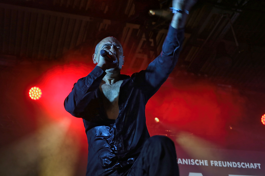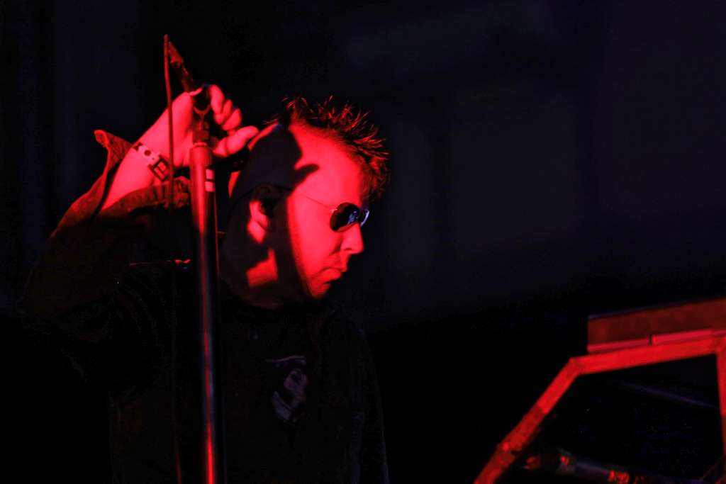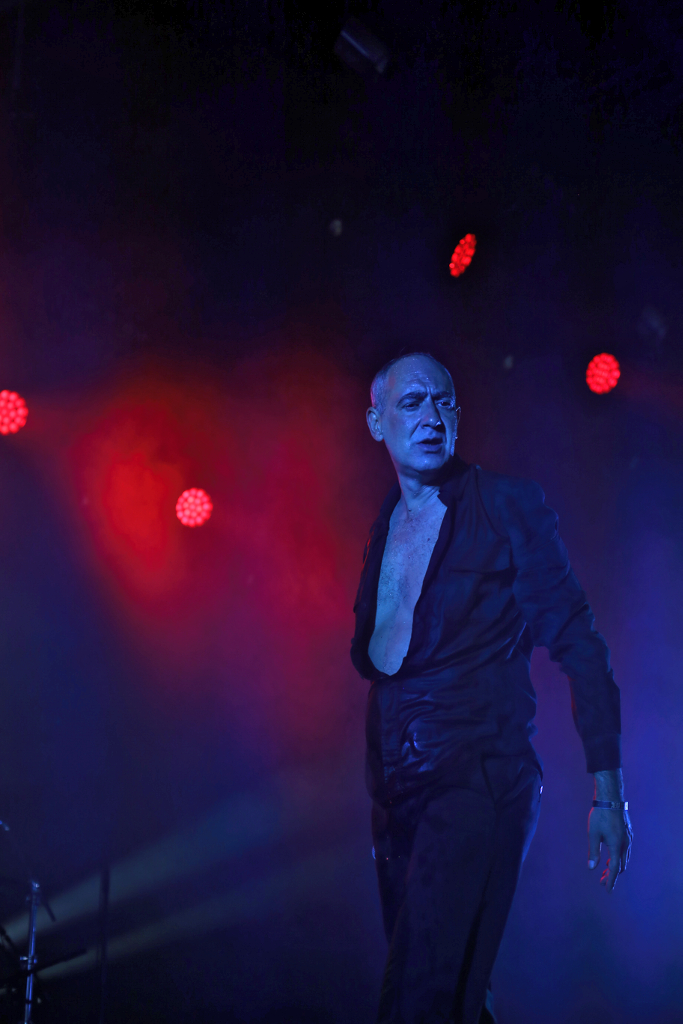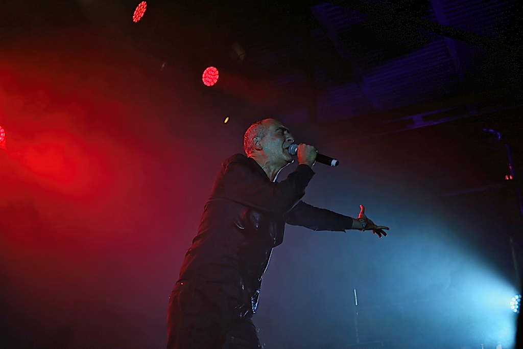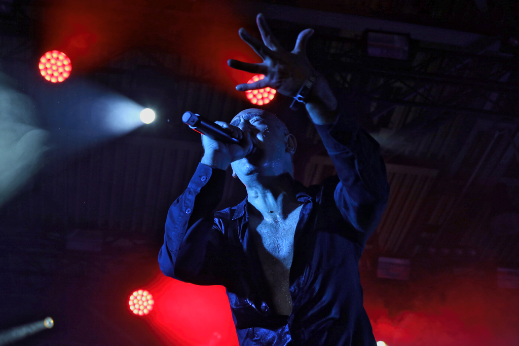 Und dann gings weiter im Hangar mit DAF. Die Helden des NDW und Wegbereiter des EBM Gabi Delgado-López und Robert Görl haben nichts von ihrer Dynamik eingebüßt. Gabis Wasserflaschenverbrauch während des Konzerts nimmt dabei allerdings wieder einmal die Ausmaße einer Großfamilie an. Beste Bühnenpräsenz und Dynamik. „Tanz den Mussolini!“