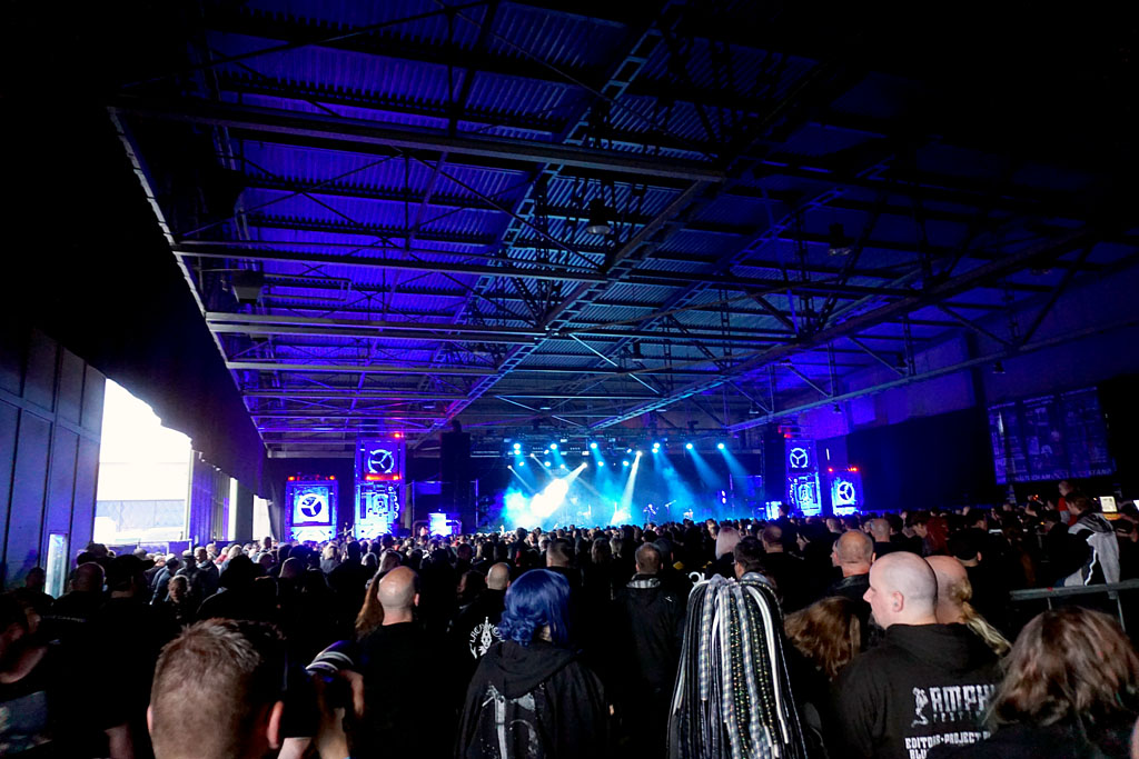 Später lockten dann die Kanadier von FRONTLINE ASSEMBLY in den übervollen Hangar. Harte Beats, ein dichtes Samplekonstrukt und Bill Leebs Gesang bildeten eine Zeitreise durch die 30 jährige Bandgeschichte. Die volle Anhängerschafft in der angewärmten Halle war mehr als dankbar.