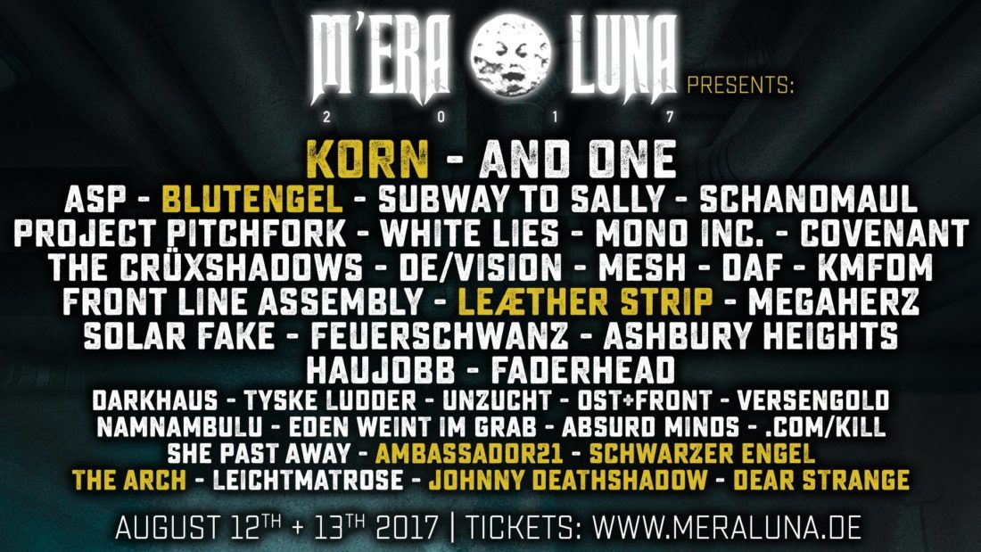 Absurd Minds, Ambassador21, And One, Ashbury Heights, ASP, Blutengel, Circus Of Fools, Com/Kill, Covenant, Daf, Darkhaus, De/Vision, Dear Strange, Eden Weint Im Grab, Faderhead, Feuerschwanz, Front Line Assembly, Haujobb, Johnny Deathshadow, KMFDM, Korn, Leichtmatrose, LEÆTHER STRIP, Megaherz, Mesh, Mono Inc, Namnambulu, Ost+Front, Project Pitchfork, Schandmaul, Schwarzer Engel, She Past Away, Solar Fake, Subway To Sally, The Arch, The CrÜxshadows, Tyske Ludder, Unzucht, Versengold, White Lies