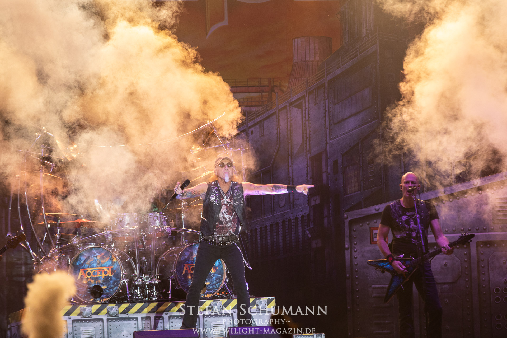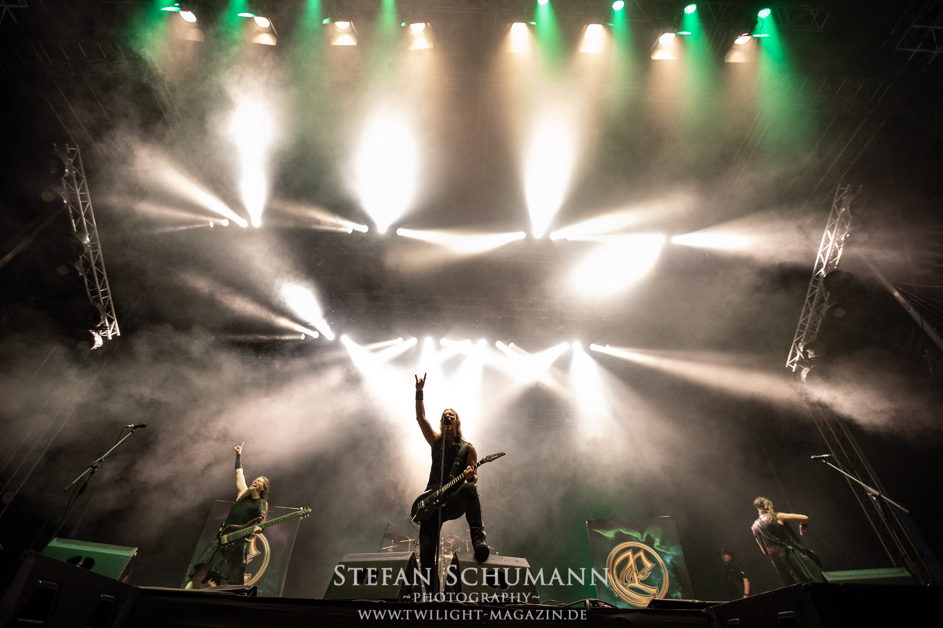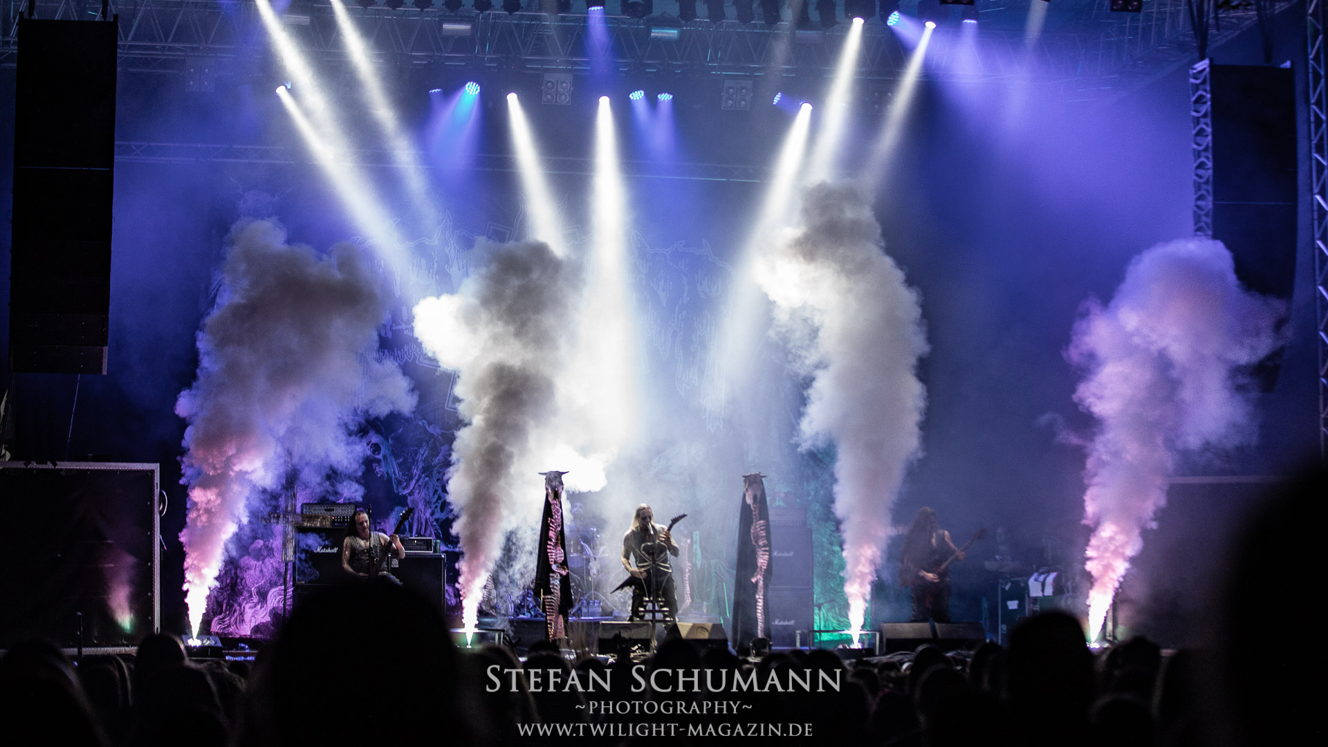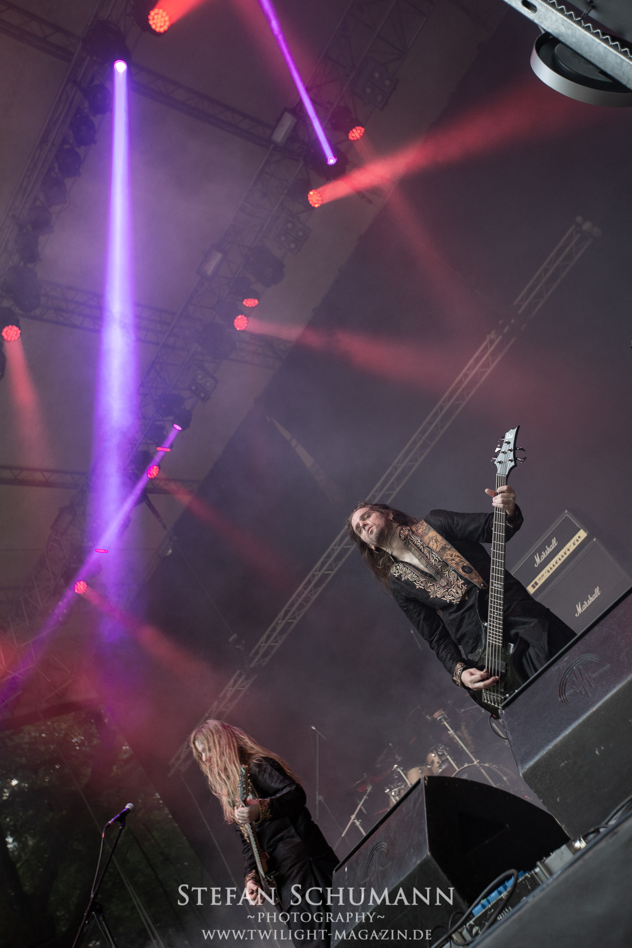 Der Dienstag nervt dann gleich mit einem Konzert-Clash: Während auf der Hauptbühne TESSERACT ihren djentigen progressive Metal dem geneigten Bass-Frickler um die Ohren haut, sind nebenan im Wald die Old-School-Doomster PALLBEARER dabei, die Langsamkeit des Riffs auszuloten. Die Menschenmassen werden dann wieder von ENSIFERUM vor der Hauptbühne eingesammelt. Der fröhliche Vikingmetal mit ordentlich reitenden Gitarren gefällt und Sänger Petri Lindroos performt die neuen Songs genauso, wie die noch ohne ihn eingespielten Lieder der ersten beiden wegweisenden Alben. Höhepunkt der Publikumsinteraktion bilden dabei natürlich „Lai Lai Hei“ und der Rausschmeißer „Iron“, bevor die Bühne für die deutschen Heavy Metal-Urgesteine ACCEPT geräumt wird. Die Solinger fahren voll auf und verlassen sich auch ohne Udo Dirkschneider auf ihre All-Time-Classics wie „Fast as a Shark“, „Metal Heart“ und „Balls to the Wall“, die wirklich jeder mitsingen kann. Ausufernde Gitarrensoli („Für Elise“ im Fleischwolf) und exzessives Posen vor den Bühnenaufbauten sind dabei natürlich auch unentbehrlich.