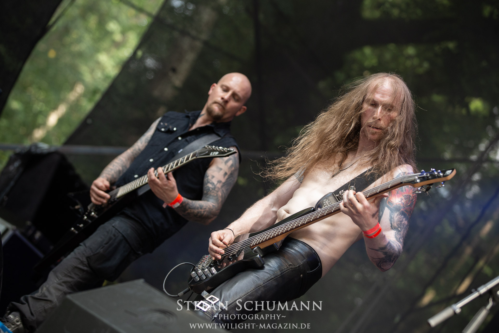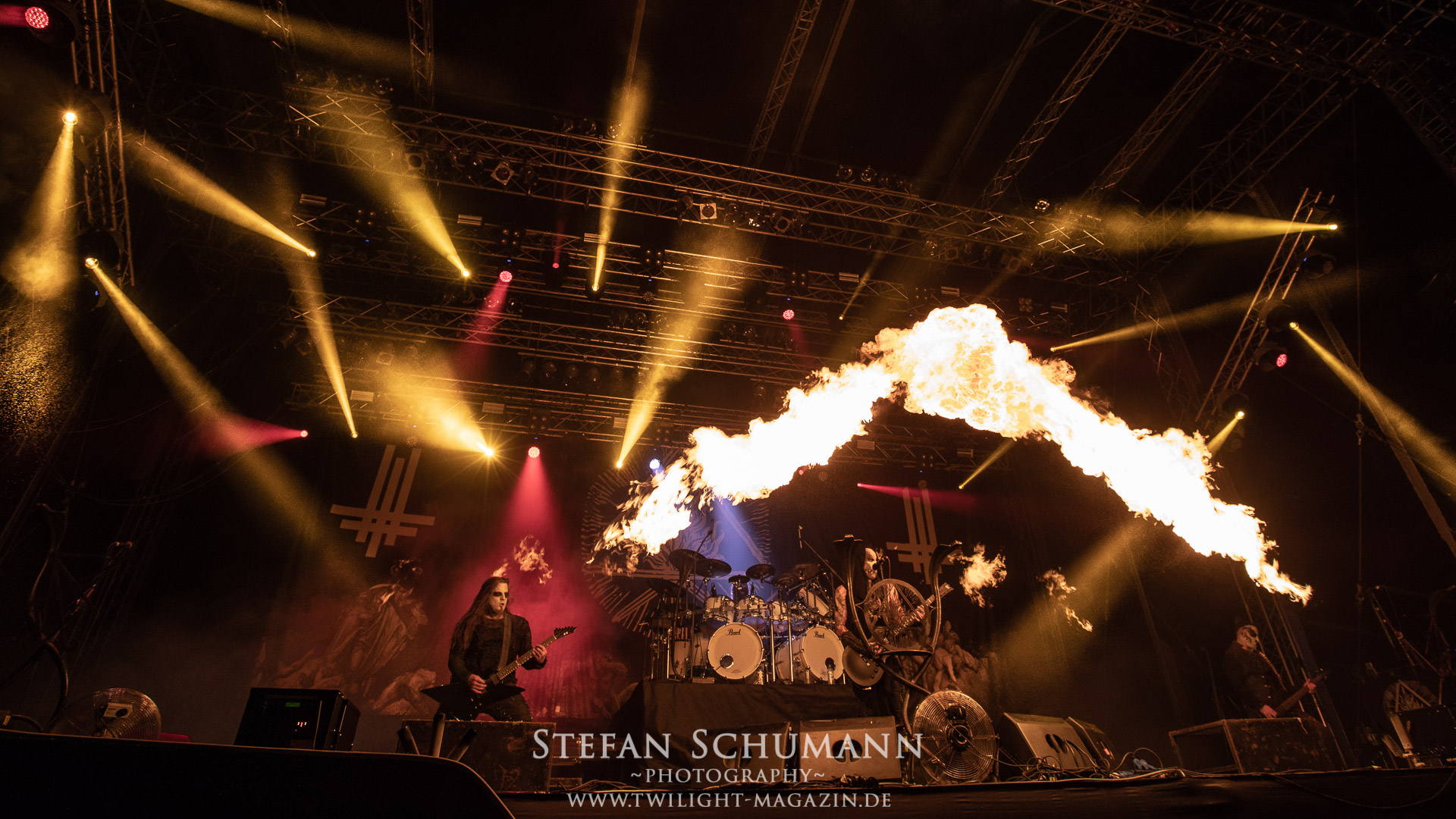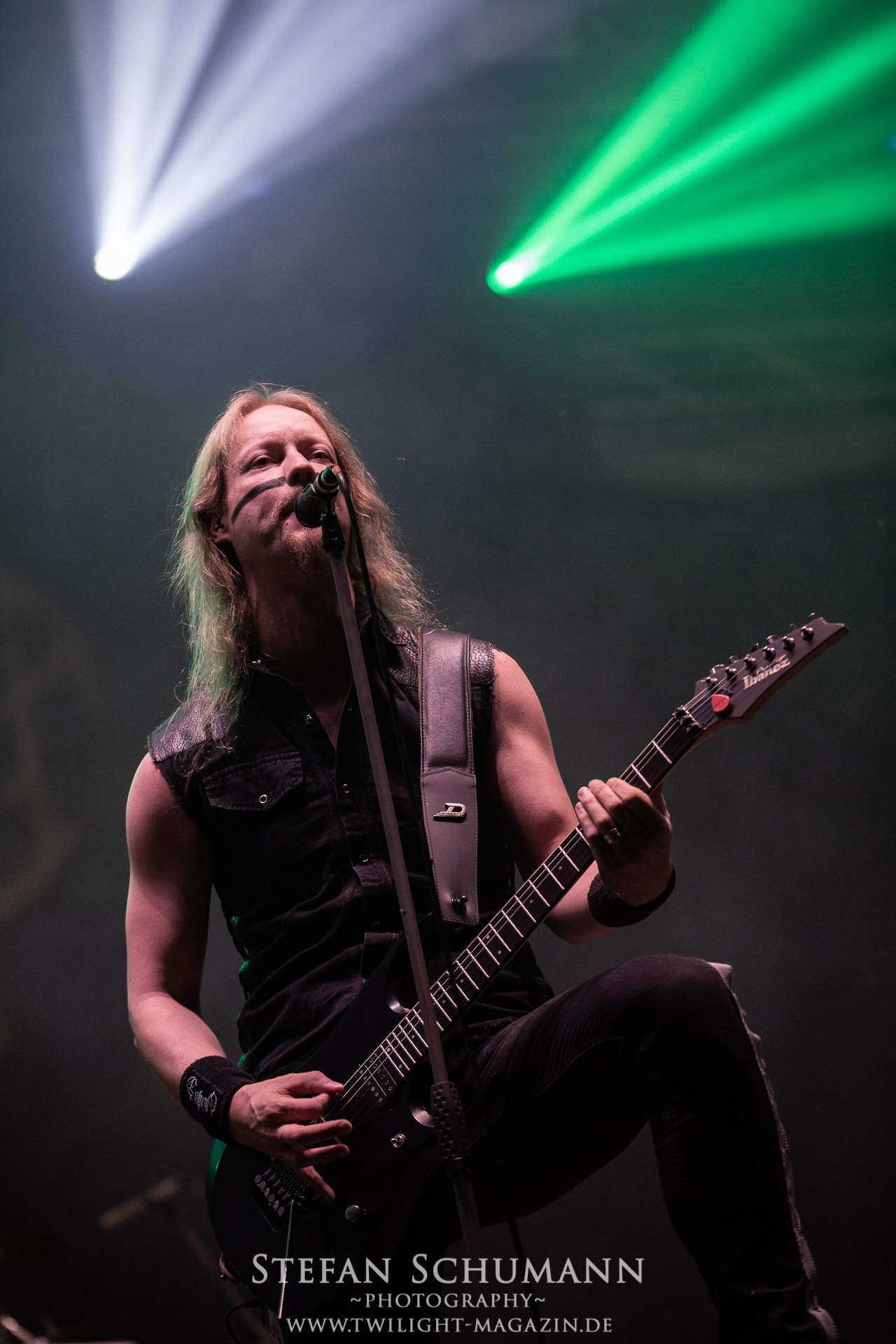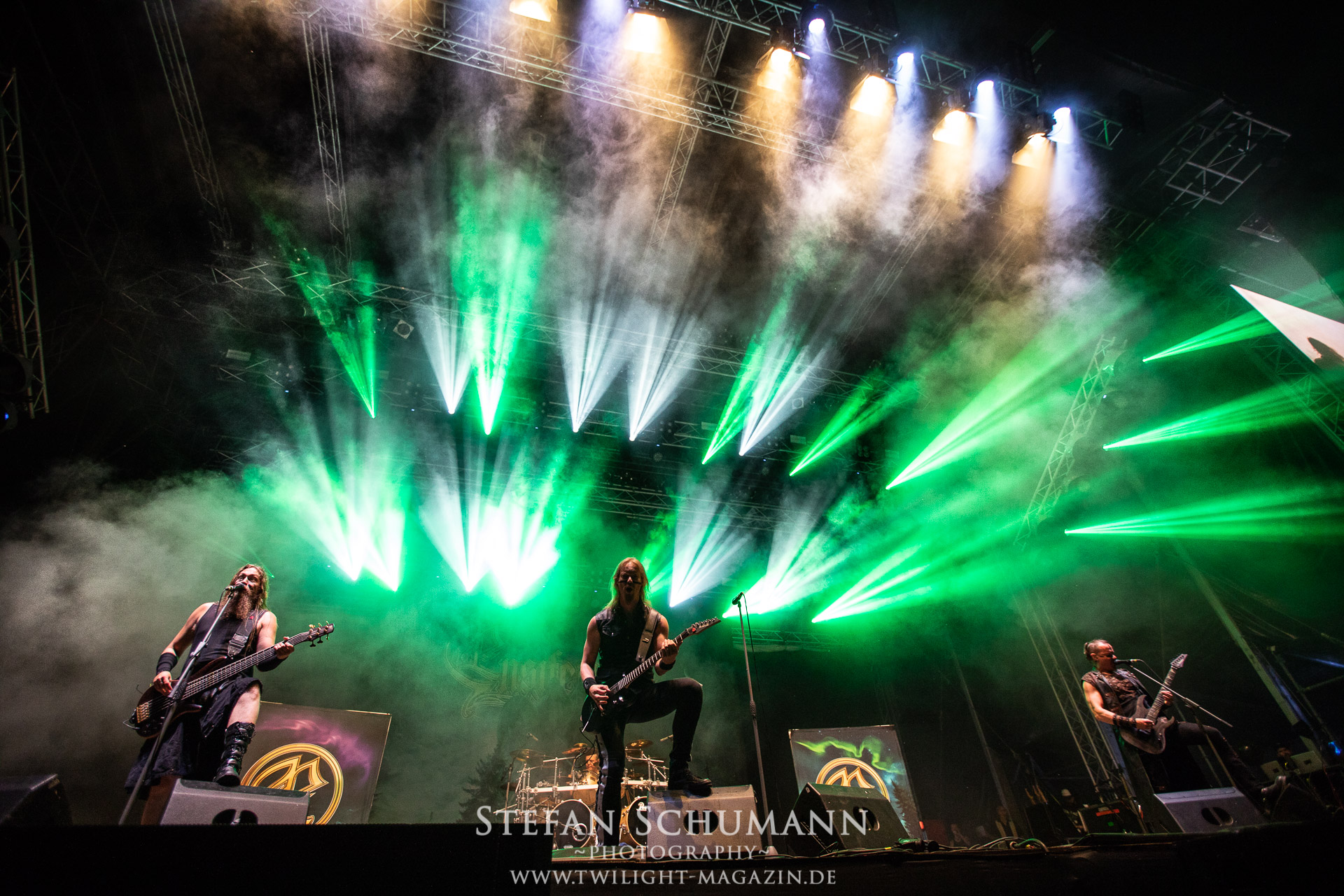 Der Dienstag nervt dann gleich mit einem Konzert-Clash: Während auf der Hauptbühne TESSERACT ihren djentigen progressive Metal dem geneigten Bass-Frickler um die Ohren haut, sind nebenan im Wald die Old-School-Doomster PALLBEARER dabei, die Langsamkeit des Riffs auszuloten. Die Menschenmassen werden dann wieder von ENSIFERUM vor der Hauptbühne eingesammelt. Der fröhliche Vikingmetal mit ordentlich reitenden Gitarren gefällt und Sänger Petri Lindroos performt die neuen Songs genauso, wie die noch ohne ihn eingespielten Lieder der ersten beiden wegweisenden Alben. Höhepunkt der Publikumsinteraktion bilden dabei natürlich „Lai Lai Hei“ und der Rausschmeißer „Iron“, bevor die Bühne für die deutschen Heavy Metal-Urgesteine ACCEPT geräumt wird. Die Solinger fahren voll auf und verlassen sich auch ohne Udo Dirkschneider auf ihre All-Time-Classics wie „Fast as a Shark“, „Metal Heart“ und „Balls to the Wall“, die wirklich jeder mitsingen kann. Ausufernde Gitarrensoli („Für Elise“ im Fleischwolf) und exzessives Posen vor den Bühnenaufbauten sind dabei natürlich auch unentbehrlich.