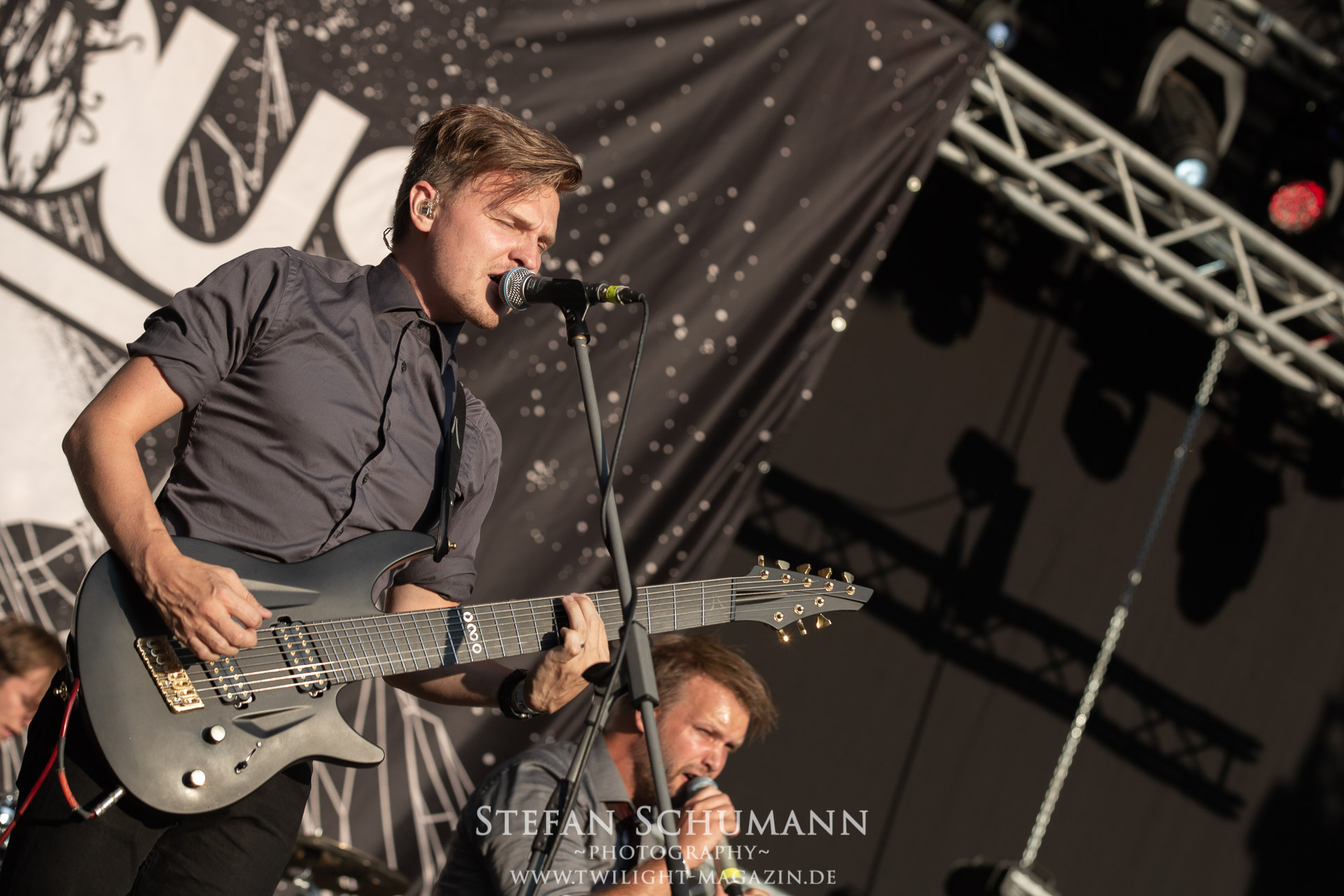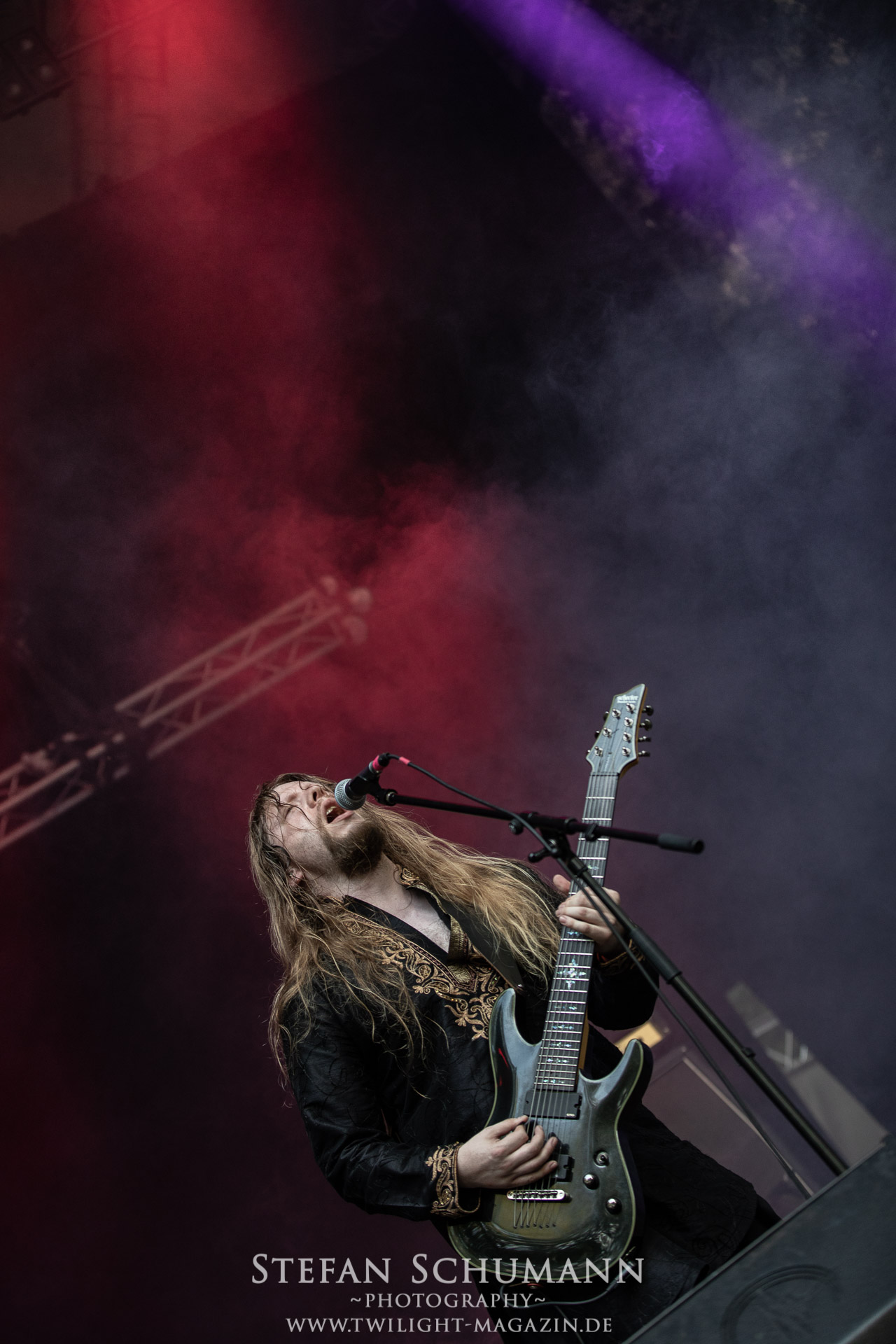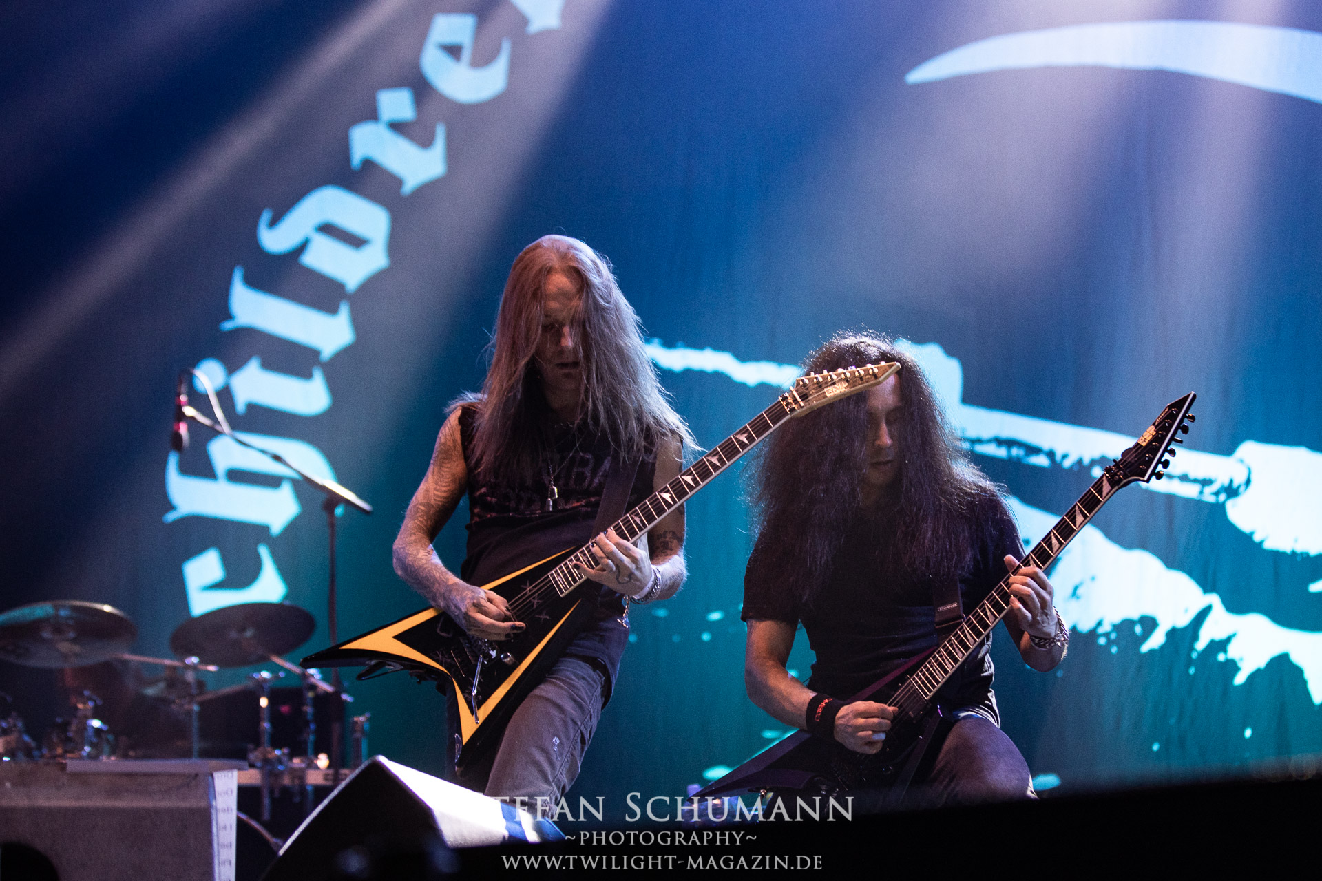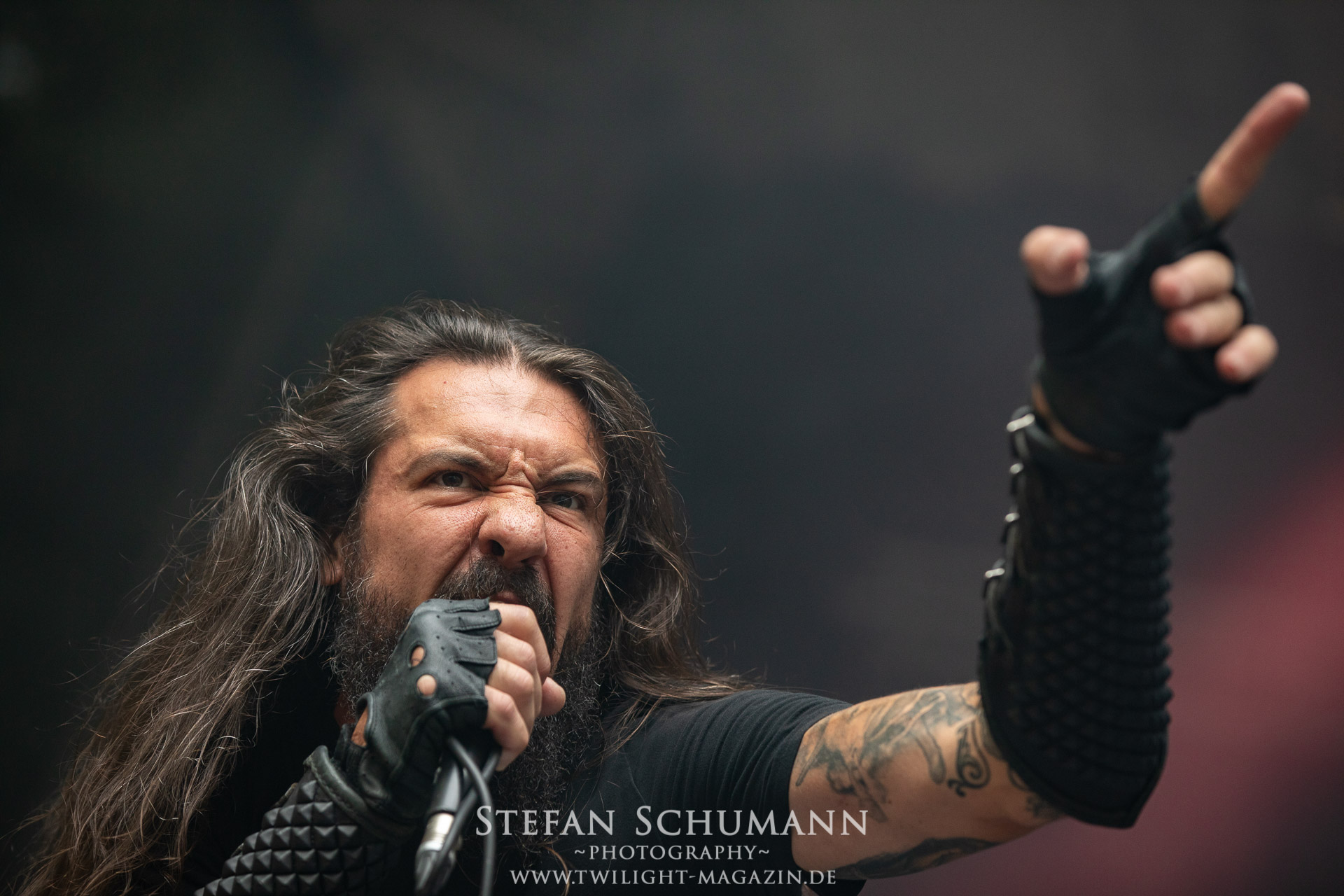 Der Dienstag nervt dann gleich mit einem Konzert-Clash: Während auf der Hauptbühne TESSERACT ihren djentigen progressive Metal dem geneigten Bass-Frickler um die Ohren haut, sind nebenan im Wald die Old-School-Doomster PALLBEARER dabei, die Langsamkeit des Riffs auszuloten. Die Menschenmassen werden dann wieder von ENSIFERUM vor der Hauptbühne eingesammelt. Der fröhliche Vikingmetal mit ordentlich reitenden Gitarren gefällt und Sänger Petri Lindroos performt die neuen Songs genauso, wie die noch ohne ihn eingespielten Lieder der ersten beiden wegweisenden Alben. Höhepunkt der Publikumsinteraktion bilden dabei natürlich „Lai Lai Hei“ und der Rausschmeißer „Iron“, bevor die Bühne für die deutschen Heavy Metal-Urgesteine ACCEPT geräumt wird. Die Solinger fahren voll auf und verlassen sich auch ohne Udo Dirkschneider auf ihre All-Time-Classics wie „Fast as a Shark“, „Metal Heart“ und „Balls to the Wall“, die wirklich jeder mitsingen kann. Ausufernde Gitarrensoli („Für Elise“ im Fleischwolf) und exzessives Posen vor den Bühnenaufbauten sind dabei natürlich auch unentbehrlich.
