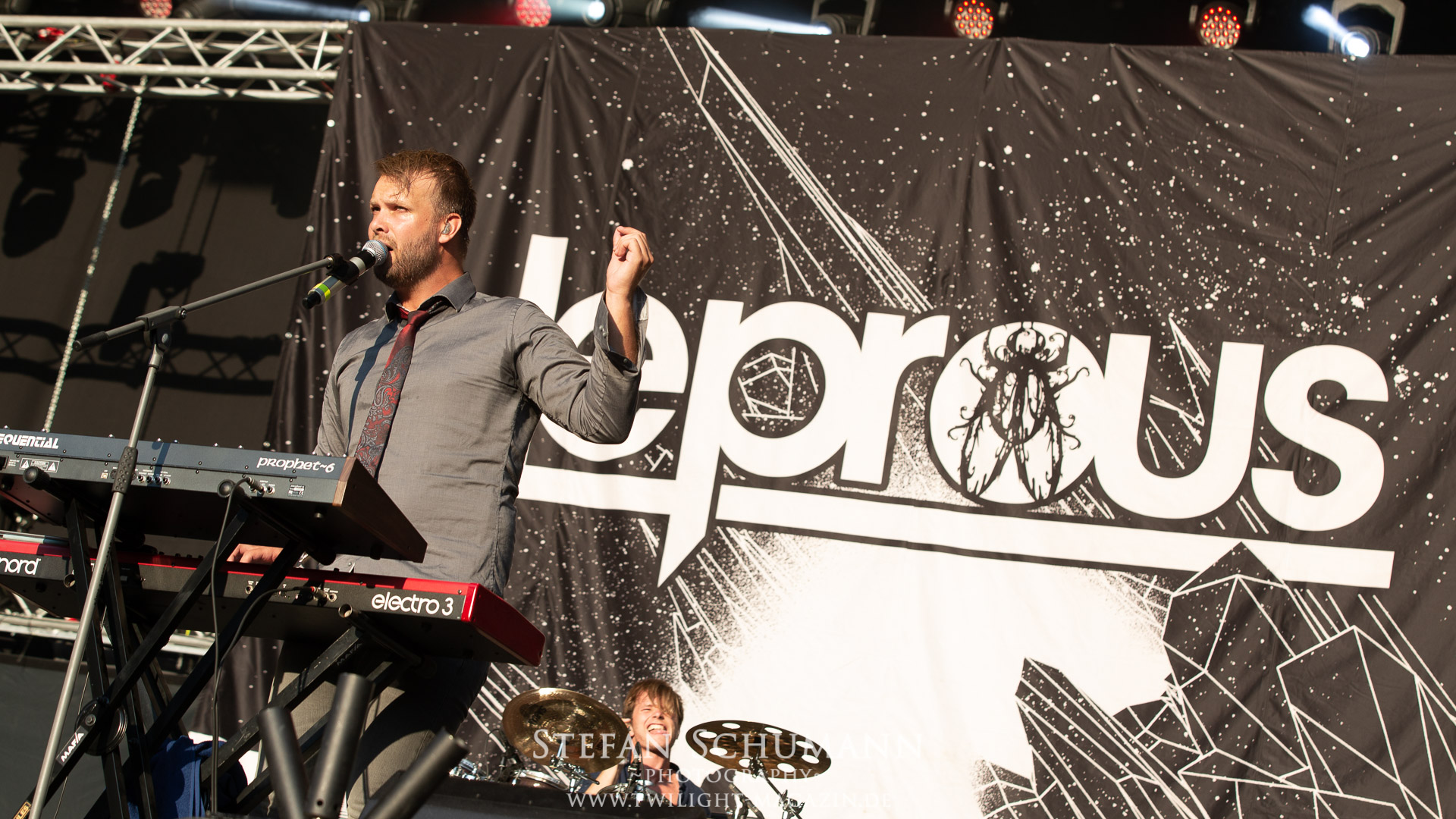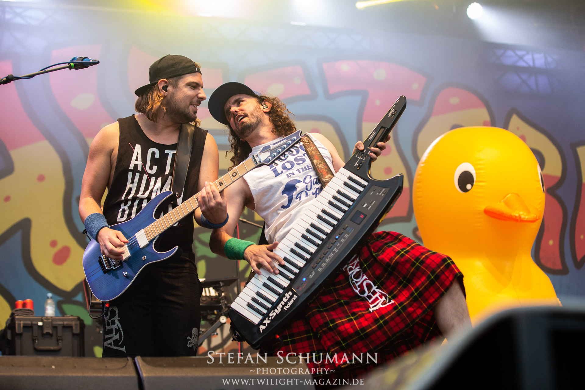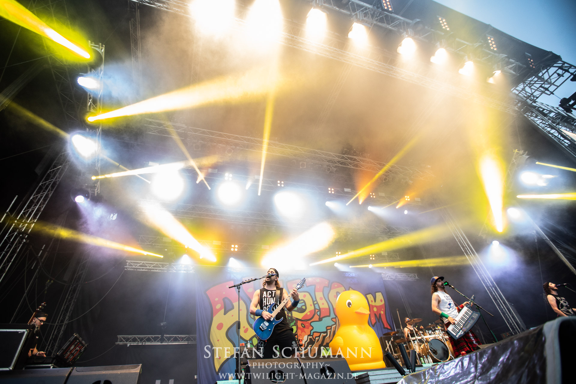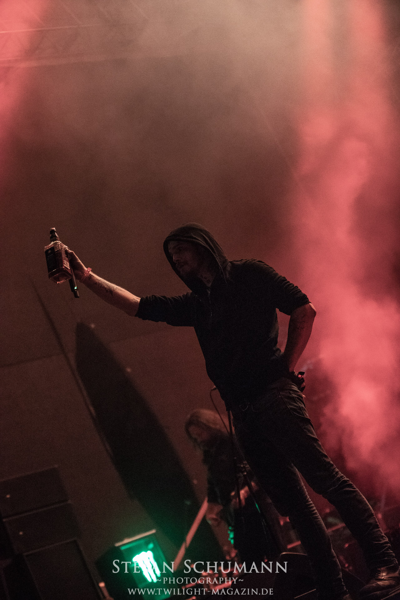 Am frühen Montag nachmittag lassen die inoffiziellen AGALLOCH-Nachfolger PILLORIAN aufhorchen, die trotz strahlendem Sonnenschein etwas Düsternis auf der Zweitbühne verbreiten. Das kann man von LEPROUS auf der Hauptbühne nicht behaupten. Während der kopflastige Gesang und der progressive Touch der der Isländer manchem noch gewöhnungsbedürftig erscheint, erfreut sich der geneigte Fan an wohl bekannten Stücken wie „The Flood“ und „The Price“. Um einiges eingängiger wird es dann direkt im Anschluss mit ALESTORM. Die Hooks des Piraten-Metal gehen sofort ins Ohr und mit genug Umdrehungen im Blut (750ml Whisky-Cola in ordentlicher Mischung gibt’s für 12€) lassen sich die meisten Refrains, wie von „Hangover“ oder dem krönenden Abschluss „Fucked with an Anchor“, problemlos mitsingen, während die übergroße Gummiente über die Menge getragen wird.