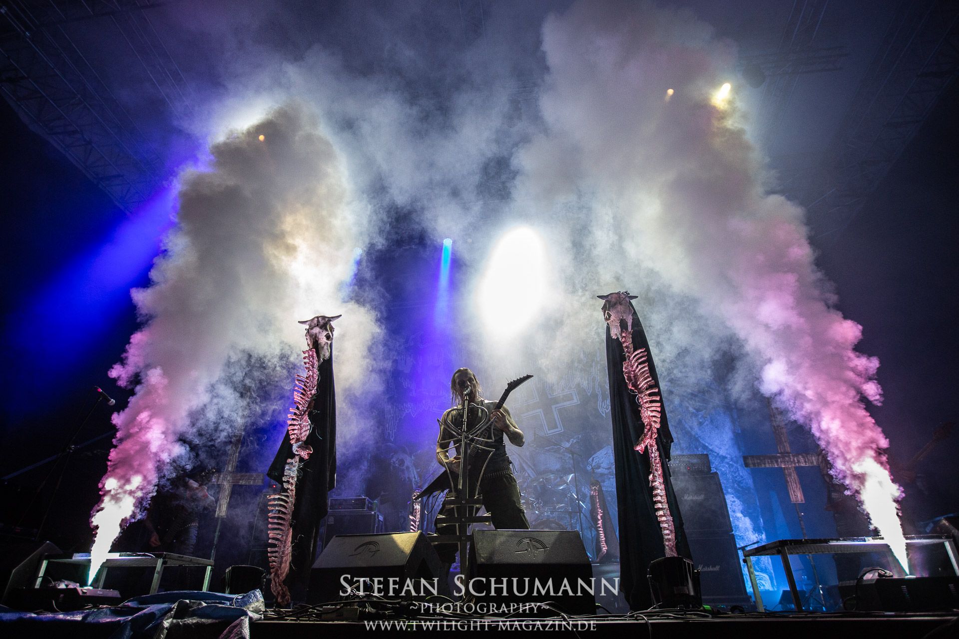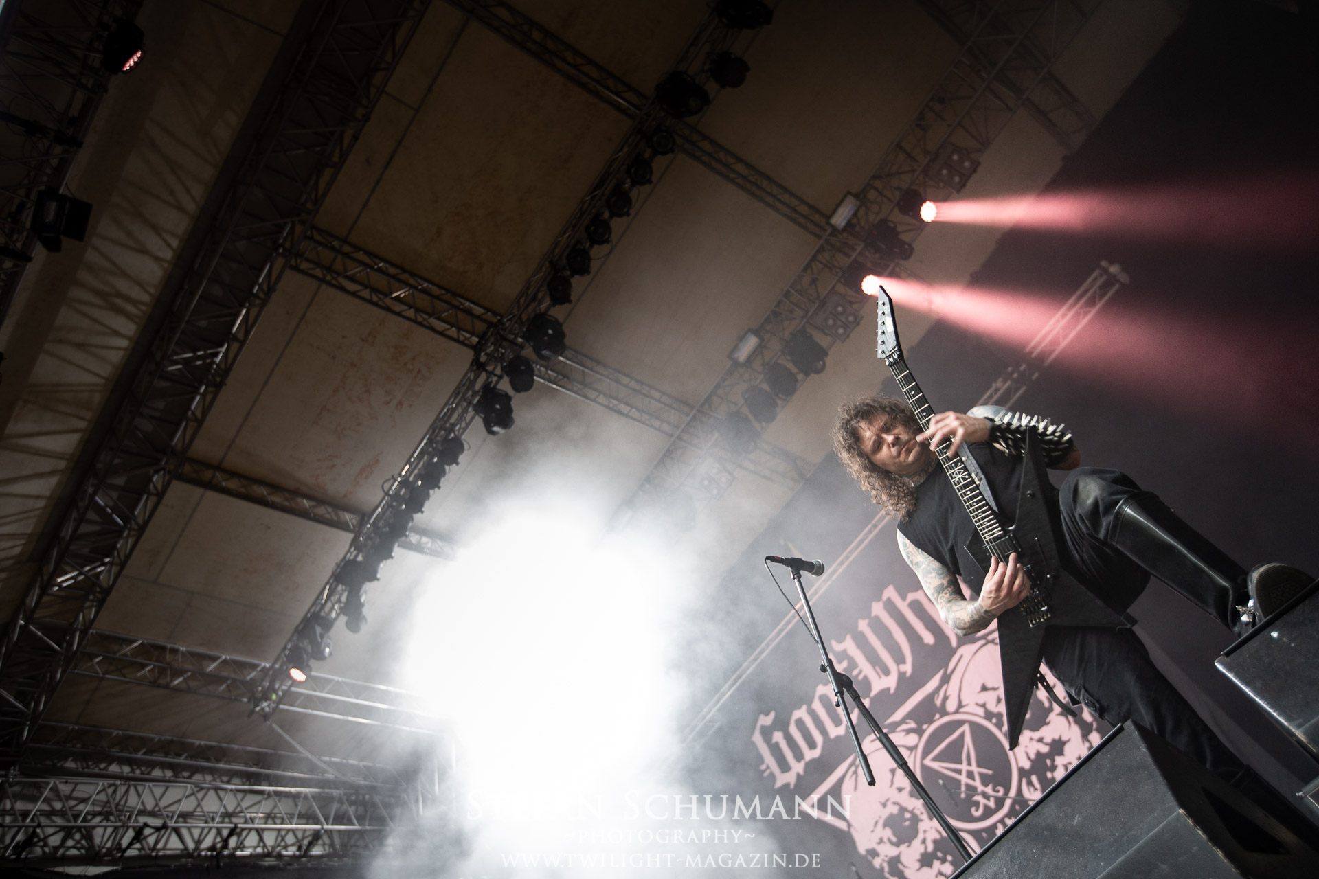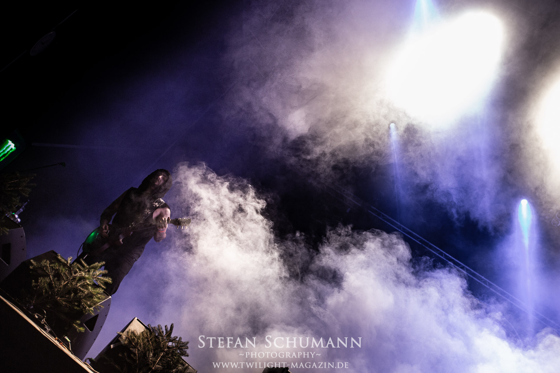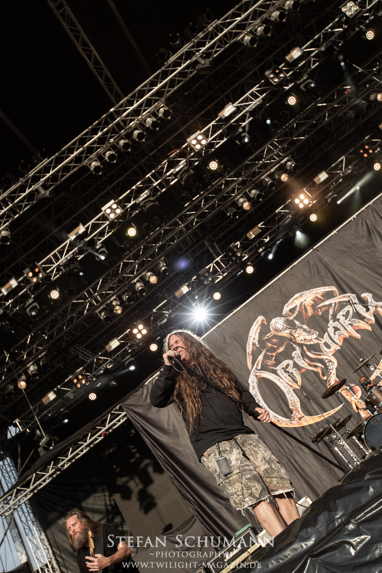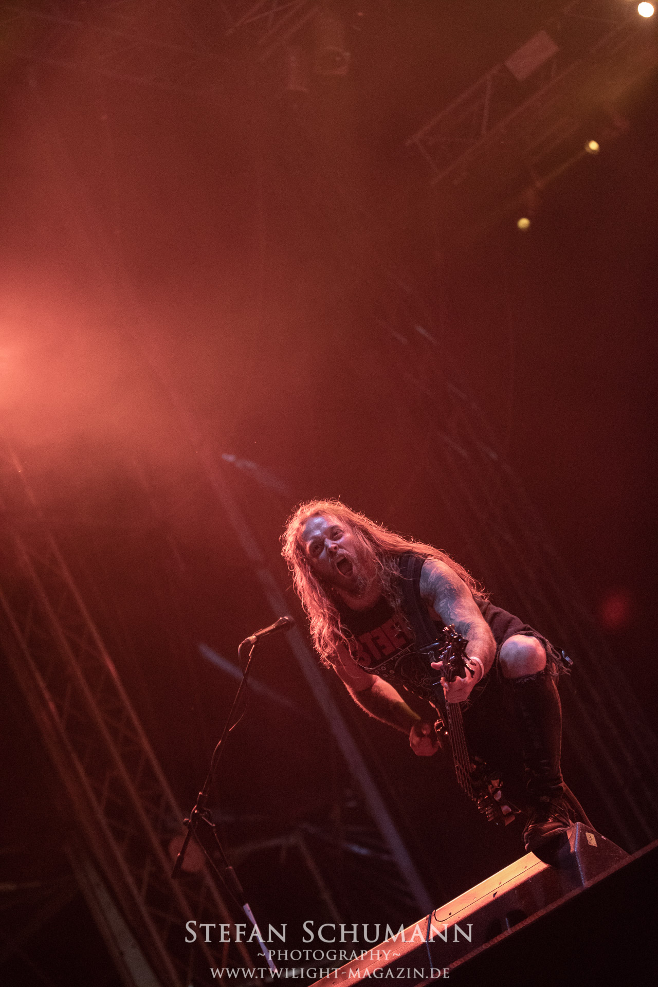 Der letzte Tag beginnt mit einem weiteren, inzwischen fast traditionellen, Überraschungsausflug zur Zweitbühne: Dort unterhalten gerade die jungen Schweizer TYRMFAR die circa 50 anwesenden Gestalten mit ihrer doch sehr bekömmlichen Black/Death-Metal-Mischung, die man sich bei den Großen der Szene abgeschaut hat. Die erste größere Menge findet sich dann vor dem mit Recht immer populärer werdenden Hamburger Duo MANTAR ein, die nur mit Gitarre, Schlagzeug und Gesang eine breitere Doom-Wand erzeugen als andere Bands zu fünft. Nach ihrem letzten Song „Era Borealis“ machen sie dann Platz für die Thrasher MUNICIPAL WASTE, die mit ihrem Anti-Trump-Backdrop politisch eindeutig Stellung beziehen. Auch wenn musikalisch nicht ganz so abwechslungsreich, hat das Publikum deinen Spaß und zerrt zahlreiche Aufblas-Gummitiere in die Circle-Pit.