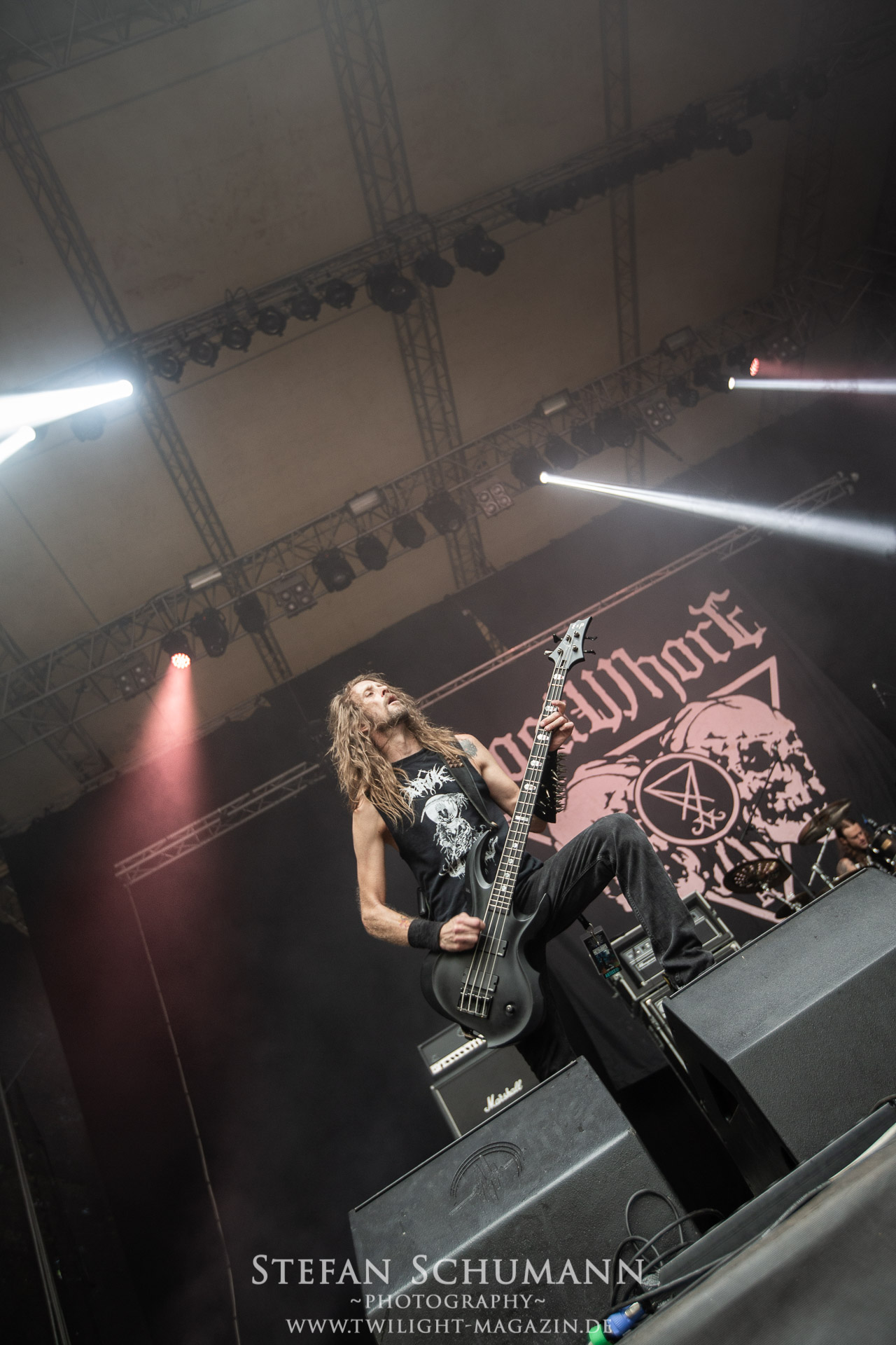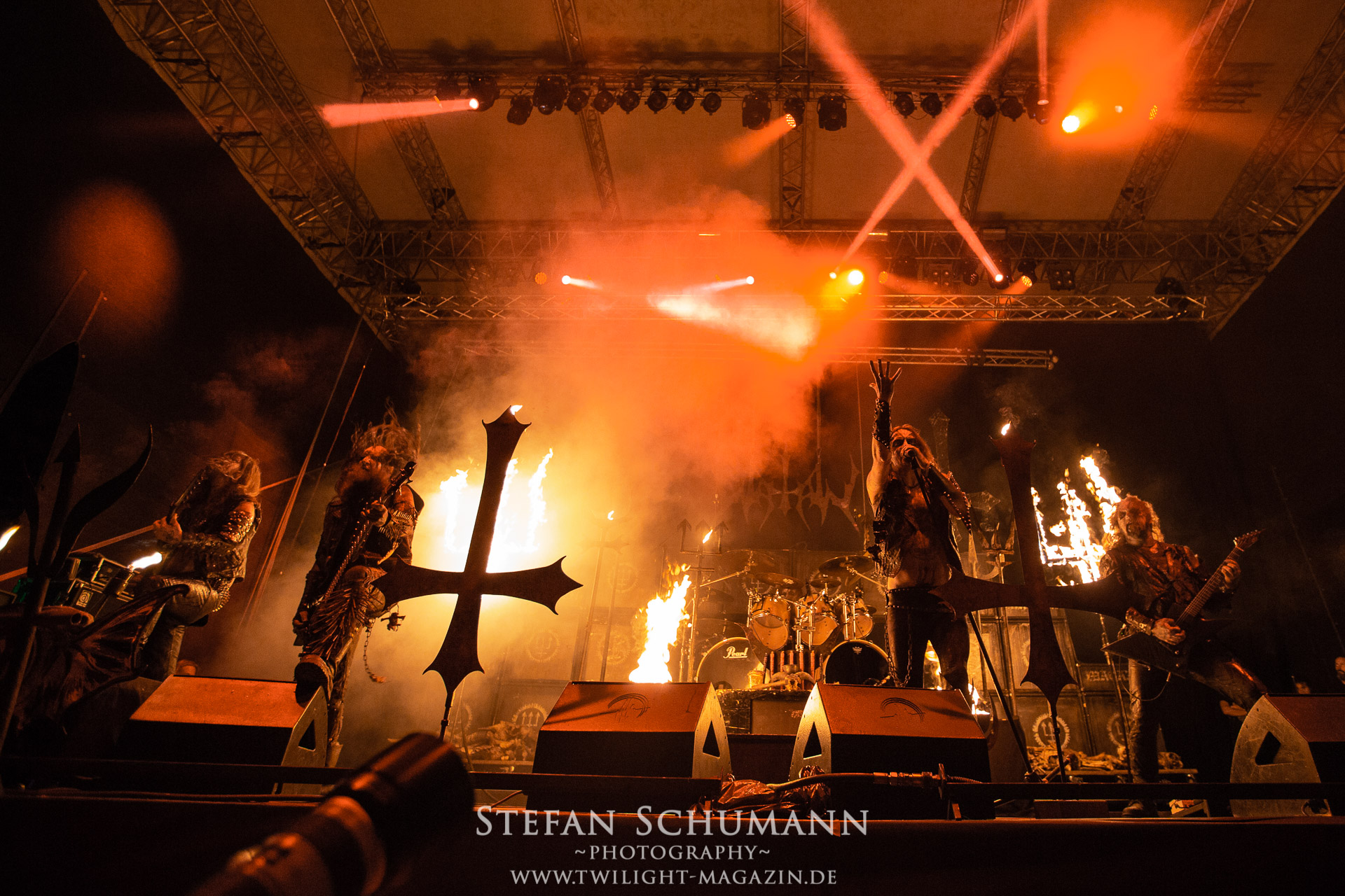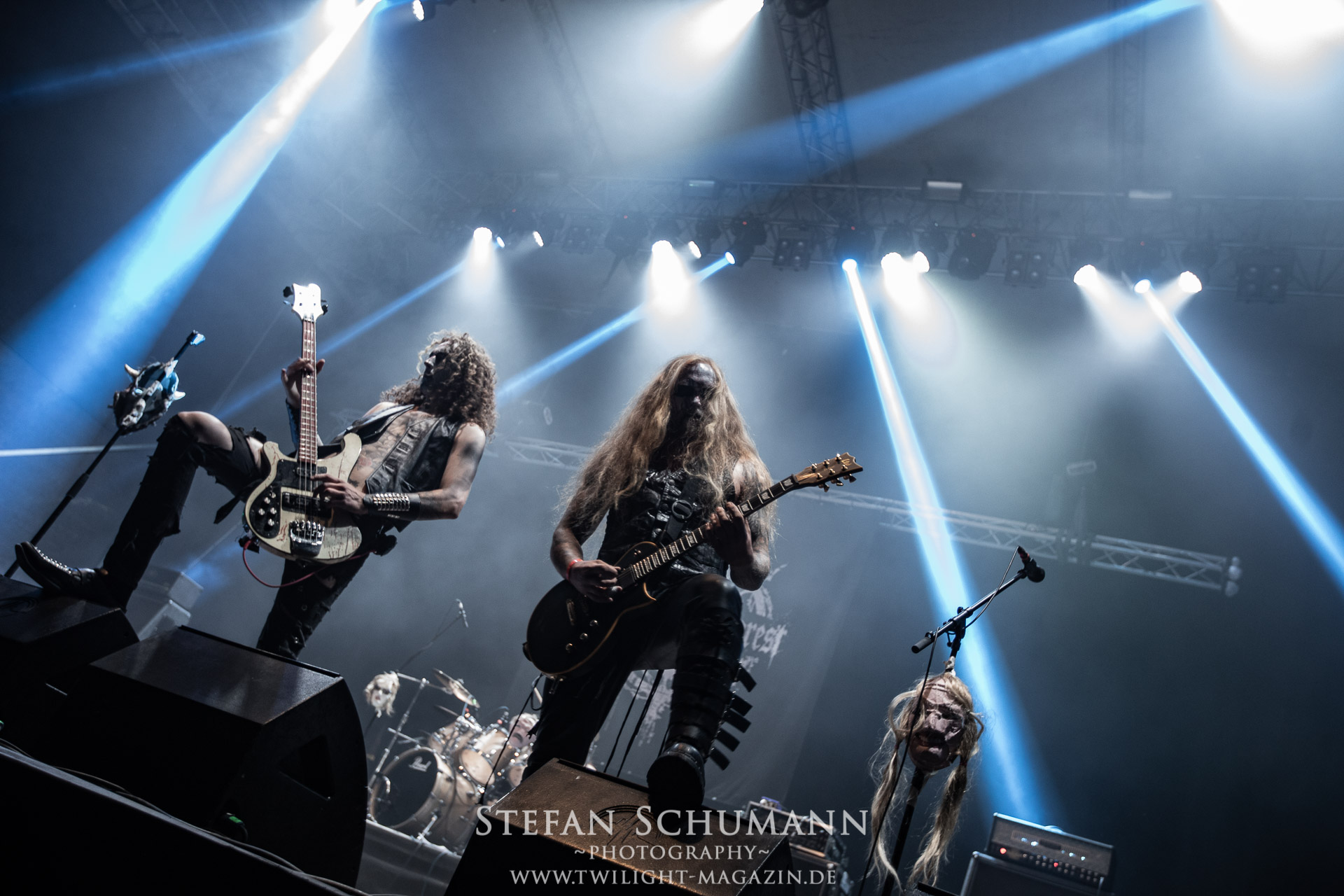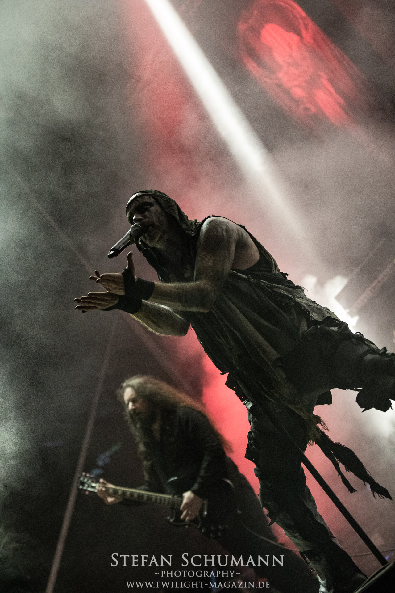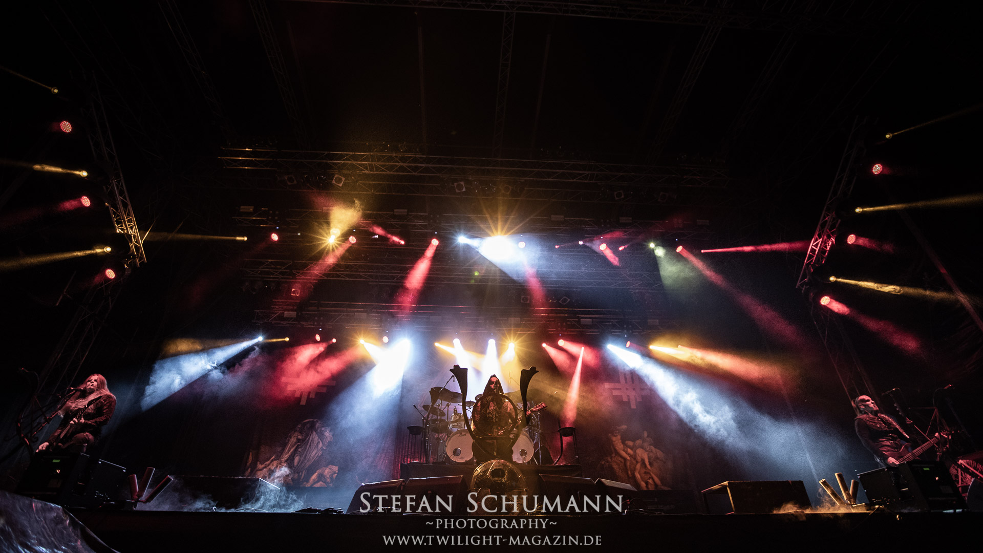 Der letzte Tag beginnt mit einem weiteren, inzwischen fast traditionellen, Überraschungsausflug zur Zweitbühne: Dort unterhalten gerade die jungen Schweizer TYRMFAR die circa 50 anwesenden Gestalten mit ihrer doch sehr bekömmlichen Black/Death-Metal-Mischung, die man sich bei den Großen der Szene abgeschaut hat. Die erste größere Menge findet sich dann vor dem mit Recht immer populärer werdenden Hamburger Duo MANTAR ein, die nur mit Gitarre, Schlagzeug und Gesang eine breitere Doom-Wand erzeugen als andere Bands zu fünft. Nach ihrem letzten Song „Era Borealis“ machen sie dann Platz für die Thrasher MUNICIPAL WASTE, die mit ihrem Anti-Trump-Backdrop politisch eindeutig Stellung beziehen. Auch wenn musikalisch nicht ganz so abwechslungsreich, hat das Publikum deinen Spaß und zerrt zahlreiche Aufblas-Gummitiere in die Circle-Pit.