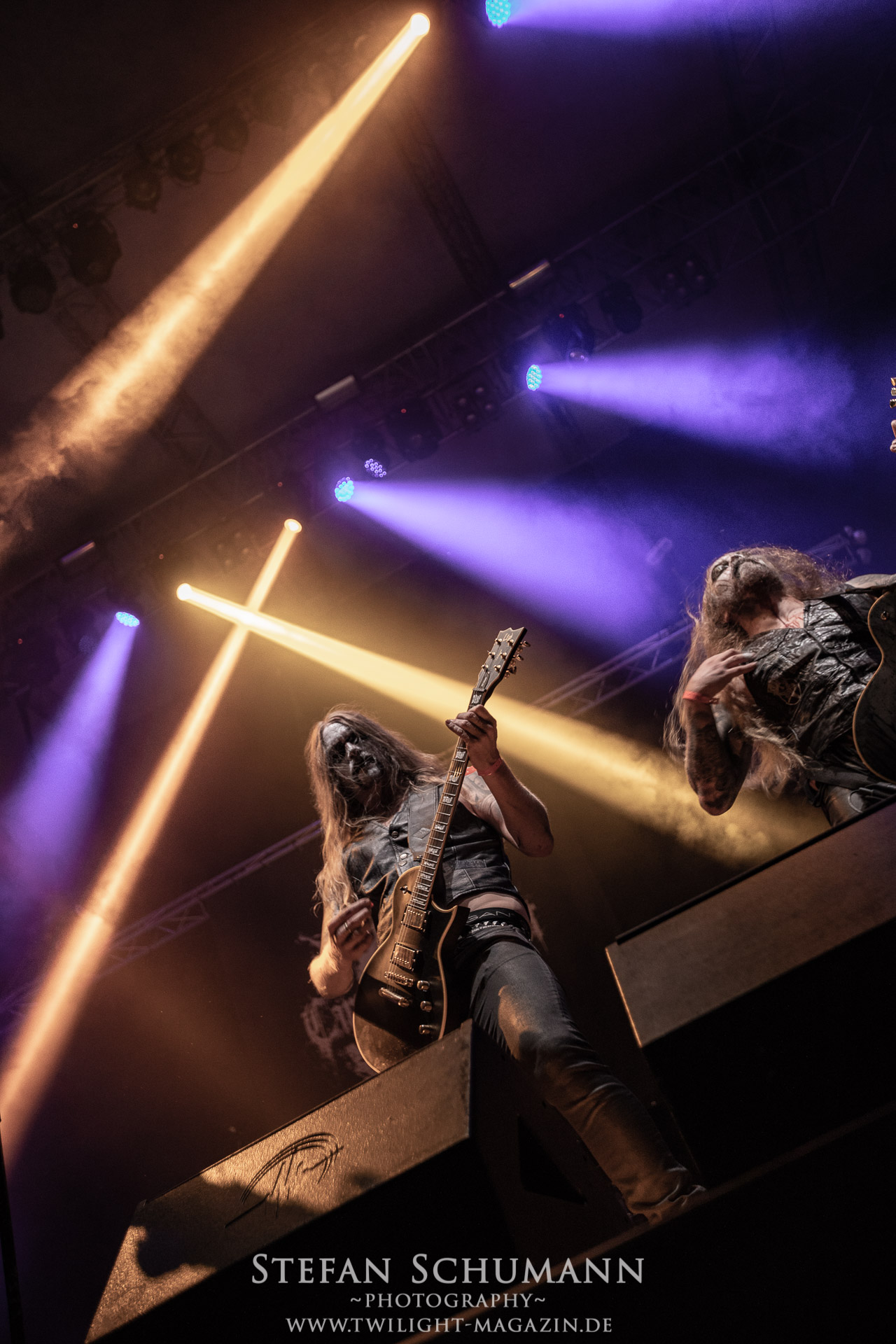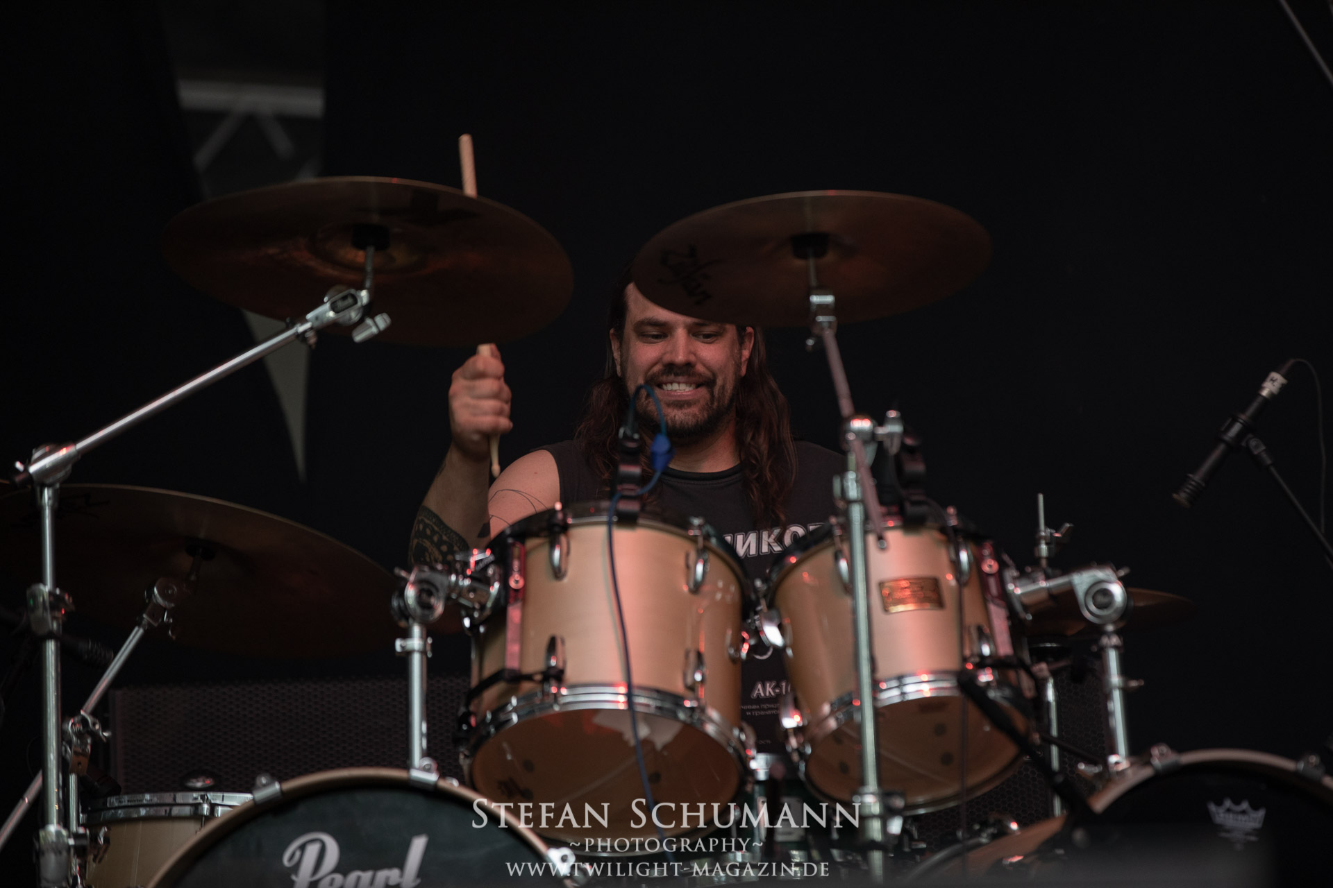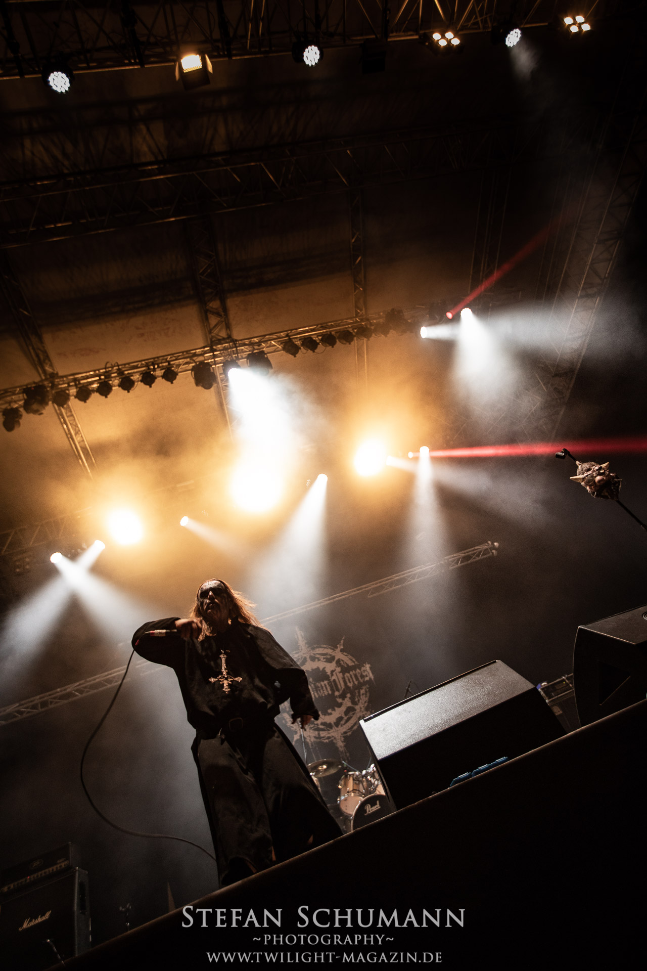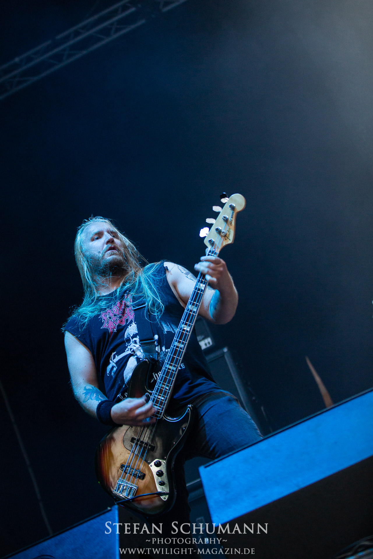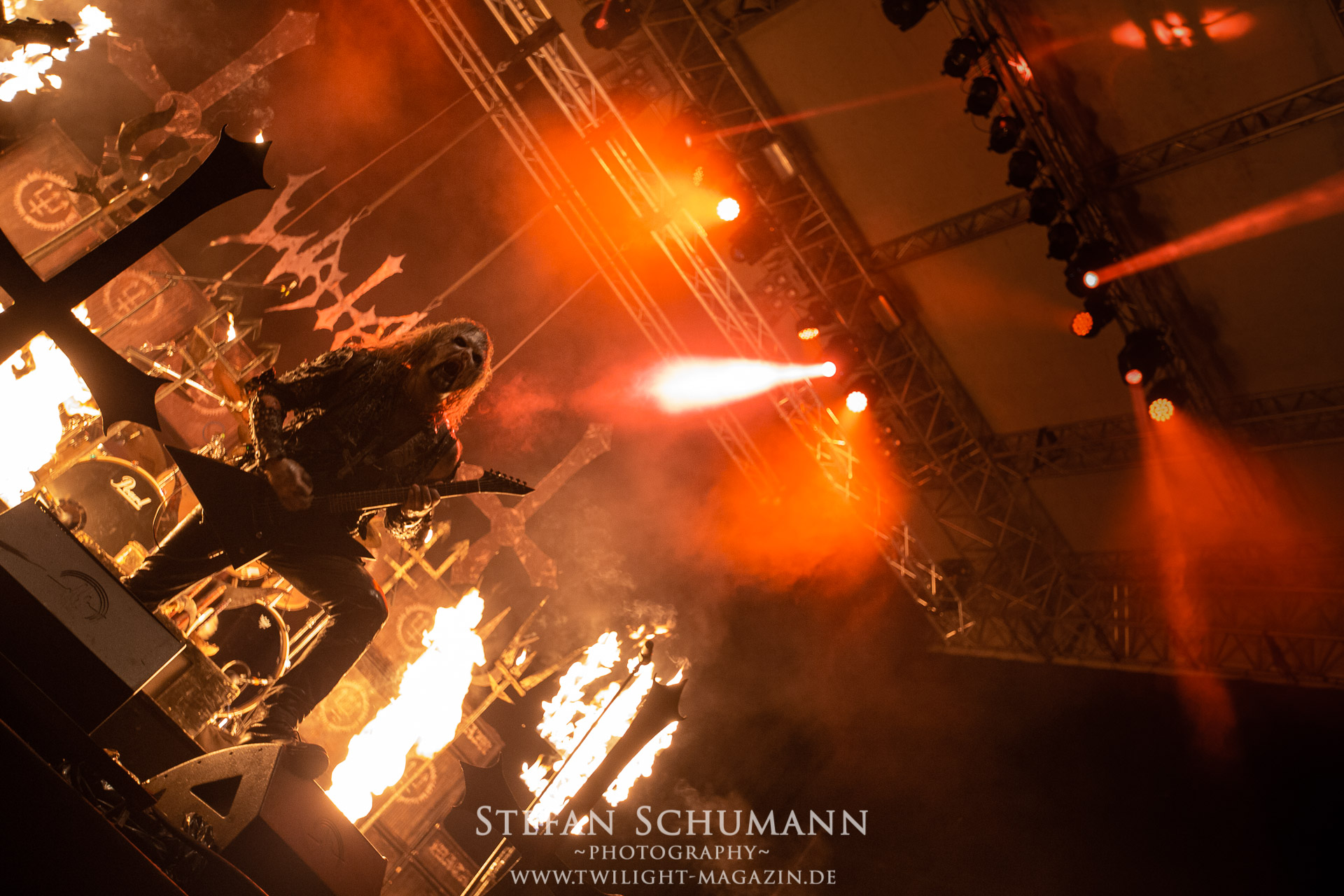 Der letzte Tag beginnt mit einem weiteren, inzwischen fast traditionellen, Überraschungsausflug zur Zweitbühne: Dort unterhalten gerade die jungen Schweizer TYRMFAR die circa 50 anwesenden Gestalten mit ihrer doch sehr bekömmlichen Black/Death-Metal-Mischung, die man sich bei den Großen der Szene abgeschaut hat. Die erste größere Menge findet sich dann vor dem mit Recht immer populärer werdenden Hamburger Duo MANTAR ein, die nur mit Gitarre, Schlagzeug und Gesang eine breitere Doom-Wand erzeugen als andere Bands zu fünft. Nach ihrem letzten Song „Era Borealis“ machen sie dann Platz für die Thrasher MUNICIPAL WASTE, die mit ihrem Anti-Trump-Backdrop politisch eindeutig Stellung beziehen. Auch wenn musikalisch nicht ganz so abwechslungsreich, hat das Publikum deinen Spaß und zerrt zahlreiche Aufblas-Gummitiere in die Circle-Pit.