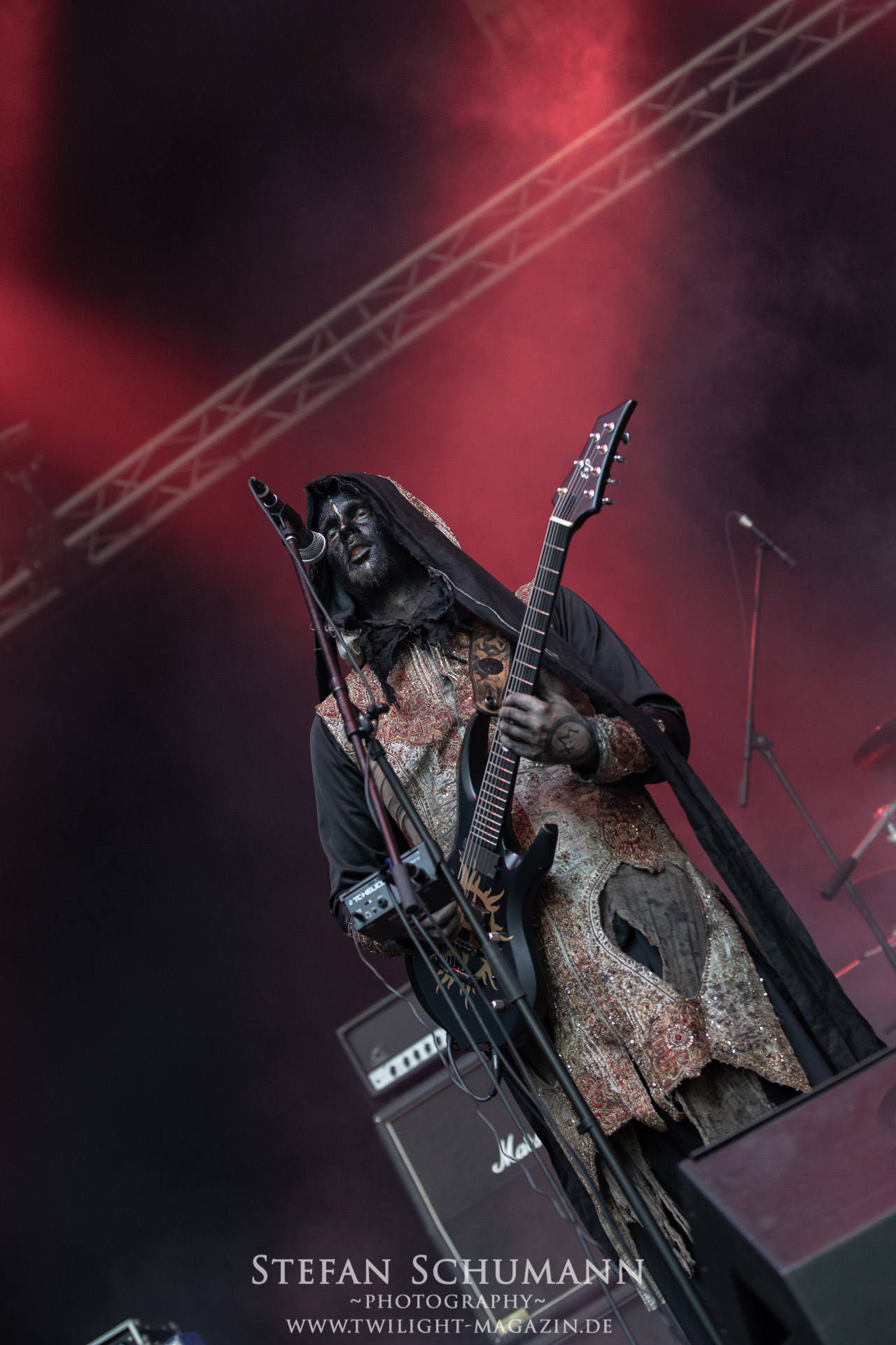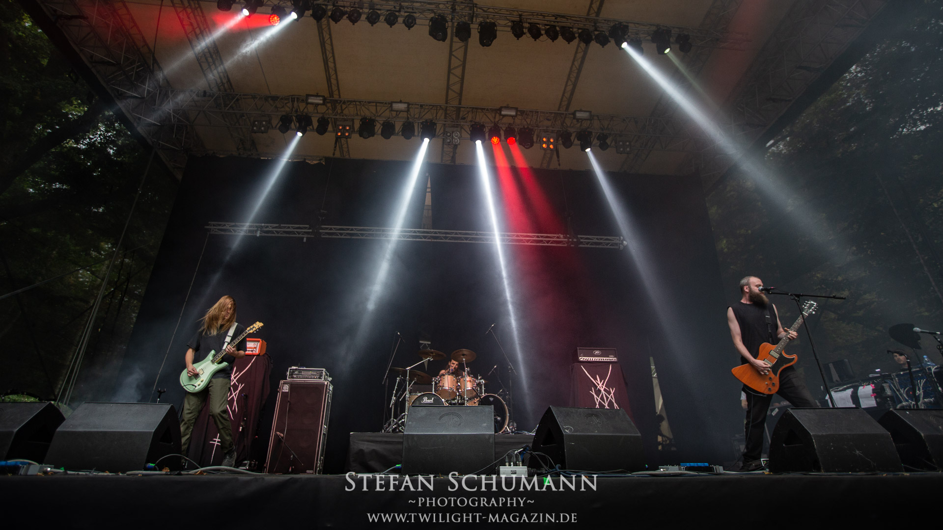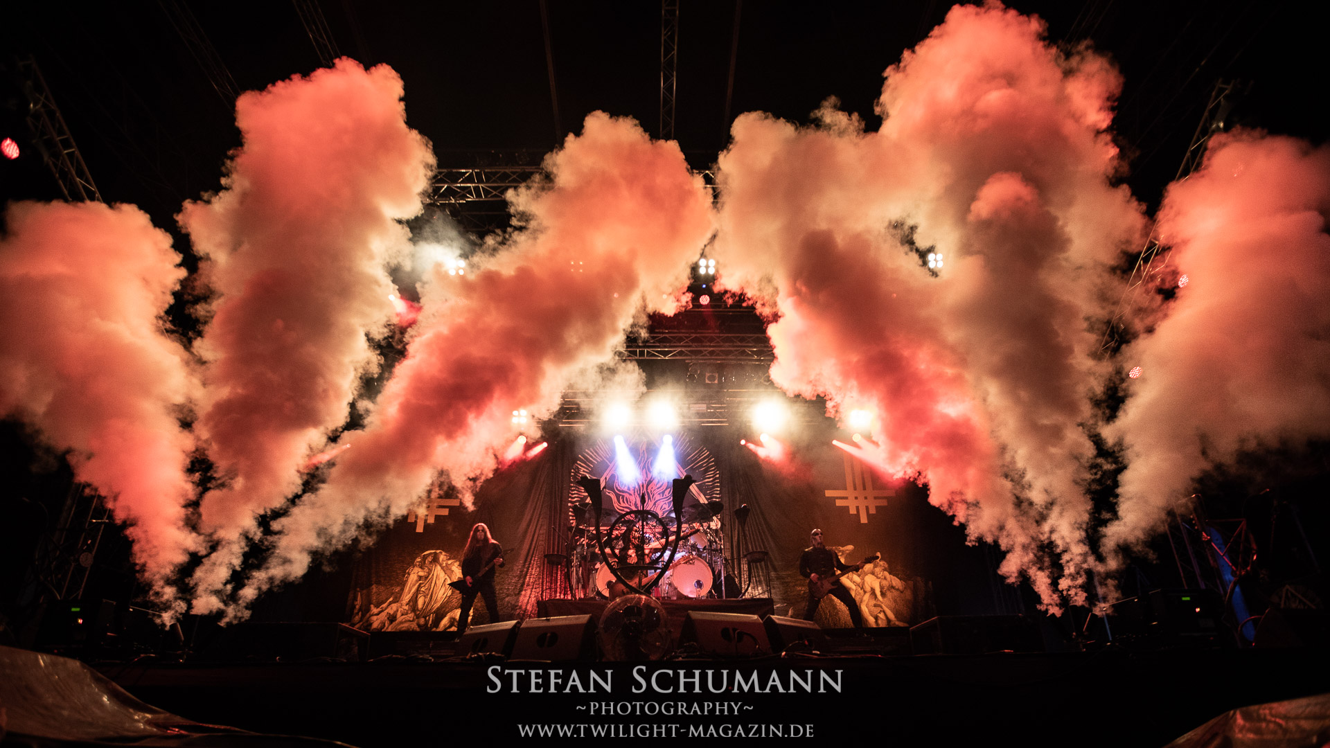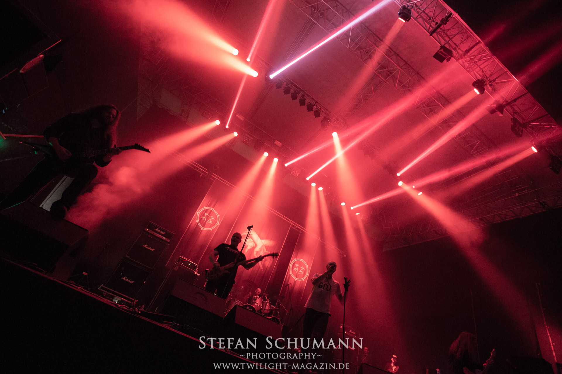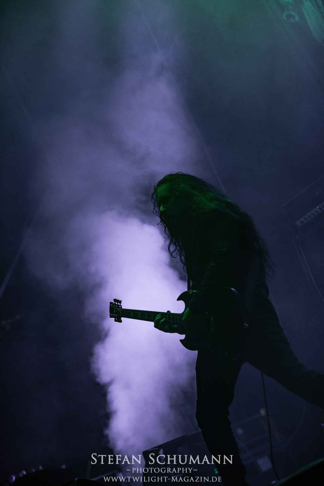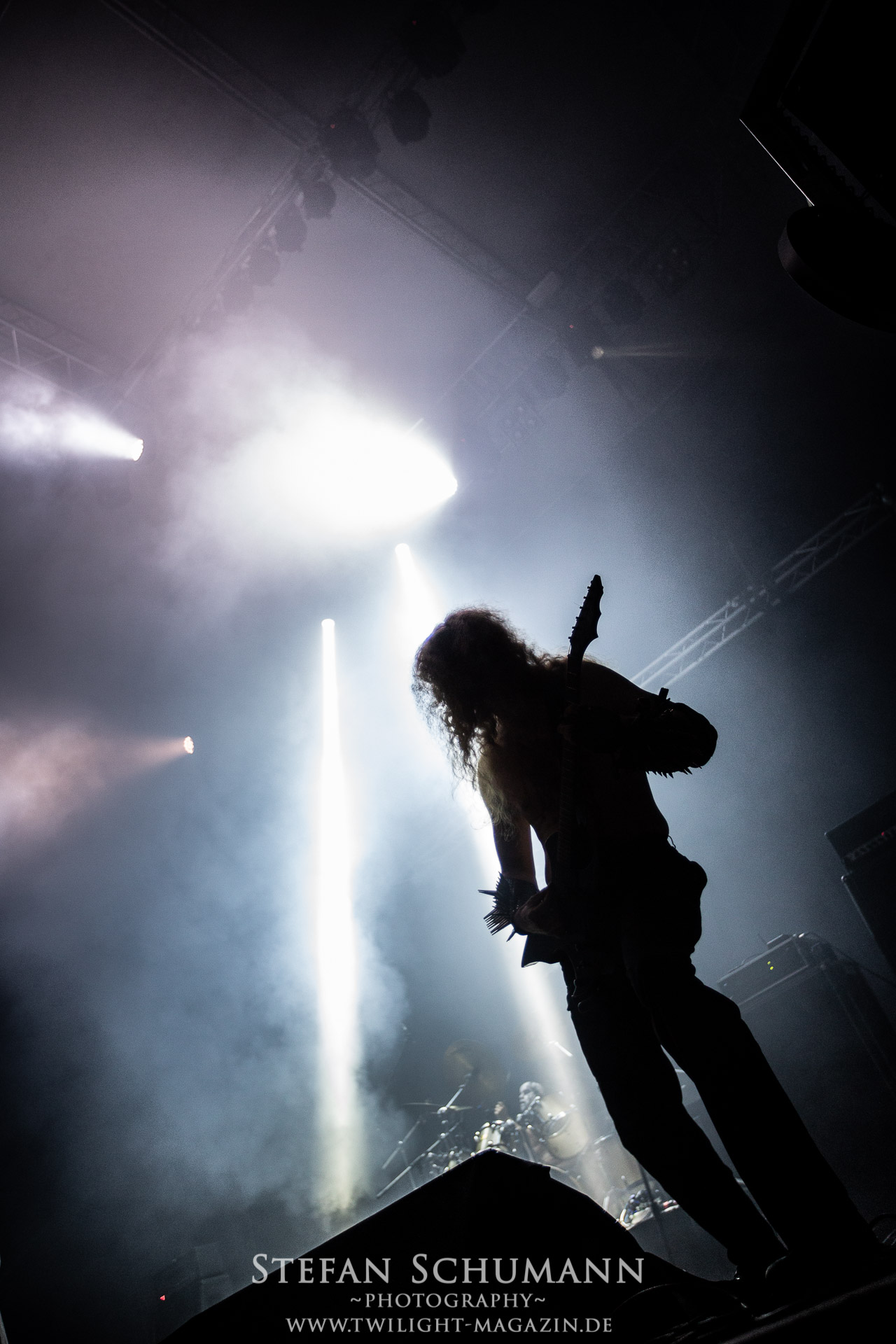 Der letzte Tag beginnt mit einem weiteren, inzwischen fast traditionellen, Überraschungsausflug zur Zweitbühne: Dort unterhalten gerade die jungen Schweizer TYRMFAR die circa 50 anwesenden Gestalten mit ihrer doch sehr bekömmlichen Black/Death-Metal-Mischung, die man sich bei den Großen der Szene abgeschaut hat. Die erste größere Menge findet sich dann vor dem mit Recht immer populärer werdenden Hamburger Duo MANTAR ein, die nur mit Gitarre, Schlagzeug und Gesang eine breitere Doom-Wand erzeugen als andere Bands zu fünft. Nach ihrem letzten Song „Era Borealis“ machen sie dann Platz für die Thrasher MUNICIPAL WASTE, die mit ihrem Anti-Trump-Backdrop politisch eindeutig Stellung beziehen. Auch wenn musikalisch nicht ganz so abwechslungsreich, hat das Publikum deinen Spaß und zerrt zahlreiche Aufblas-Gummitiere in die Circle-Pit.