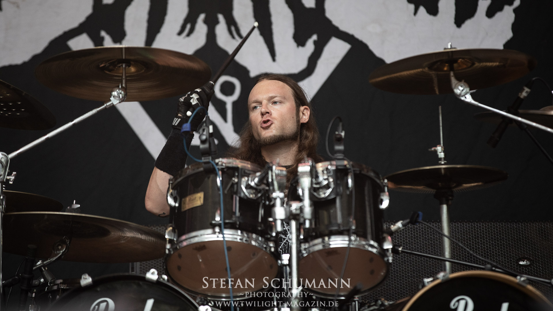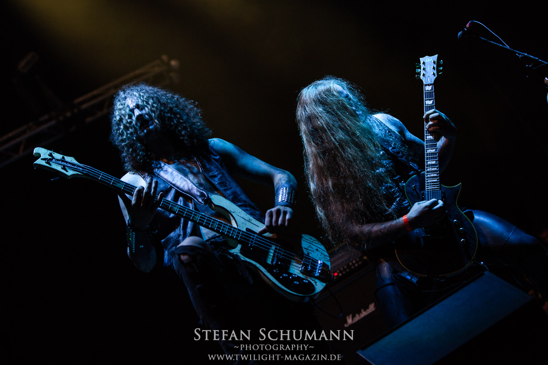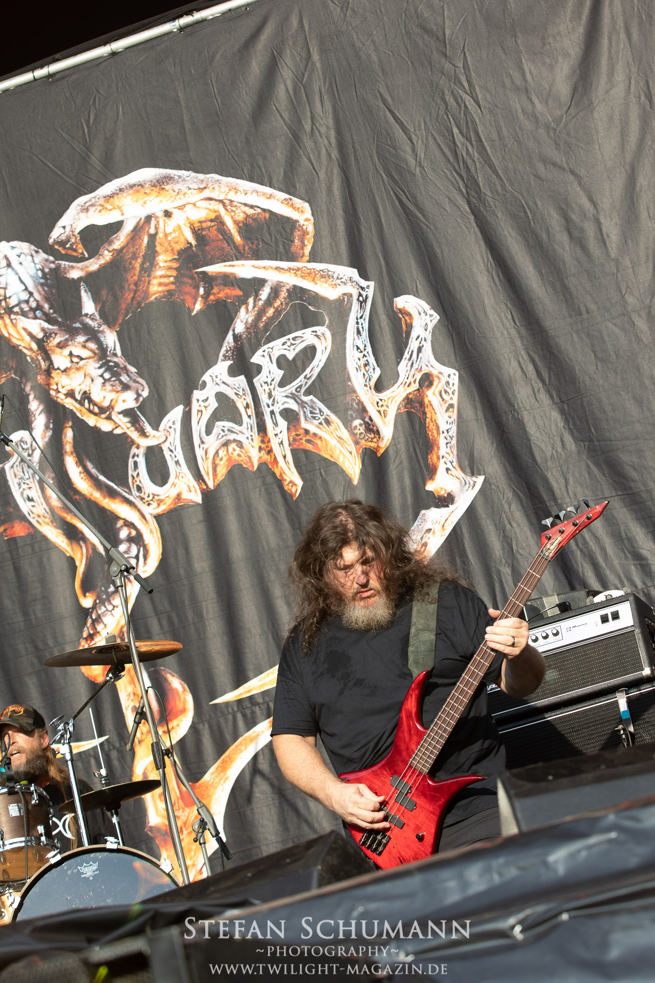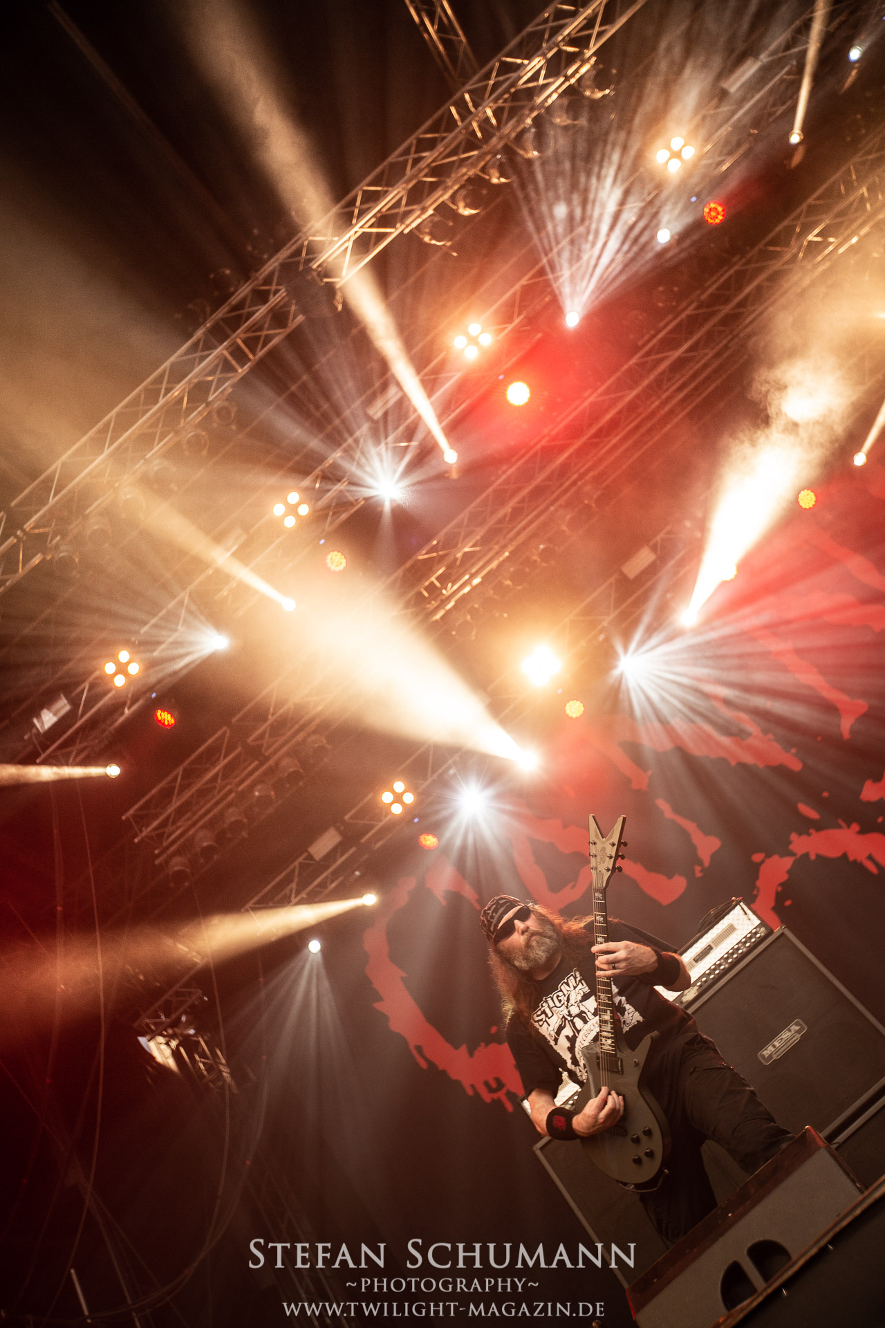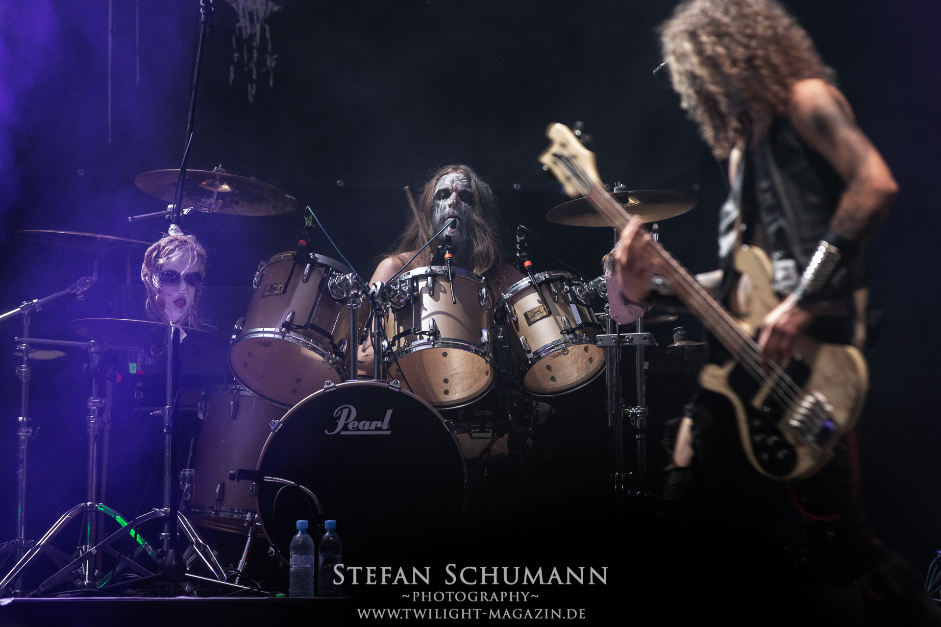 Der letzte Tag beginnt mit einem weiteren, inzwischen fast traditionellen, Überraschungsausflug zur Zweitbühne: Dort unterhalten gerade die jungen Schweizer TYRMFAR die circa 50 anwesenden Gestalten mit ihrer doch sehr bekömmlichen Black/Death-Metal-Mischung, die man sich bei den Großen der Szene abgeschaut hat. Die erste größere Menge findet sich dann vor dem mit Recht immer populärer werdenden Hamburger Duo MANTAR ein, die nur mit Gitarre, Schlagzeug und Gesang eine breitere Doom-Wand erzeugen als andere Bands zu fünft. Nach ihrem letzten Song „Era Borealis“ machen sie dann Platz für die Thrasher MUNICIPAL WASTE, die mit ihrem Anti-Trump-Backdrop politisch eindeutig Stellung beziehen. Auch wenn musikalisch nicht ganz so abwechslungsreich, hat das Publikum deinen Spaß und zerrt zahlreiche Aufblas-Gummitiere in die Circle-Pit.