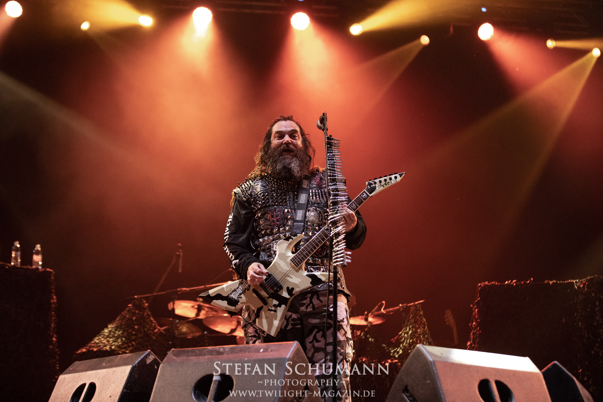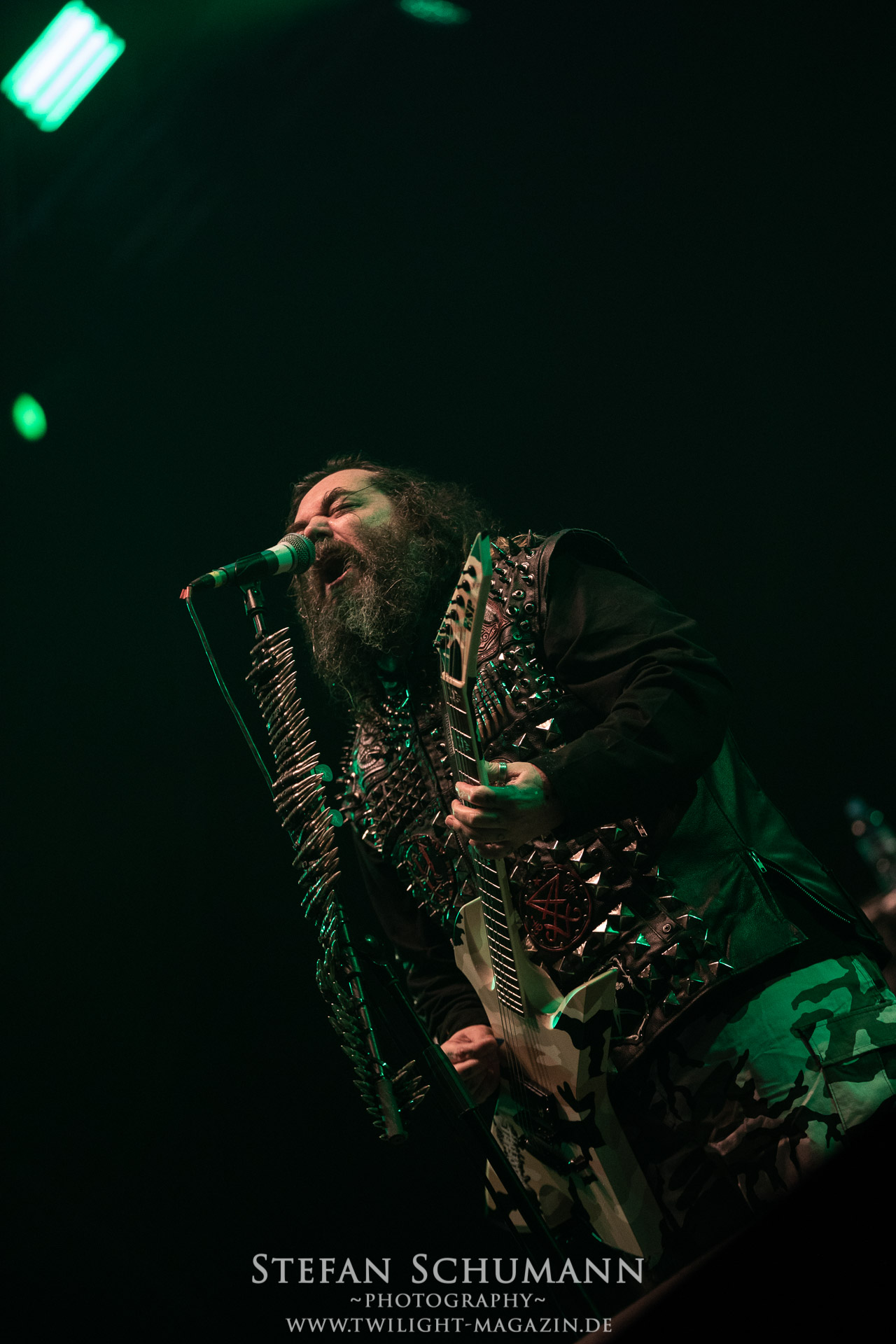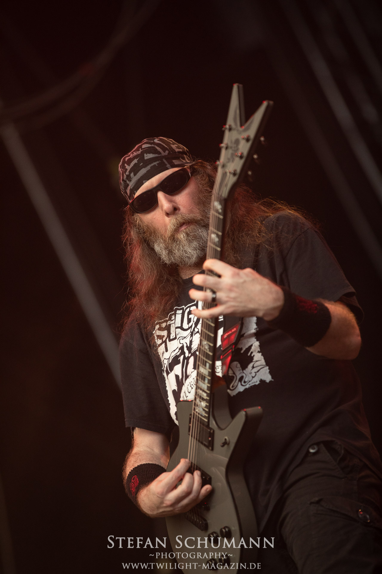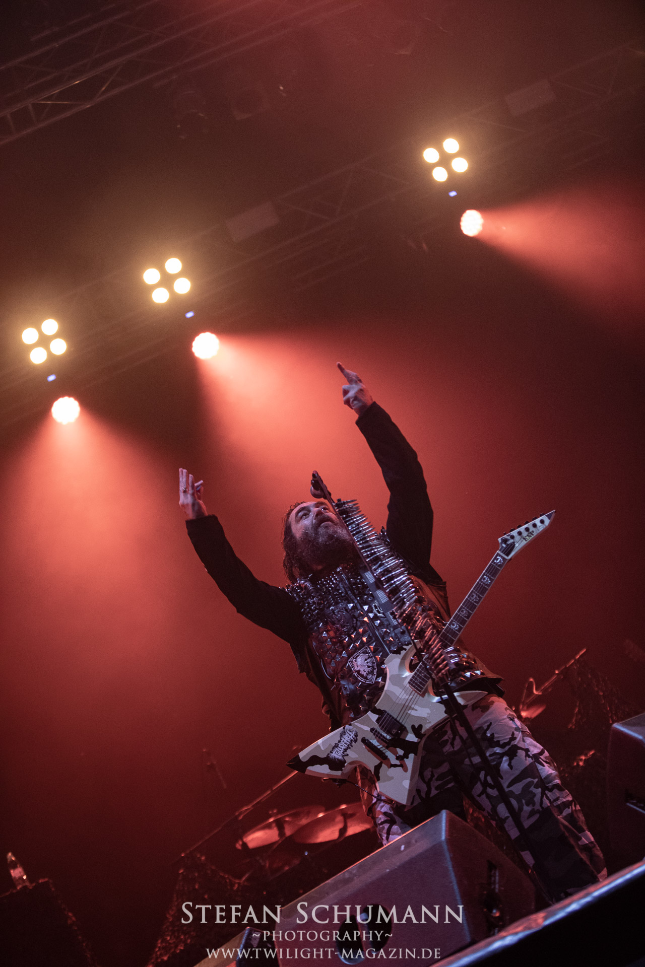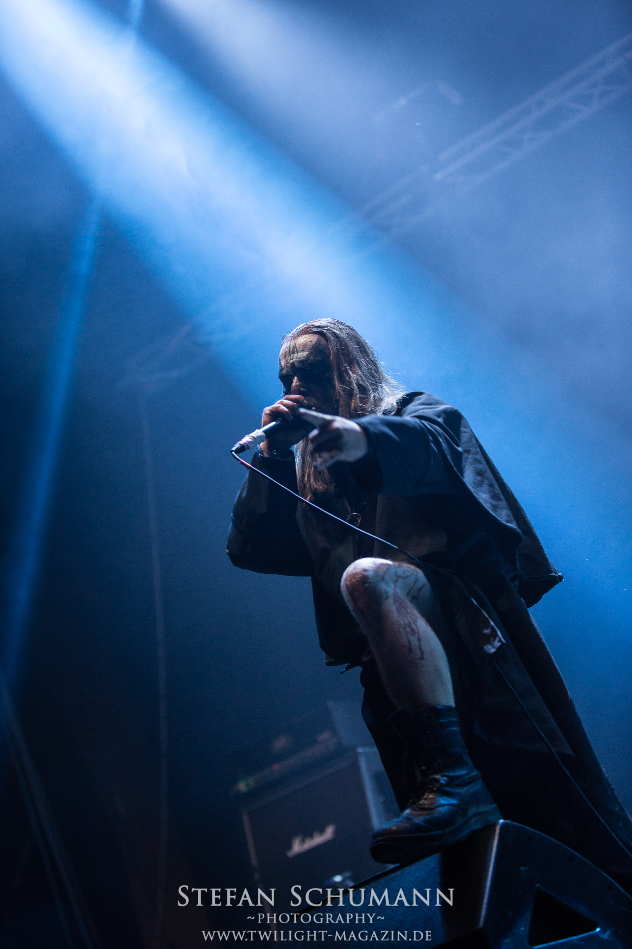 Der letzte Tag beginnt mit einem weiteren, inzwischen fast traditionellen, Überraschungsausflug zur Zweitbühne: Dort unterhalten gerade die jungen Schweizer TYRMFAR die circa 50 anwesenden Gestalten mit ihrer doch sehr bekömmlichen Black/Death-Metal-Mischung, die man sich bei den Großen der Szene abgeschaut hat. Die erste größere Menge findet sich dann vor dem mit Recht immer populärer werdenden Hamburger Duo MANTAR ein, die nur mit Gitarre, Schlagzeug und Gesang eine breitere Doom-Wand erzeugen als andere Bands zu fünft. Nach ihrem letzten Song „Era Borealis“ machen sie dann Platz für die Thrasher MUNICIPAL WASTE, die mit ihrem Anti-Trump-Backdrop politisch eindeutig Stellung beziehen. Auch wenn musikalisch nicht ganz so abwechslungsreich, hat das Publikum deinen Spaß und zerrt zahlreiche Aufblas-Gummitiere in die Circle-Pit.