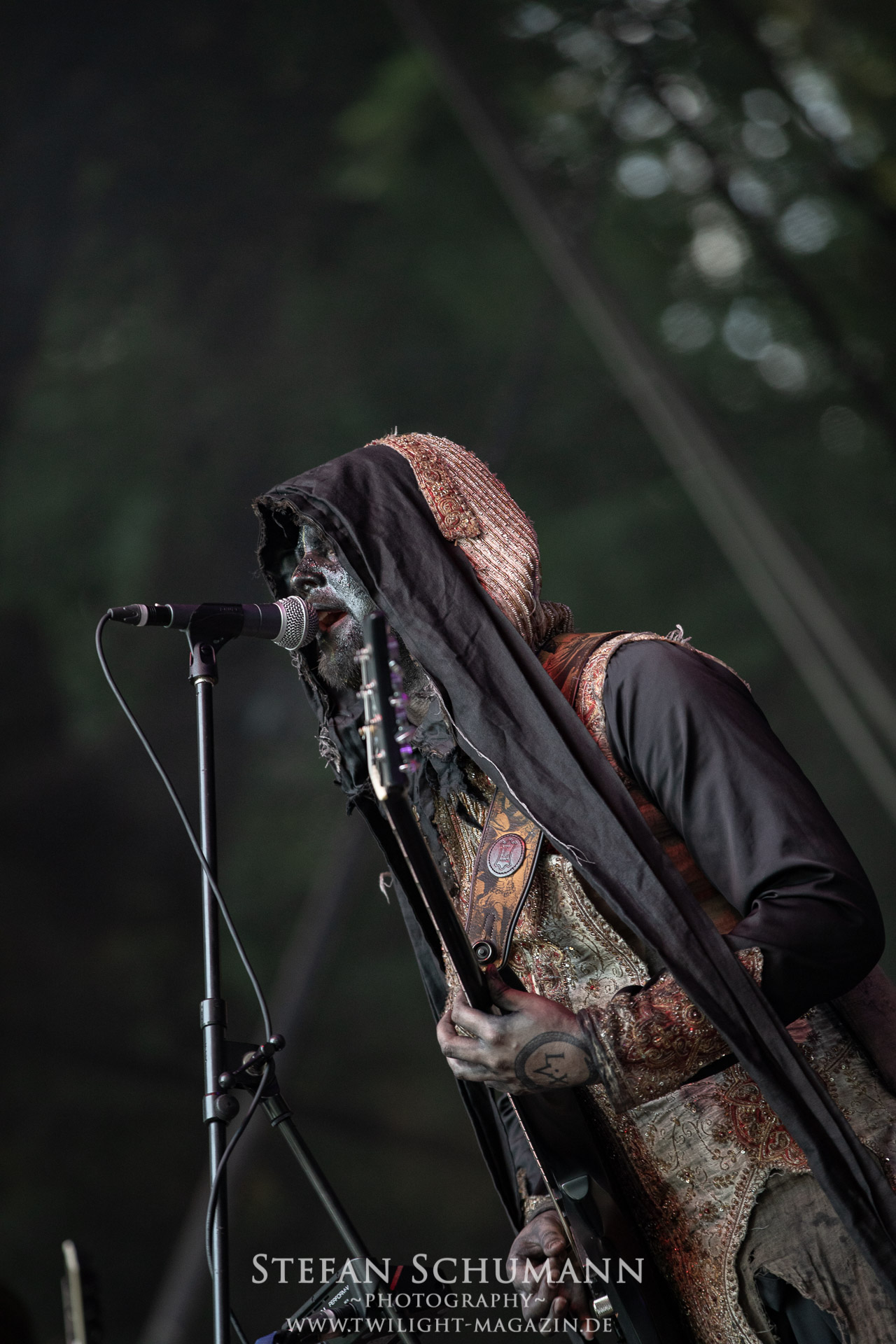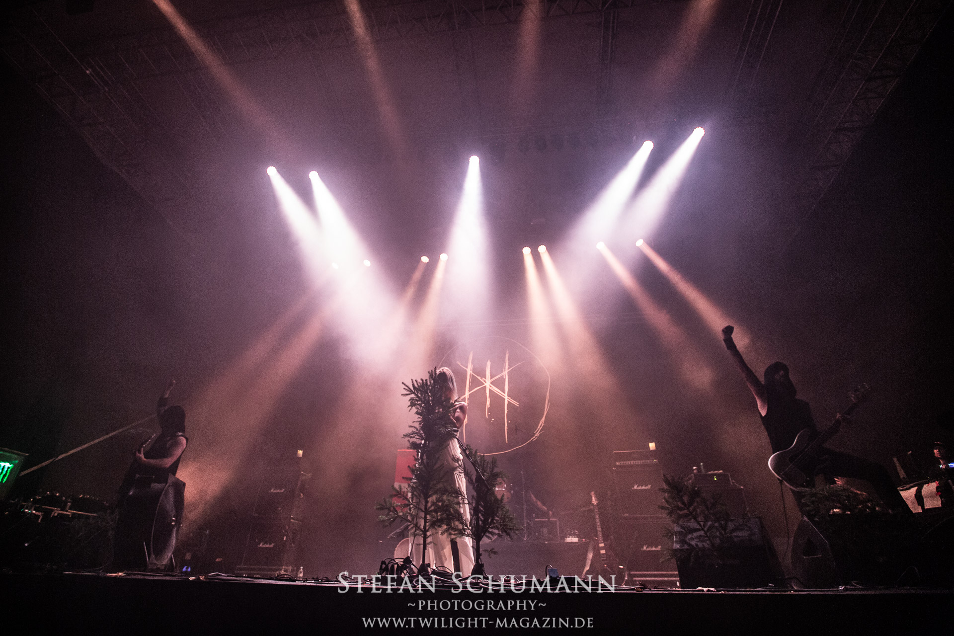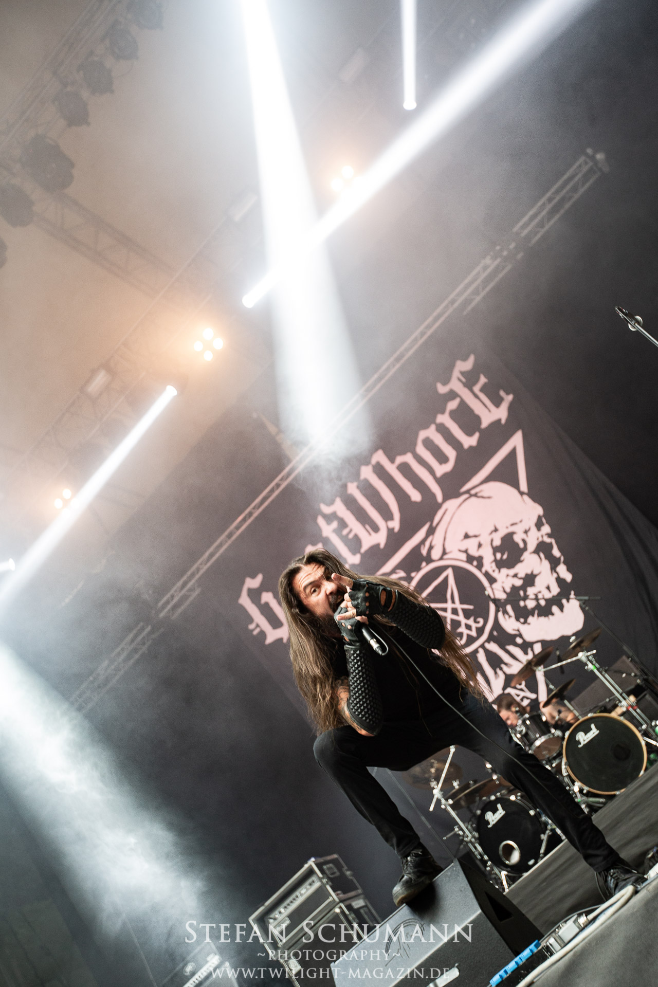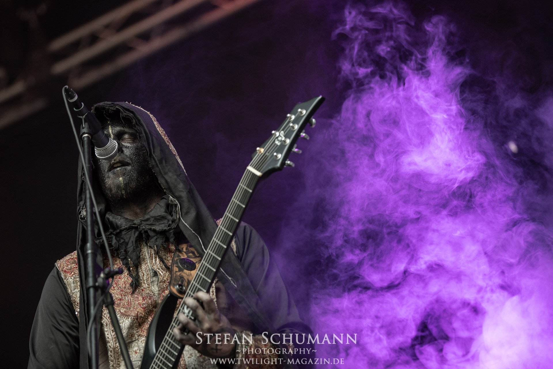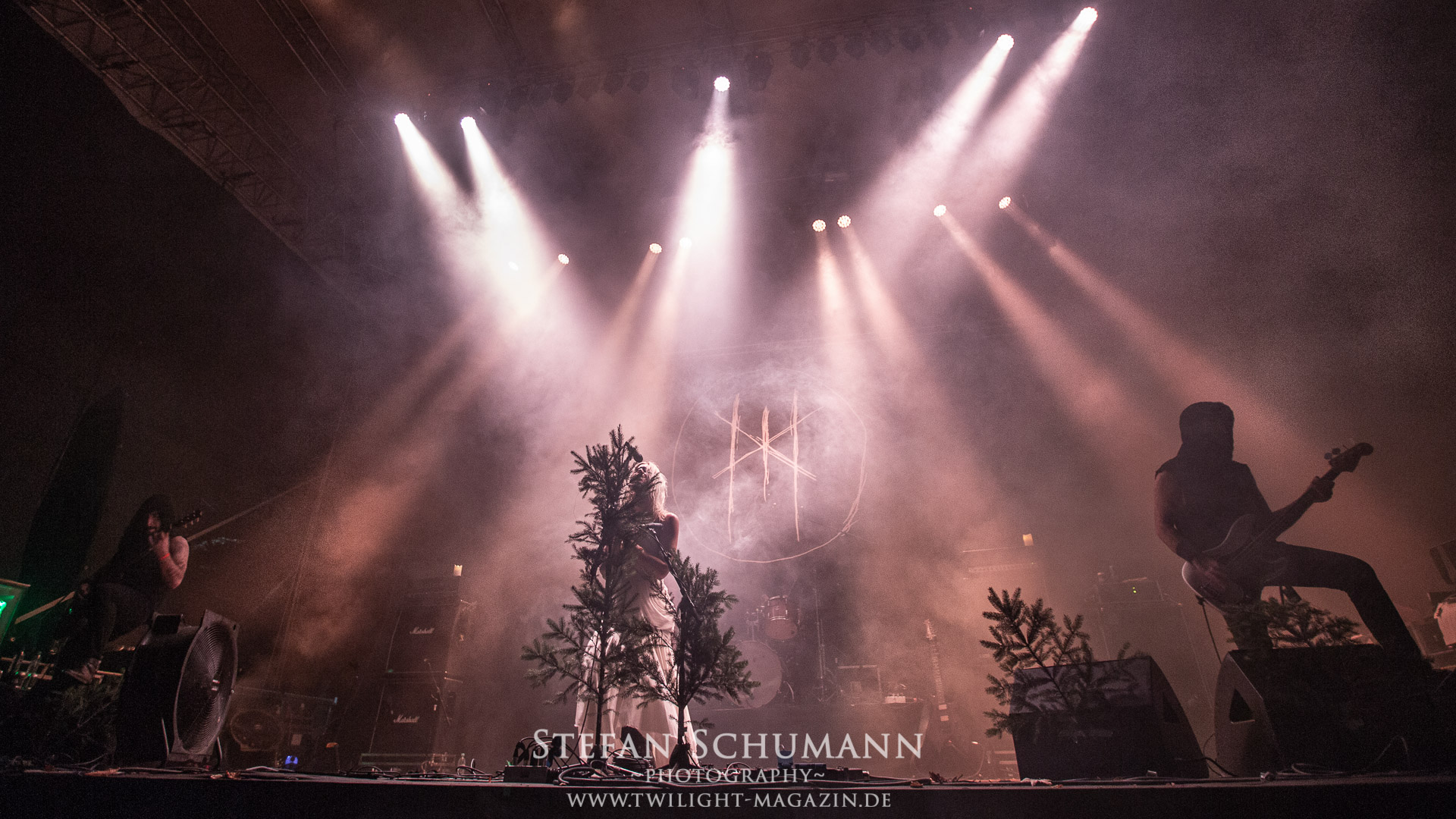 YRKUR, das „Black Metal“-Projekt des dänischen Models Amalie Bruun. Diese steht auch im Mittelpunkt des Auftritts und schreit, wimmert und windet sich durch das einstündige Set, das dann aber doch etwas abrupt früher als gedacht endet.Der letzte Tag beginnt mit einem weiteren, inzwischen fast traditionellen, Überraschungsausflug zur Zweitbühne: Dort unterhalten gerade die jungen Schweizer TYRMFAR die circa 50 anwesenden Gestalten mit ihrer doch sehr bekömmlichen Black/Death-Metal-Mischung, die man sich bei den Großen der Szene abgeschaut hat. Die erste größere Menge findet sich dann vor dem mit Recht immer populärer werdenden Hamburger Duo MANTAR ein, die nur mit Gitarre, Schlagzeug und Gesang eine breitere Doom-Wand erzeugen als andere Bands zu fünft. Nach ihrem letzten Song „Era Borealis“ machen sie dann Platz für die Thrasher MUNICIPAL WASTE, die mit ihrem Anti-Trump-Backdrop politisch eindeutig Stellung beziehen. Auch wenn musikalisch nicht ganz so abwechslungsreich, hat das Publikum deinen Spaß und zerrt zahlreiche Aufblas-Gummitiere in die Circle-Pit.
