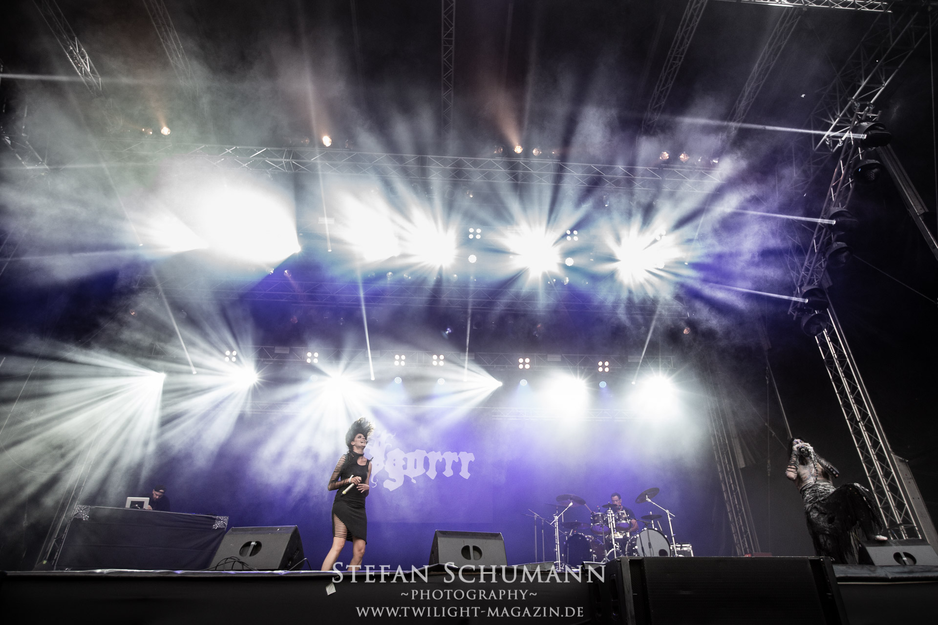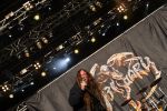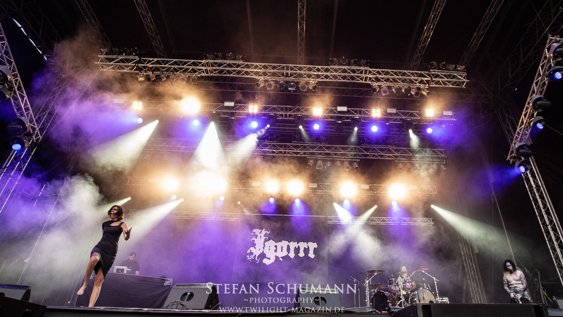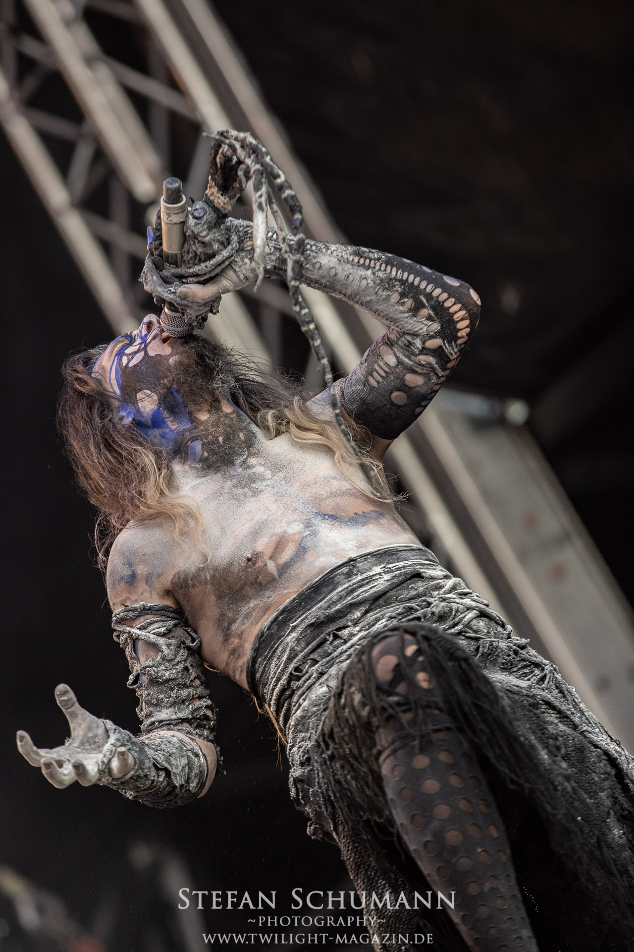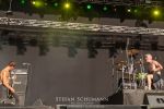 Das kann man von IGORR nicht unbedingt behaupten. Die wohl einzige Band des Festivals, die ohne E-Gitarren auskommt, spaltet mit ihren experimentellen Soundgebilden mit DJ/Sänger, Drummer und Sängerin die Zuhörerschaft. Den einsetzenden Regenschauer nutzen viele Zuhörer dazu, sich in den hinteren Bereich unter das Fress-Zelt zu flüchten. SOULFLY im Anschluss gehen dann auf Nummer sicher und liefern Altbekanntes aus ihrem Oeuvre, das mit „Back to the Primitive“ und „Eye for an Eye“ getoppt wird.