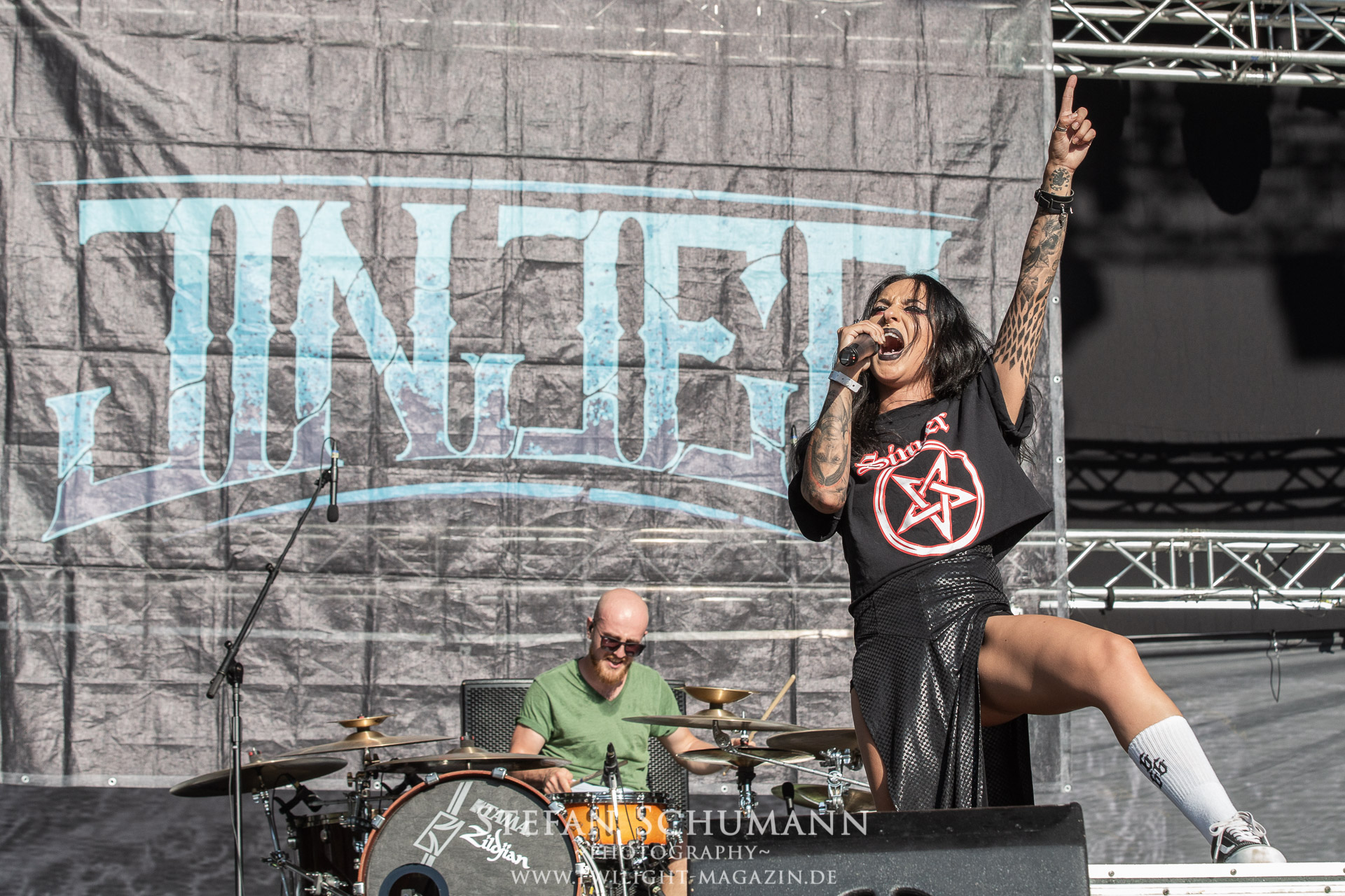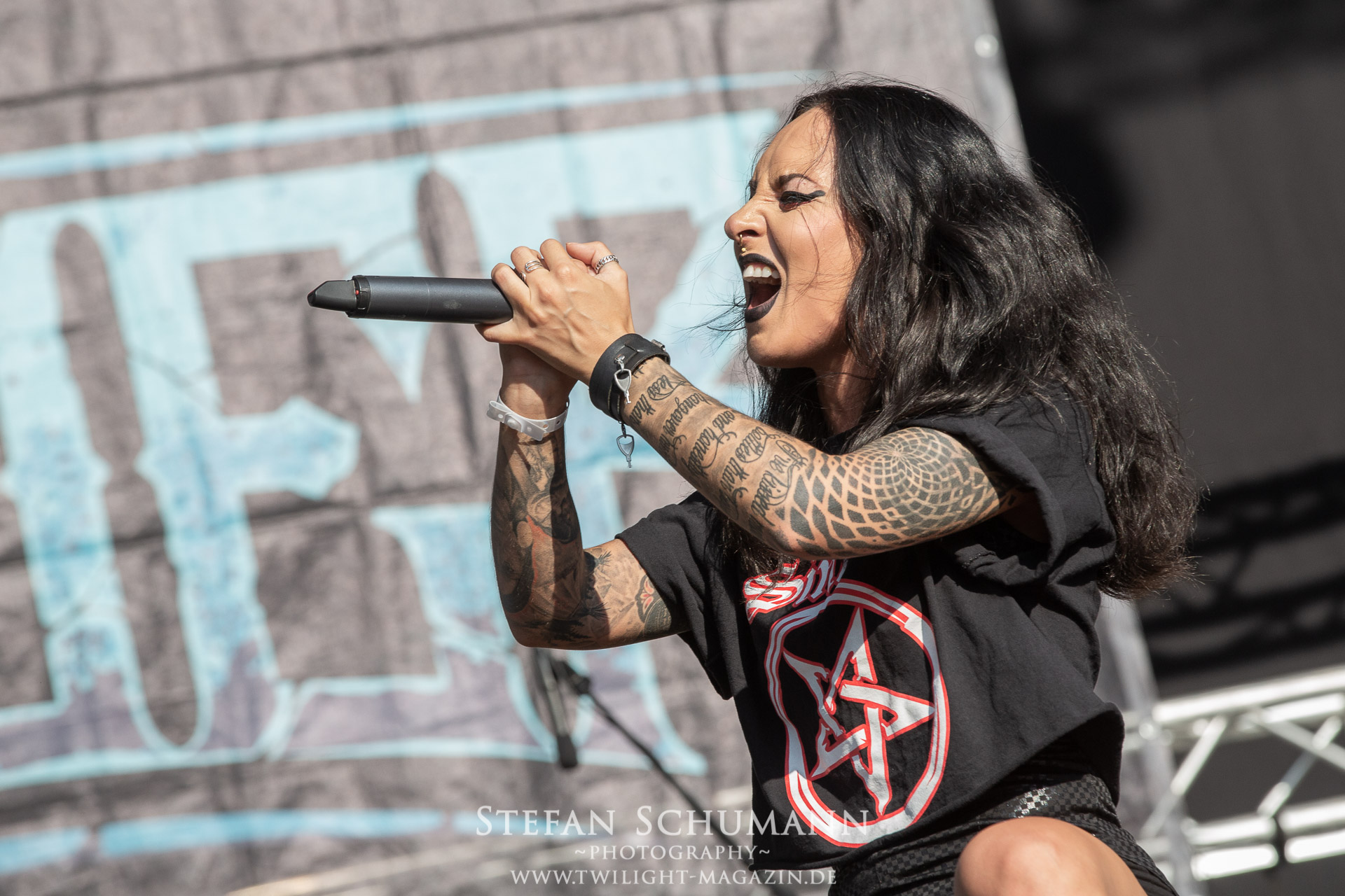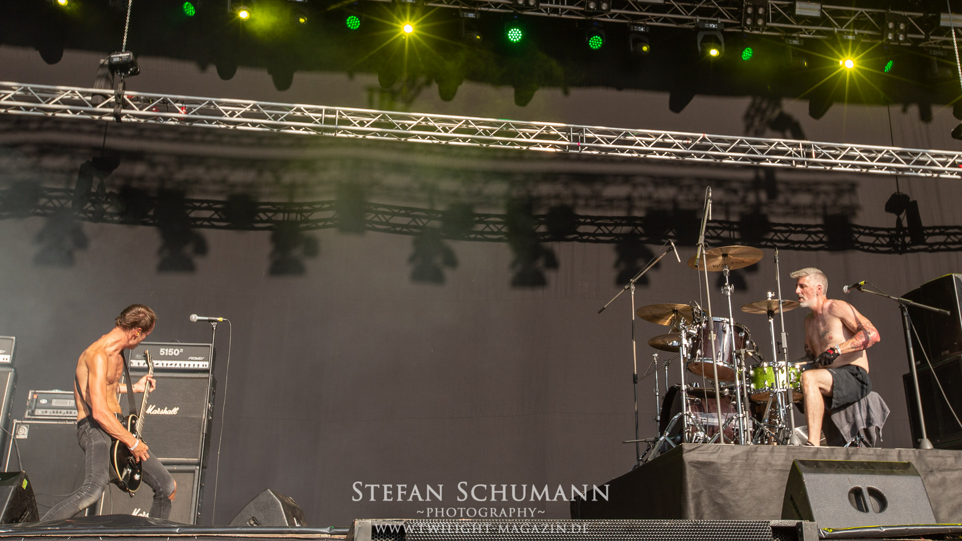 Das kann man von IGORR nicht unbedingt behaupten. Die wohl einzige Band des Festivals, die ohne E-Gitarren auskommt, spaltet mit ihren experimentellen Soundgebilden mit DJ/Sänger, Drummer und Sängerin die Zuhörerschaft. Den einsetzenden Regenschauer nutzen viele Zuhörer dazu, sich in den hinteren Bereich unter das Fress-Zelt zu flüchten. SOULFLY im Anschluss gehen dann auf Nummer sicher und liefern Altbekanntes aus ihrem Oeuvre, das mit „Back to the Primitive“ und „Eye for an Eye“ getoppt wird.