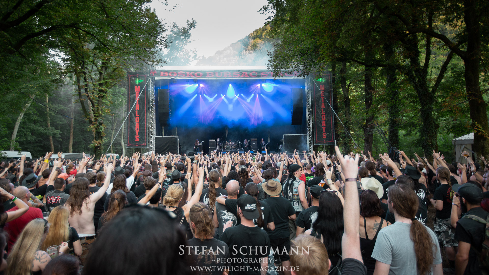 Auf dem eigentlichen Festivalgelände folgt dann die Boško Bursač Stage als Zweitbühne mitten in einem kleinen Wäldchen und umgeben von den üblichen Fress- und Merchandiseständen. Seit ein paar Jahren gibt es zusätzlich noch die New Forces Stage, auf der wie der Name schon sagt, hoffnungsvolle Nachwuchsbands ihr Können unter Beweis stellen können. Die große Hauptbühne ist an den ersten Festivaltagen noch geschlossen und wird erst montags eröffnet. Auf dem sich direkt anschließenden Campground haben circa 12.000 Besucher und Infrastruktureinrichtungen, wie in diesem Jahr kostenlose warme Duschen und ein weiterer Foodcourt Platz. Doch auch die Kleinstadt Tolmin ist nicht weit, und die lokalen Einwohner und Geschäfte haben sich gut auf die Menschenmassen eingerichtet. Neben den Metaldays finden an gleicher Stelle auch ein Punk- und ein Reggae-Festival statt, und so passen die Gastwirte ihre Angebote entsprechend an. Es gibt Metal Burger und Metal Döner, und der lokale Aldi (=Hofer) hat ein paar Regale mehr für Bier frei geräumt. Beim andauernden Kaiserwetter ist das auch auf dem Festivalgelände heiß begehrt. Für etwas Unmut sorgt jedoch die ziemlich intransparente Pfandregelung, bei der man jedes Mal nachschauen muss, ob noch Pfand auf der Karte offen ist und man nicht mit den Pfandbechern vom Vortag zurück auf das Bühnengelände darf.