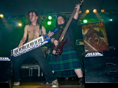 Und der hatte es in sich. Sobald einmal die kleinen Alestorm-Banner hingen, kaperten auch die vier schottischen Freibeuter bald darauf die Bühne. Unter dem Slogan "With an Ale you cannot fail" setzten sie Segel und schipperten los in einen feuchtfröhlichen Abend zwischen launigem Pirate Metal und krudem, schottischem Akzent. Mit viel Spielfreude und seinem quietschebunten, tragbaren Gurt-Keyboard nahm Sänger und Klimperer Christopher Bowes das wohl größte Publikum des Festivals mit auf eine Kaperfahrt quer durch das bislang einzige Album der Band. Der Kultstatus, den die Band im "oberen Untergrund" schon länger besitzt, trug sehr dazu bei, dass der Beutezug der vier Schotten auch im hinterletzten Winkel Deutschlands zu einem vollen Erfolg wurde. Titel wie "Set Sail and Conquer" oder "Wenches and Maids" wurden heiter abgefeiert, und bei "What Shall We Do With the Drunken Sailor" war fast der gesamte Saal am Hüpfen. Umso trauriger, dass es nach einer knappen Dreiviertelstunde schon wieder hieß: "Die Sonne wird bald schon aufgehen, das ist unser letzter Song." Nachdem die Band ihrem Publikum mit einem finalen "Captain Morgan's Revenge" noch eine saftige Breitseite versetzt hatte, waren die ersten, deutlichen "Zugabe"-Chöre des Festivals zu vernehmen. Dann aber hatten Alestorm leider bereits ihre Zeit aufgebraucht und mussten sich ins Back verziehen, um dort die errungene Weißbier-Beute gerecht zu teilen.