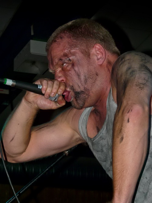 Dann aber hieß es endlich: Bühne frei für die notorischen Unterhemden-Träger Dead Emotions. Zwar betitelt die Münchner/Freisinger Formation ihren Stil als "Gothic/Death Metal", letztlich war aber nur Letzteres wirklich herauszuhören: Der (kunst-)rußbeschmierte Fünfer feuerte eine ordentliche Salve brutales Geknüppel und Gegrunze in das (immer noch recht dünne) Publikum. Ausgerechnet Sänger Mosh aber konnte seinem Namen diesmal nicht wirklich gerecht werden: Mal abgesehen von Gwydion, die mittlerweile im Publikum standen und artig mitmoshten, ließ sich hier nicht viel reißen - weder mit "Point of No Return" vom Anfang Januar erschienenen Album, noch mit martialischer Gestik und Mimik. So blieben Dead Emotions leider bis zuletzt etwas farblos - trotz der schwarzen Flecken auf der weißen Weste.