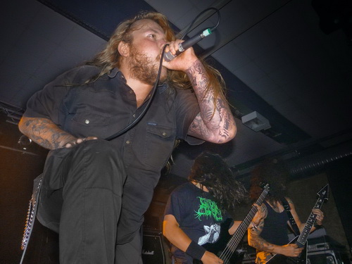 Und dann war erstmal wieder Schluss mit lustig, sauberen Vocals und filigranen Gitarrenlinien. Das "Dismember"-Shirt des Drummers von Fleshcrawl gab die Richtung schon ganz gut vor: Für die kommende Stunde gab's Ohrenbluten mit Oldschool-Death! Wie üblich hatte die Truppe aus Bayerisch Schwaben ihr Standard-Repertoire an Titeln mit dabei: Von "Soulskinner" über "As Blood Rains from the Sky" bis "Into the Fire of Hell" war alles da, wofür Fleshcrawl bekannt und beliebt sind. Sonderlich viel war in Passau allerdings dennoch nicht los. Jenseits des Moshpits nahe den ersten Reihen reagierte das nach Tyr leicht ausgedünnte Publikum recht verhalten - daran konnten auch die etwas lahmen Ansagen und Motivationsversuche von Sänger Sven nicht viel ändern. Irgendwann klang nämlich alles reichlich gleich, sowohl was die Instrumentierung, als auch die Vocals anging.