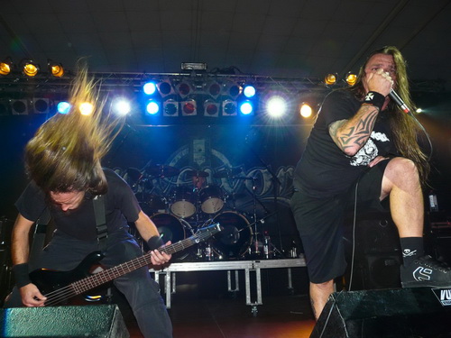 Nach kleineren Problemen mit dem Mikro konnten die Italiener von Graveworm dann zu später Stunde endlich loslegen. Gerade mich, an dem die Band sowohl in CD-Form als auch live immer vorübergegangen war, beeindruckten die Südtiroler von Anfang an. Statt der kümmerlichen MeloBlack/Gothmetal-Nummer, die ich eigentlich erwartet hatte, gab's deftig eins auf die Zwölf! Auch der Rest des Publikums wachte nach der leichten Lethargie, die Neaera zurückgelassen hatten, wieder auf und machte ordentlich mit, wenn Sänger Stefan Fiori zwischen fetten Grunts und hohem Gekeife hin- und herwechselte. Nach einem guten Querschnitt durch die eigene Diskografie, von "Nocturnal Hymns" am einen bis "Suicide Code" am anderen Ende, verkündete er freudig: "Nachher kommen wir runter und saufen gemeinsam! Ich habe heute noch nichts getrunken" Ob nach dem Schlusstitel "Touch of Hate" und den zwei Zugaben noch etwas aus diesem Versprechen wurde, kann ich aber nicht sagen. Die Italiener hatten mir mit ihrem fulminanten Gig so gründlich den Nacken verdreht, dass ich die nachfolgendem Schwarzmetaller von Sycronomica gar nicht erst mitbekam, sondern mir schon vorher etwas Ruhe gönnte, bevor's am nächsten Tag weiterging.