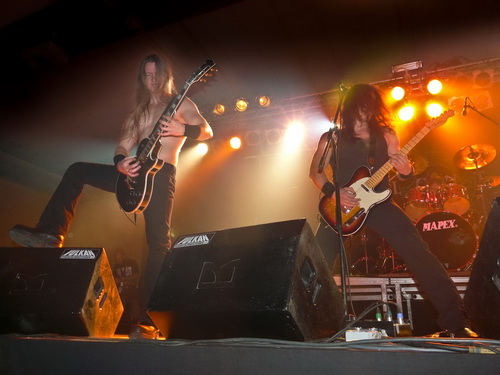 Ähnlich leer, aber deutlich lahmer war's dann leider bei Gwydion. Dabei lag das weniger an der satten Portion bisweilen melodischen, aber gleichzeitig sehr kraftvollen Folk/Viking Metals, den die sechs Portugiesen servierten. Ohne einen zweiten Mosh-Wettbewerb konnte sich aber trotzdem niemand so richtig durchringen, die müde Mähne in Bewegung zu setzen. Dennoch spielten Gwydion ihre knappen fünf bis sechs Titel, deren Akkordeon-Einlagen und Atmosphäre mich etwas an Turisas erinnerte, energisch herunter - und erkundigten sich nach dem Gig verwundert im Publikum, woran es denn gelegen habe. Eines konnte man ihnen aber versichern: An ihrem Konzert mangelte es sicher nicht.