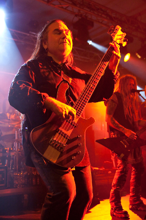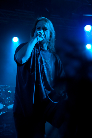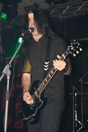 Dann wurde mit ein paar Flammen und "Continue To Kill" der Death Metal Gig begonnen und die ersten Moshpits waren zu sehen. Die Frage nach einem Songwunsch von Seiten des Publikums wurde mehr oder weniger kommentarlos mit dem Hinhalten eines begrünten Zweiges beantwortet und Sänger Thomas verstand sofort. Also wurde "Blatt für den Blattgott" vorgetragen, zu dem die Meute ordentlich bangte. Die Screams waren leider gewohnt mickrig, aber das machte der Rest der Musik mal locker wieder wett.