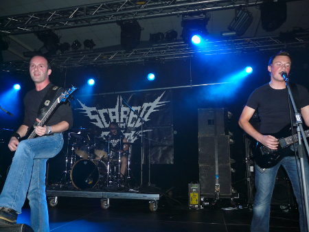 Unsere alten Bekannten Scared to Death waren wieder da und es machte erneut Spaß, den Jungs zuzusehen. Aus unbekannten Gründen sprangen diese für Emancer ein und begann ihr Thrashgeknüppel mit "Deathstruction" und "Extrem Aggression". Zwischendruch wurden T-Shirts in die Menge geworfen, als kleine Belohnung für die große Teilnahme. Leider war das Mikro ein wenig zu leise, so dass man den Gesang kaum vernahm und das Publikum schon mit "Mikro lauter!"-Rufen begann. Besser wurde es nicht, aber das störte unsere bayrische Musikkapelle nicht und so wurde den Fans auch "Your Pain Is My Passion" entgegen geknüppelt. Das war echt eine gute Leistung mit der die Band wohl zufrieden sein dürfte. Weiter so, Männer.