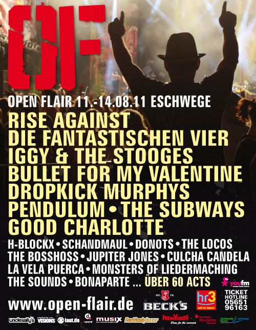 "Wer zu spät kommt, den bestraft das Leben!“ Dieses Sprichwort passte dieses Jahr wohl auf alle Spätentschlossenen, die kurz vor knapp noch ein Ticket für das Open Flair in Eschwege erhaschen wollten. Wobei Spätentschlossene eigentlich die falsche Beschreibung ist, schließlich war das Festival sage und schreibe zwei Monate vor Startschuss ausverkauft. Und das, obwohl es mit etwa 20.000 Besuchern das größte Festival war, das Eschwege bis dahin organisiert hatte. Also, wer dieses Jahr kein Ticket mehr bekommen hat, der sollte schnell handeln und sich jetzt schon Karten für 2012 sichern. Vermutlich wird auch das kommende Open Flair, falls es nicht vorhat, sich erheblich zu vergrößern, frühzeitig ausverkauft sein. Bereits zwei Wochen nach Toresschluss 2011 melden die Veranstalter 5500 verkaufte Tickets für 2012. Woran das wohl liegen mag? Ich glaube, ich weiß es! Es liegt an diesem unglaublichen Flair, von dem einfach alle mitgerissen und so schnell nicht wieder losgelassen werden. Das Open Flair ist eines dieser charmanten Festivals, das nicht weit ab von der Zivilisation auf einem abgelegenen Acker ausgetragen wird, sondern das angrenzende Stadtgebiete in einen positiven Ausnahmezustand versetzt. Spielte also gerade mal keine Band, schoben sich Massen von gut gelaunten Feierwütigen friedlich durch die Eschweger Innerstadt. Wer sich erfrischen wollte, und dazu nicht die campingplatzeigenen Duschen nutzen wollte, ging eben einfach ins nahegelegene Hallenbad. Außerdem ließen die vier Bühnen keine Zeit für Langeweile. Während die HR3-, die Frei- und die Seebühne Rockmusik in all ihren Fassetten boten, konnte man im Kleinkunstzelt Lesungen und sonstiger Kultur lauschen. Da ich mit meinen anderen Festivals dieses Jahr wetterbedingt etwas Pech hatte, auf dem Open Flair 2011 dafür aber umso mehr Spaß, erkläre ich es zum geilsten Festival des Sommers 2011. Wollt ihr genauer wissen warum? Dann lest weiter.