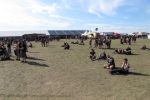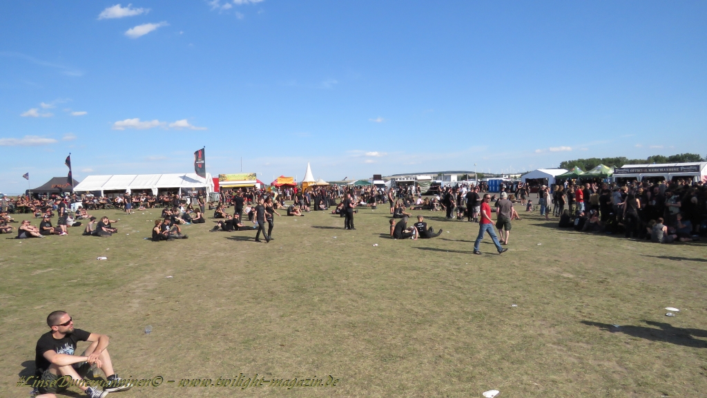Nachdem man den Besuchern mit dem Whiskey-Pub eine äußerst gediegene Neuerung angekündigt hatte, darf man den massiven Ausbau der (gegen Entgelt) vorreservierbaren Campingflächen und dem damit verbundenen Verlust an freien Flächen durchaus diskutieren. Denn die Reservation garantiert keinesfalls kurze Wege, allerdings kann sie zeitversetzt anreisenden Gruppen jedoch einiges an Stress ersparen. Es gilt das Windhund-Prinzip und damit die alte Tatsache "Wer zuerst kommt...", sowohl bei der Reservierung, wie auch bei der klassischen Anreise ohne Vorreservierung. Eine Vielzahl von im Vorfeld abgesteckter Claims sollte eigentlich auch der Security bzw. den Einweisern die Arbeit erleichtern, doch bei unserer zeitigen Anreise am Mittwoch-Vormittag müssen wir leider erstmalig im Bereich der freien Camping-Flächen eine komplett überforderte Crew dabei erleben, die auf den Platz strömenden Massen mit angemessenen Campingflächen zu versorgen und dabei sicherheitsrelevante Aspekte zu beachten. Letztendlich ist das Problem dann aber relativ schnell behoben und nachdem unser massiver Pavillon ausgerechnet zu jenem Zeitpunkt aufgebaut wird, als sich der einzige relevant aber sturmumtoste, unwetterartige Regenguss des gesamten Wochenendes über die noch jungfreuliche Spielwiese ergießt, kehrt nicht nur Ruhe sondern feierliche Vorfreude ins alljährliche Lagerleben ein. Und diese positive Erwartungshaltung will gepflegt werden, wofür einmal mehr beim traditionellen Metal-Disko - Auftakt im Zelt mit Speis und Trank der Boden bereitet ist, wobei dem Stammkunden recht schnell auffällt, dass sowohl die Bierpreise wie auch der Preis der superben Weimarer Bratwurst leicht angezogen haben. Neben der feuchten Husche von oben haben die Meteorologen auch zielsicher den damit einhergehenden massiven Temperatursturz vorher gesagt, was des Nächtens nicht nur für ungewöhnliche Temperaturen nahe des Gefrierpunktes, sondern am Donnerstag Vormittag auch zum Wolldecken-Engpass bei einem Textil-Discounter in der Schlotheimer City sorgt. Selbst in den schattigen Nächten zu Bad Berka habe ich es in all den Jahren nie so frostig empfunden, wie in diesem Jahr zum Festival-Auftakt. Weitere Kapriolen bleiben jedoch erfreulicher Weise aus und insgesamt meinen es die Wetterfrösche mit den Veranstaltern und dem Publikum auch 2016 mehr als gut. Zwar bleibt es mitunter durchwachsen, doch mit mit voranschreitender Dauer darf sich im Verlauf der nächsten Tage mehr und mehr die Sonne durchsetzen.