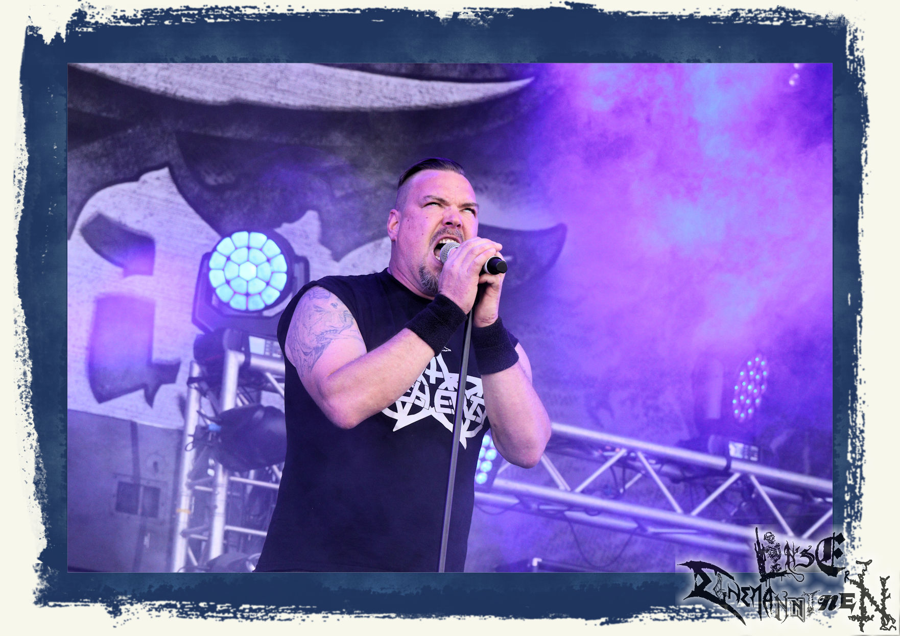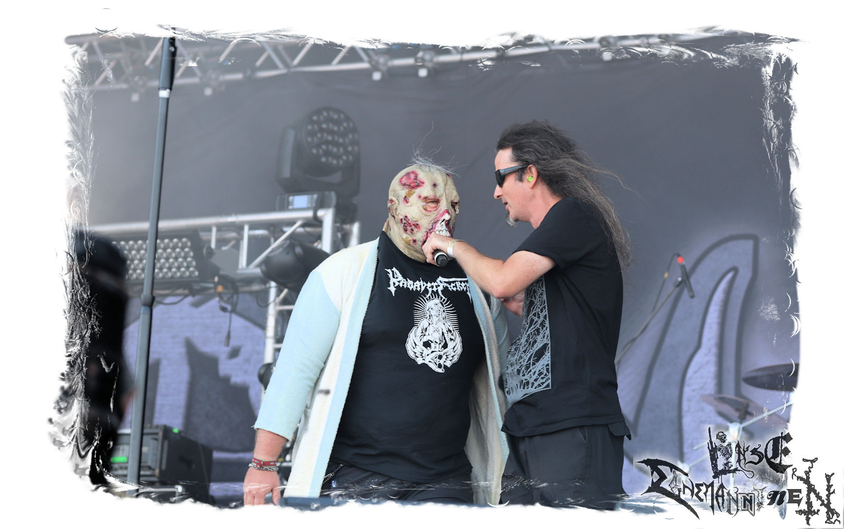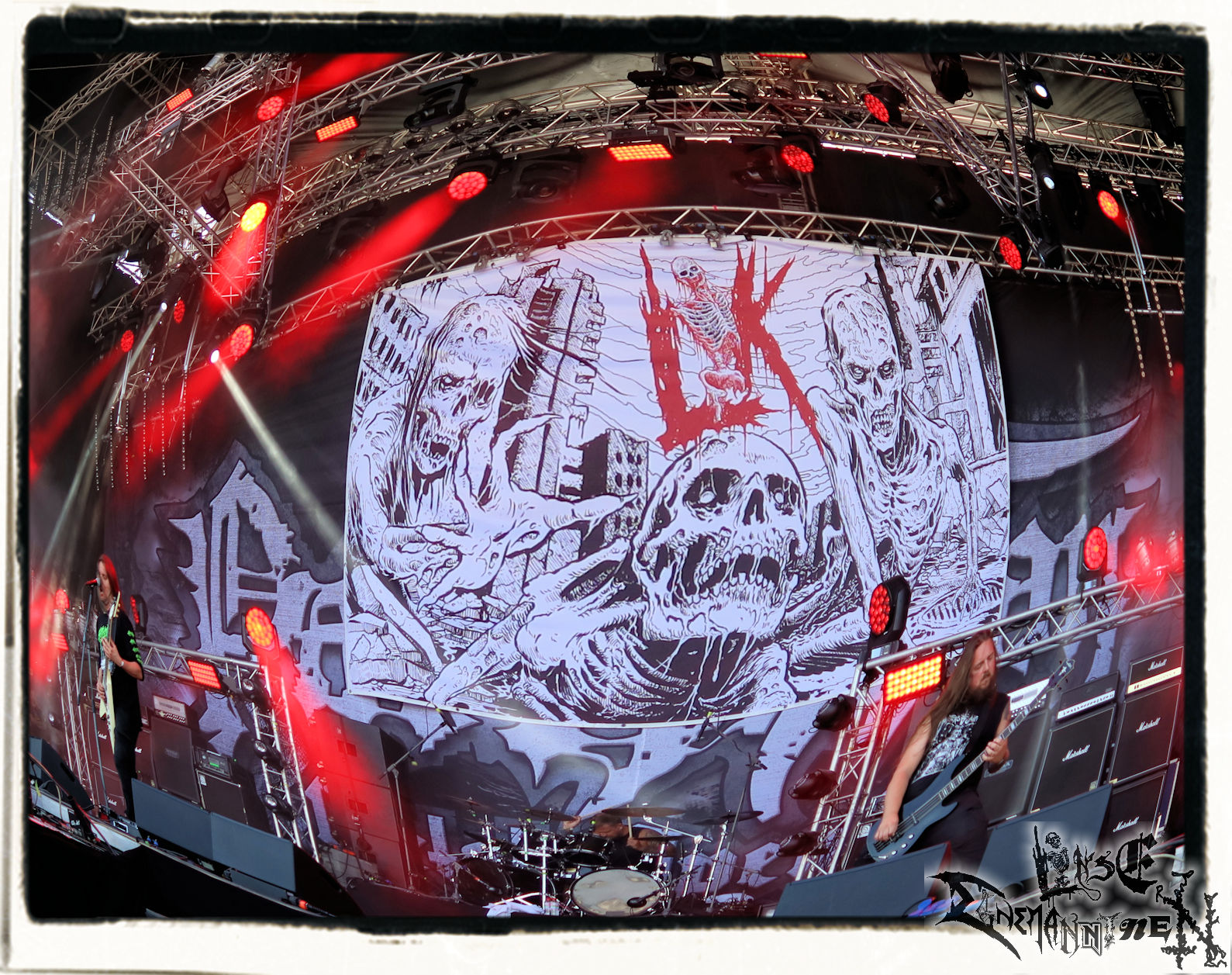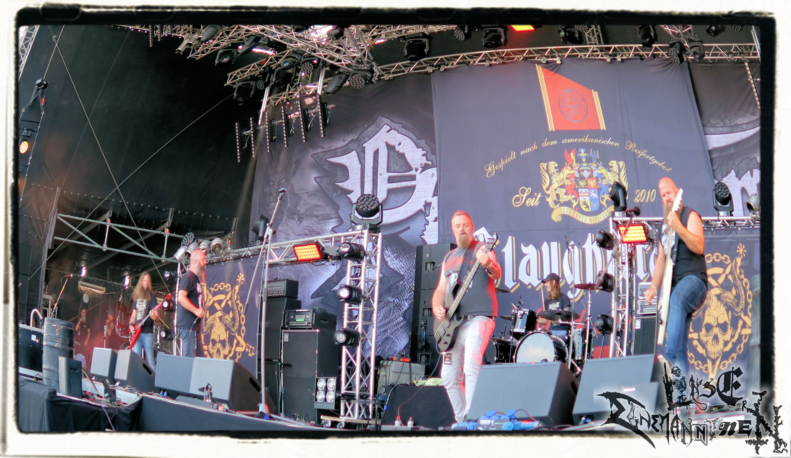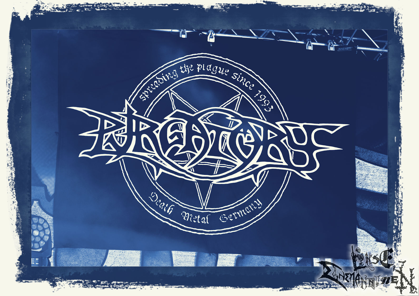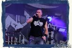Denn der Samstag wird von SLAUGTERDAY eröffnet. Auf Platte gehört das Duo, das sich live kompetente Unterstützung holt, schon seit dem Debüt zu meine Faves. Das Review machen sie mit dem kreativsten Backdrop des Festivals leicht. In Anlehnung an das Köstritzer-Design steht da „Leeraner Metal Kunst - Gespielt nach dem Amerikanischen Reifertgebot“. Das passt, schließlich haben sich die Jungs nach dem Autopsy-Song benannt. Mit ´Ancient Death Triumph´ startet der Gig, der sich trotz guter Coverversionen auf den Scheiben erfreulicher Weise auf Eigenkompositionen beschränkt. Mit ´Cosmic Horror´ und ´Abbatoir´ werden auch die älteren Scheiben berücksichtigt. Am Ende sieht man Sänger Bernd an, dass er bewegt von diesem Auftritt und der Reaktion des Publikums ist. Ein sehr gelungener Start in den letzten Festivaltag. Ich freue mich auf das nächste Album "Tyrants Of Doom", das im September erscheint. (Trille) Weiter geht es ohne Gnade mit einem (Ost-)deutschen Todesmetall-Urgestein PURGATORY bzw. Nossens Finest. Die Sachsen liefern seit Jahrzehnten beständig und qualitativ hochwertigen, blasphemischen Death Metal, technisch brilliant, dabei jedoch immer roh und von einer Aura des Gefährlichen umgeben. Mit "großer" Kapelle bzw. zwei Gitarristen kommt nicht nur das Material vom aktuellen Album "Apotheosis Of Anti Light" richtig fett. Über die Qualitäten von Sänger Dreier brauchen wir nicht zu reden, erst recht nicht von den Methusalixen Kögel (Guitar, Vocals) und Lutz (Drums), die eigentlich langsam mal für das "Lebenswerk" Purgatory ausgezeichnet werden müssten. Besser, als mit dieser unheiligen Allianz von Slaughterday und Purgatory kann man den Tag echt nicht beginnen, es sei denn, man trinkt einen White Russion dazu! (JD)