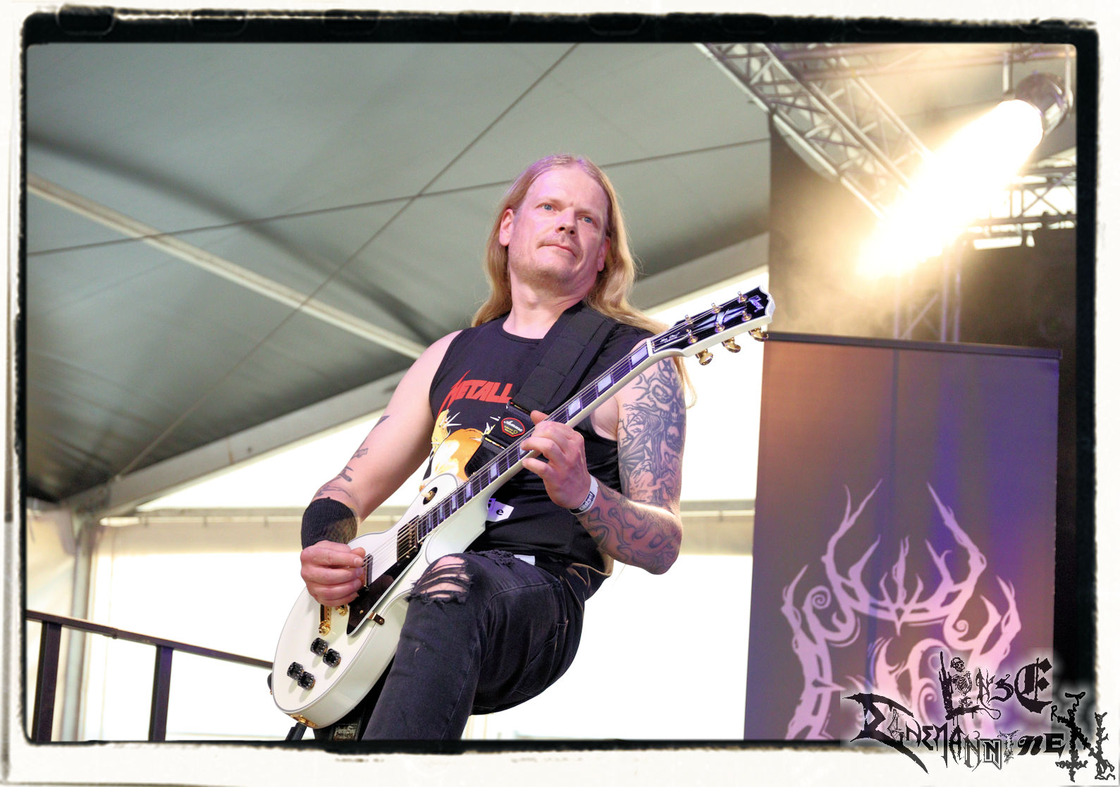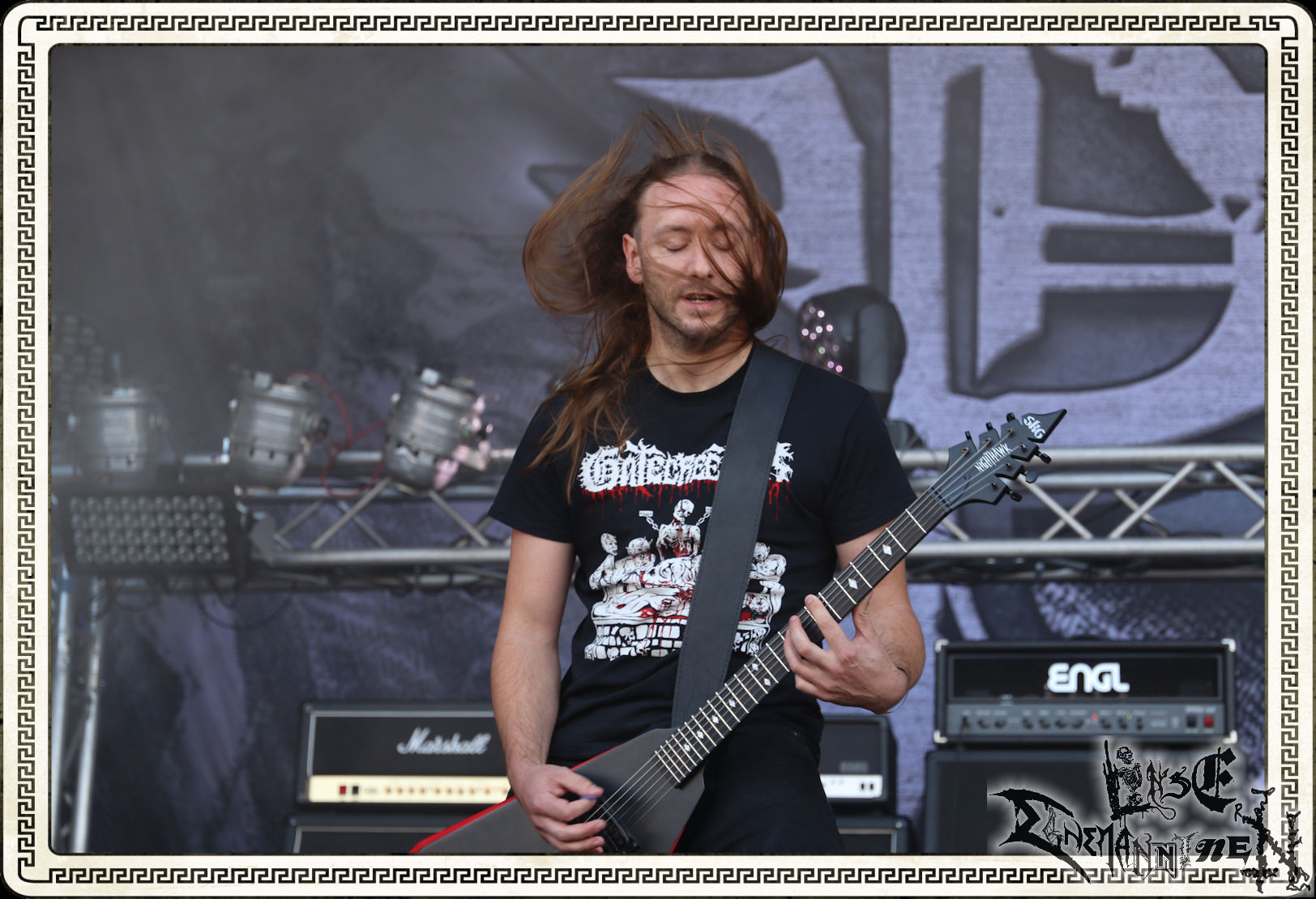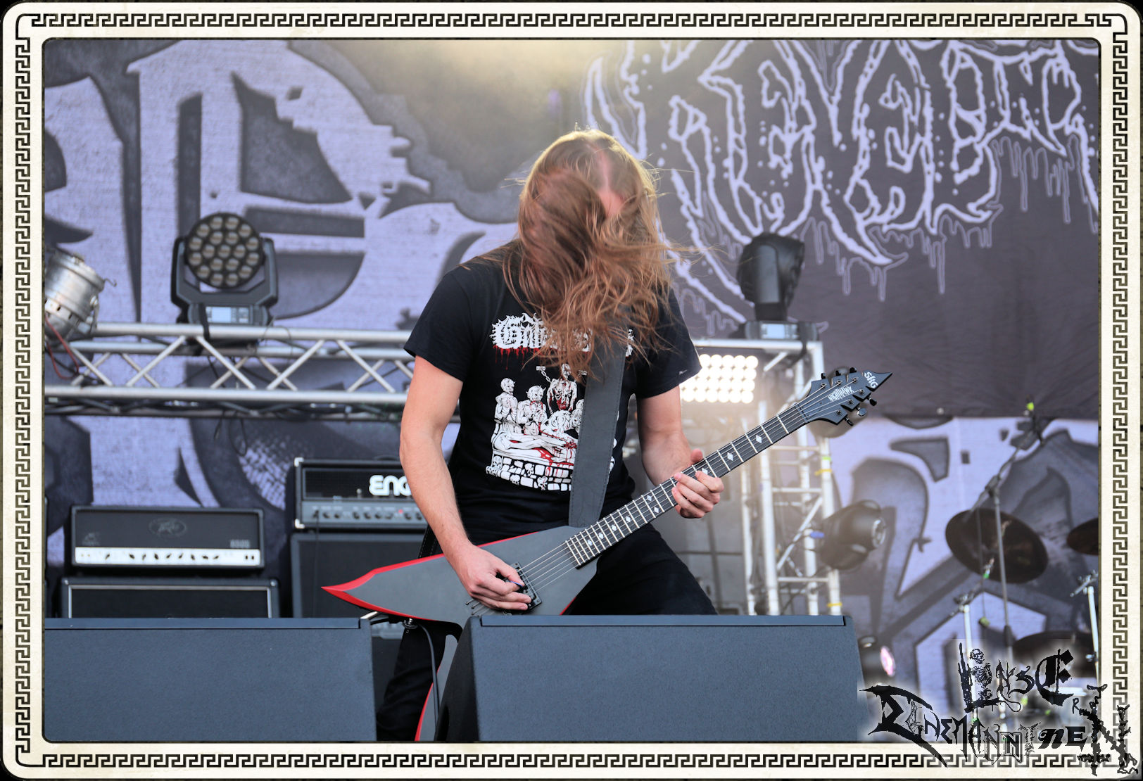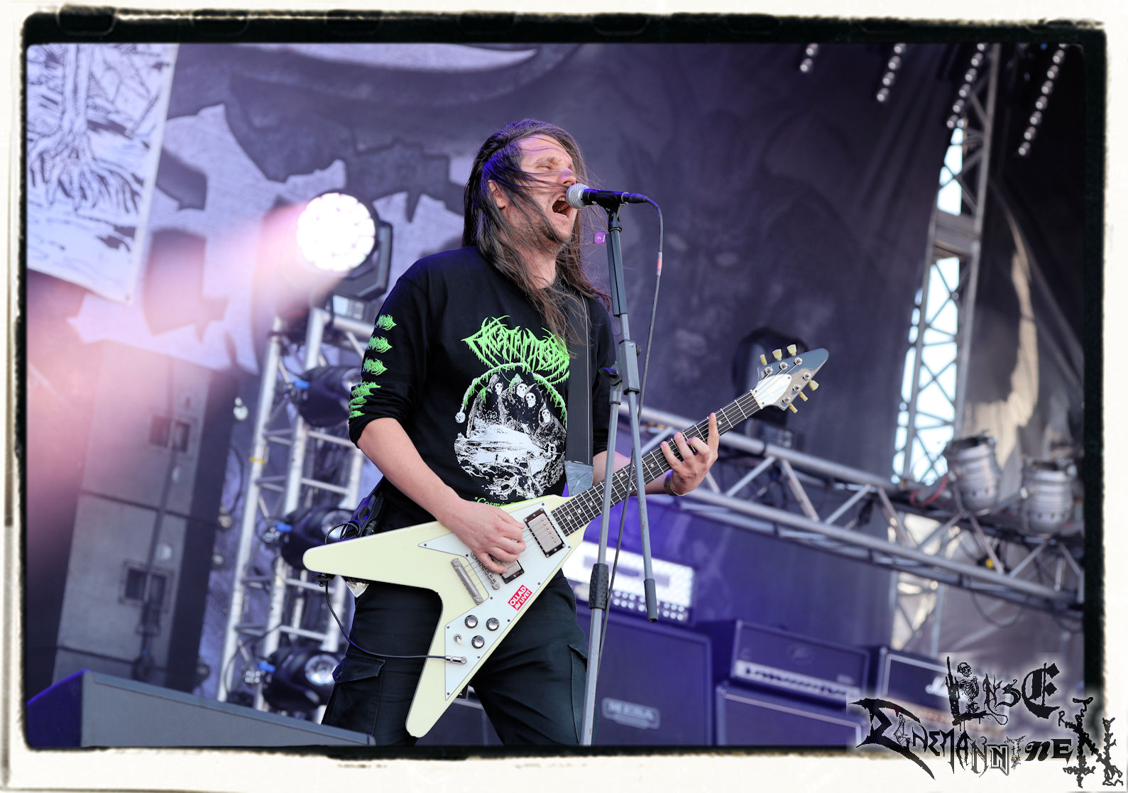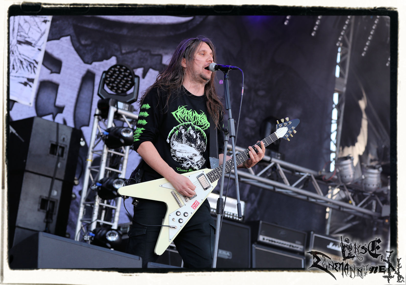 Denn der Samstag wird von SLAUGTERDAY eröffnet. Auf Platte gehört das Duo, das sich live kompetente Unterstützung holt, schon seit dem Debüt zu meine Faves. Das Review machen sie mit dem kreativsten Backdrop des Festivals leicht. In Anlehnung an das Köstritzer-Design steht da „Leeraner Metal Kunst - Gespielt nach dem Amerikanischen Reifertgebot“. Das passt, schließlich haben sich die Jungs nach dem Autopsy-Song benannt. Mit ´Ancient Death Triumph´ startet der Gig, der sich trotz guter Coverversionen auf den Scheiben erfreulicher Weise auf Eigenkompositionen beschränkt. Mit ´Cosmic Horror´ und ´Abbatoir´ werden auch die älteren Scheiben berücksichtigt. Am Ende sieht man Sänger Bernd an, dass er bewegt von diesem Auftritt und der Reaktion des Publikums ist. Ein sehr gelungener Start in den letzten Festivaltag. Ich freue mich auf das nächste Album "Tyrants Of Doom", das im September erscheint. (Trille) Weiter geht es ohne Gnade mit einem (Ost-)deutschen Todesmetall-Urgestein PURGATORY bzw. Nossens Finest. Die Sachsen liefern seit Jahrzehnten beständig und qualitativ hochwertigen, blasphemischen Death Metal, technisch brilliant, dabei jedoch immer roh und von einer Aura des Gefährlichen umgeben. Mit "großer" Kapelle bzw. zwei Gitarristen kommt nicht nur das Material vom aktuellen Album "Apotheosis Of Anti Light" richtig fett. Über die Qualitäten von Sänger Dreier brauchen wir nicht zu reden, erst recht nicht von den Methusalixen Kögel (Guitar, Vocals) und Lutz (Drums), die eigentlich langsam mal für das "Lebenswerk" Purgatory ausgezeichnet werden müssten. Besser, als mit dieser unheiligen Allianz von Slaughterday und Purgatory kann man den Tag echt nicht beginnen, es sei denn, man trinkt einen White Russion dazu! (JD)
