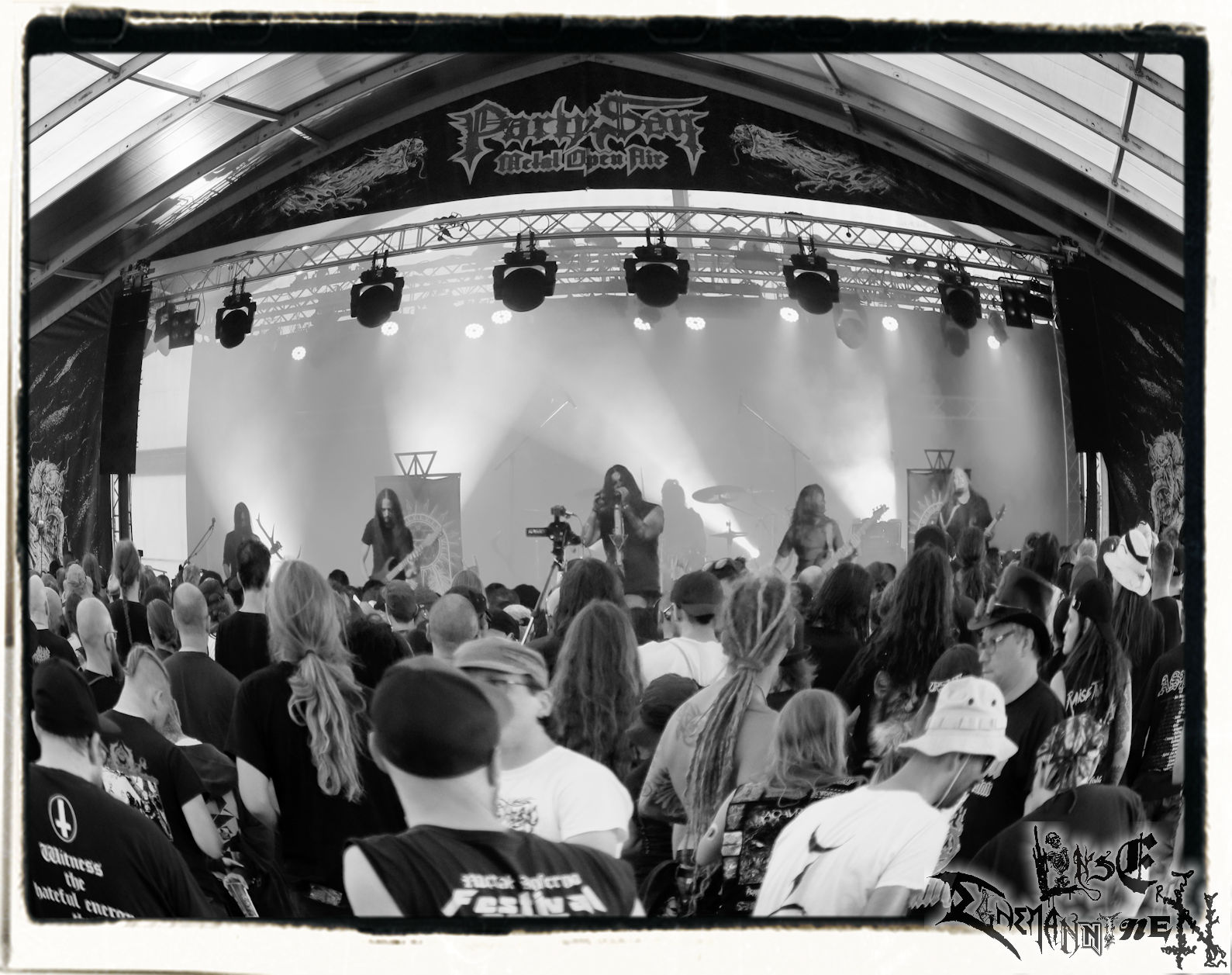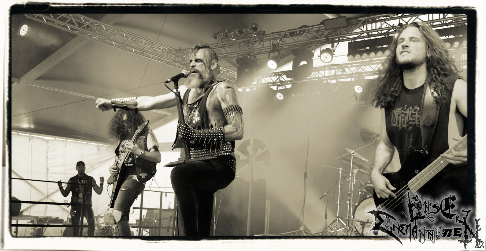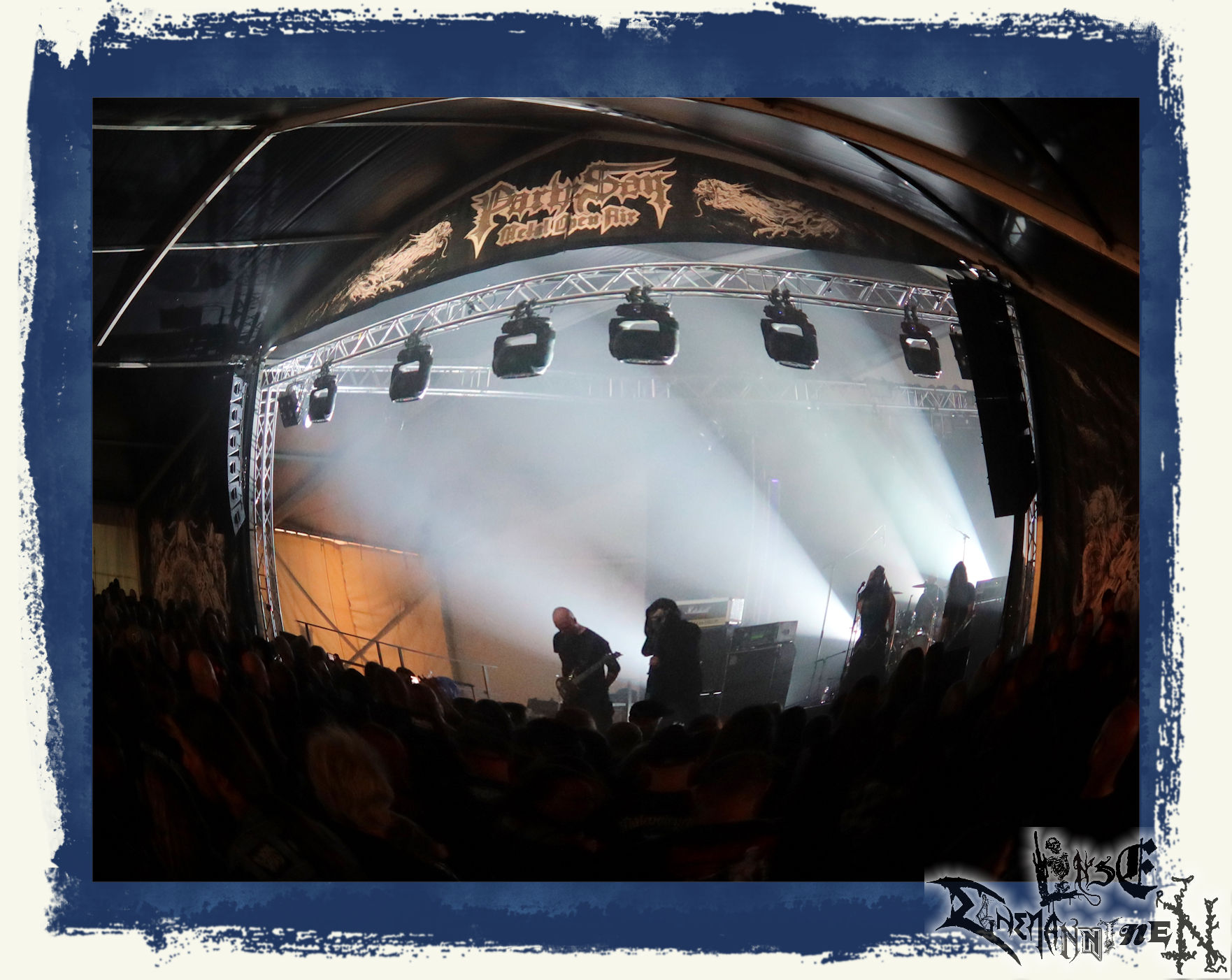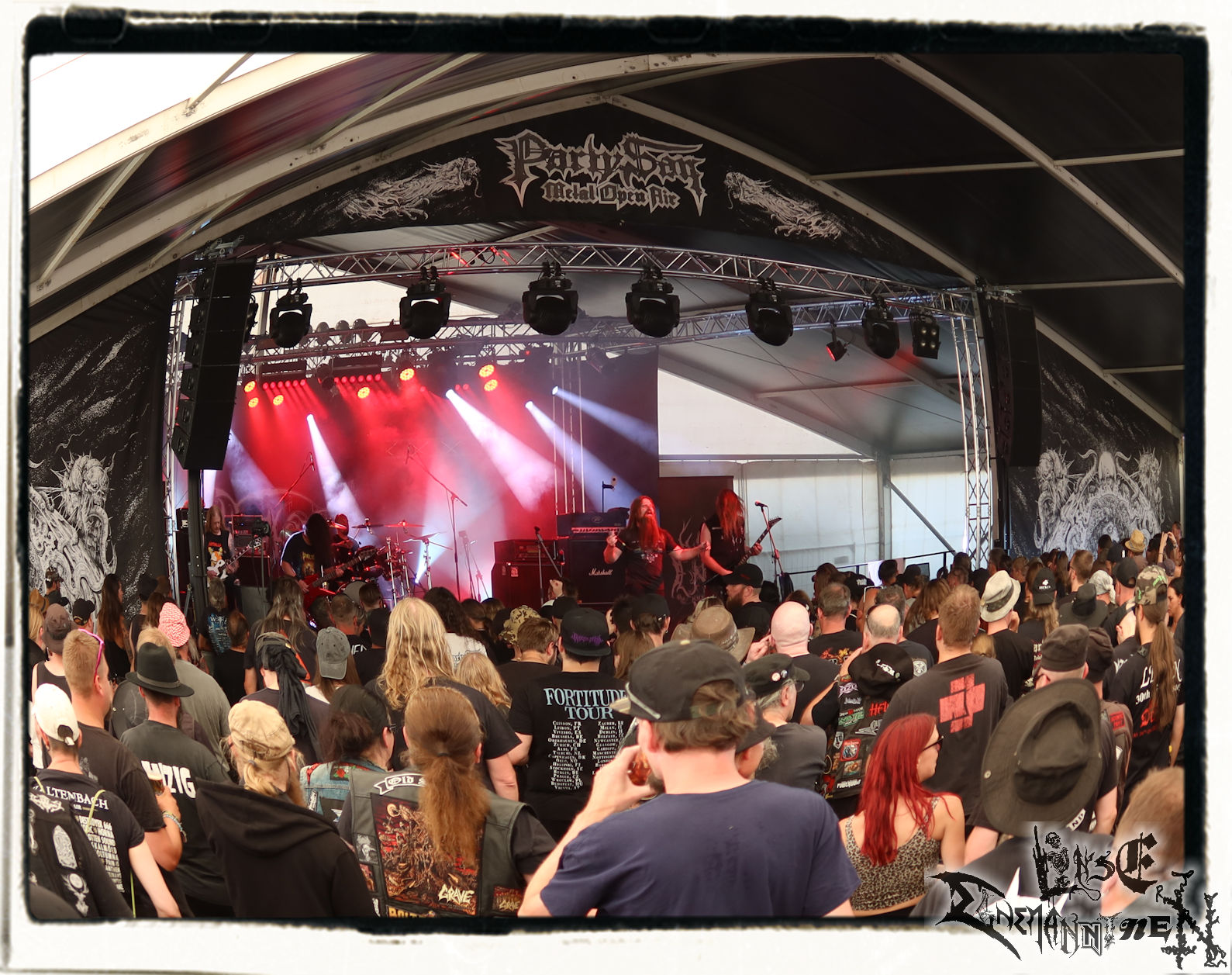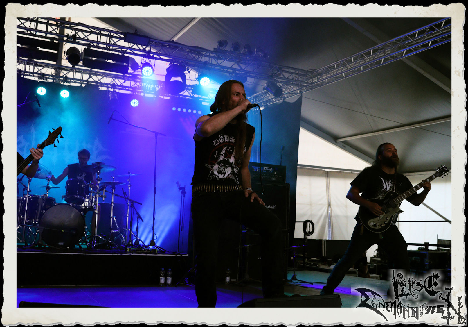 Mit EIS wird der Abend eingeläutet. Die Band aus dem Lupus Lounge – Stall ist wie geschaffen für das Zelt auf dem PARTY.SAN METAL OPEN AIR und beweist eindrucksvoll, wie man Atmosphäre mit mitreißenden Black Metal – Songs kombiniert. Bandkopf Alboin ist gleichzeitig Fan und Vollblutmusiker, der mit den Schwarzmetall-Größen der Neunziger aufgewachsen ist, wobei seine Musik sowohl von diesen, als auch von seiner Bewunderung gegenüber prägenden heimischen Acts wie Helrunar oder auch dem Wirken von Schwadorf mit Sun Of The Sleepless beeinflusst ist. Auch macht er keinen Hehl daraus, dass ihm die Einladung nach Schlotheim mit seiner Band als "Spätberufenem" sehr viel bedeutet. Und diese Haltung schwingt in diesem Konzert mit. Egal, ob Songs vom 2005er-Album "Galeere" ("Durch lichtlose Tiefen", seinerzeit noch unter dem Bandvorgänger Geist veröffentlicht (aus namensrechtlichen Gründen musste man sich danach in Eis umbenennen), vom bisher jüngsten Album "Bannstein" oder vom Klassiker "Wetterkreuz" (2012), der heuer auch schon zehn Jahre auf dem Buckel hat, gespielt werden. Eis zünden ein kleines Highlight, das mir noch lange in Erinnerung bleiben und mich animiert, mir die Scheiben mal wieder zu Gemüte zu führen. Danke!(JD)