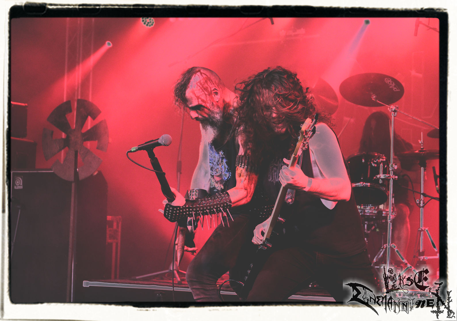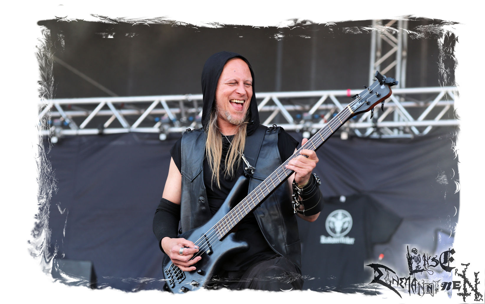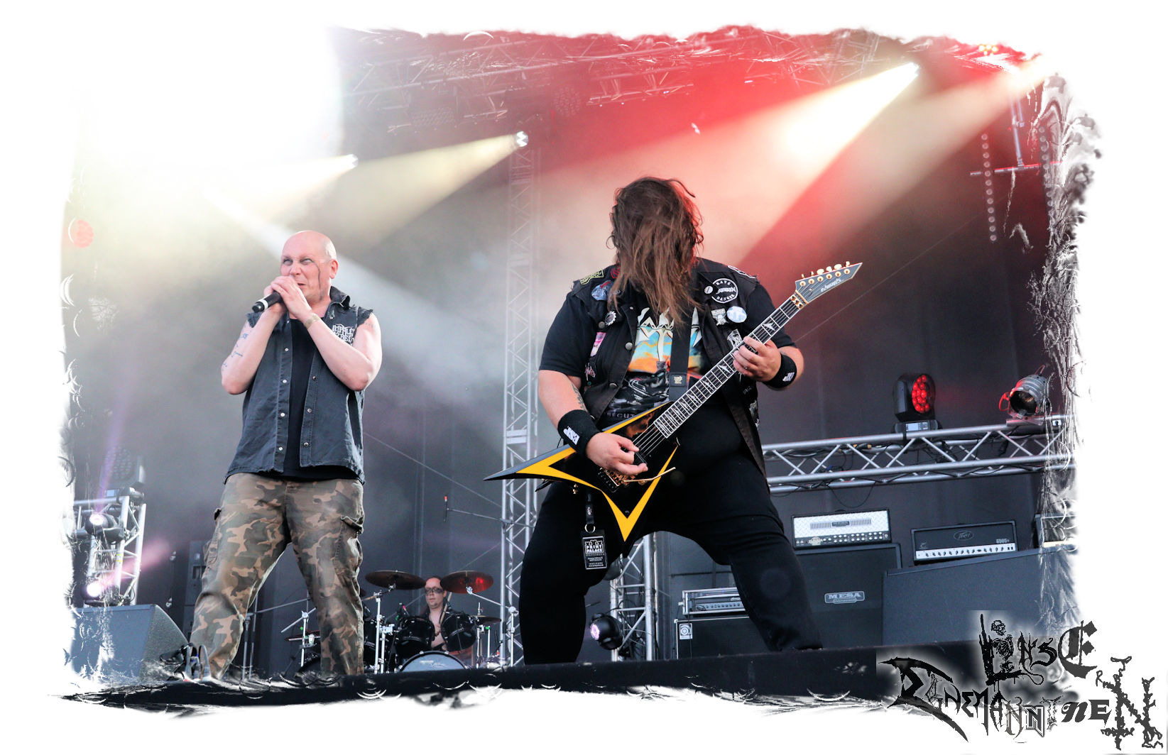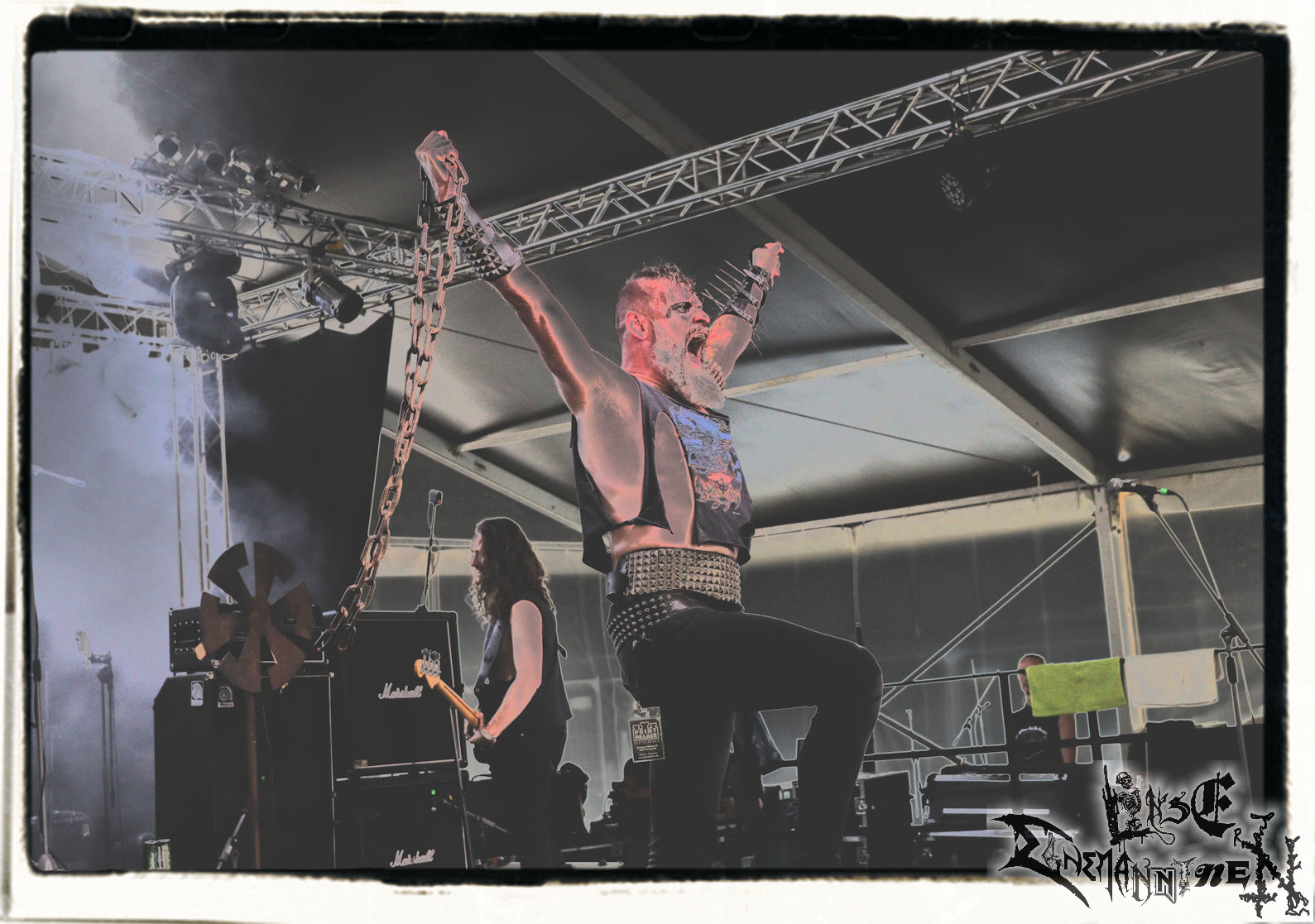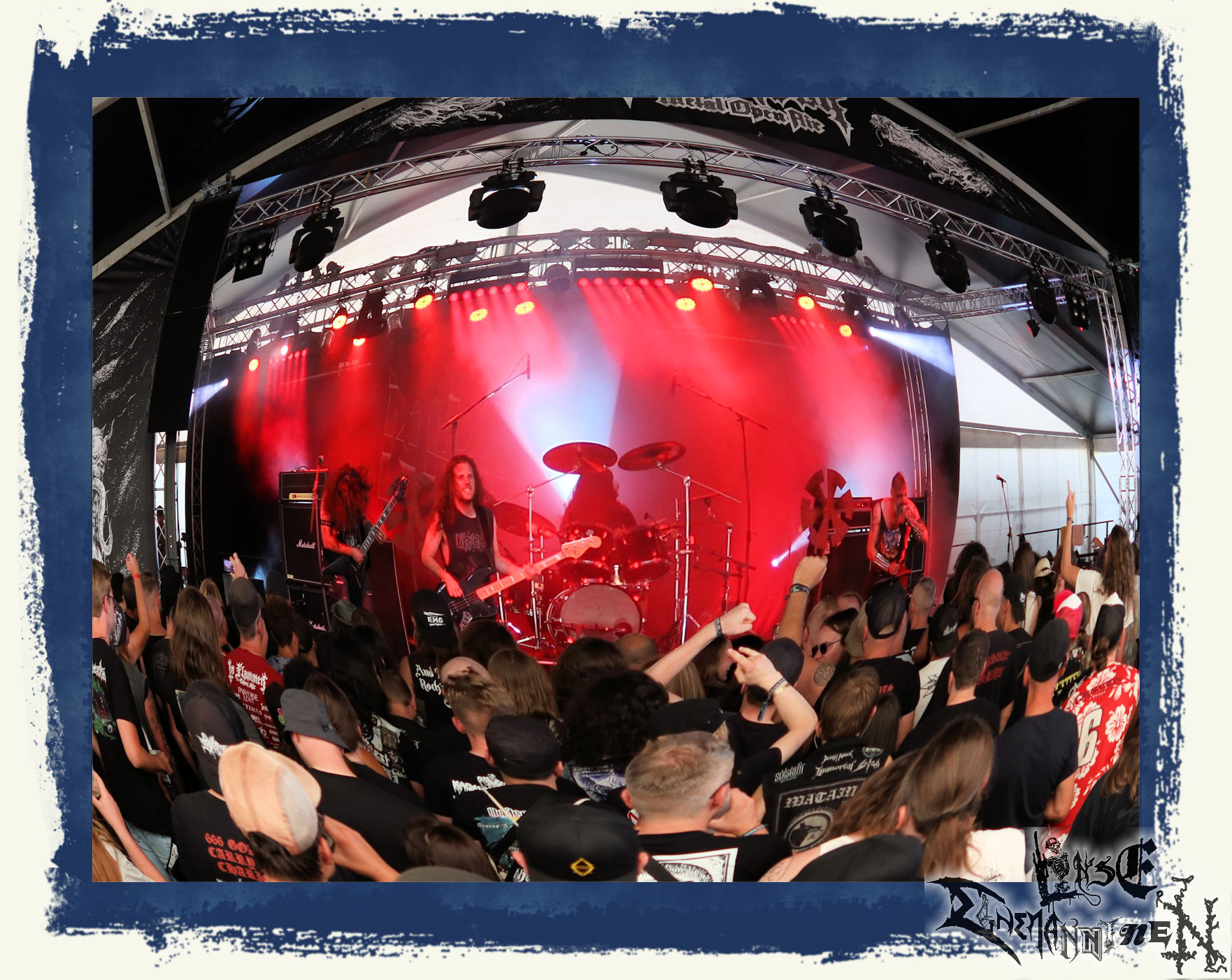 Mit EIS wird der Abend eingeläutet. Die Band aus dem Lupus Lounge – Stall ist wie geschaffen für das Zelt auf dem PARTY.SAN METAL OPEN AIR und beweist eindrucksvoll, wie man Atmosphäre mit mitreißenden Black Metal – Songs kombiniert. Bandkopf Alboin ist gleichzeitig Fan und Vollblutmusiker, der mit den Schwarzmetall-Größen der Neunziger aufgewachsen ist, wobei seine Musik sowohl von diesen, als auch von seiner Bewunderung gegenüber prägenden heimischen Acts wie Helrunar oder auch dem Wirken von Schwadorf mit Sun Of The Sleepless beeinflusst ist. Auch macht er keinen Hehl daraus, dass ihm die Einladung nach Schlotheim mit seiner Band als "Spätberufenem" sehr viel bedeutet. Und diese Haltung schwingt in diesem Konzert mit. Egal, ob Songs vom 2005er-Album "Galeere" ("Durch lichtlose Tiefen", seinerzeit noch unter dem Bandvorgänger Geist veröffentlicht (aus namensrechtlichen Gründen musste man sich danach in Eis umbenennen), vom bisher jüngsten Album "Bannstein" oder vom Klassiker "Wetterkreuz" (2012), der heuer auch schon zehn Jahre auf dem Buckel hat, gespielt werden. Eis zünden ein kleines Highlight, das mir noch lange in Erinnerung bleiben und mich animiert, mir die Scheiben mal wieder zu Gemüte zu führen. Danke!(JD)