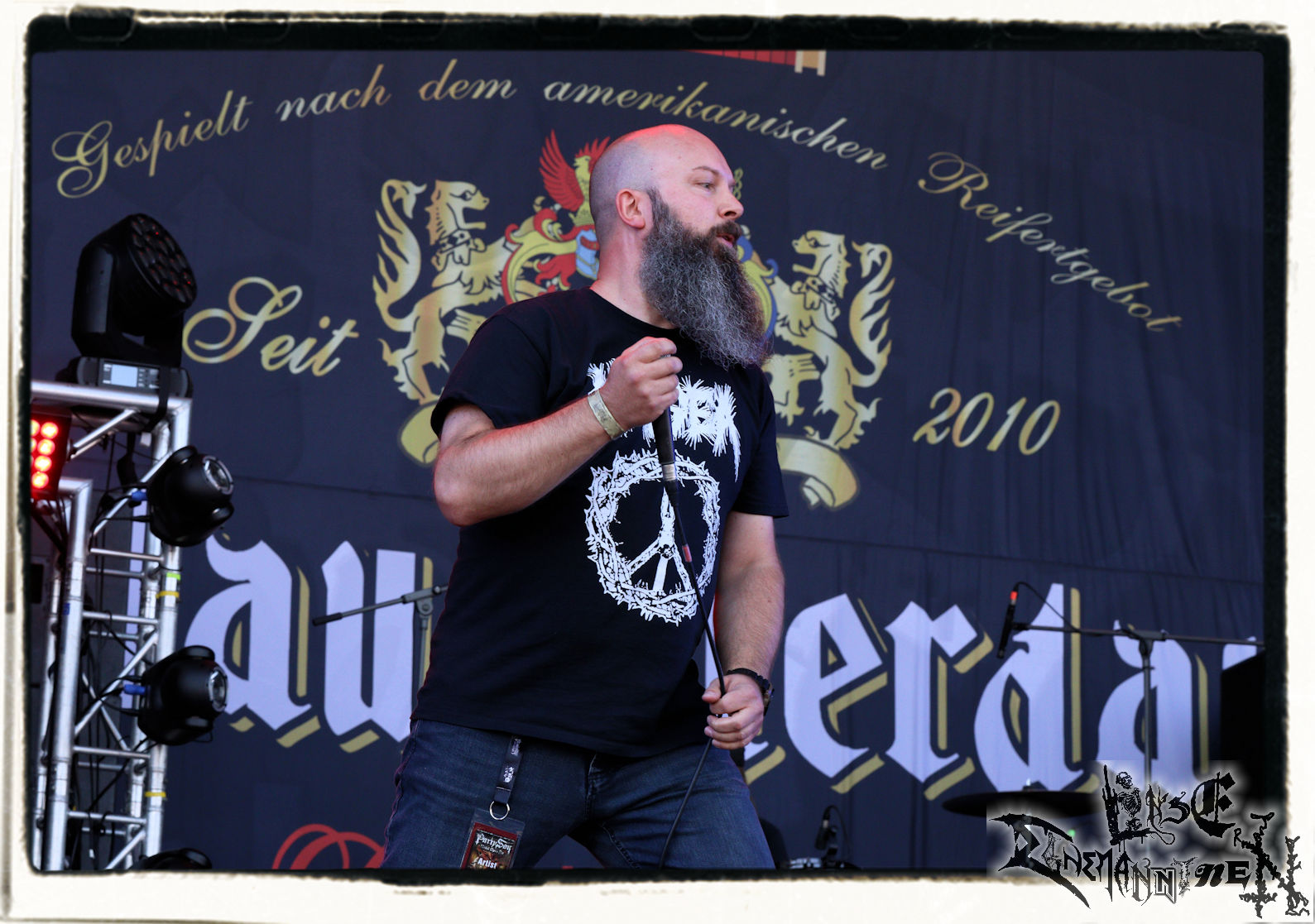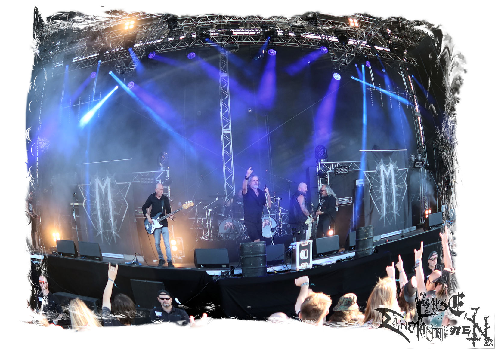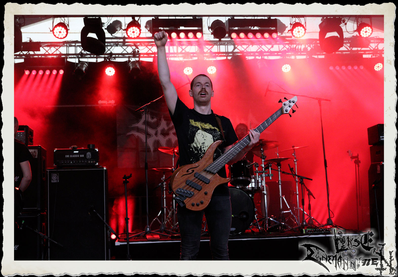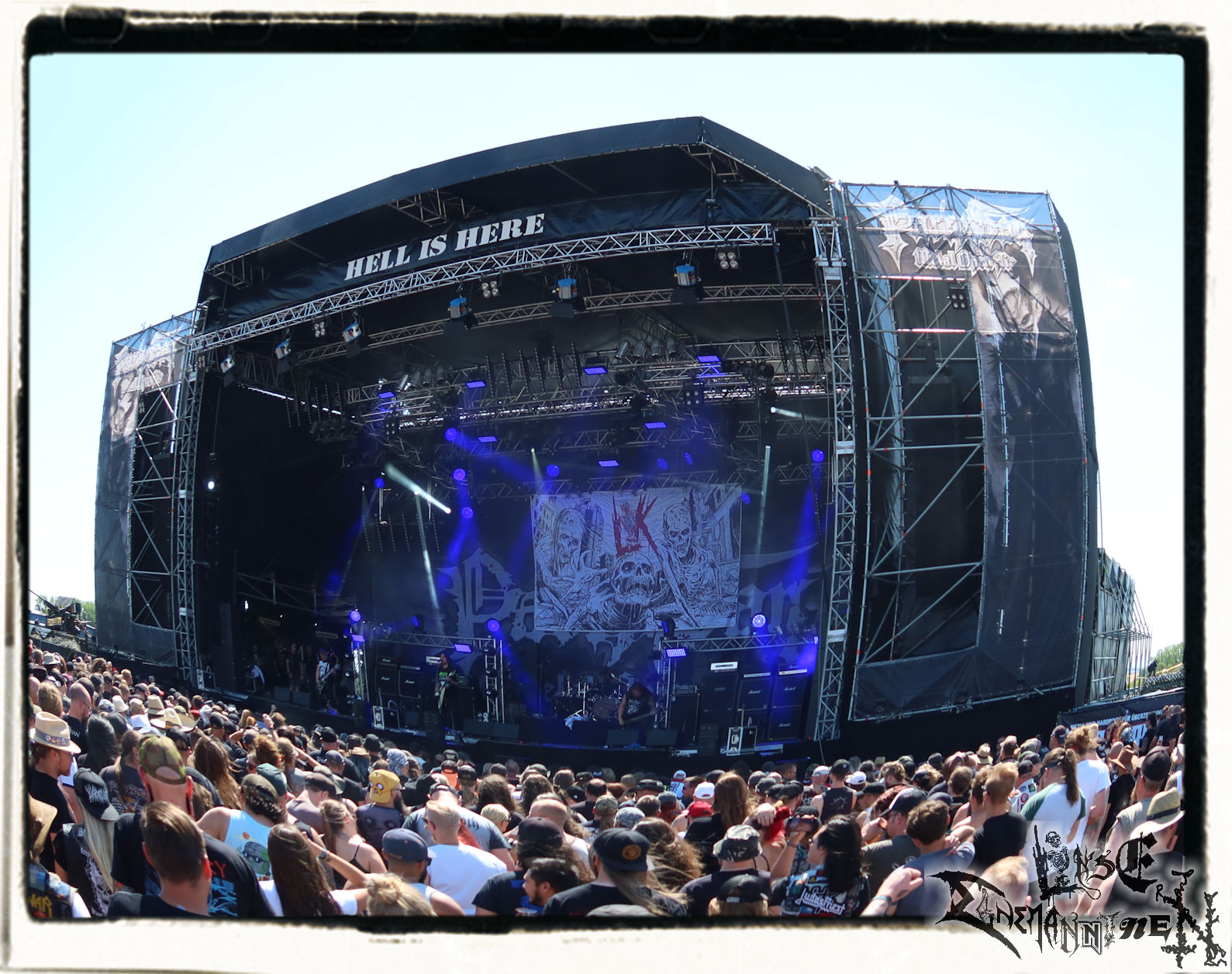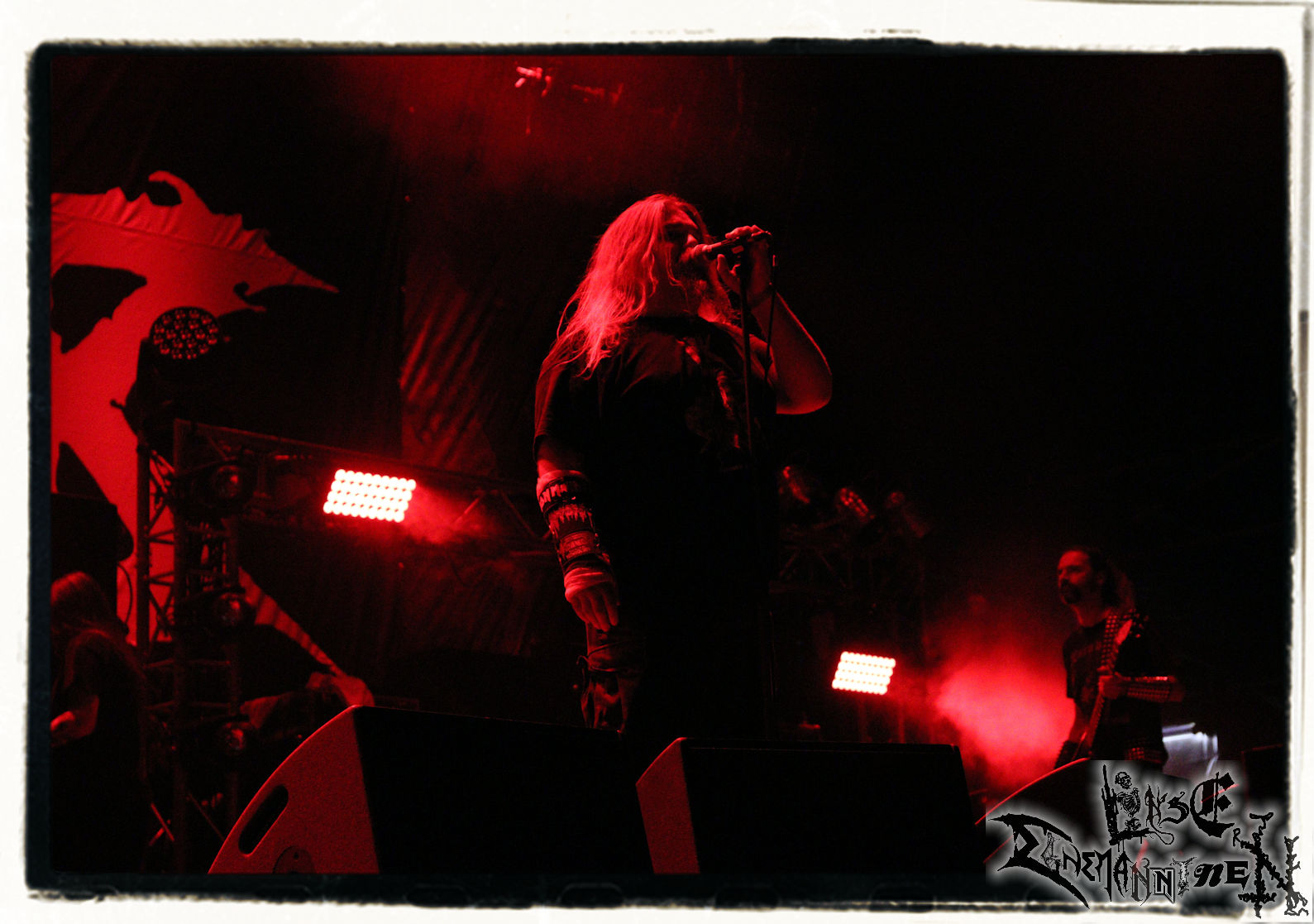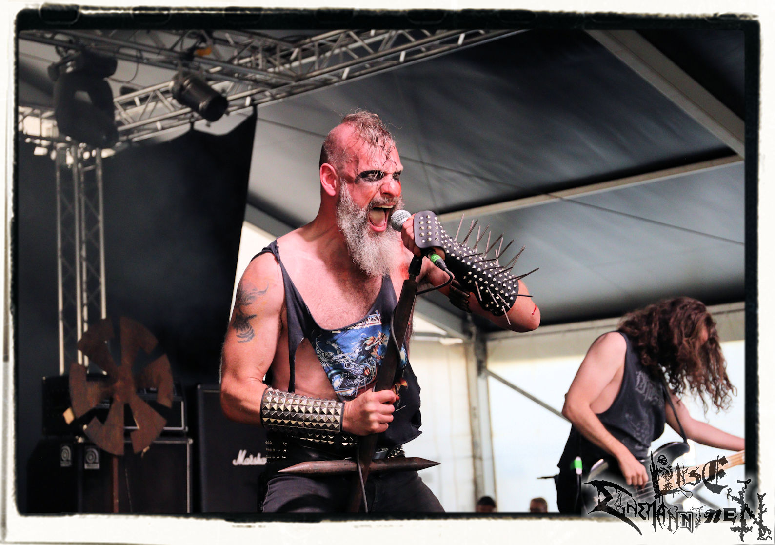 Mit EIS wird der Abend eingeläutet. Die Band aus dem Lupus Lounge – Stall ist wie geschaffen für das Zelt auf dem PARTY.SAN METAL OPEN AIR und beweist eindrucksvoll, wie man Atmosphäre mit mitreißenden Black Metal – Songs kombiniert. Bandkopf Alboin ist gleichzeitig Fan und Vollblutmusiker, der mit den Schwarzmetall-Größen der Neunziger aufgewachsen ist, wobei seine Musik sowohl von diesen, als auch von seiner Bewunderung gegenüber prägenden heimischen Acts wie Helrunar oder auch dem Wirken von Schwadorf mit Sun Of The Sleepless beeinflusst ist. Auch macht er keinen Hehl daraus, dass ihm die Einladung nach Schlotheim mit seiner Band als "Spätberufenem" sehr viel bedeutet. Und diese Haltung schwingt in diesem Konzert mit. Egal, ob Songs vom 2005er-Album "Galeere" ("Durch lichtlose Tiefen", seinerzeit noch unter dem Bandvorgänger Geist veröffentlicht (aus namensrechtlichen Gründen musste man sich danach in Eis umbenennen), vom bisher jüngsten Album "Bannstein" oder vom Klassiker "Wetterkreuz" (2012), der heuer auch schon zehn Jahre auf dem Buckel hat, gespielt werden. Eis zünden ein kleines Highlight, das mir noch lange in Erinnerung bleiben und mich animiert, mir die Scheiben mal wieder zu Gemüte zu führen. Danke!(JD)
