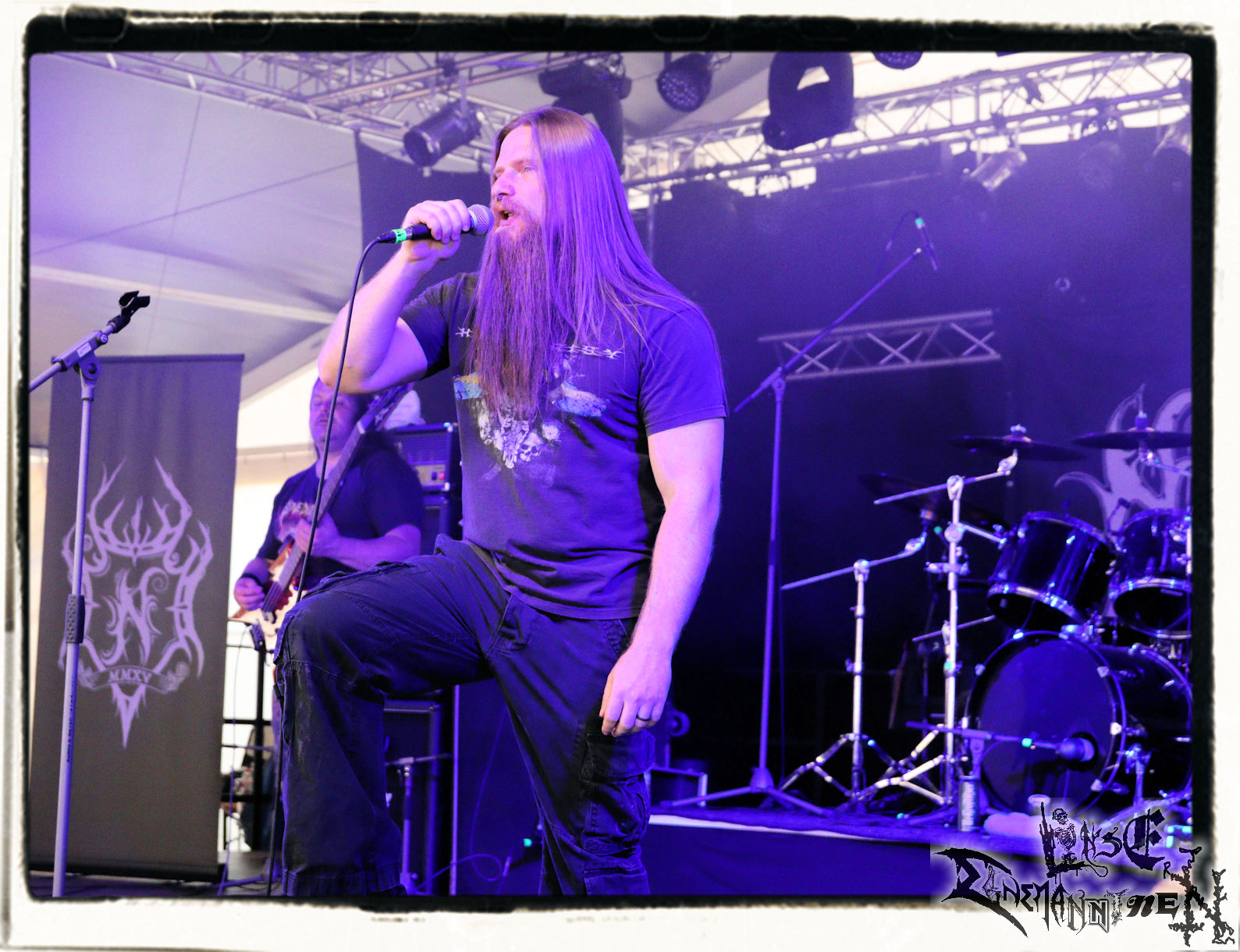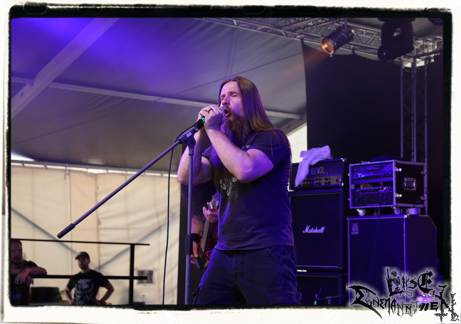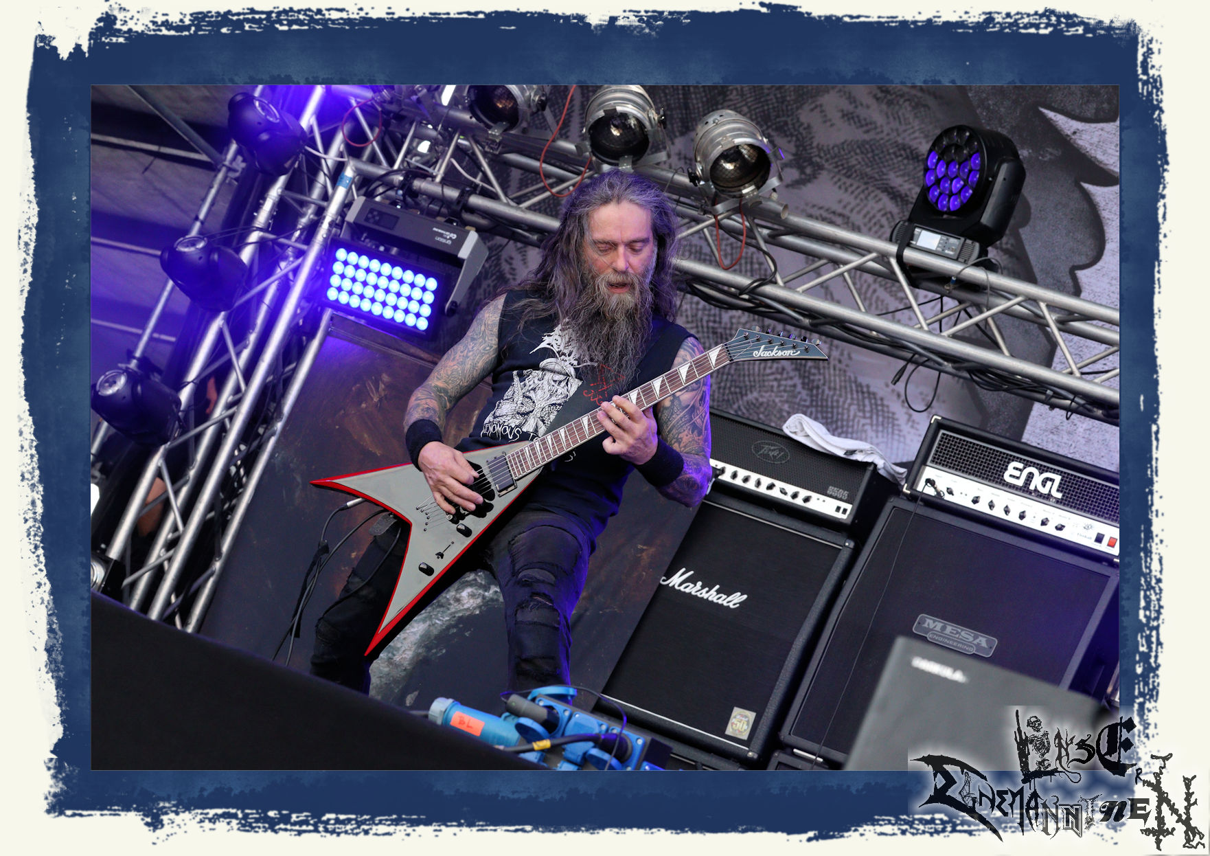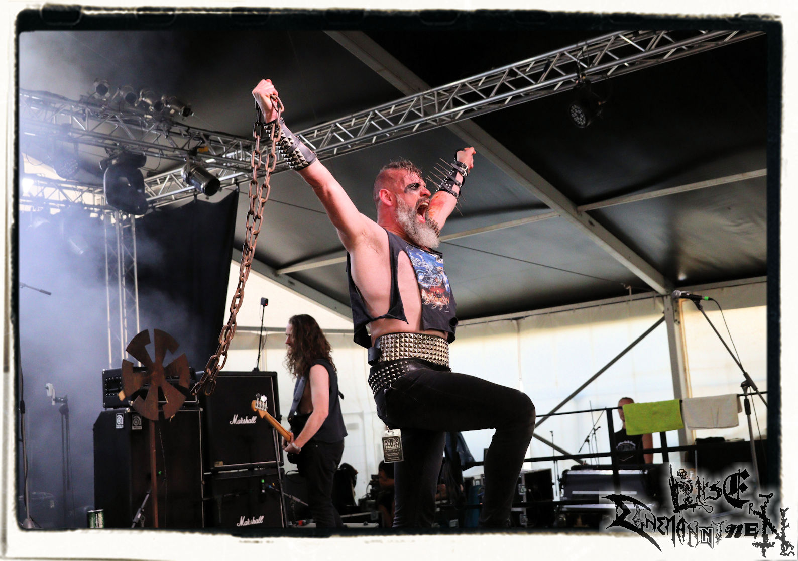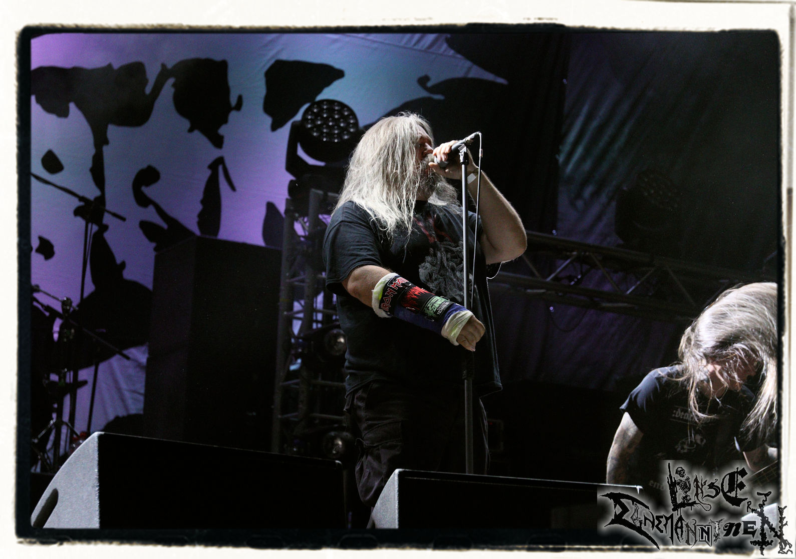 Mit EIS wird der Abend eingeläutet. Die Band aus dem Lupus Lounge – Stall ist wie geschaffen für das Zelt auf dem PARTY.SAN METAL OPEN AIR und beweist eindrucksvoll, wie man Atmosphäre mit mitreißenden Black Metal – Songs kombiniert. Bandkopf Alboin ist gleichzeitig Fan und Vollblutmusiker, der mit den Schwarzmetall-Größen der Neunziger aufgewachsen ist, wobei seine Musik sowohl von diesen, als auch von seiner Bewunderung gegenüber prägenden heimischen Acts wie Helrunar oder auch dem Wirken von Schwadorf mit Sun Of The Sleepless beeinflusst ist. Auch macht er keinen Hehl daraus, dass ihm die Einladung nach Schlotheim mit seiner Band als "Spätberufenem" sehr viel bedeutet. Und diese Haltung schwingt in diesem Konzert mit. Egal, ob Songs vom 2005er-Album "Galeere" ("Durch lichtlose Tiefen", seinerzeit noch unter dem Bandvorgänger Geist veröffentlicht (aus namensrechtlichen Gründen musste man sich danach in Eis umbenennen), vom bisher jüngsten Album "Bannstein" oder vom Klassiker "Wetterkreuz" (2012), der heuer auch schon zehn Jahre auf dem Buckel hat, gespielt werden. Eis zünden ein kleines Highlight, das mir noch lange in Erinnerung bleiben und mich animiert, mir die Scheiben mal wieder zu Gemüte zu führen. Danke!(JD)