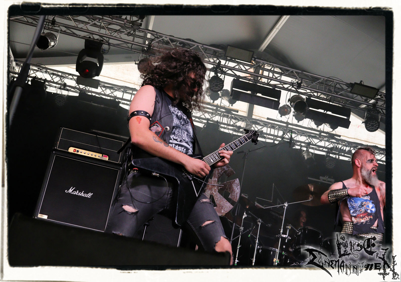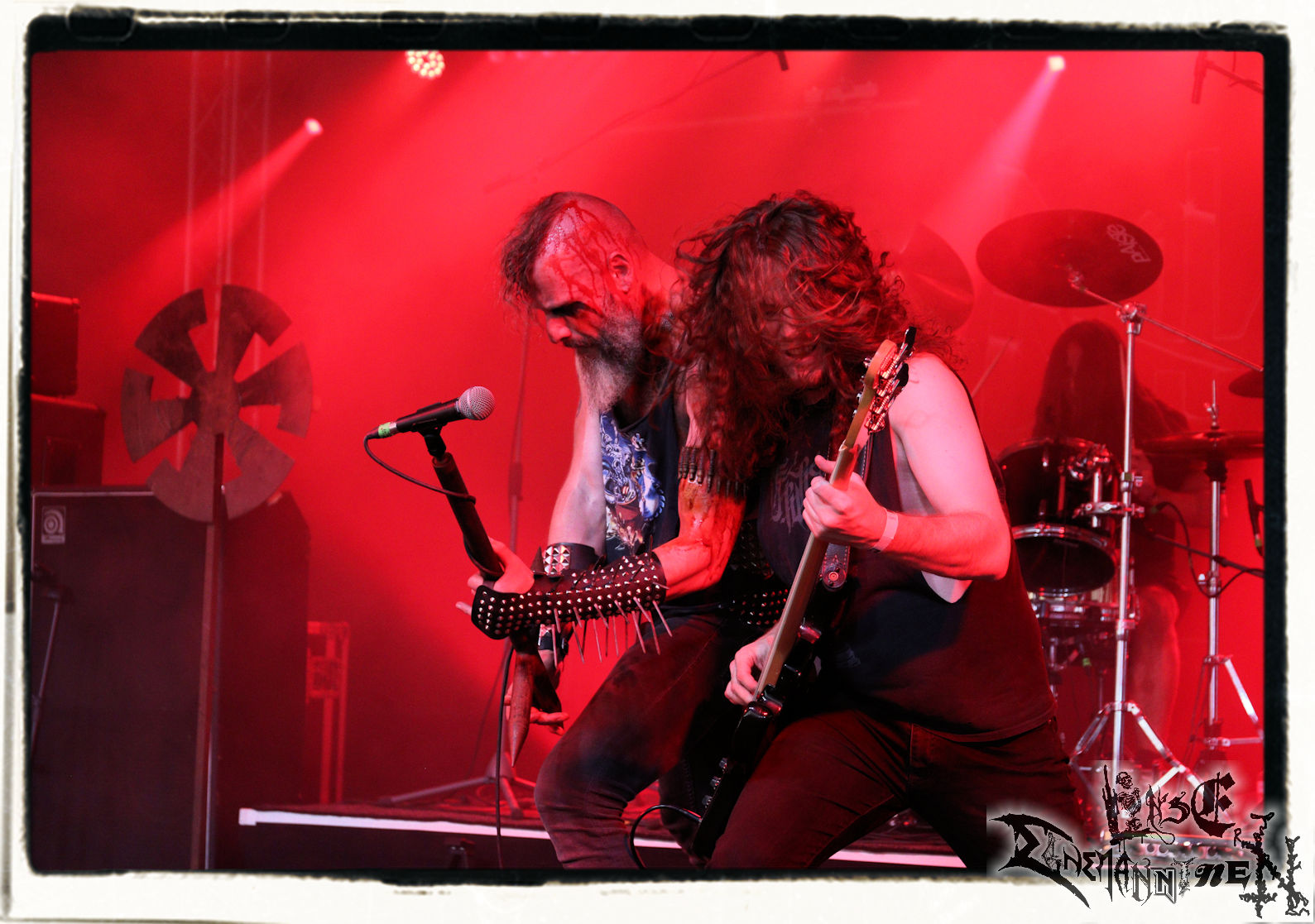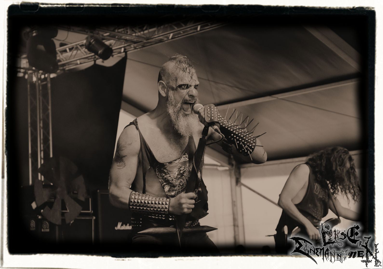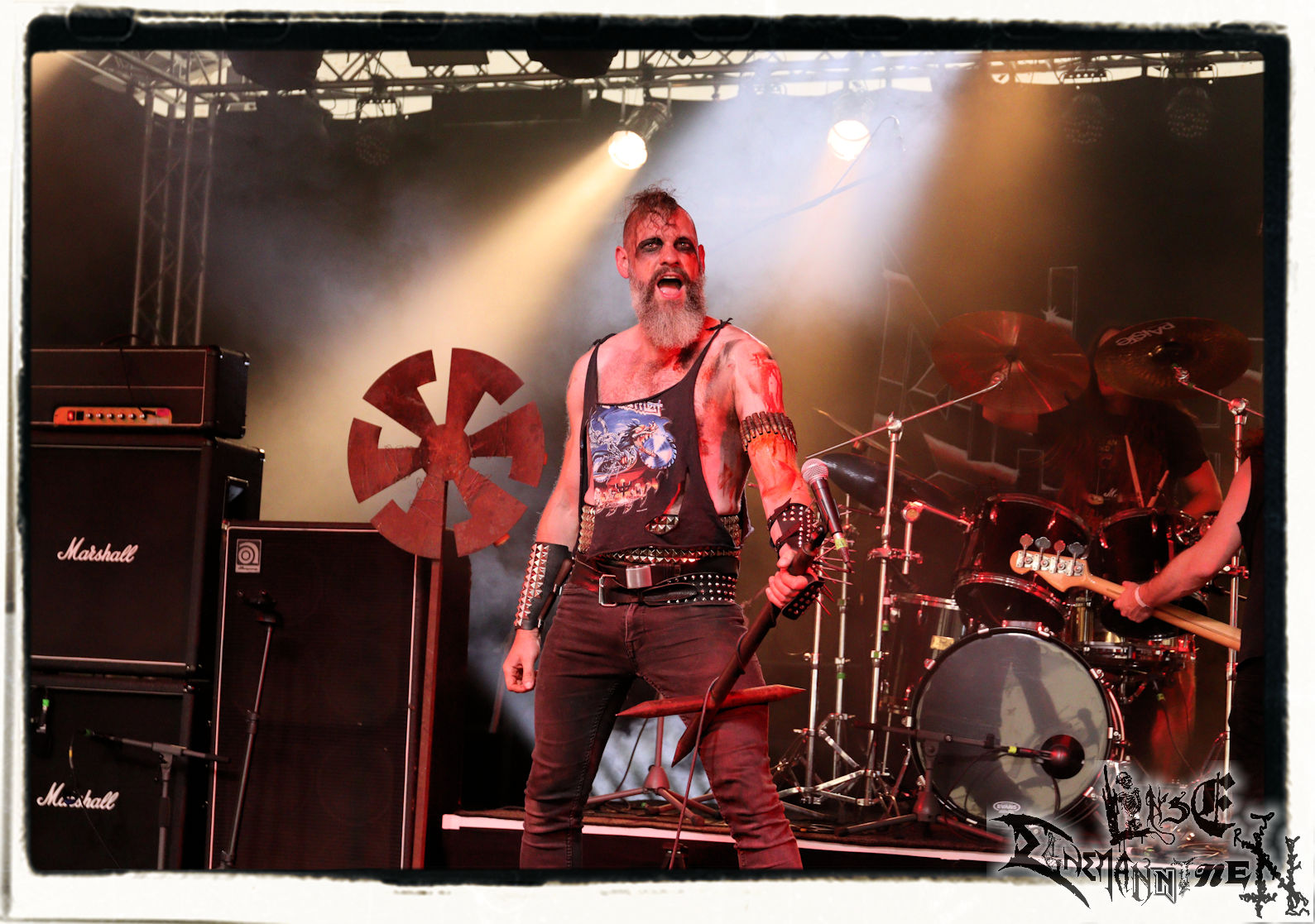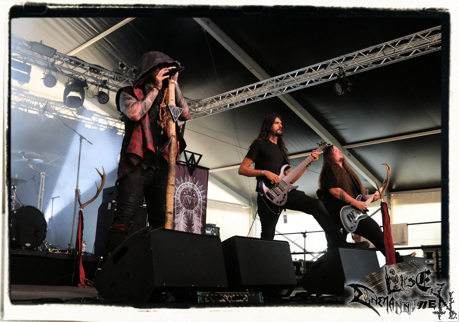 Mit EIS wird der Abend eingeläutet. Die Band aus dem Lupus Lounge – Stall ist wie geschaffen für das Zelt auf dem PARTY.SAN METAL OPEN AIR und beweist eindrucksvoll, wie man Atmosphäre mit mitreißenden Black Metal – Songs kombiniert. Bandkopf Alboin ist gleichzeitig Fan und Vollblutmusiker, der mit den Schwarzmetall-Größen der Neunziger aufgewachsen ist, wobei seine Musik sowohl von diesen, als auch von seiner Bewunderung gegenüber prägenden heimischen Acts wie Helrunar oder auch dem Wirken von Schwadorf mit Sun Of The Sleepless beeinflusst ist. Auch macht er keinen Hehl daraus, dass ihm die Einladung nach Schlotheim mit seiner Band als "Spätberufenem" sehr viel bedeutet. Und diese Haltung schwingt in diesem Konzert mit. Egal, ob Songs vom 2005er-Album "Galeere" ("Durch lichtlose Tiefen", seinerzeit noch unter dem Bandvorgänger Geist veröffentlicht (aus namensrechtlichen Gründen musste man sich danach in Eis umbenennen), vom bisher jüngsten Album "Bannstein" oder vom Klassiker "Wetterkreuz" (2012), der heuer auch schon zehn Jahre auf dem Buckel hat, gespielt werden. Eis zünden ein kleines Highlight, das mir noch lange in Erinnerung bleiben und mich animiert, mir die Scheiben mal wieder zu Gemüte zu führen. Danke!(JD)