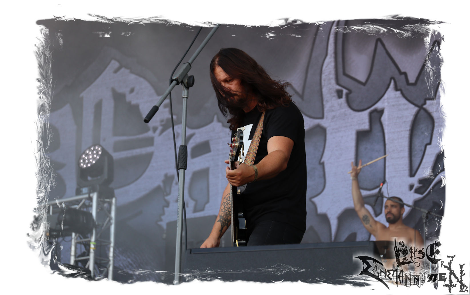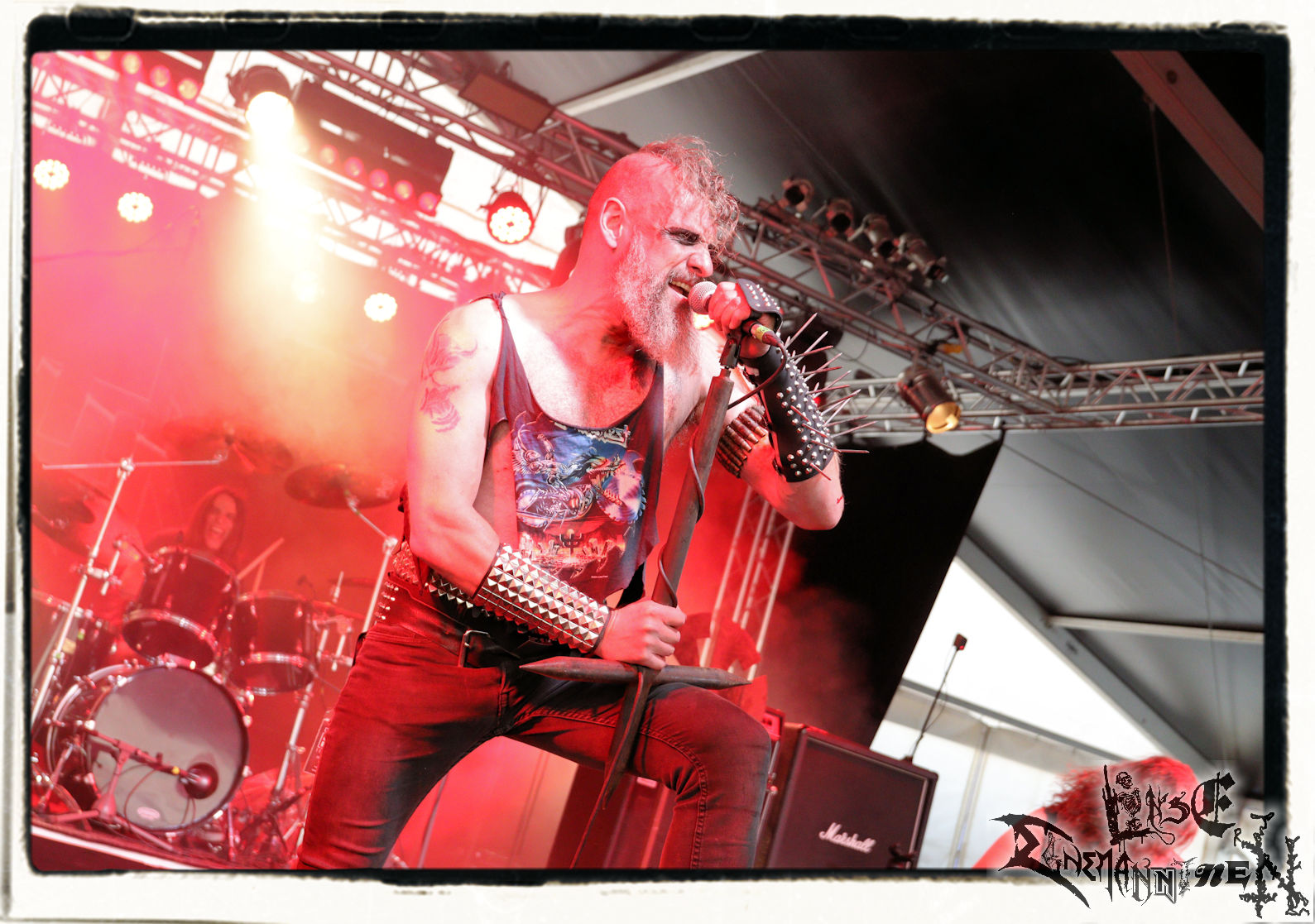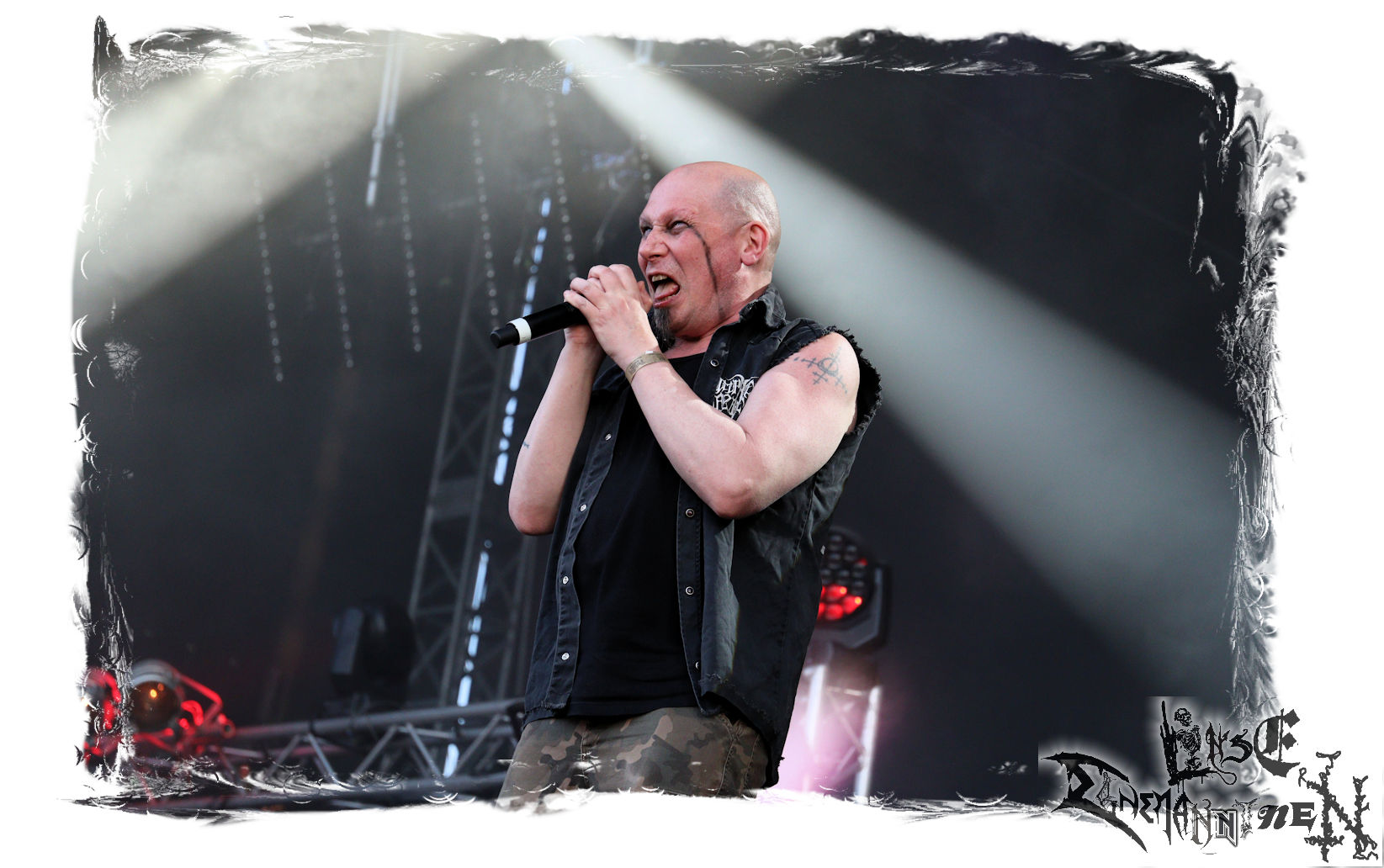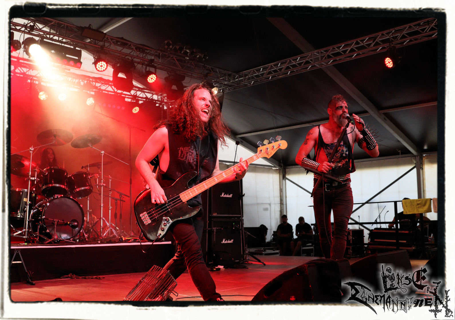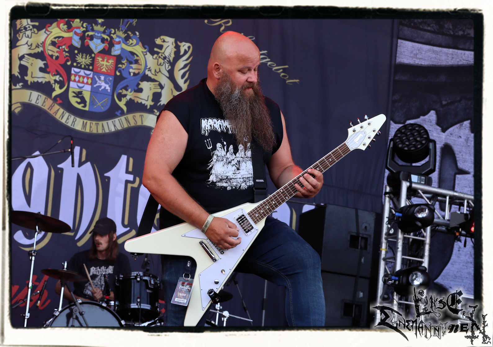 Mit EIS wird der Abend eingeläutet. Die Band aus dem Lupus Lounge – Stall ist wie geschaffen für das Zelt auf dem PARTY.SAN METAL OPEN AIR und beweist eindrucksvoll, wie man Atmosphäre mit mitreißenden Black Metal – Songs kombiniert. Bandkopf Alboin ist gleichzeitig Fan und Vollblutmusiker, der mit den Schwarzmetall-Größen der Neunziger aufgewachsen ist, wobei seine Musik sowohl von diesen, als auch von seiner Bewunderung gegenüber prägenden heimischen Acts wie Helrunar oder auch dem Wirken von Schwadorf mit Sun Of The Sleepless beeinflusst ist. Auch macht er keinen Hehl daraus, dass ihm die Einladung nach Schlotheim mit seiner Band als "Spätberufenem" sehr viel bedeutet. Und diese Haltung schwingt in diesem Konzert mit. Egal, ob Songs vom 2005er-Album "Galeere" ("Durch lichtlose Tiefen", seinerzeit noch unter dem Bandvorgänger Geist veröffentlicht (aus namensrechtlichen Gründen musste man sich danach in Eis umbenennen), vom bisher jüngsten Album "Bannstein" oder vom Klassiker "Wetterkreuz" (2012), der heuer auch schon zehn Jahre auf dem Buckel hat, gespielt werden. Eis zünden ein kleines Highlight, das mir noch lange in Erinnerung bleiben und mich animiert, mir die Scheiben mal wieder zu Gemüte zu führen. Danke!(JD)