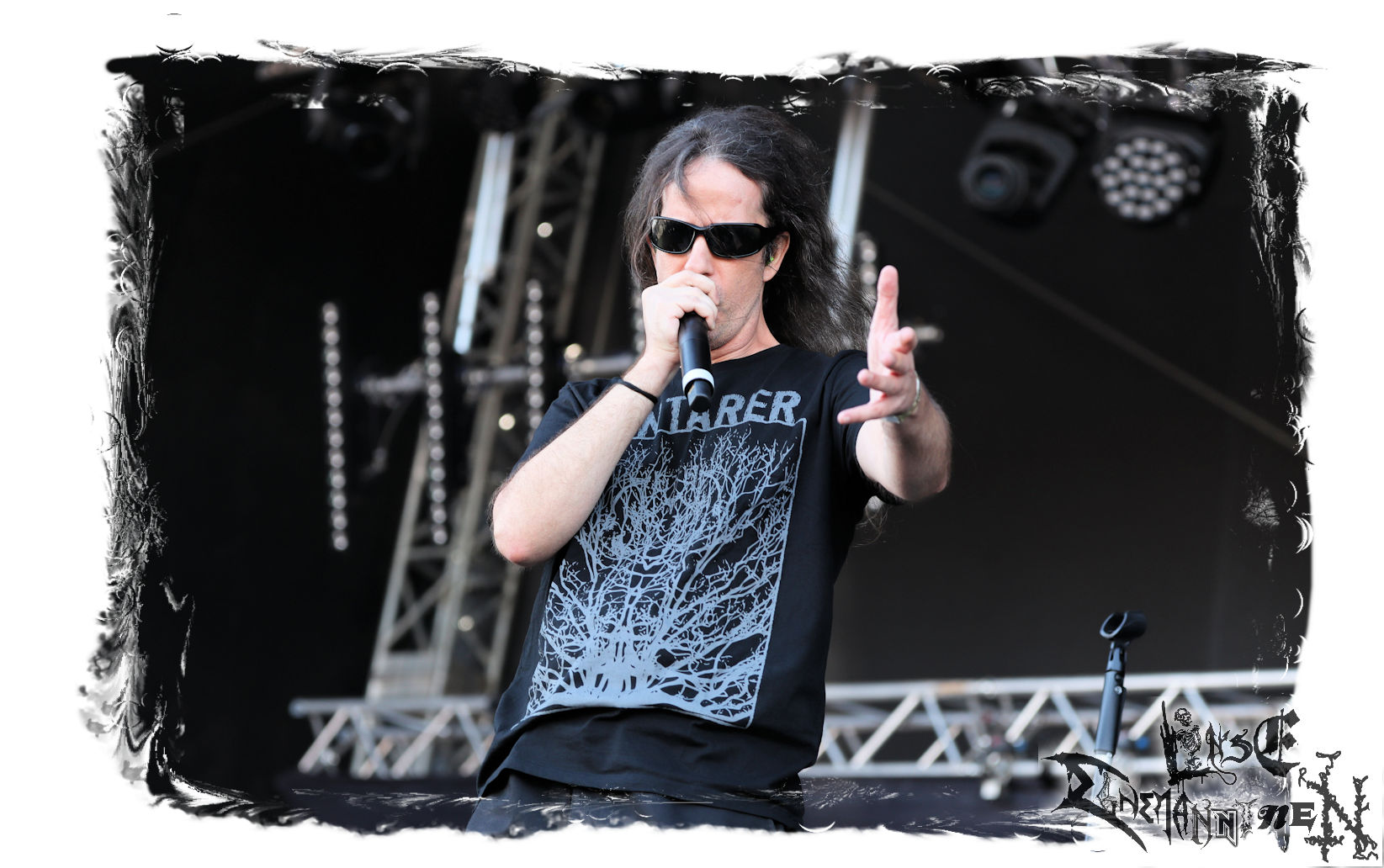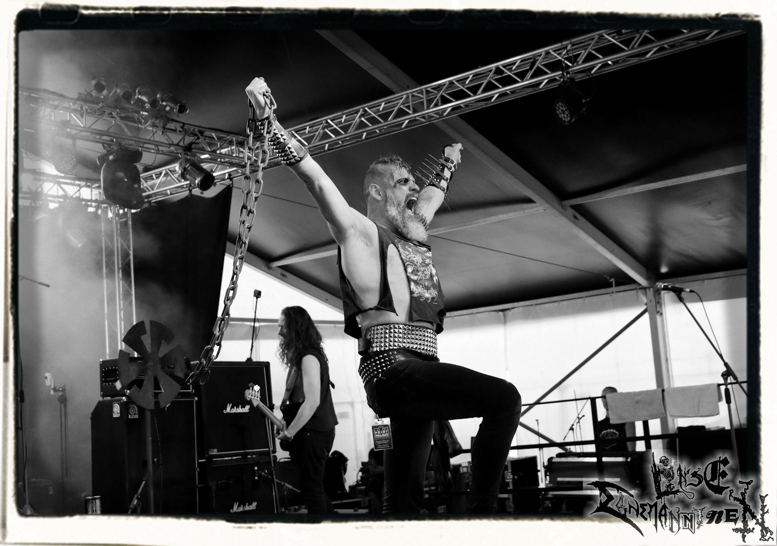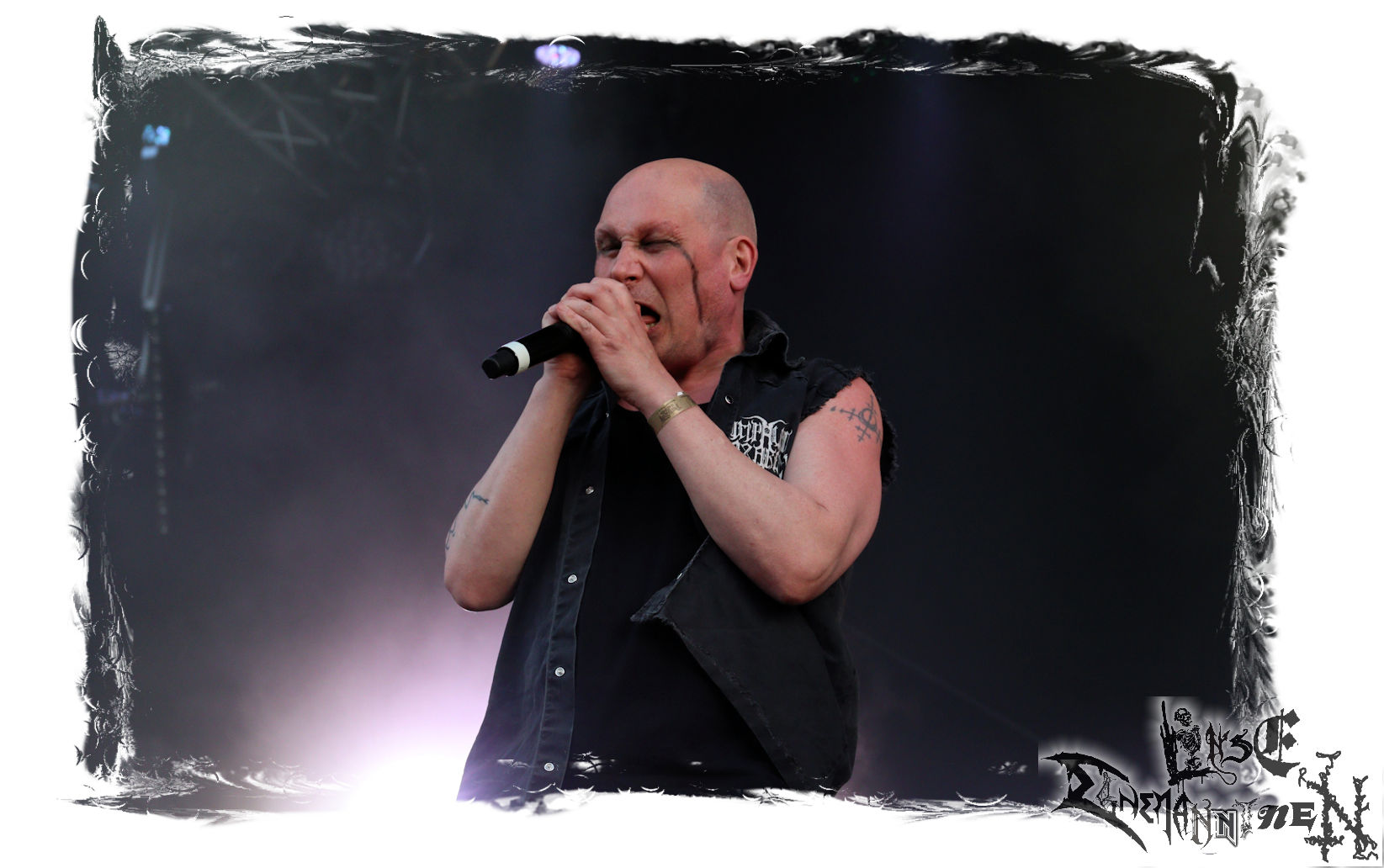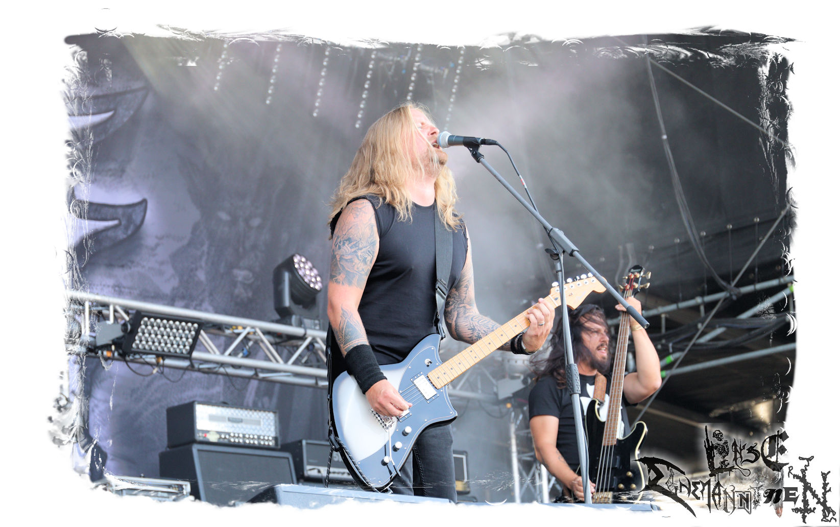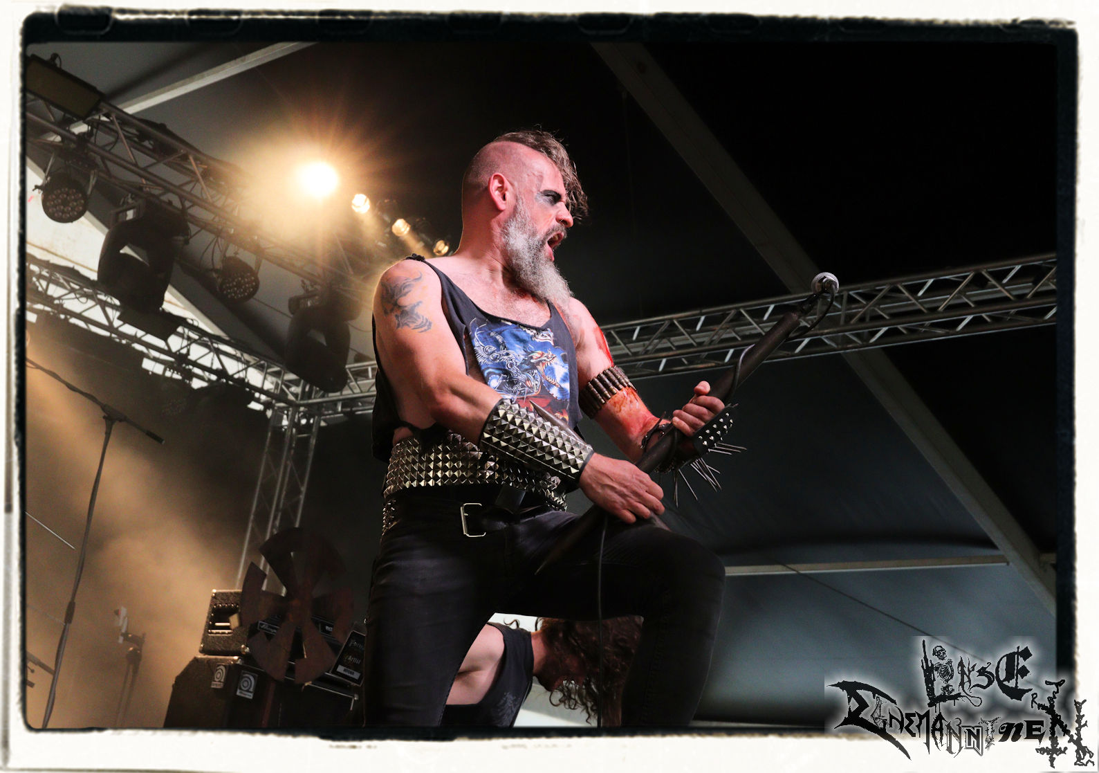 Mit EIS wird der Abend eingeläutet. Die Band aus dem Lupus Lounge – Stall ist wie geschaffen für das Zelt auf dem PARTY.SAN METAL OPEN AIR und beweist eindrucksvoll, wie man Atmosphäre mit mitreißenden Black Metal – Songs kombiniert. Bandkopf Alboin ist gleichzeitig Fan und Vollblutmusiker, der mit den Schwarzmetall-Größen der Neunziger aufgewachsen ist, wobei seine Musik sowohl von diesen, als auch von seiner Bewunderung gegenüber prägenden heimischen Acts wie Helrunar oder auch dem Wirken von Schwadorf mit Sun Of The Sleepless beeinflusst ist. Auch macht er keinen Hehl daraus, dass ihm die Einladung nach Schlotheim mit seiner Band als "Spätberufenem" sehr viel bedeutet. Und diese Haltung schwingt in diesem Konzert mit. Egal, ob Songs vom 2005er-Album "Galeere" ("Durch lichtlose Tiefen", seinerzeit noch unter dem Bandvorgänger Geist veröffentlicht (aus namensrechtlichen Gründen musste man sich danach in Eis umbenennen), vom bisher jüngsten Album "Bannstein" oder vom Klassiker "Wetterkreuz" (2012), der heuer auch schon zehn Jahre auf dem Buckel hat, gespielt werden. Eis zünden ein kleines Highlight, das mir noch lange in Erinnerung bleiben und mich animiert, mir die Scheiben mal wieder zu Gemüte zu führen. Danke!(JD)