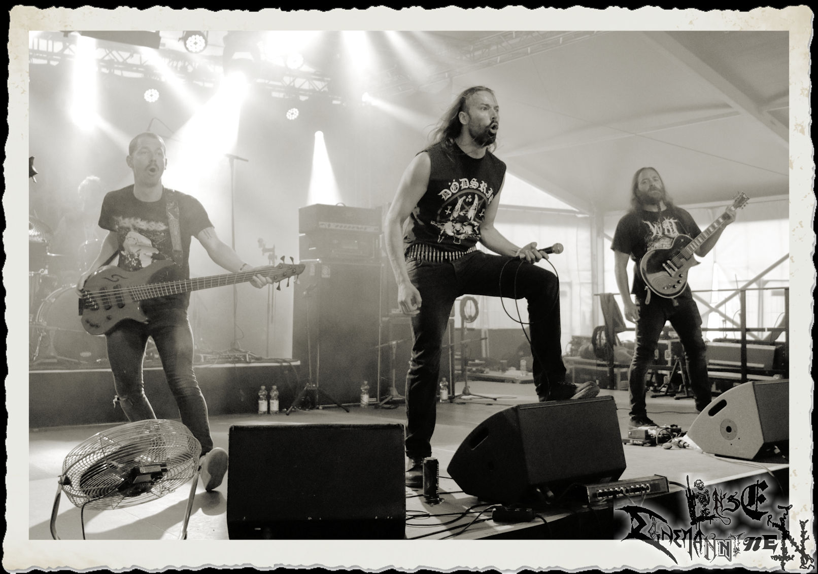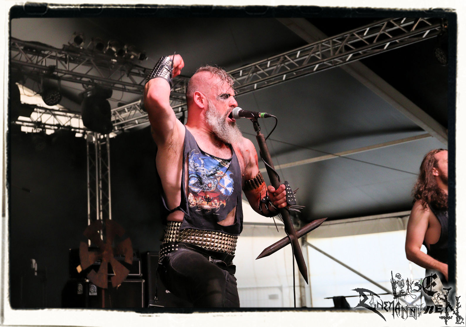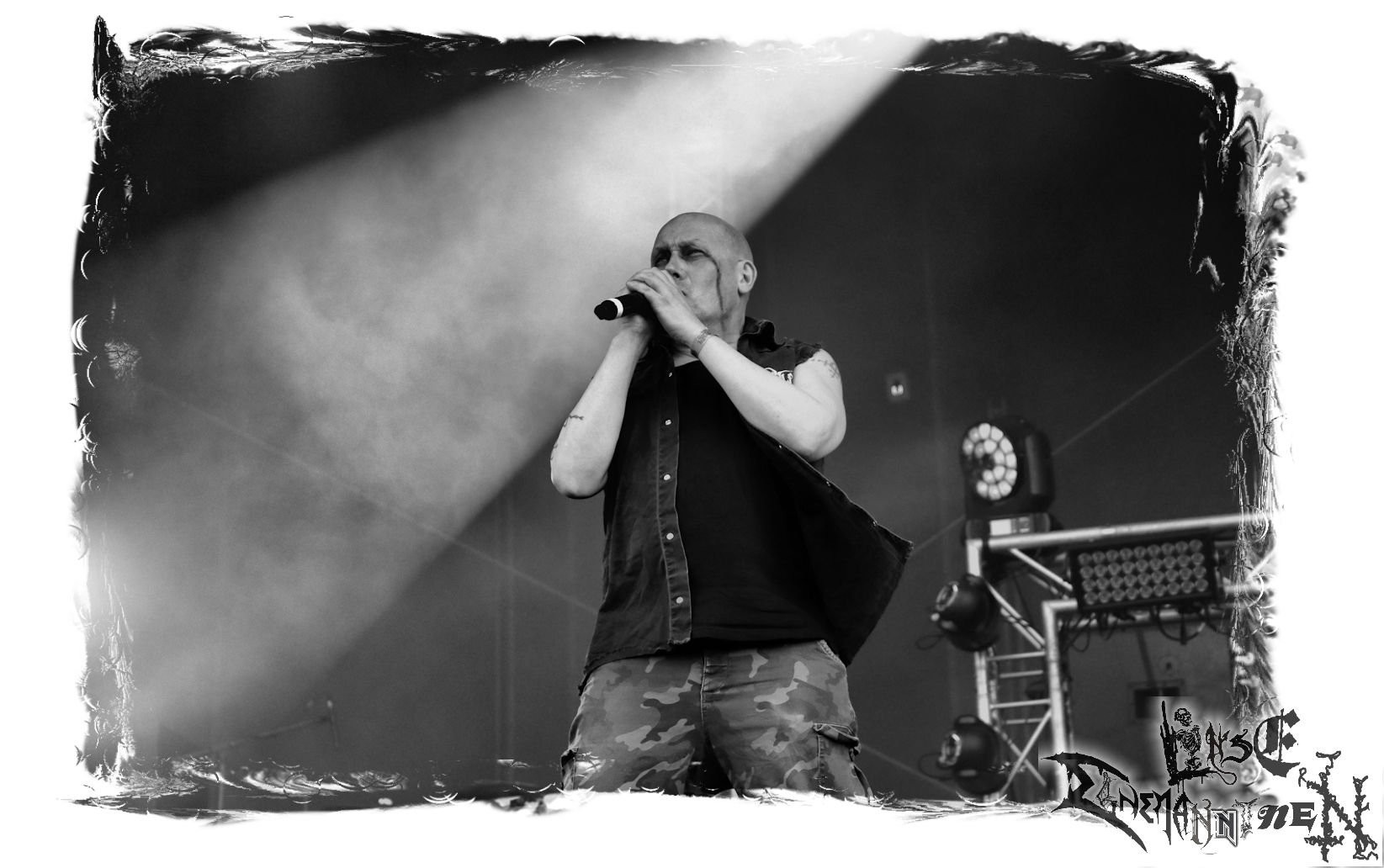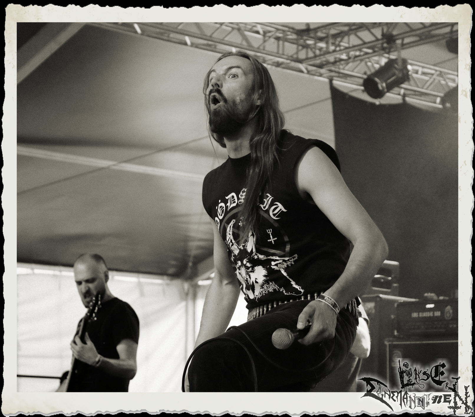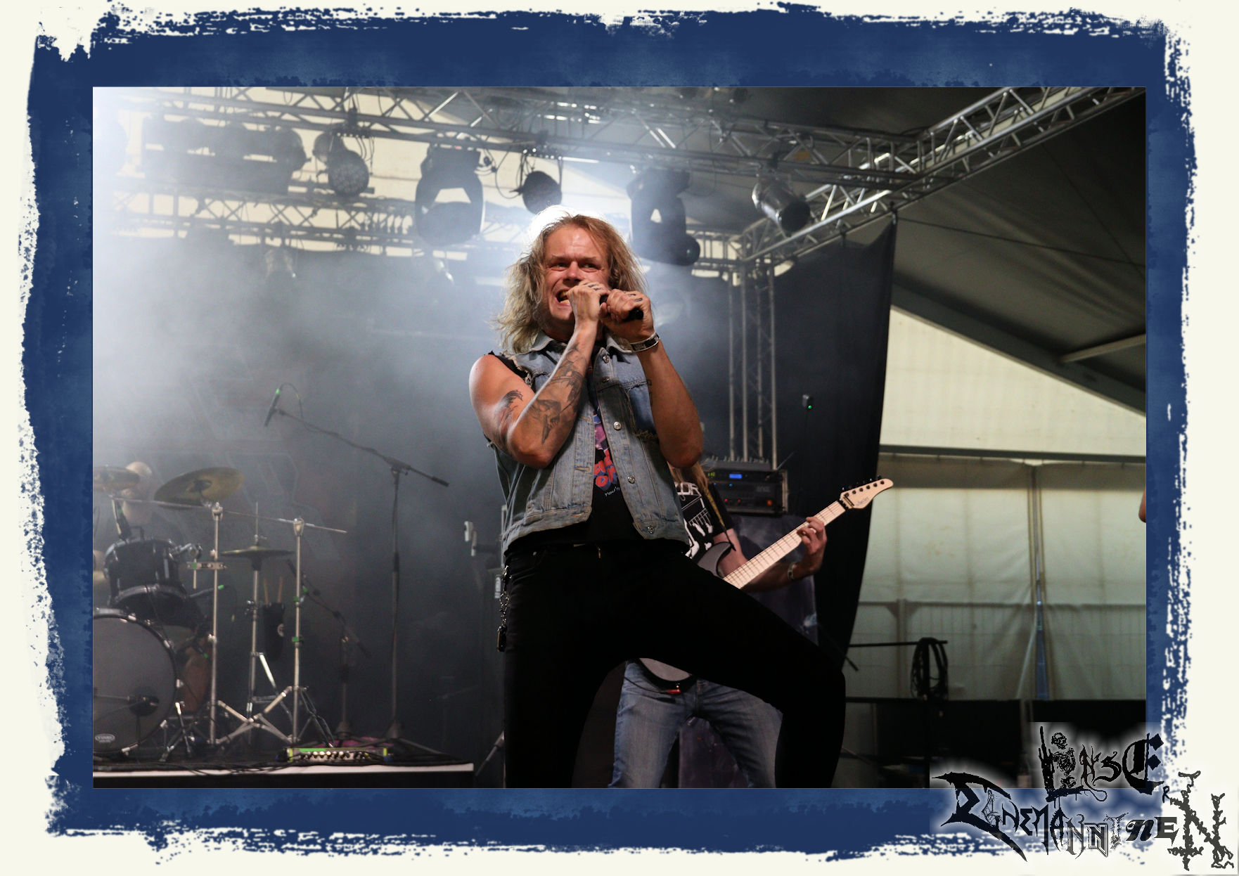 Mit EIS wird der Abend eingeläutet. Die Band aus dem Lupus Lounge – Stall ist wie geschaffen für das Zelt auf dem PARTY.SAN METAL OPEN AIR und beweist eindrucksvoll, wie man Atmosphäre mit mitreißenden Black Metal – Songs kombiniert. Bandkopf Alboin ist gleichzeitig Fan und Vollblutmusiker, der mit den Schwarzmetall-Größen der Neunziger aufgewachsen ist, wobei seine Musik sowohl von diesen, als auch von seiner Bewunderung gegenüber prägenden heimischen Acts wie Helrunar oder auch dem Wirken von Schwadorf mit Sun Of The Sleepless beeinflusst ist. Auch macht er keinen Hehl daraus, dass ihm die Einladung nach Schlotheim mit seiner Band als "Spätberufenem" sehr viel bedeutet. Und diese Haltung schwingt in diesem Konzert mit. Egal, ob Songs vom 2005er-Album "Galeere" ("Durch lichtlose Tiefen", seinerzeit noch unter dem Bandvorgänger Geist veröffentlicht (aus namensrechtlichen Gründen musste man sich danach in Eis umbenennen), vom bisher jüngsten Album "Bannstein" oder vom Klassiker "Wetterkreuz" (2012), der heuer auch schon zehn Jahre auf dem Buckel hat, gespielt werden. Eis zünden ein kleines Highlight, das mir noch lange in Erinnerung bleiben und mich animiert, mir die Scheiben mal wieder zu Gemüte zu führen. Danke!(JD)