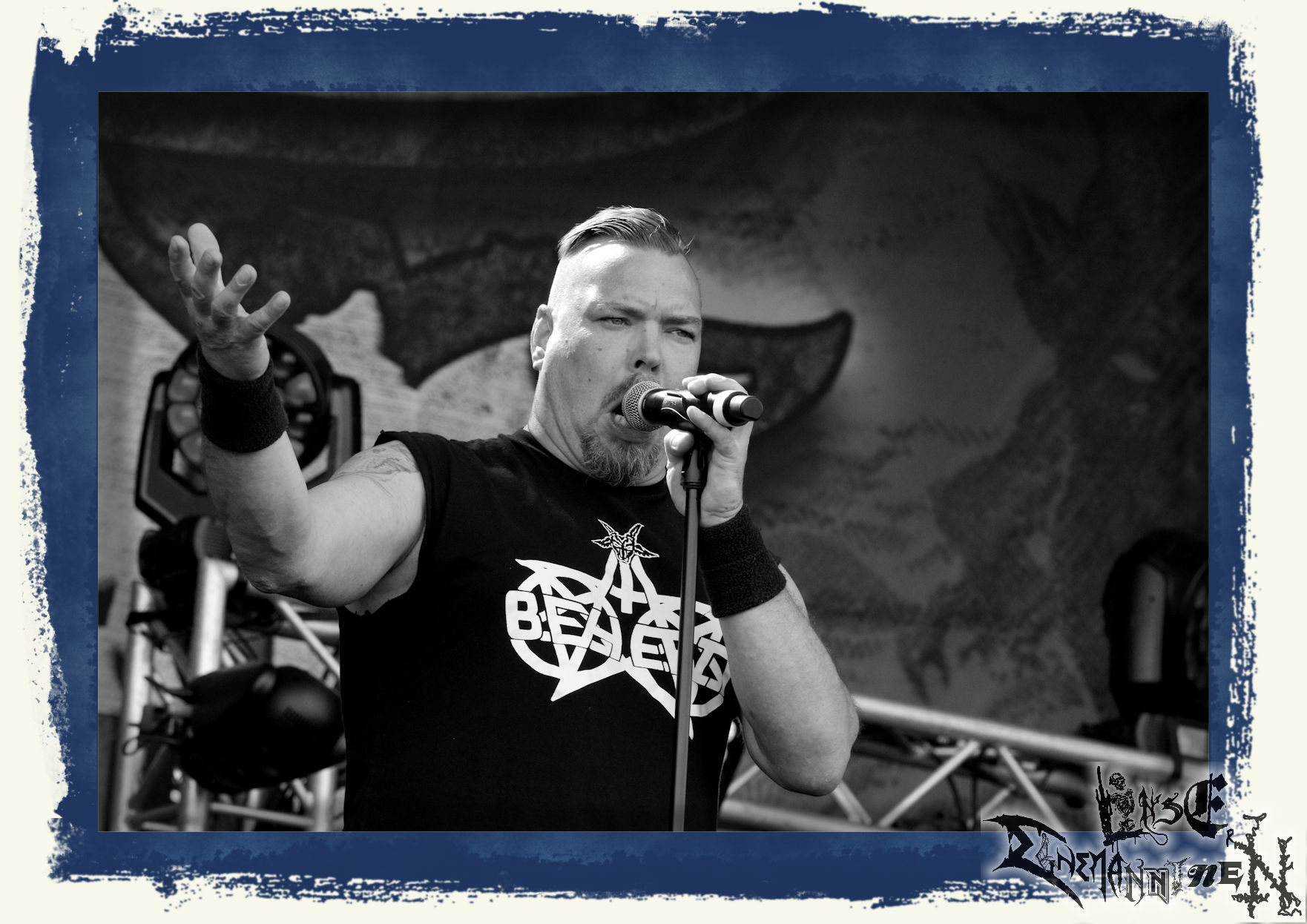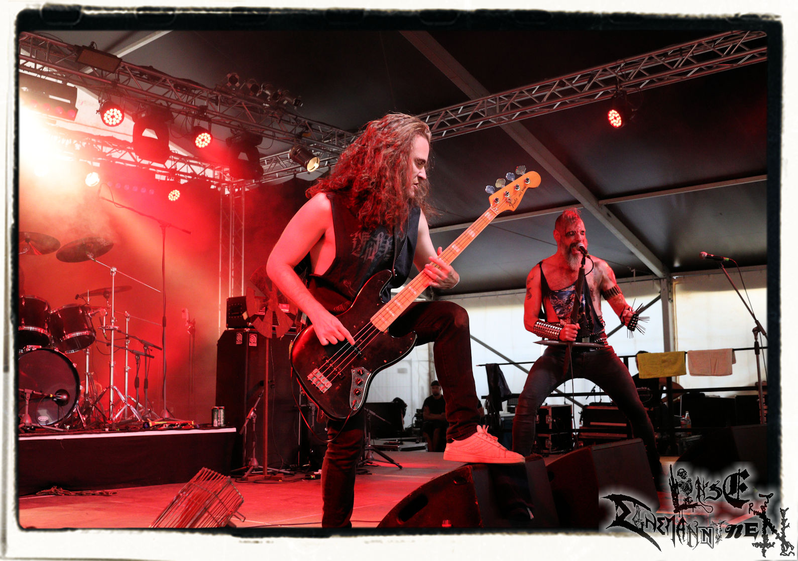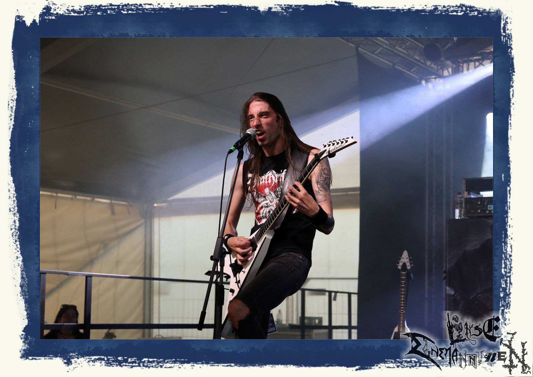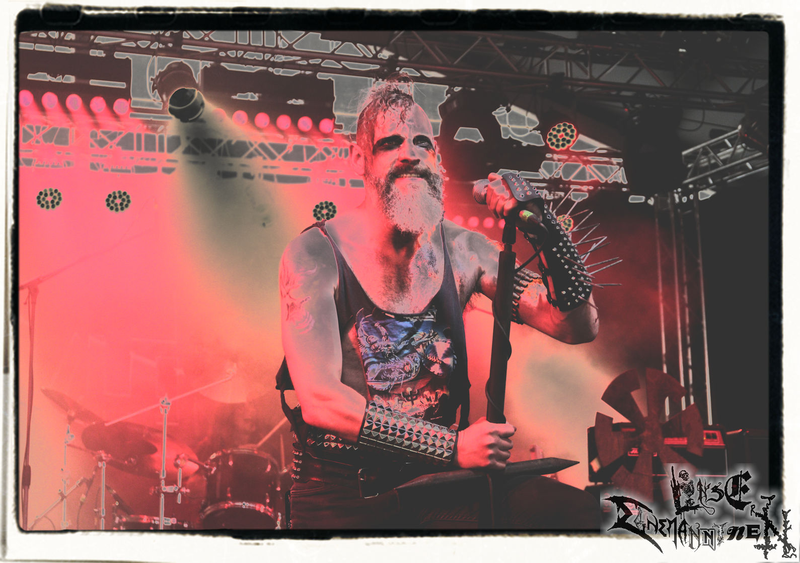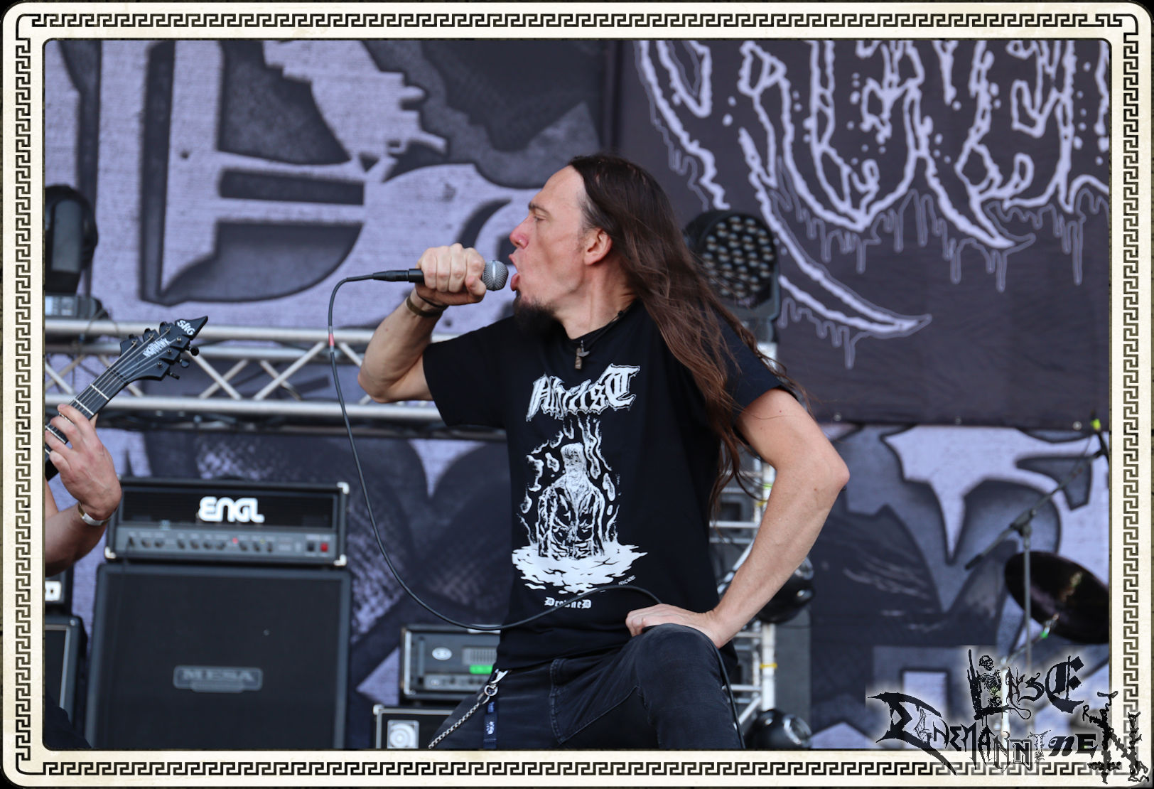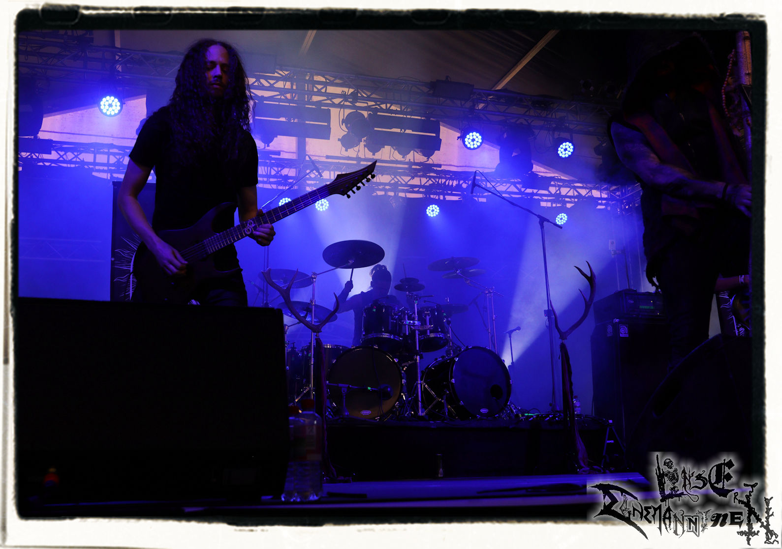 Mit EIS wird der Abend eingeläutet. Die Band aus dem Lupus Lounge – Stall ist wie geschaffen für das Zelt auf dem PARTY.SAN METAL OPEN AIR und beweist eindrucksvoll, wie man Atmosphäre mit mitreißenden Black Metal – Songs kombiniert. Bandkopf Alboin ist gleichzeitig Fan und Vollblutmusiker, der mit den Schwarzmetall-Größen der Neunziger aufgewachsen ist, wobei seine Musik sowohl von diesen, als auch von seiner Bewunderung gegenüber prägenden heimischen Acts wie Helrunar oder auch dem Wirken von Schwadorf mit Sun Of The Sleepless beeinflusst ist. Auch macht er keinen Hehl daraus, dass ihm die Einladung nach Schlotheim mit seiner Band als "Spätberufenem" sehr viel bedeutet. Und diese Haltung schwingt in diesem Konzert mit. Egal, ob Songs vom 2005er-Album "Galeere" ("Durch lichtlose Tiefen", seinerzeit noch unter dem Bandvorgänger Geist veröffentlicht (aus namensrechtlichen Gründen musste man sich danach in Eis umbenennen), vom bisher jüngsten Album "Bannstein" oder vom Klassiker "Wetterkreuz" (2012), der heuer auch schon zehn Jahre auf dem Buckel hat, gespielt werden. Eis zünden ein kleines Highlight, das mir noch lange in Erinnerung bleiben und mich animiert, mir die Scheiben mal wieder zu Gemüte zu führen. Danke!(JD)