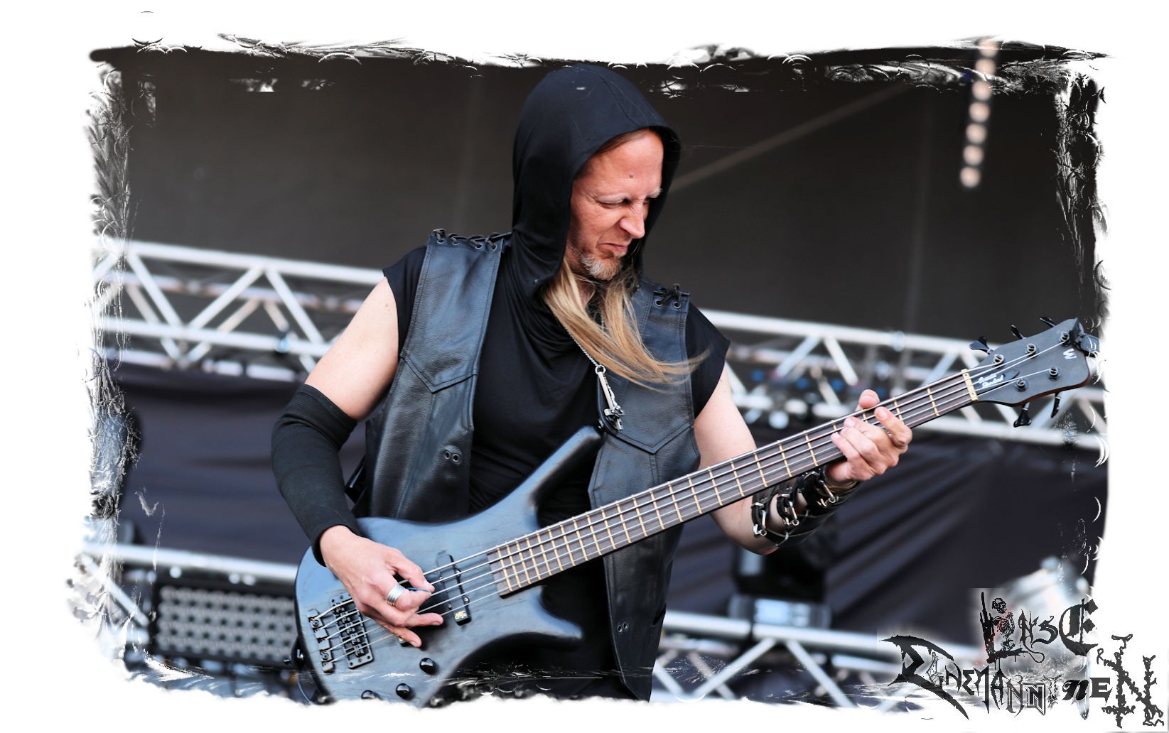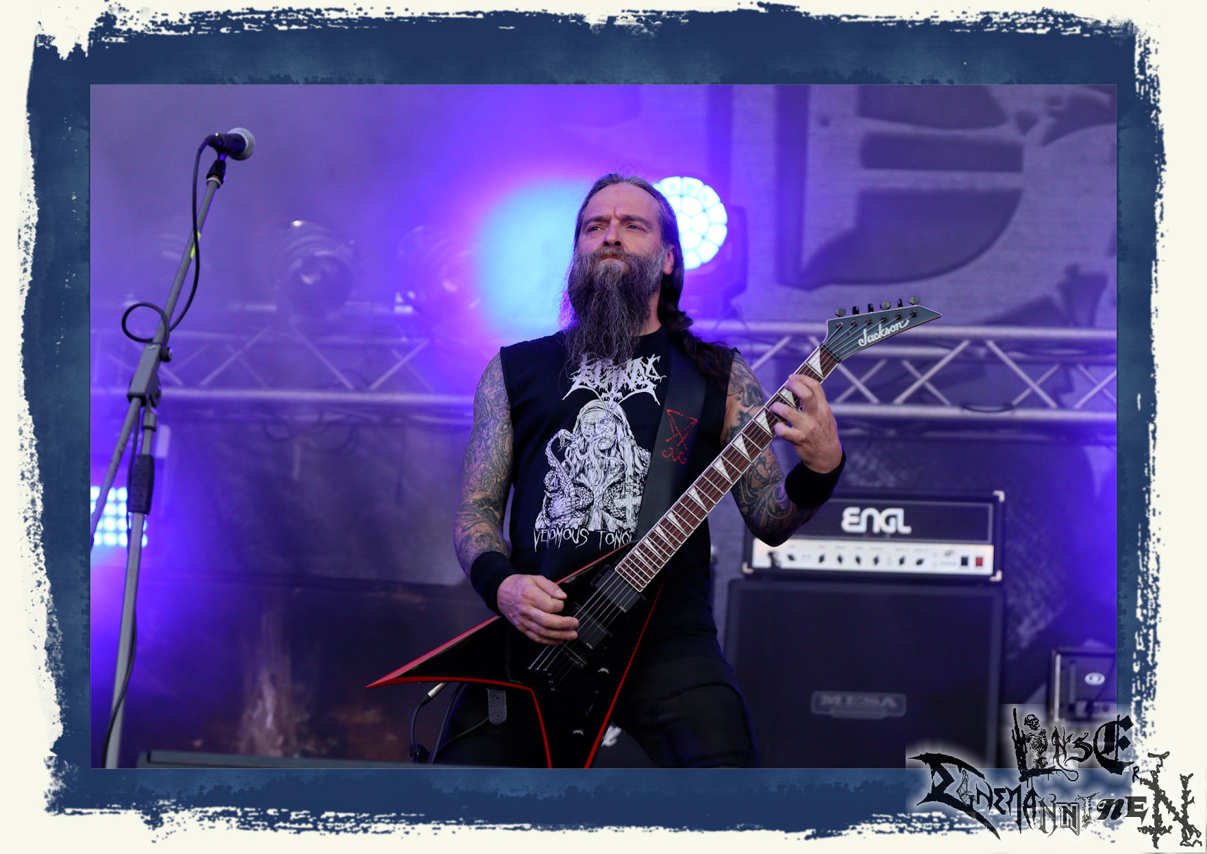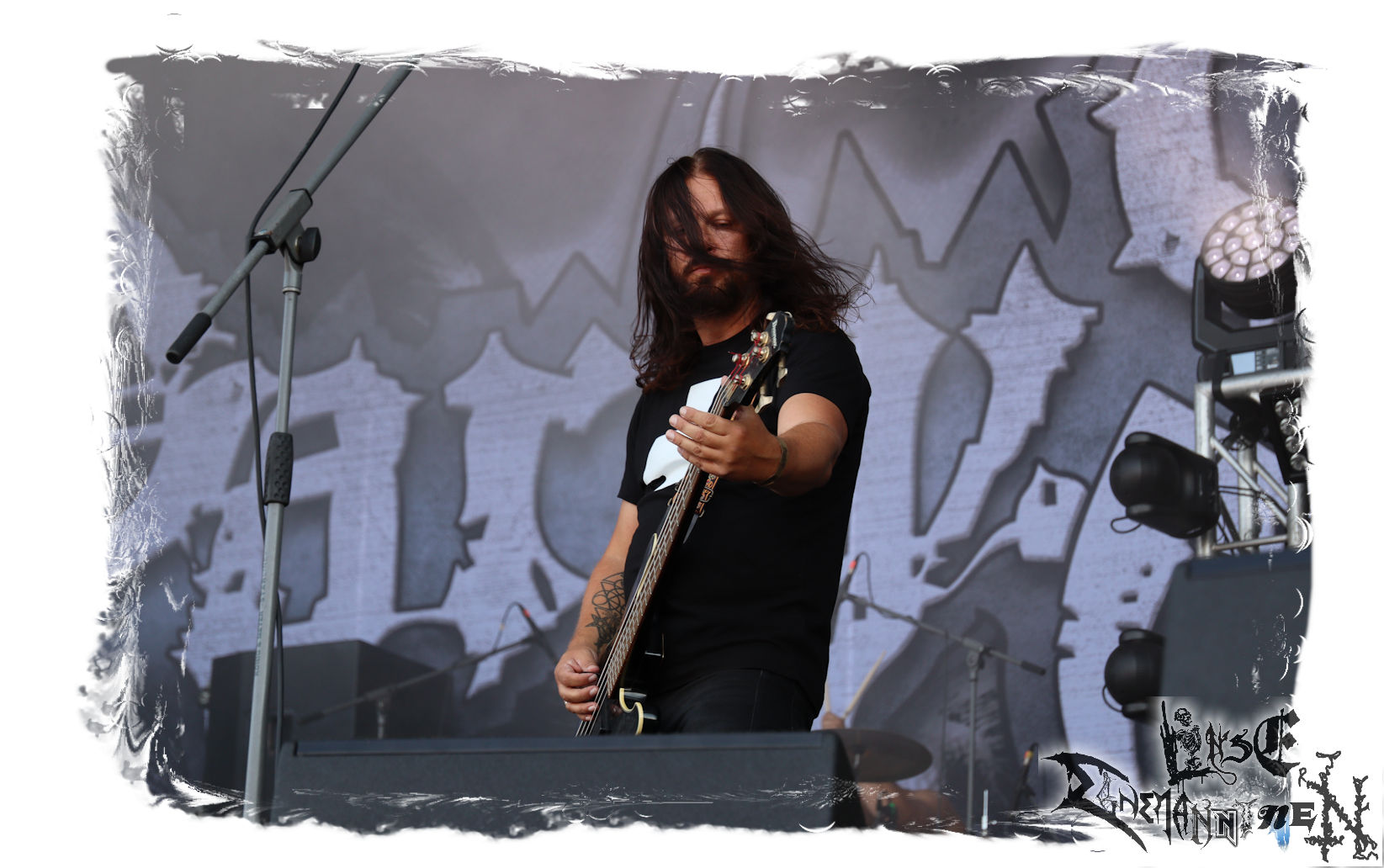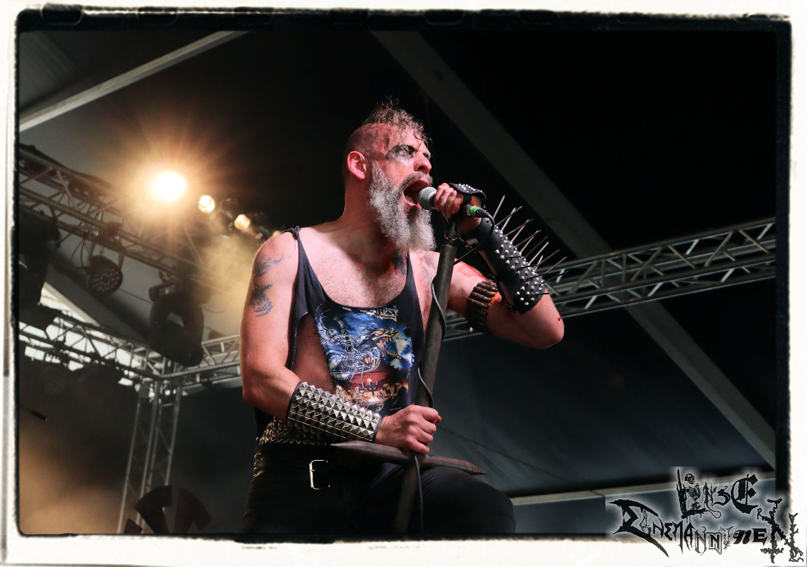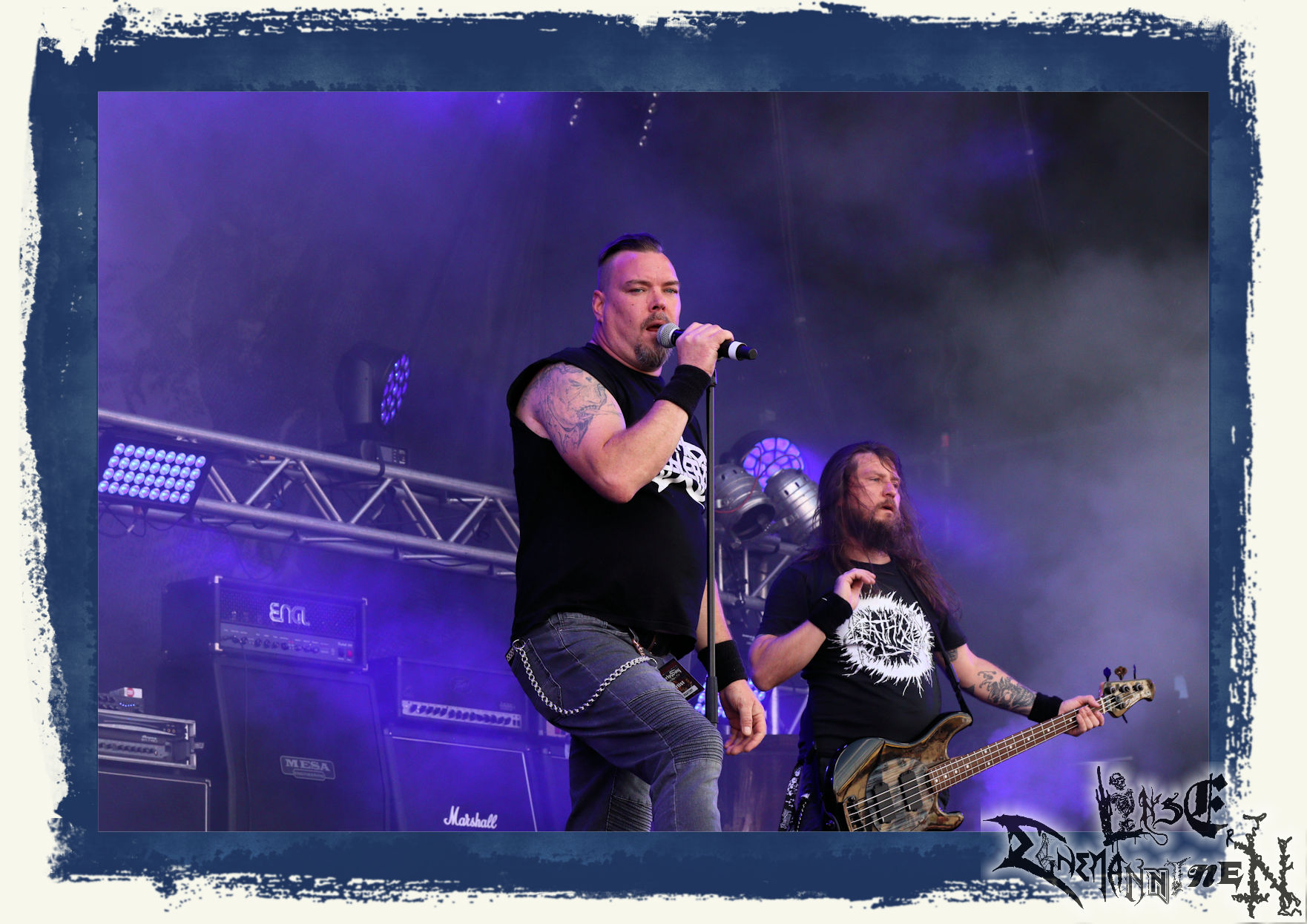Mit EIS wird der Abend eingeläutet. Die Band aus dem Lupus Lounge – Stall ist wie geschaffen für das Zelt auf dem PARTY.SAN METAL OPEN AIR und beweist eindrucksvoll, wie man Atmosphäre mit mitreißenden Black Metal – Songs kombiniert. Bandkopf Alboin ist gleichzeitig Fan und Vollblutmusiker, der mit den Schwarzmetall-Größen der Neunziger aufgewachsen ist, wobei seine Musik sowohl von diesen, als auch von seiner Bewunderung gegenüber prägenden heimischen Acts wie Helrunar oder auch dem Wirken von Schwadorf mit Sun Of The Sleepless beeinflusst ist. Auch macht er keinen Hehl daraus, dass ihm die Einladung nach Schlotheim mit seiner Band als "Spätberufenem" sehr viel bedeutet. Und diese Haltung schwingt in diesem Konzert mit. Egal, ob Songs vom 2005er-Album "Galeere" ("Durch lichtlose Tiefen", seinerzeit noch unter dem Bandvorgänger Geist veröffentlicht (aus namensrechtlichen Gründen musste man sich danach in Eis umbenennen), vom bisher jüngsten Album "Bannstein" oder vom Klassiker "Wetterkreuz" (2012), der heuer auch schon zehn Jahre auf dem Buckel hat, gespielt werden. Eis zünden ein kleines Highlight, das mir noch lange in Erinnerung bleiben und mich animiert, mir die Scheiben mal wieder zu Gemüte zu führen. Danke!(JD)
