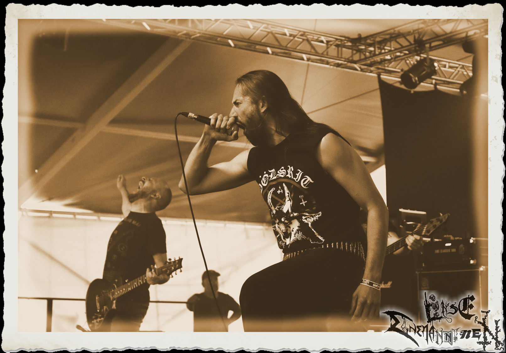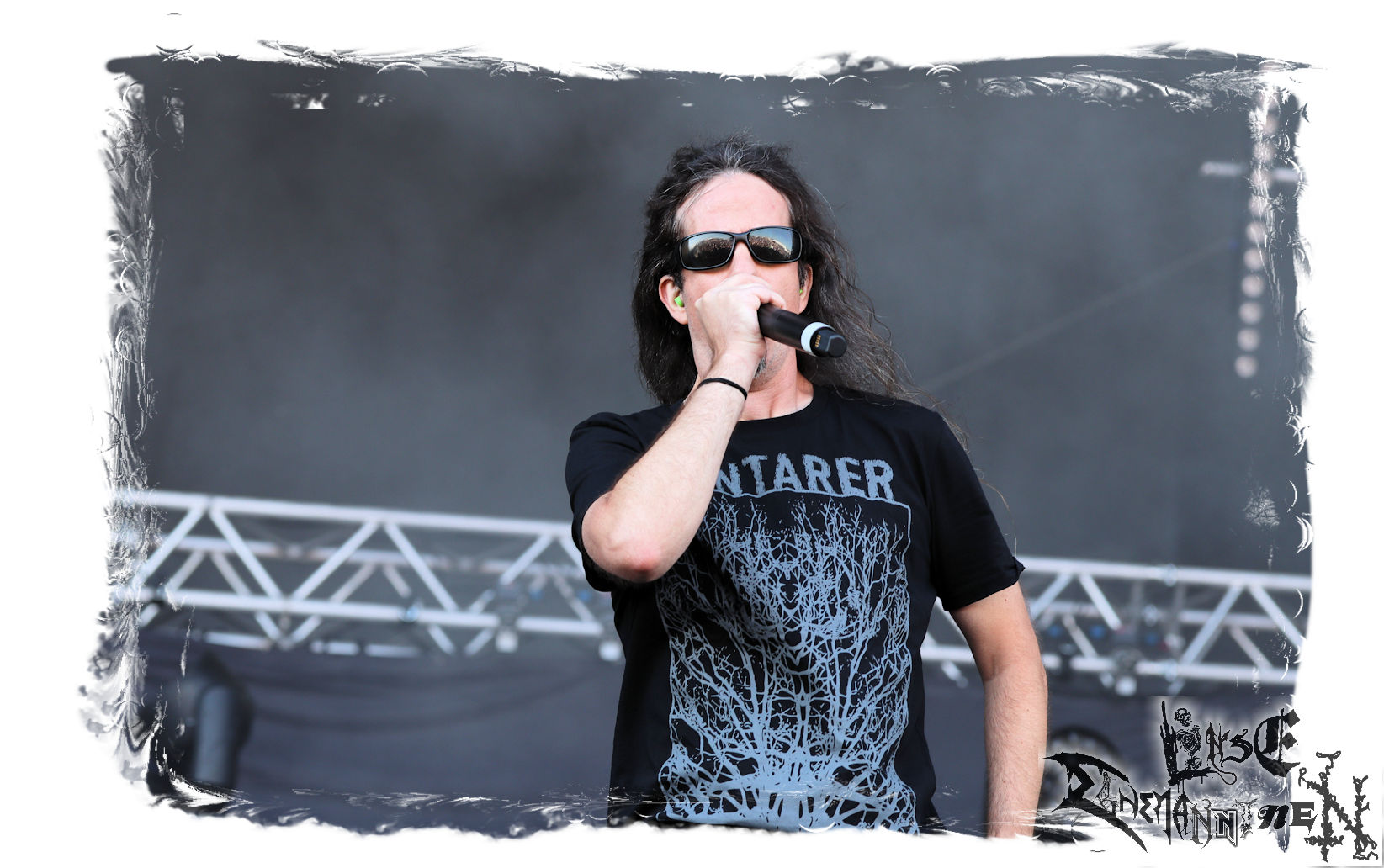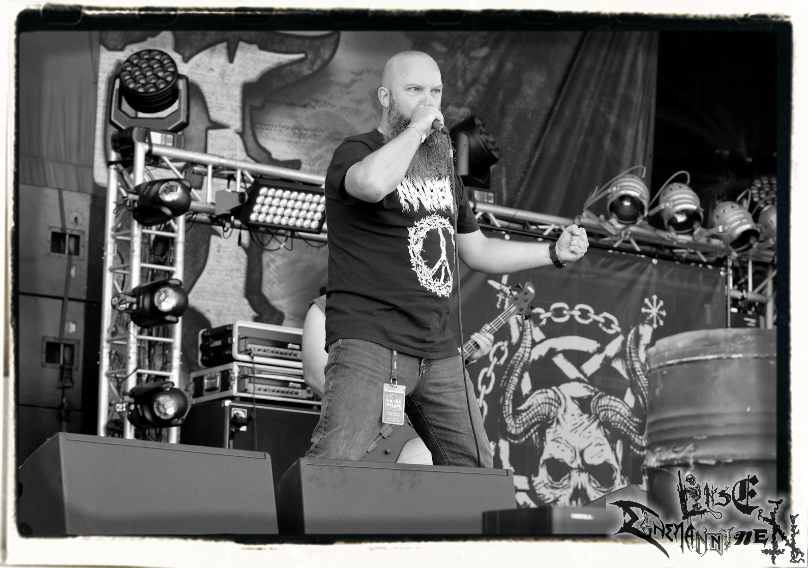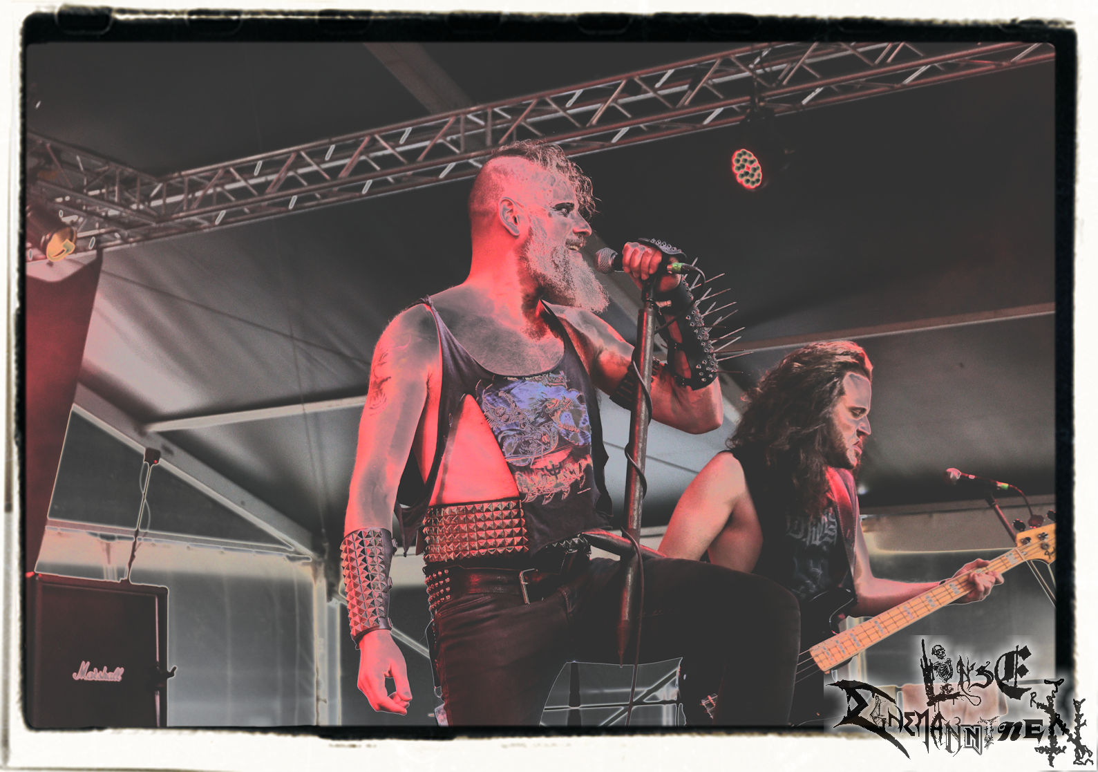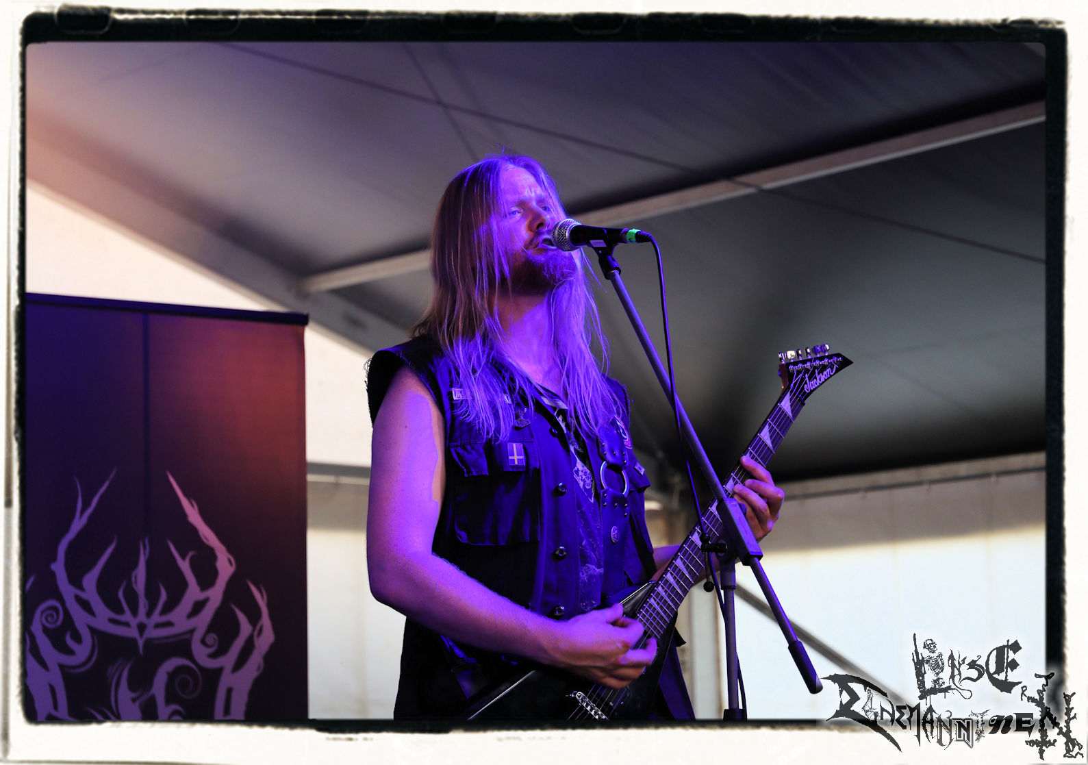 Mit EIS wird der Abend eingeläutet. Die Band aus dem Lupus Lounge – Stall ist wie geschaffen für das Zelt auf dem PARTY.SAN METAL OPEN AIR und beweist eindrucksvoll, wie man Atmosphäre mit mitreißenden Black Metal – Songs kombiniert. Bandkopf Alboin ist gleichzeitig Fan und Vollblutmusiker, der mit den Schwarzmetall-Größen der Neunziger aufgewachsen ist, wobei seine Musik sowohl von diesen, als auch von seiner Bewunderung gegenüber prägenden heimischen Acts wie Helrunar oder auch dem Wirken von Schwadorf mit Sun Of The Sleepless beeinflusst ist. Auch macht er keinen Hehl daraus, dass ihm die Einladung nach Schlotheim mit seiner Band als "Spätberufenem" sehr viel bedeutet. Und diese Haltung schwingt in diesem Konzert mit. Egal, ob Songs vom 2005er-Album "Galeere" ("Durch lichtlose Tiefen", seinerzeit noch unter dem Bandvorgänger Geist veröffentlicht (aus namensrechtlichen Gründen musste man sich danach in Eis umbenennen), vom bisher jüngsten Album "Bannstein" oder vom Klassiker "Wetterkreuz" (2012), der heuer auch schon zehn Jahre auf dem Buckel hat, gespielt werden. Eis zünden ein kleines Highlight, das mir noch lange in Erinnerung bleiben und mich animiert, mir die Scheiben mal wieder zu Gemüte zu führen. Danke!(JD)