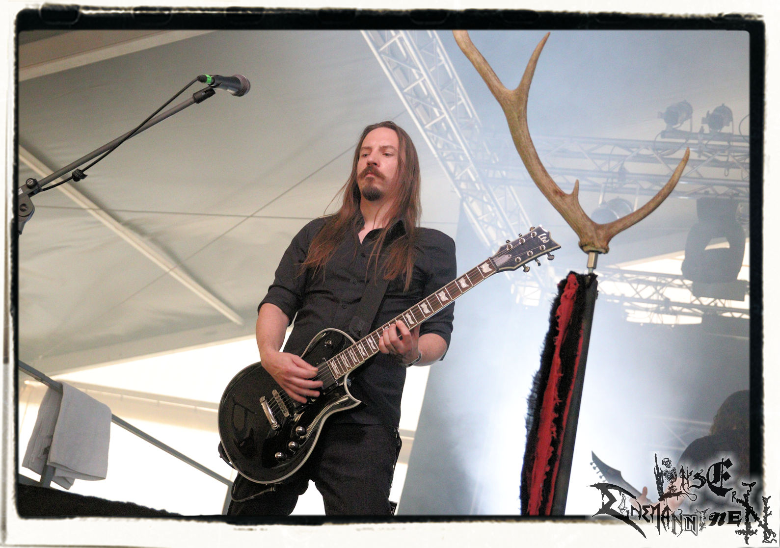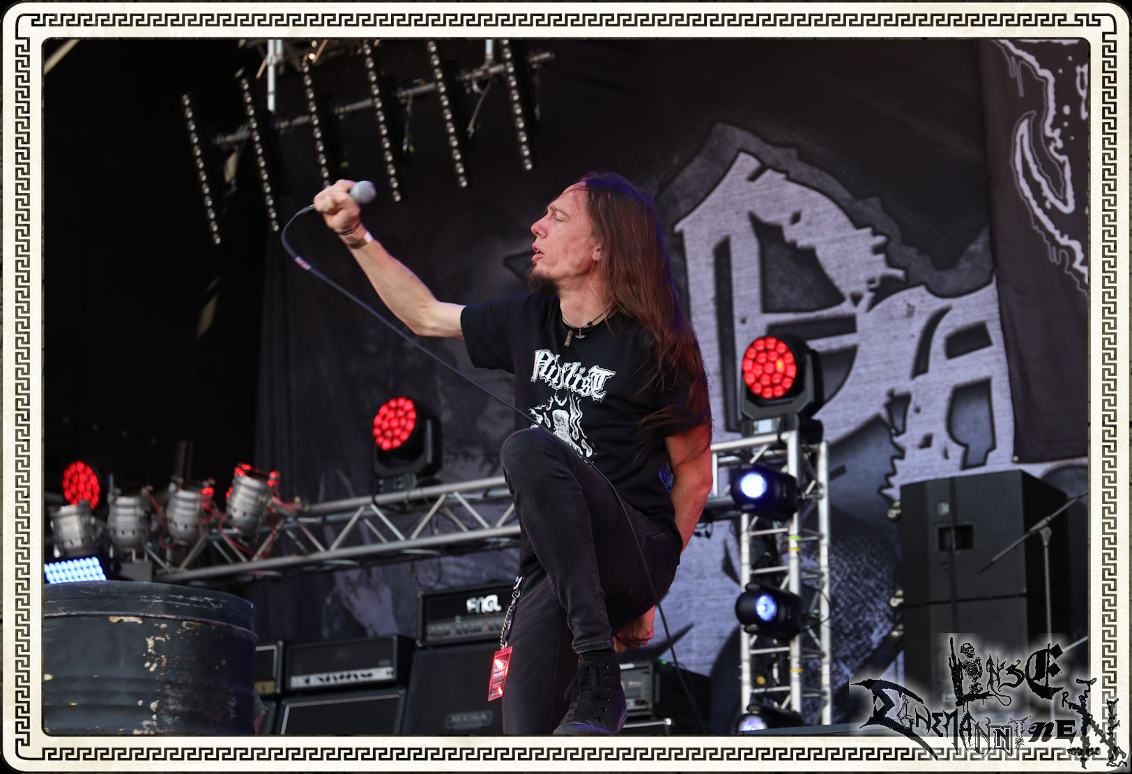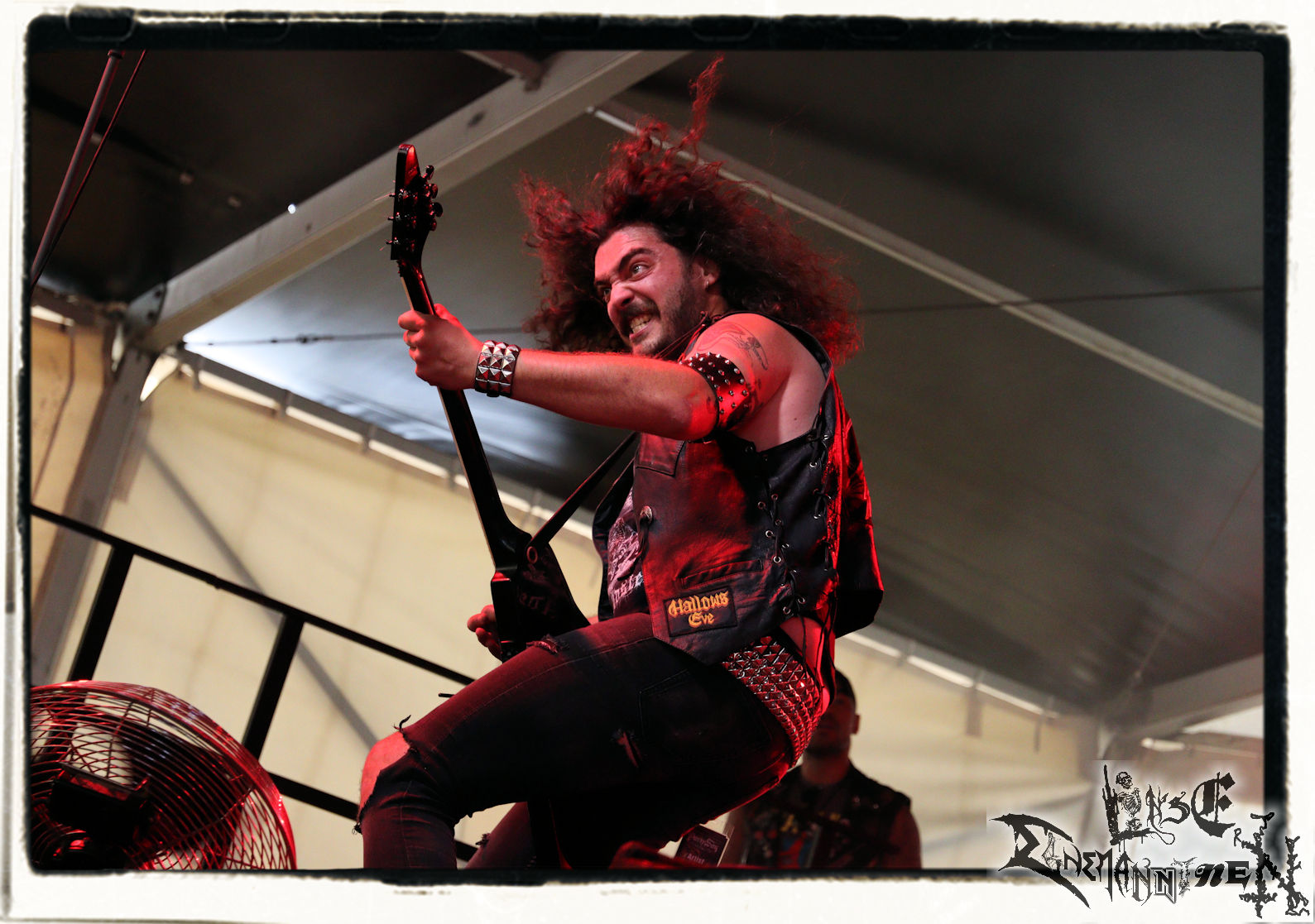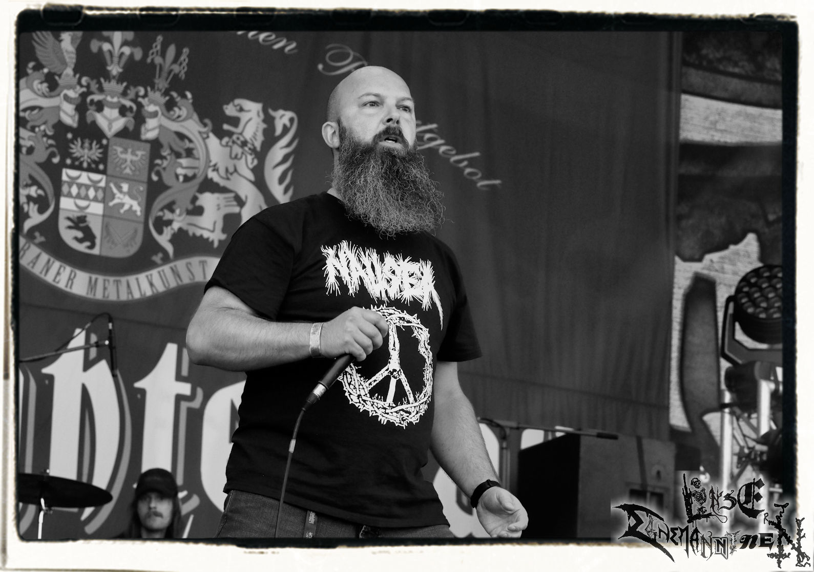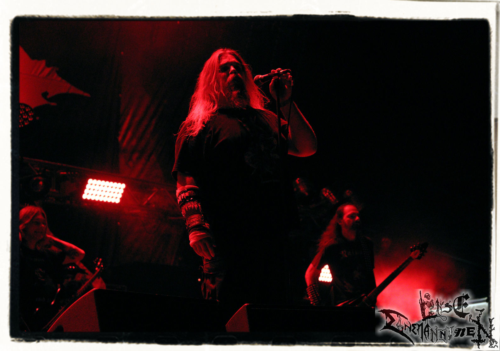 Mit EIS wird der Abend eingeläutet. Die Band aus dem Lupus Lounge – Stall ist wie geschaffen für das Zelt auf dem PARTY.SAN METAL OPEN AIR und beweist eindrucksvoll, wie man Atmosphäre mit mitreißenden Black Metal – Songs kombiniert. Bandkopf Alboin ist gleichzeitig Fan und Vollblutmusiker, der mit den Schwarzmetall-Größen der Neunziger aufgewachsen ist, wobei seine Musik sowohl von diesen, als auch von seiner Bewunderung gegenüber prägenden heimischen Acts wie Helrunar oder auch dem Wirken von Schwadorf mit Sun Of The Sleepless beeinflusst ist. Auch macht er keinen Hehl daraus, dass ihm die Einladung nach Schlotheim mit seiner Band als "Spätberufenem" sehr viel bedeutet. Und diese Haltung schwingt in diesem Konzert mit. Egal, ob Songs vom 2005er-Album "Galeere" ("Durch lichtlose Tiefen", seinerzeit noch unter dem Bandvorgänger Geist veröffentlicht (aus namensrechtlichen Gründen musste man sich danach in Eis umbenennen), vom bisher jüngsten Album "Bannstein" oder vom Klassiker "Wetterkreuz" (2012), der heuer auch schon zehn Jahre auf dem Buckel hat, gespielt werden. Eis zünden ein kleines Highlight, das mir noch lange in Erinnerung bleiben und mich animiert, mir die Scheiben mal wieder zu Gemüte zu führen. Danke!(JD)