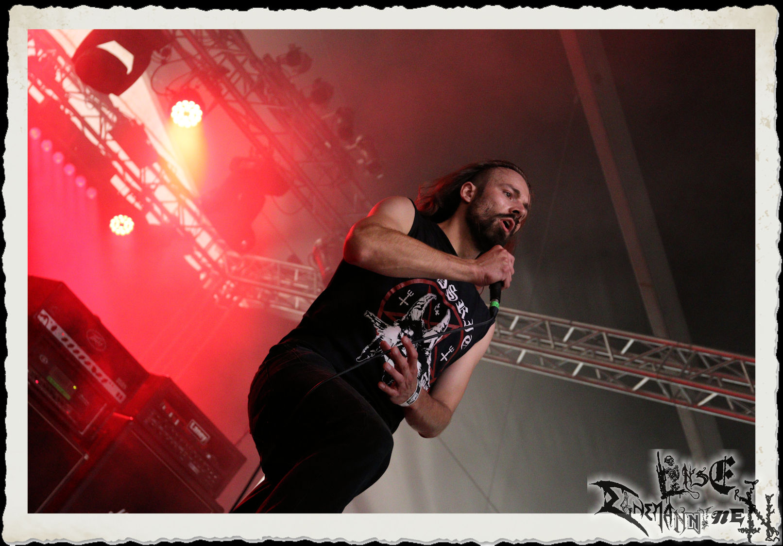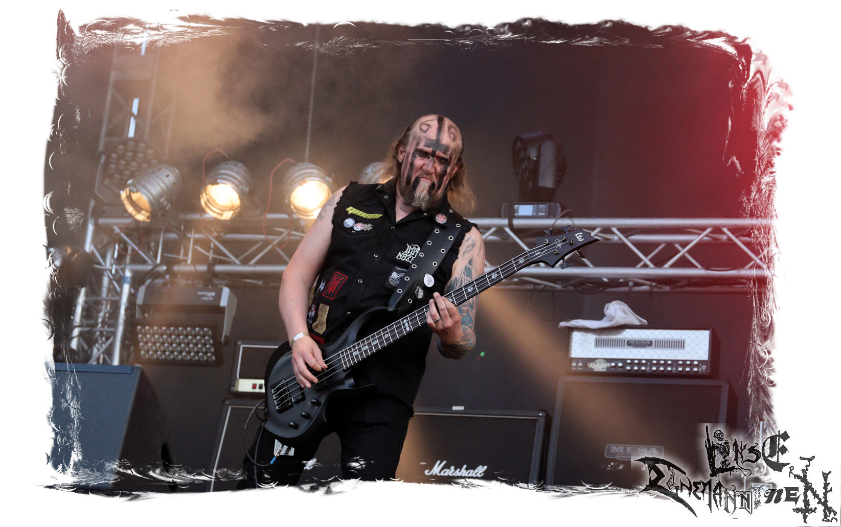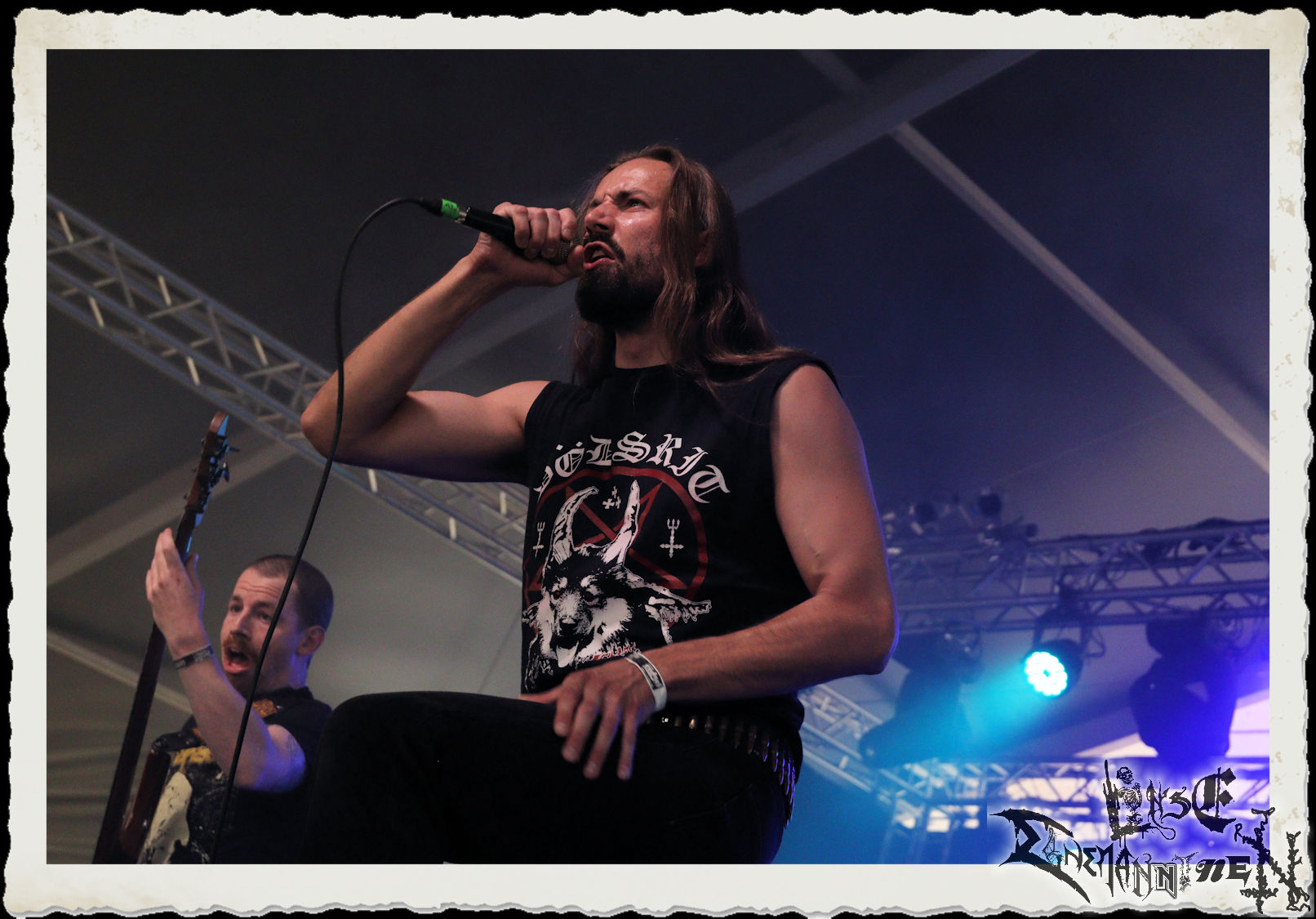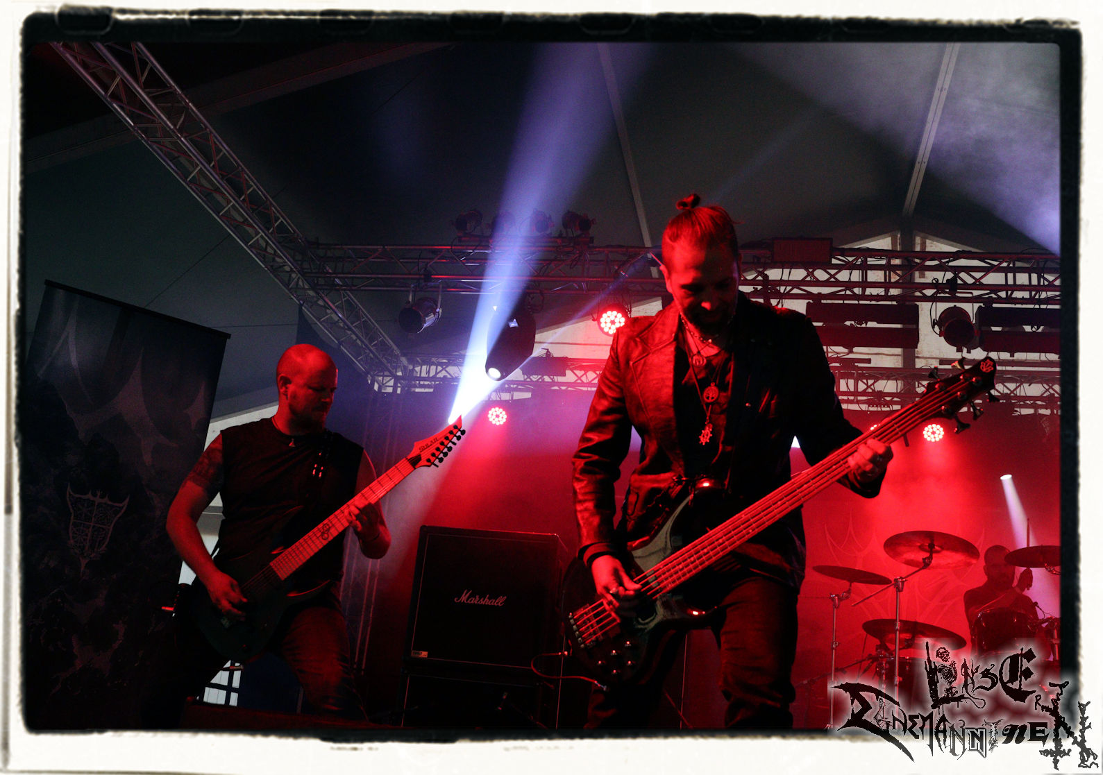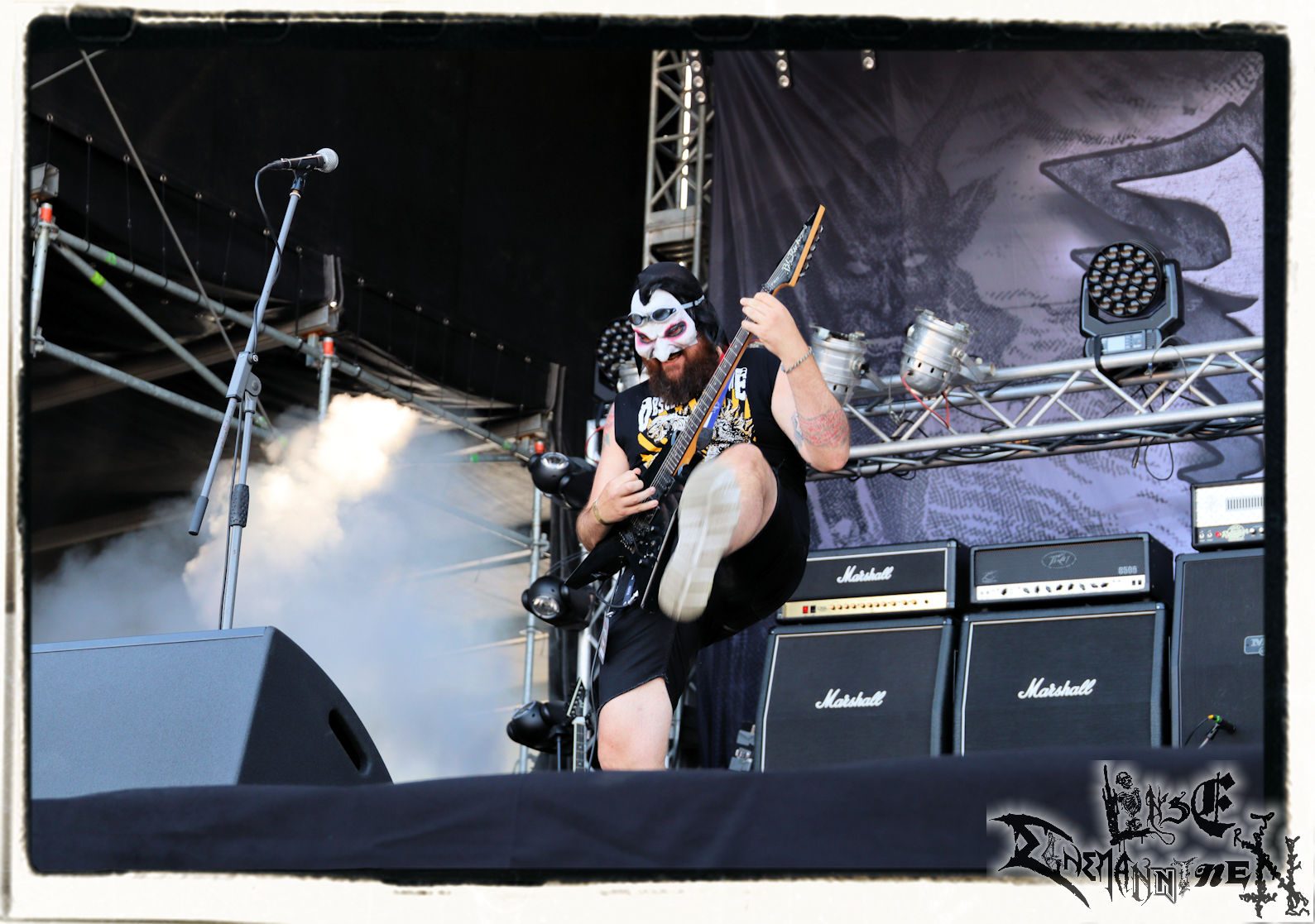Mit EIS wird der Abend eingeläutet. Die Band aus dem Lupus Lounge – Stall ist wie geschaffen für das Zelt auf dem PARTY.SAN METAL OPEN AIR und beweist eindrucksvoll, wie man Atmosphäre mit mitreißenden Black Metal – Songs kombiniert. Bandkopf Alboin ist gleichzeitig Fan und Vollblutmusiker, der mit den Schwarzmetall-Größen der Neunziger aufgewachsen ist, wobei seine Musik sowohl von diesen, als auch von seiner Bewunderung gegenüber prägenden heimischen Acts wie Helrunar oder auch dem Wirken von Schwadorf mit Sun Of The Sleepless beeinflusst ist. Auch macht er keinen Hehl daraus, dass ihm die Einladung nach Schlotheim mit seiner Band als "Spätberufenem" sehr viel bedeutet. Und diese Haltung schwingt in diesem Konzert mit. Egal, ob Songs vom 2005er-Album "Galeere" ("Durch lichtlose Tiefen", seinerzeit noch unter dem Bandvorgänger Geist veröffentlicht (aus namensrechtlichen Gründen musste man sich danach in Eis umbenennen), vom bisher jüngsten Album "Bannstein" oder vom Klassiker "Wetterkreuz" (2012), der heuer auch schon zehn Jahre auf dem Buckel hat, gespielt werden. Eis zünden ein kleines Highlight, das mir noch lange in Erinnerung bleiben und mich animiert, mir die Scheiben mal wieder zu Gemüte zu führen. Danke!(JD)