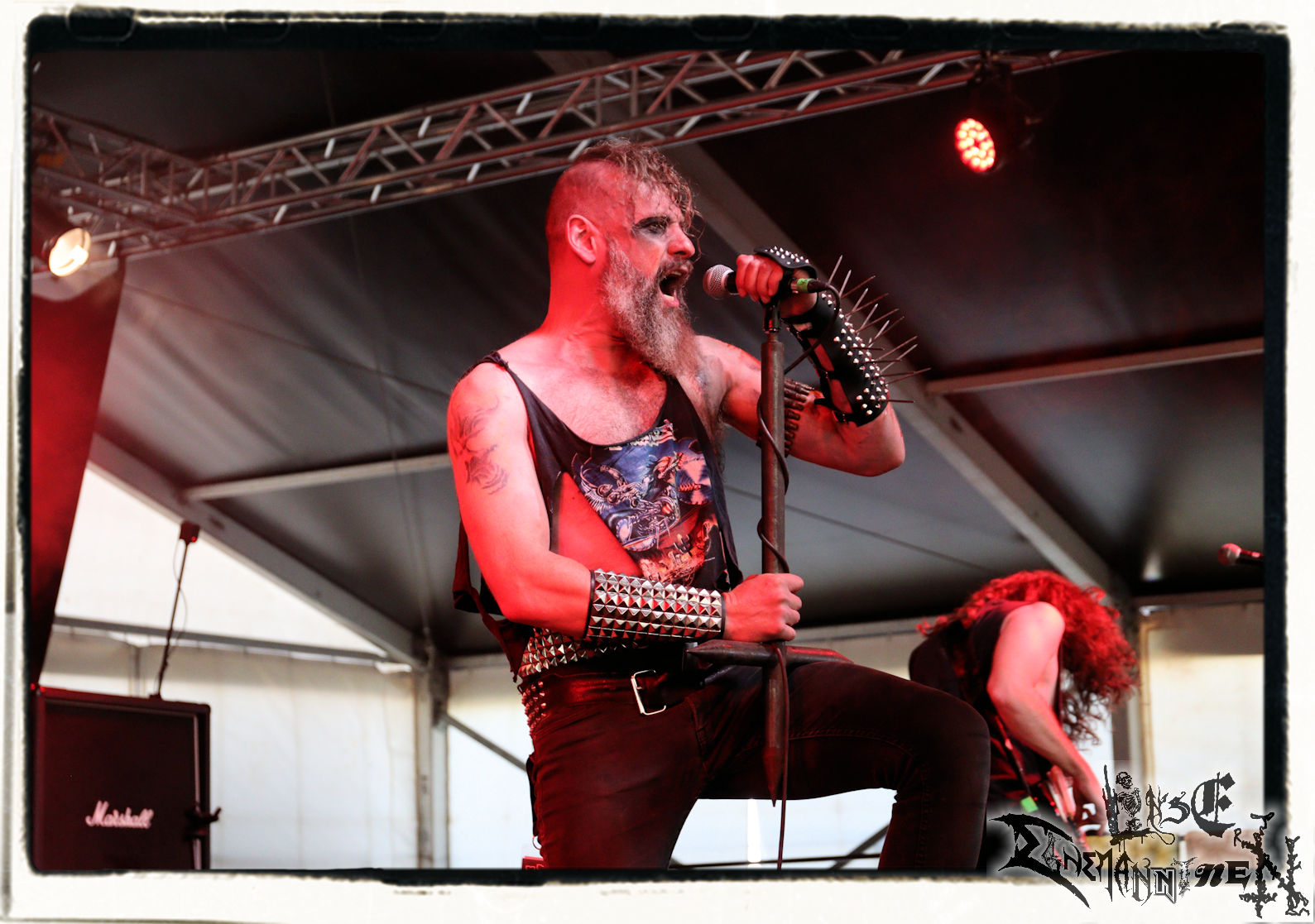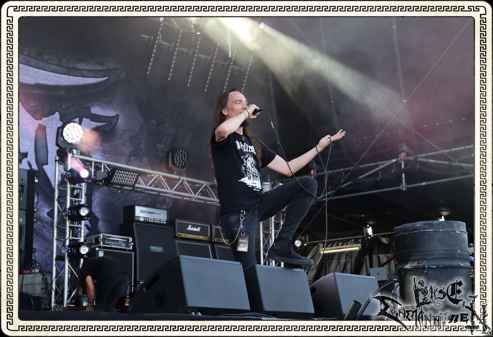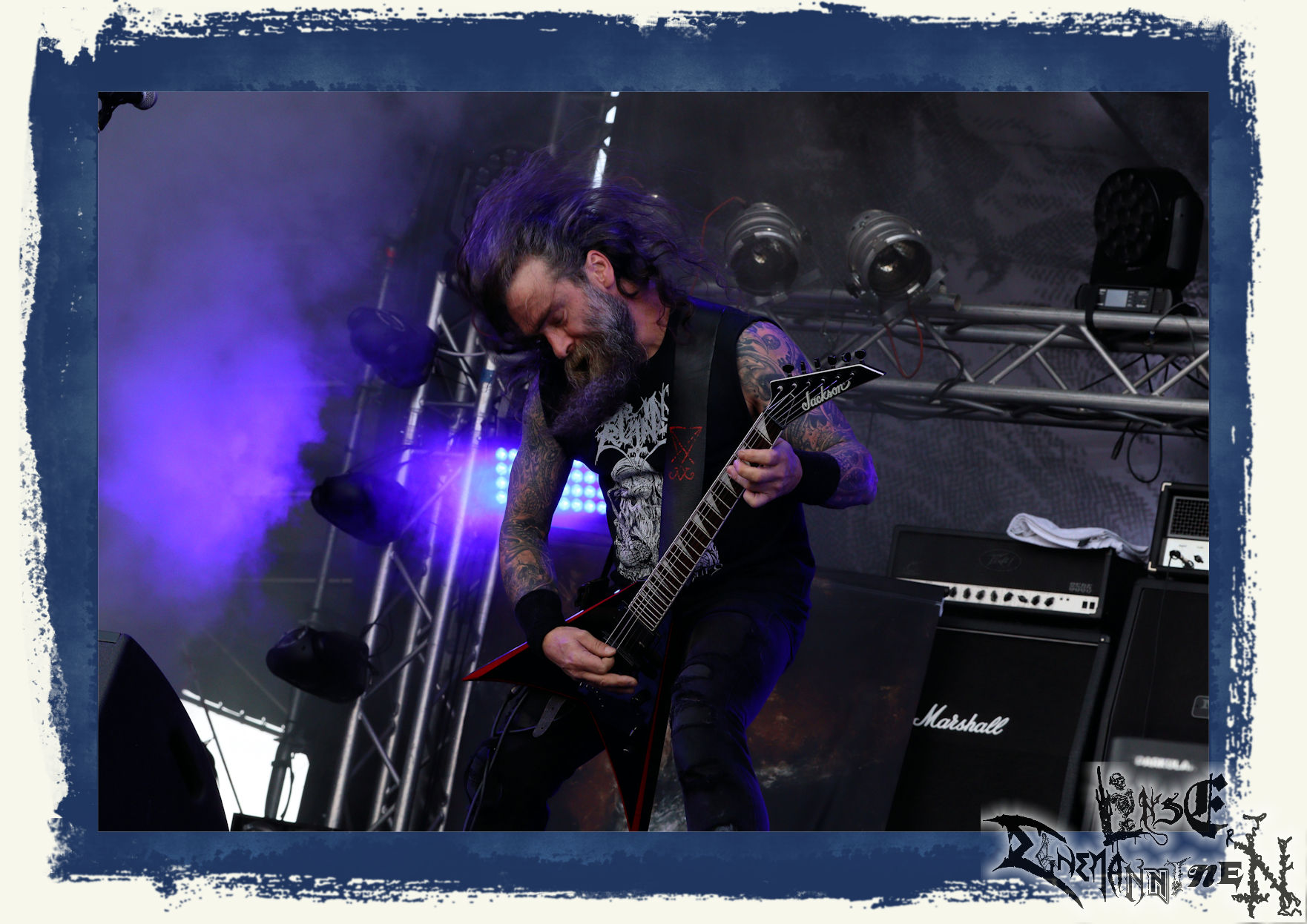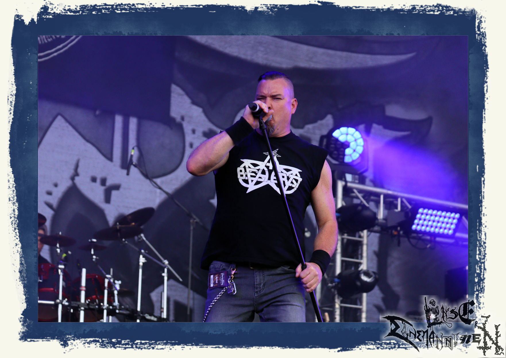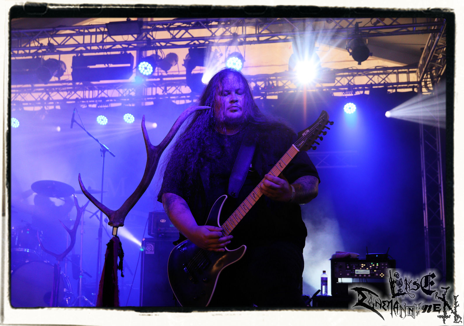 Mit EIS wird der Abend eingeläutet. Die Band aus dem Lupus Lounge – Stall ist wie geschaffen für das Zelt auf dem PARTY.SAN METAL OPEN AIR und beweist eindrucksvoll, wie man Atmosphäre mit mitreißenden Black Metal – Songs kombiniert. Bandkopf Alboin ist gleichzeitig Fan und Vollblutmusiker, der mit den Schwarzmetall-Größen der Neunziger aufgewachsen ist, wobei seine Musik sowohl von diesen, als auch von seiner Bewunderung gegenüber prägenden heimischen Acts wie Helrunar oder auch dem Wirken von Schwadorf mit Sun Of The Sleepless beeinflusst ist. Auch macht er keinen Hehl daraus, dass ihm die Einladung nach Schlotheim mit seiner Band als "Spätberufenem" sehr viel bedeutet. Und diese Haltung schwingt in diesem Konzert mit. Egal, ob Songs vom 2005er-Album "Galeere" ("Durch lichtlose Tiefen", seinerzeit noch unter dem Bandvorgänger Geist veröffentlicht (aus namensrechtlichen Gründen musste man sich danach in Eis umbenennen), vom bisher jüngsten Album "Bannstein" oder vom Klassiker "Wetterkreuz" (2012), der heuer auch schon zehn Jahre auf dem Buckel hat, gespielt werden. Eis zünden ein kleines Highlight, das mir noch lange in Erinnerung bleiben und mich animiert, mir die Scheiben mal wieder zu Gemüte zu führen. Danke!(JD)