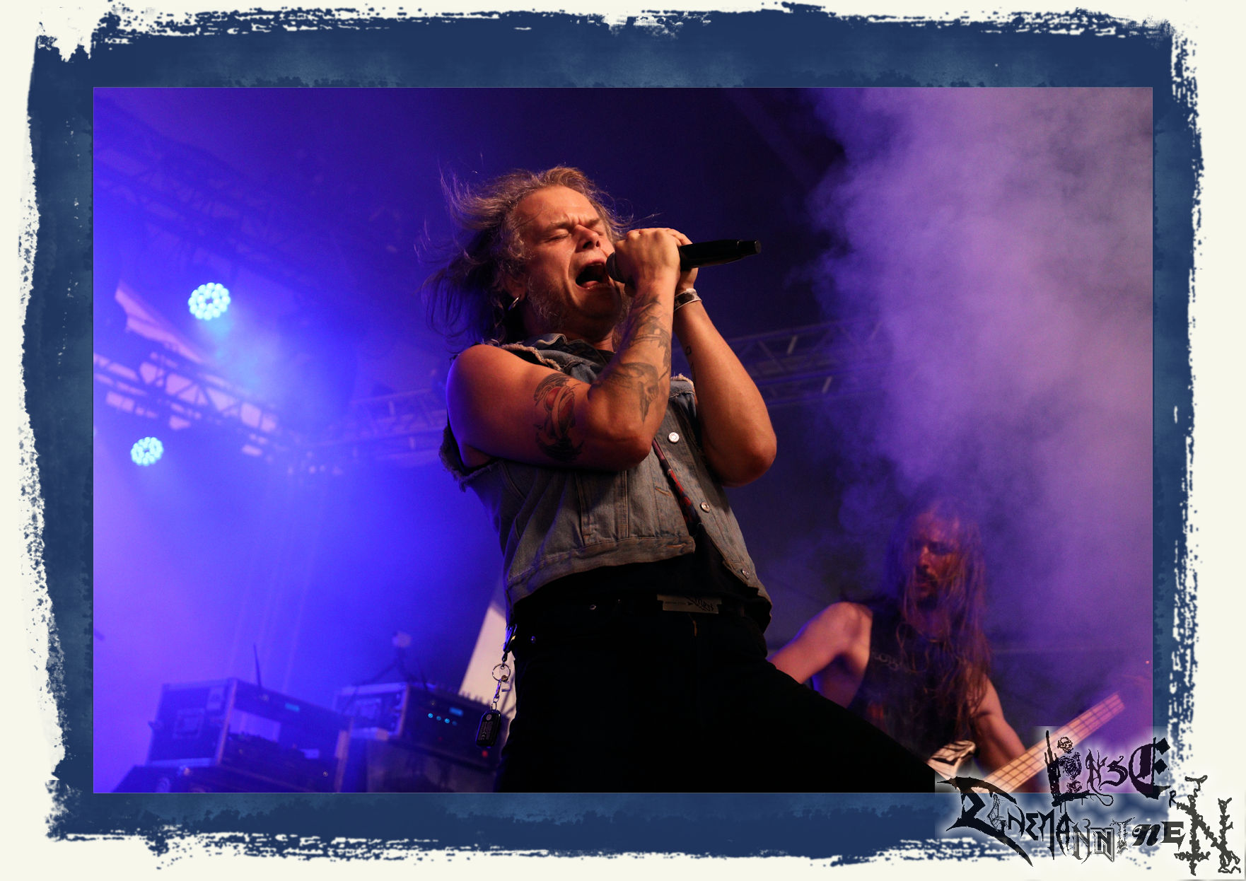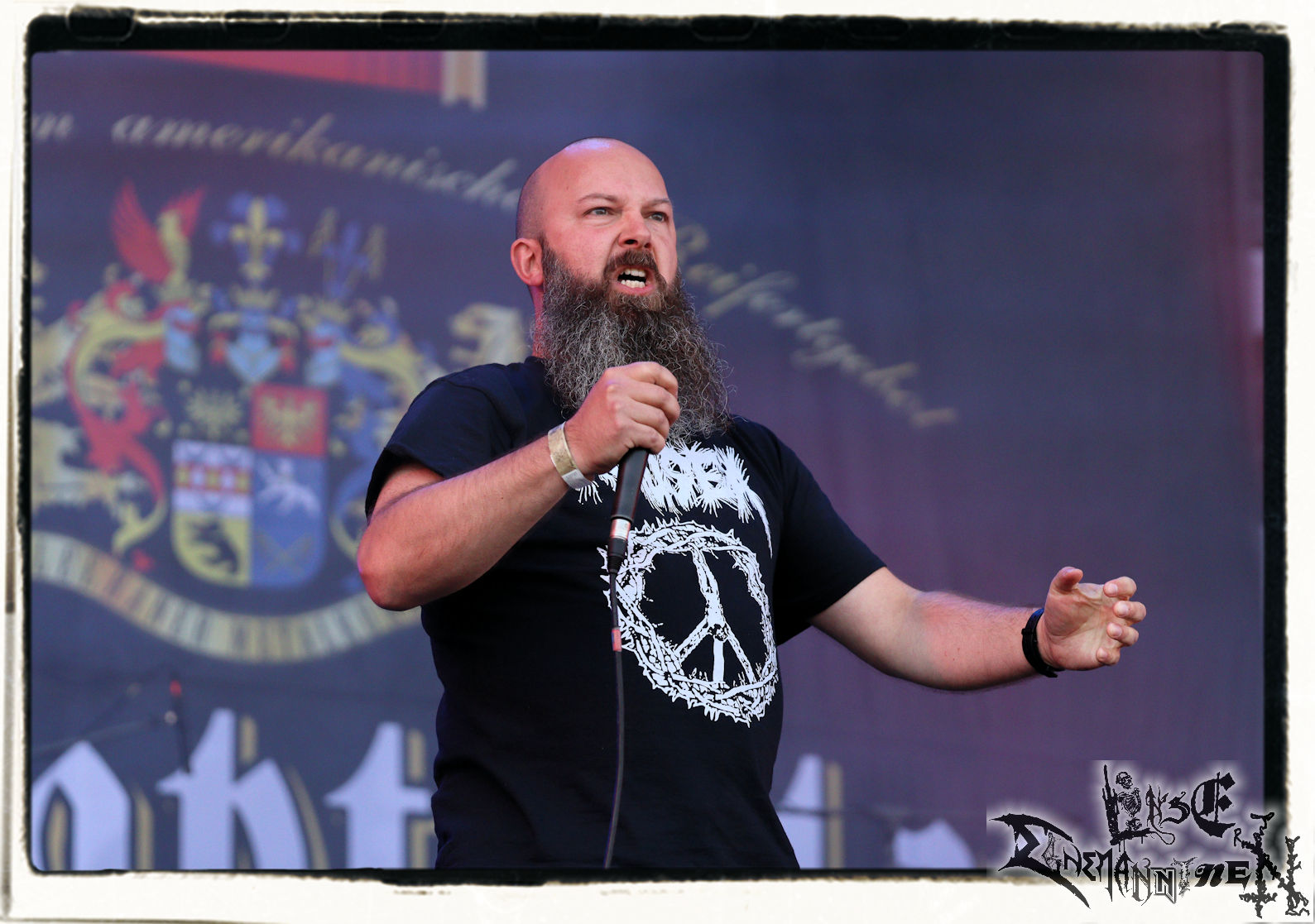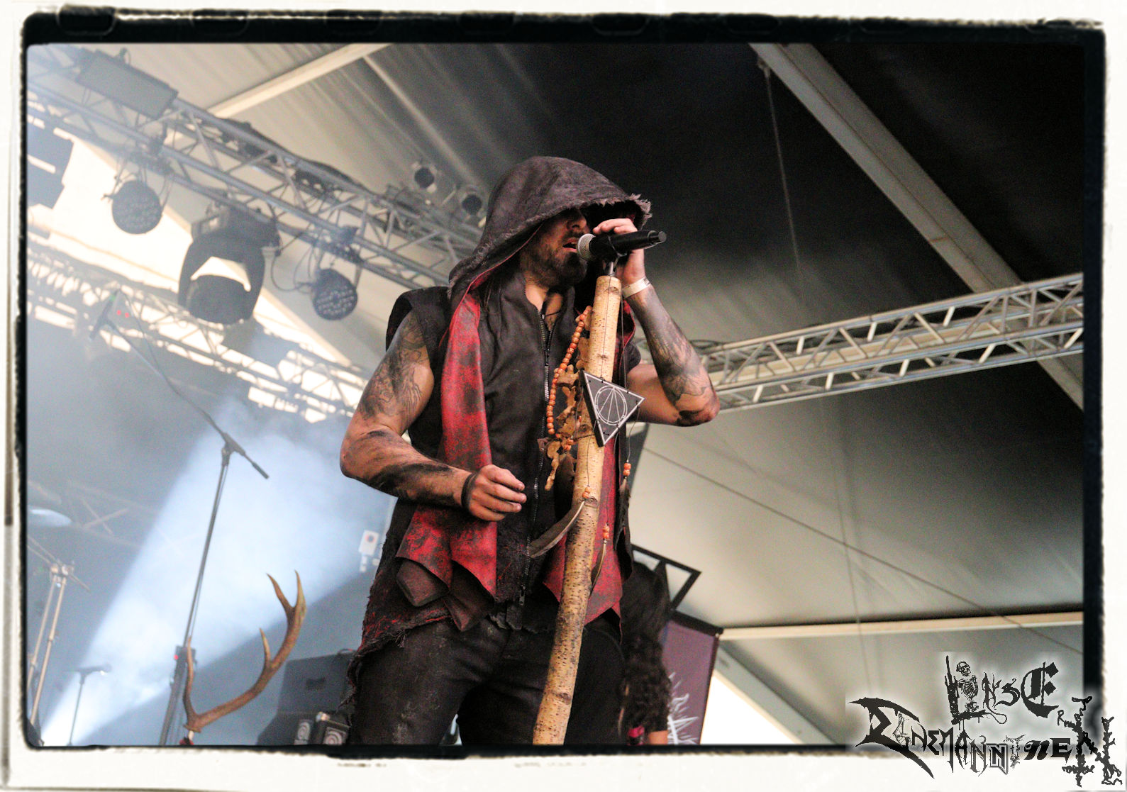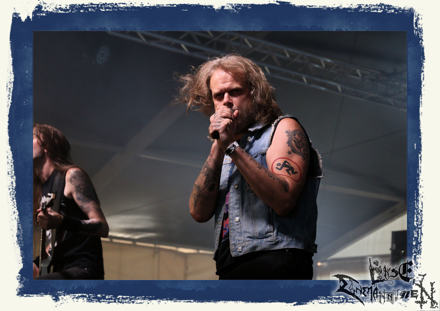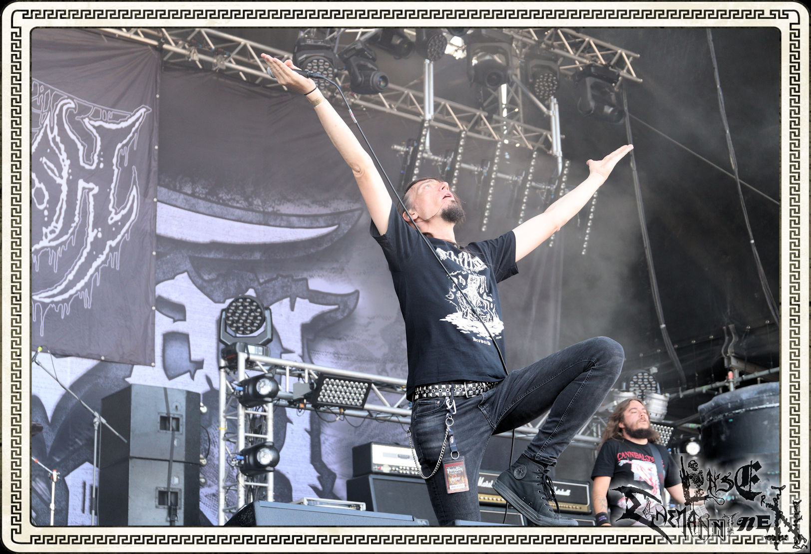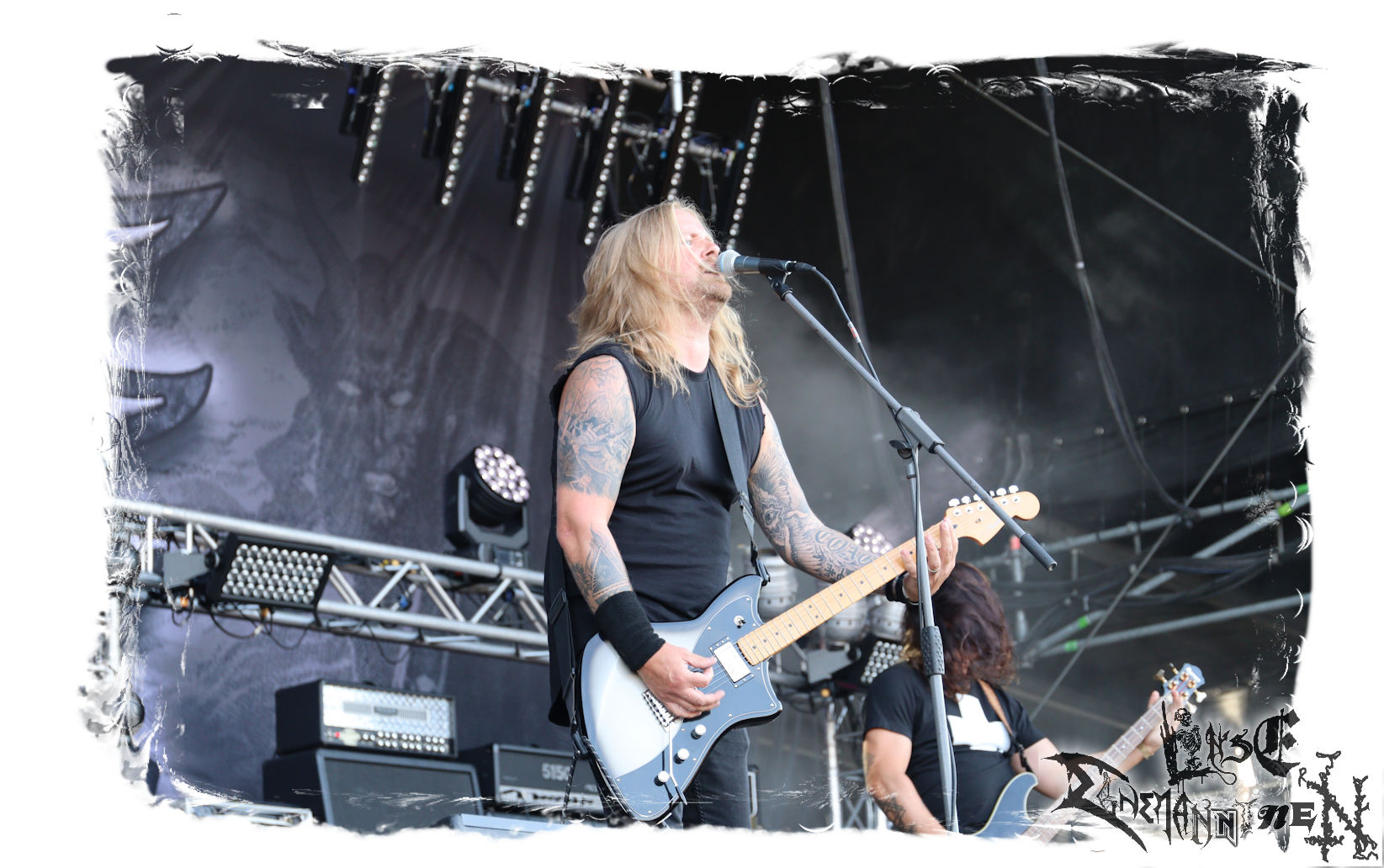 Mit EIS wird der Abend eingeläutet. Die Band aus dem Lupus Lounge – Stall ist wie geschaffen für das Zelt auf dem PARTY.SAN METAL OPEN AIR und beweist eindrucksvoll, wie man Atmosphäre mit mitreißenden Black Metal – Songs kombiniert. Bandkopf Alboin ist gleichzeitig Fan und Vollblutmusiker, der mit den Schwarzmetall-Größen der Neunziger aufgewachsen ist, wobei seine Musik sowohl von diesen, als auch von seiner Bewunderung gegenüber prägenden heimischen Acts wie Helrunar oder auch dem Wirken von Schwadorf mit Sun Of The Sleepless beeinflusst ist. Auch macht er keinen Hehl daraus, dass ihm die Einladung nach Schlotheim mit seiner Band als "Spätberufenem" sehr viel bedeutet. Und diese Haltung schwingt in diesem Konzert mit. Egal, ob Songs vom 2005er-Album "Galeere" ("Durch lichtlose Tiefen", seinerzeit noch unter dem Bandvorgänger Geist veröffentlicht (aus namensrechtlichen Gründen musste man sich danach in Eis umbenennen), vom bisher jüngsten Album "Bannstein" oder vom Klassiker "Wetterkreuz" (2012), der heuer auch schon zehn Jahre auf dem Buckel hat, gespielt werden. Eis zünden ein kleines Highlight, das mir noch lange in Erinnerung bleiben und mich animiert, mir die Scheiben mal wieder zu Gemüte zu führen. Danke!(JD)