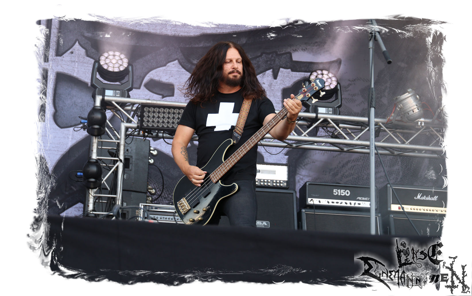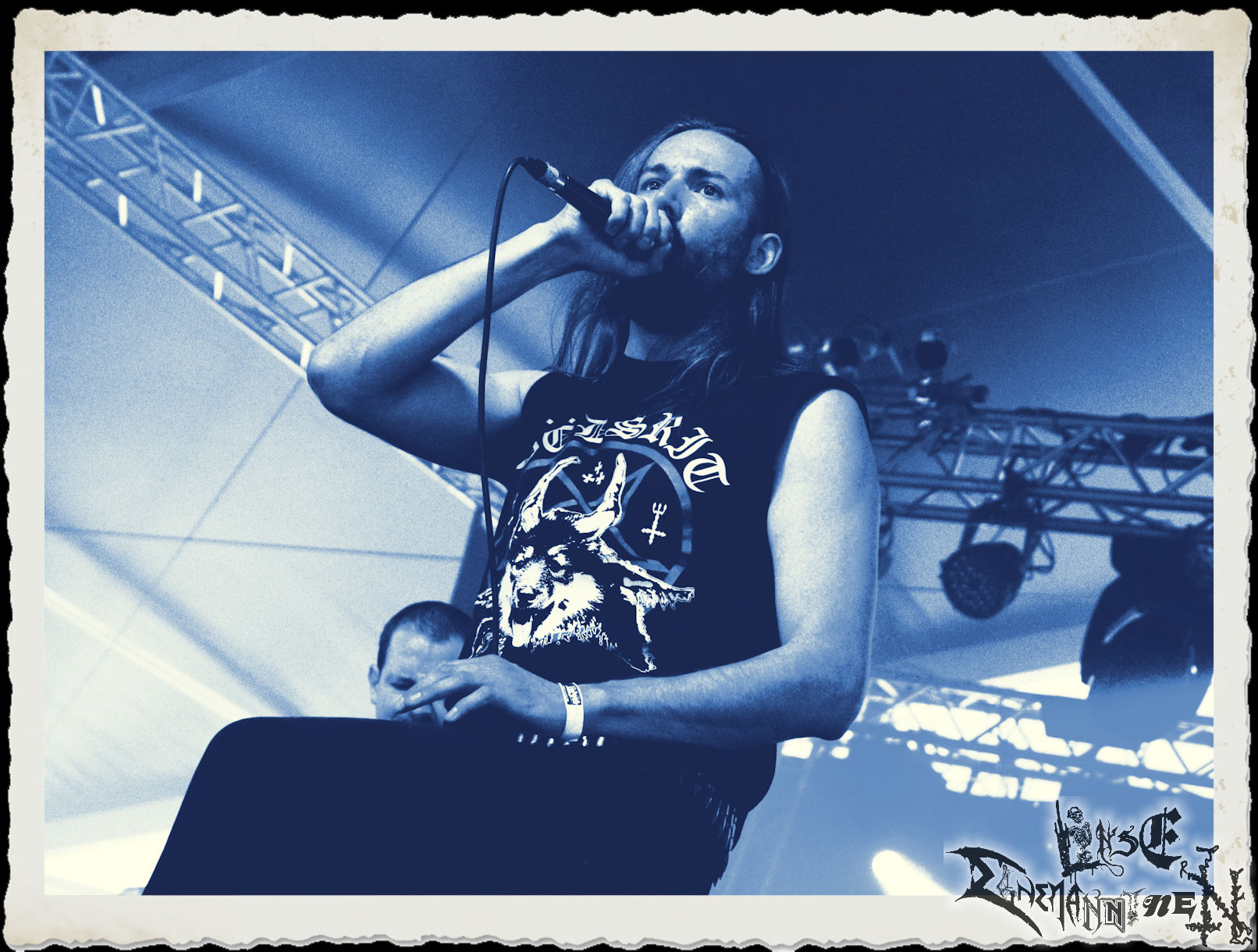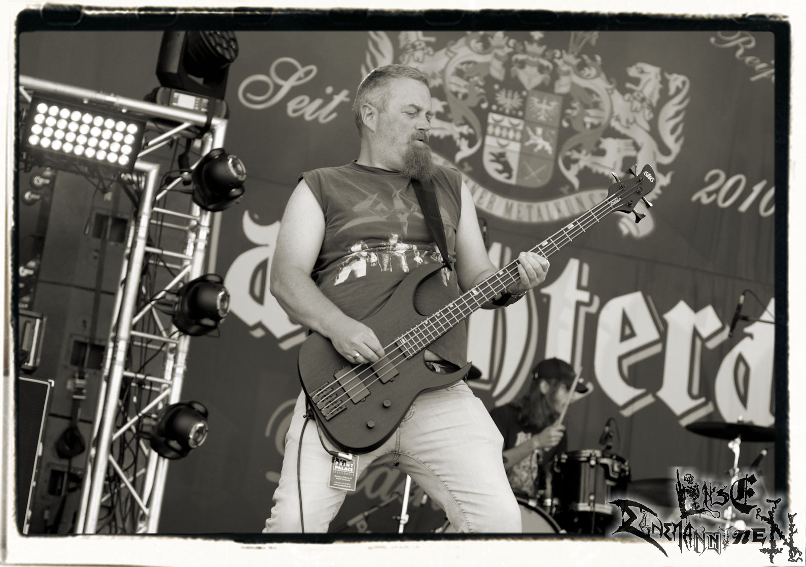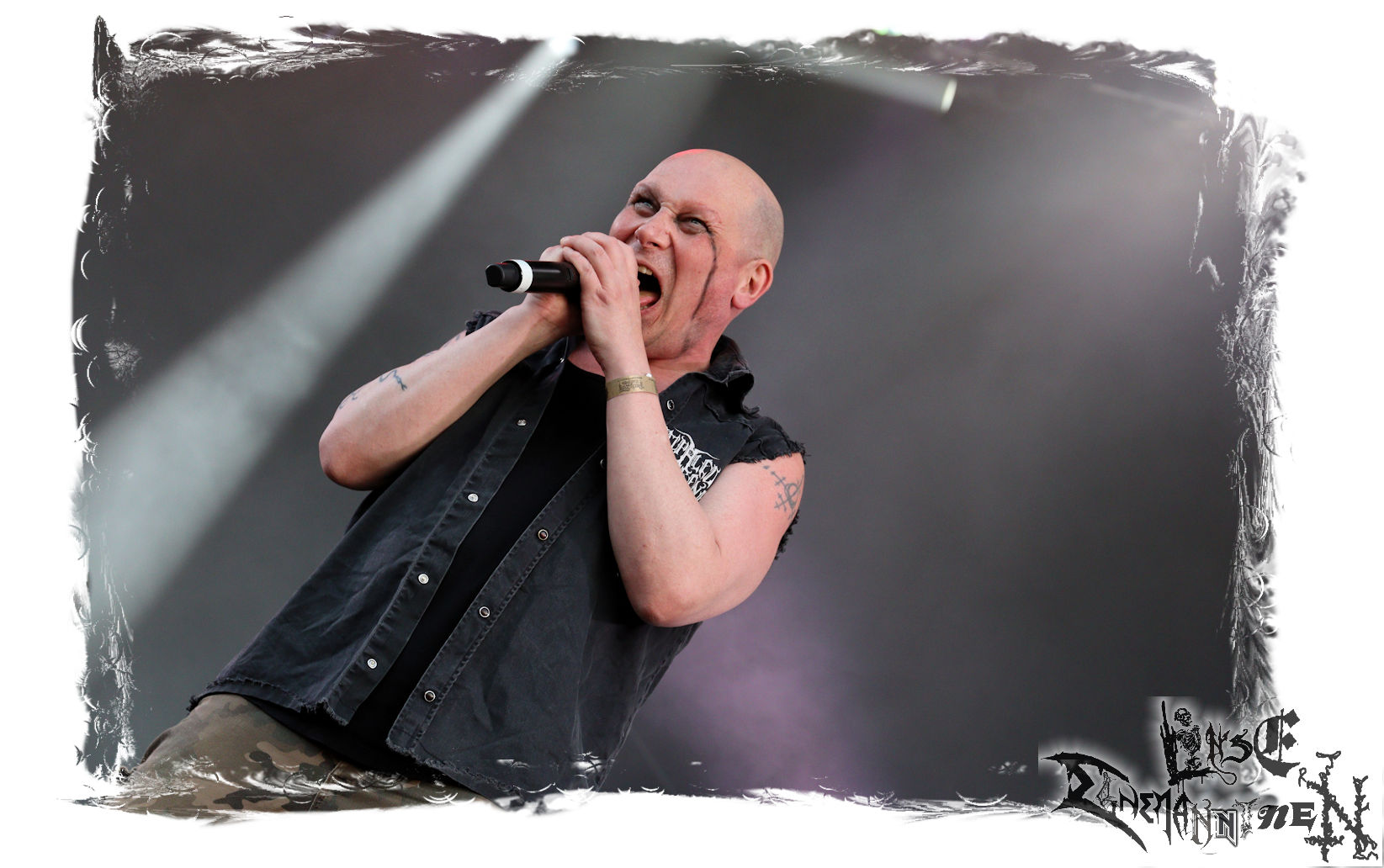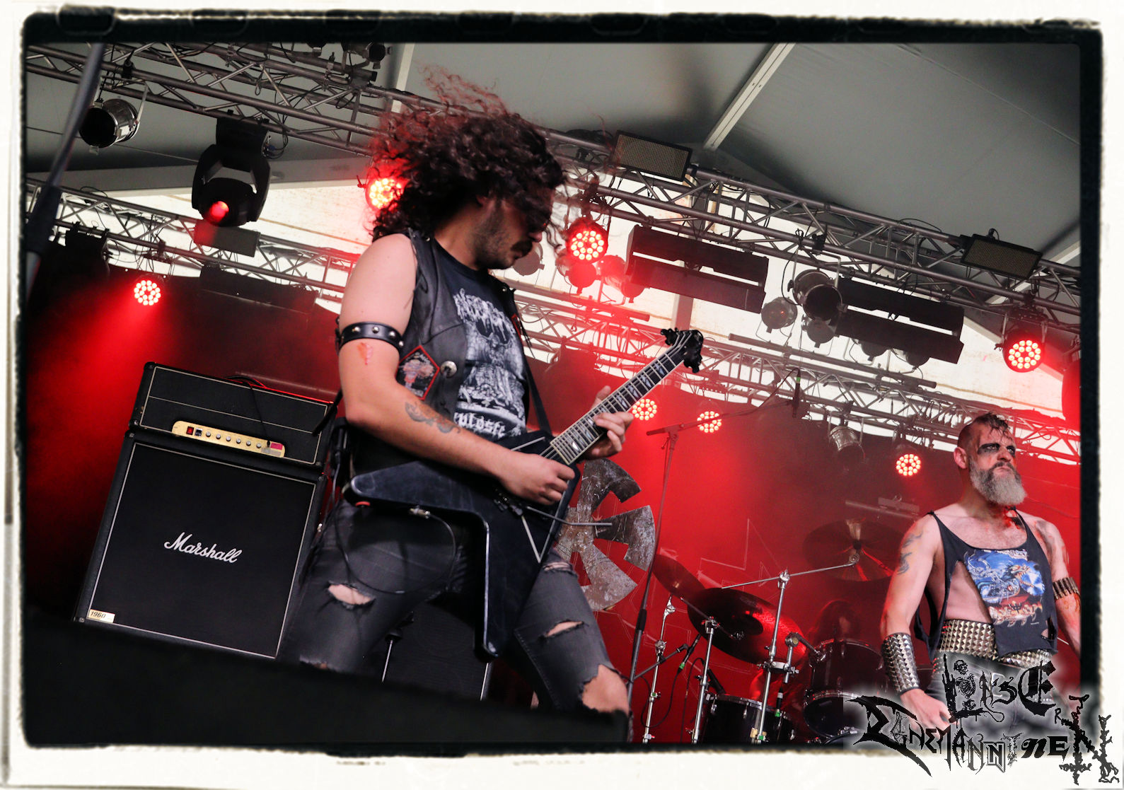 Mit EIS wird der Abend eingeläutet. Die Band aus dem Lupus Lounge – Stall ist wie geschaffen für das Zelt auf dem PARTY.SAN METAL OPEN AIR und beweist eindrucksvoll, wie man Atmosphäre mit mitreißenden Black Metal – Songs kombiniert. Bandkopf Alboin ist gleichzeitig Fan und Vollblutmusiker, der mit den Schwarzmetall-Größen der Neunziger aufgewachsen ist, wobei seine Musik sowohl von diesen, als auch von seiner Bewunderung gegenüber prägenden heimischen Acts wie Helrunar oder auch dem Wirken von Schwadorf mit Sun Of The Sleepless beeinflusst ist. Auch macht er keinen Hehl daraus, dass ihm die Einladung nach Schlotheim mit seiner Band als "Spätberufenem" sehr viel bedeutet. Und diese Haltung schwingt in diesem Konzert mit. Egal, ob Songs vom 2005er-Album "Galeere" ("Durch lichtlose Tiefen", seinerzeit noch unter dem Bandvorgänger Geist veröffentlicht (aus namensrechtlichen Gründen musste man sich danach in Eis umbenennen), vom bisher jüngsten Album "Bannstein" oder vom Klassiker "Wetterkreuz" (2012), der heuer auch schon zehn Jahre auf dem Buckel hat, gespielt werden. Eis zünden ein kleines Highlight, das mir noch lange in Erinnerung bleiben und mich animiert, mir die Scheiben mal wieder zu Gemüte zu führen. Danke!(JD)
