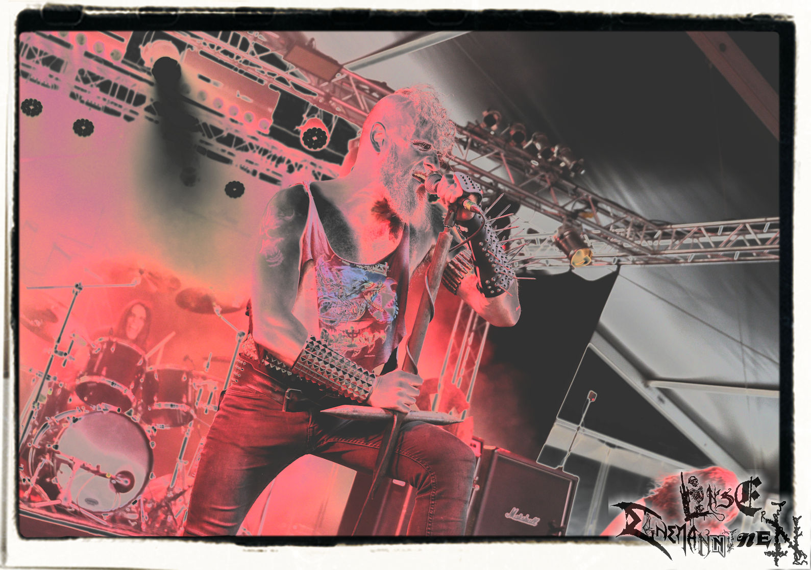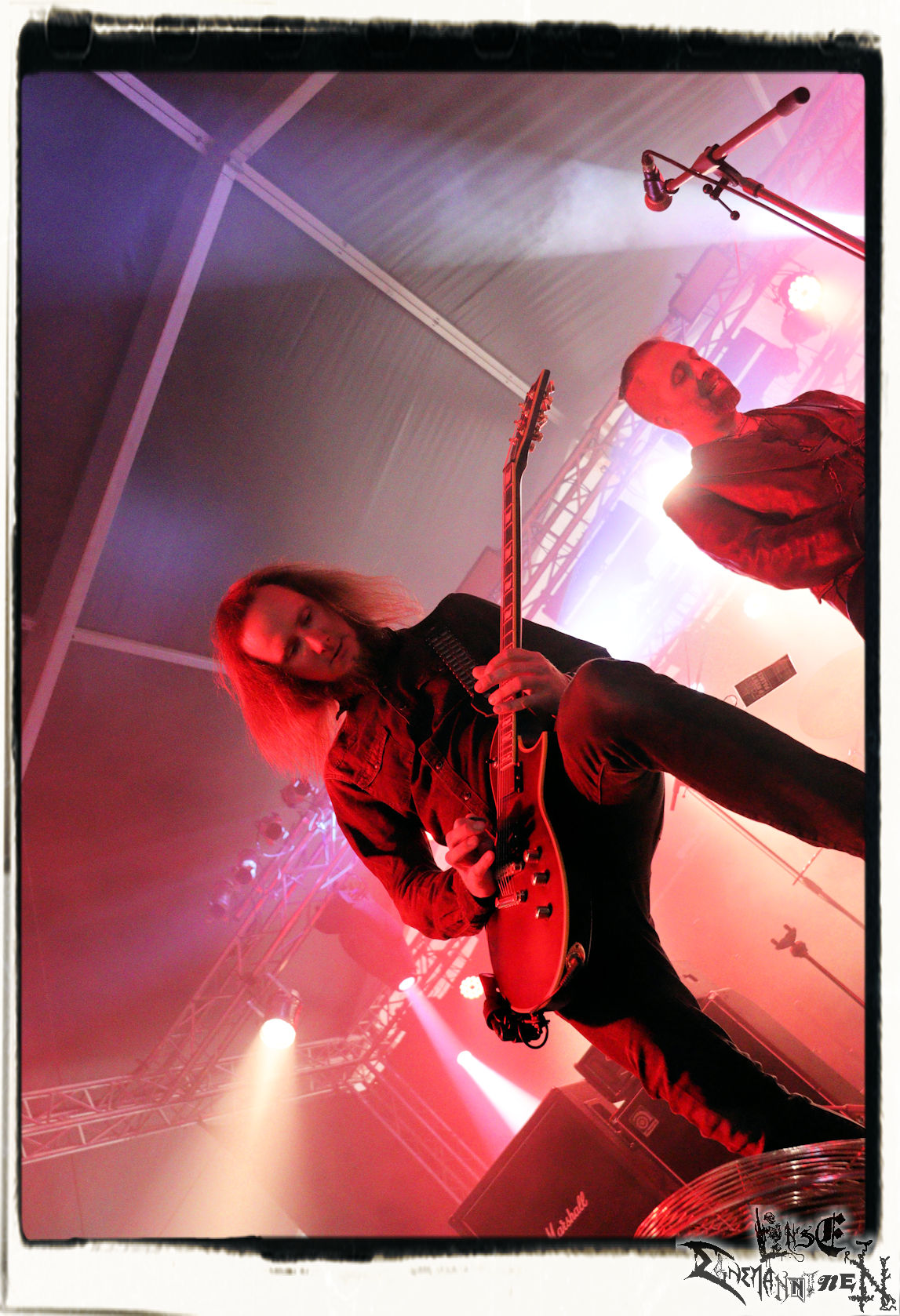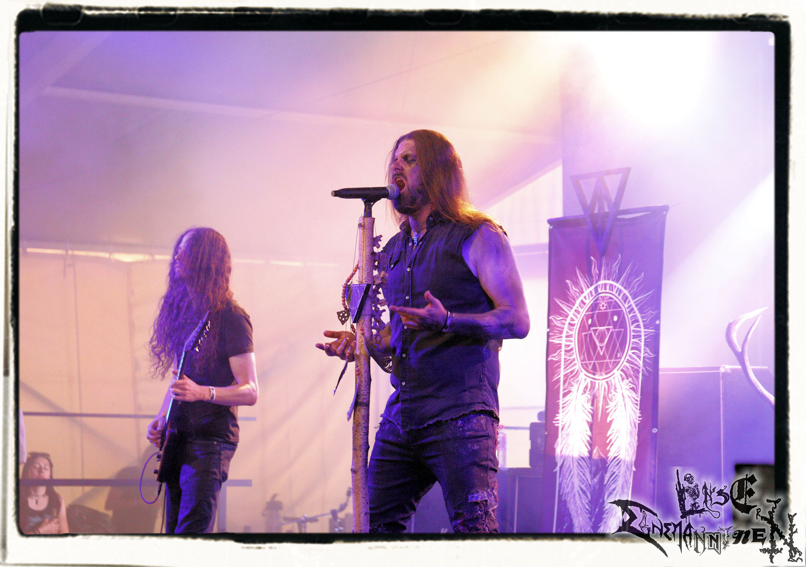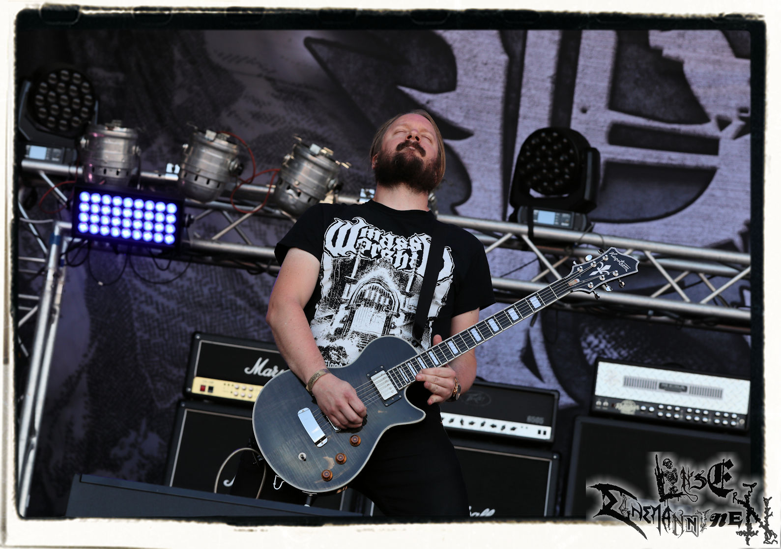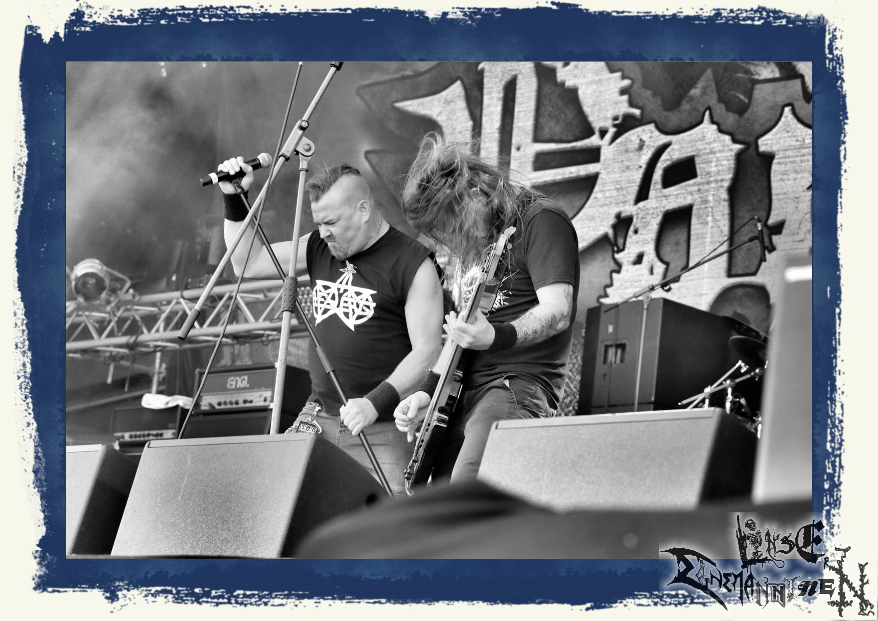 Mit EIS wird der Abend eingeläutet. Die Band aus dem Lupus Lounge – Stall ist wie geschaffen für das Zelt auf dem PARTY.SAN METAL OPEN AIR und beweist eindrucksvoll, wie man Atmosphäre mit mitreißenden Black Metal – Songs kombiniert. Bandkopf Alboin ist gleichzeitig Fan und Vollblutmusiker, der mit den Schwarzmetall-Größen der Neunziger aufgewachsen ist, wobei seine Musik sowohl von diesen, als auch von seiner Bewunderung gegenüber prägenden heimischen Acts wie Helrunar oder auch dem Wirken von Schwadorf mit Sun Of The Sleepless beeinflusst ist. Auch macht er keinen Hehl daraus, dass ihm die Einladung nach Schlotheim mit seiner Band als "Spätberufenem" sehr viel bedeutet. Und diese Haltung schwingt in diesem Konzert mit. Egal, ob Songs vom 2005er-Album "Galeere" ("Durch lichtlose Tiefen", seinerzeit noch unter dem Bandvorgänger Geist veröffentlicht (aus namensrechtlichen Gründen musste man sich danach in Eis umbenennen), vom bisher jüngsten Album "Bannstein" oder vom Klassiker "Wetterkreuz" (2012), der heuer auch schon zehn Jahre auf dem Buckel hat, gespielt werden. Eis zünden ein kleines Highlight, das mir noch lange in Erinnerung bleiben und mich animiert, mir die Scheiben mal wieder zu Gemüte zu führen. Danke!(JD)