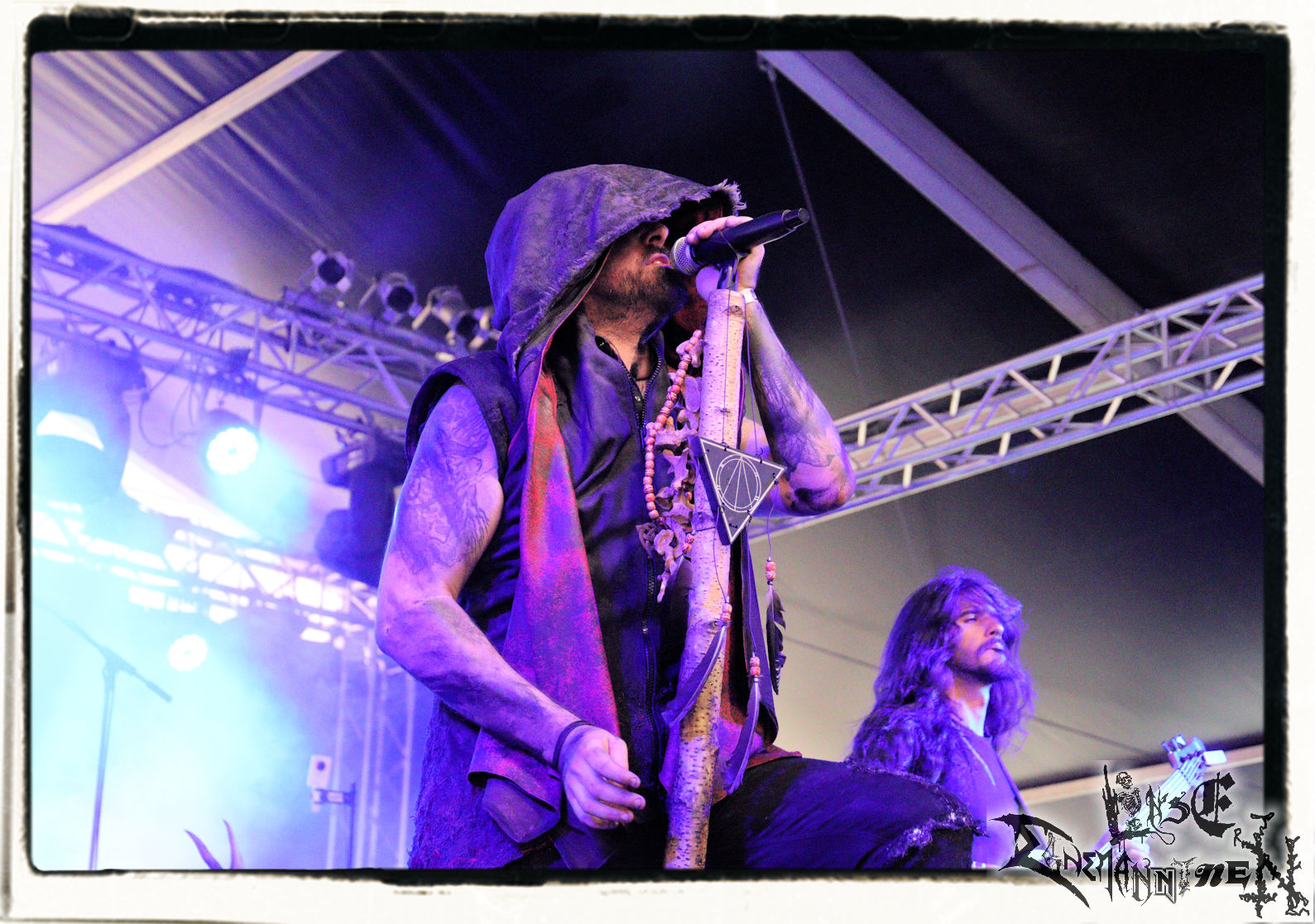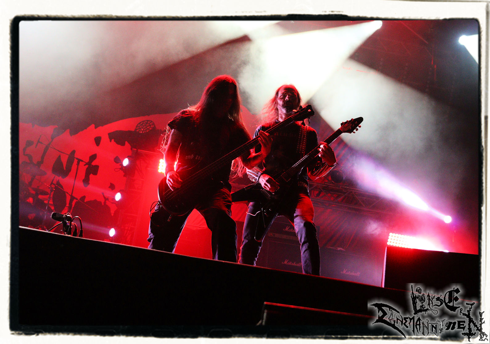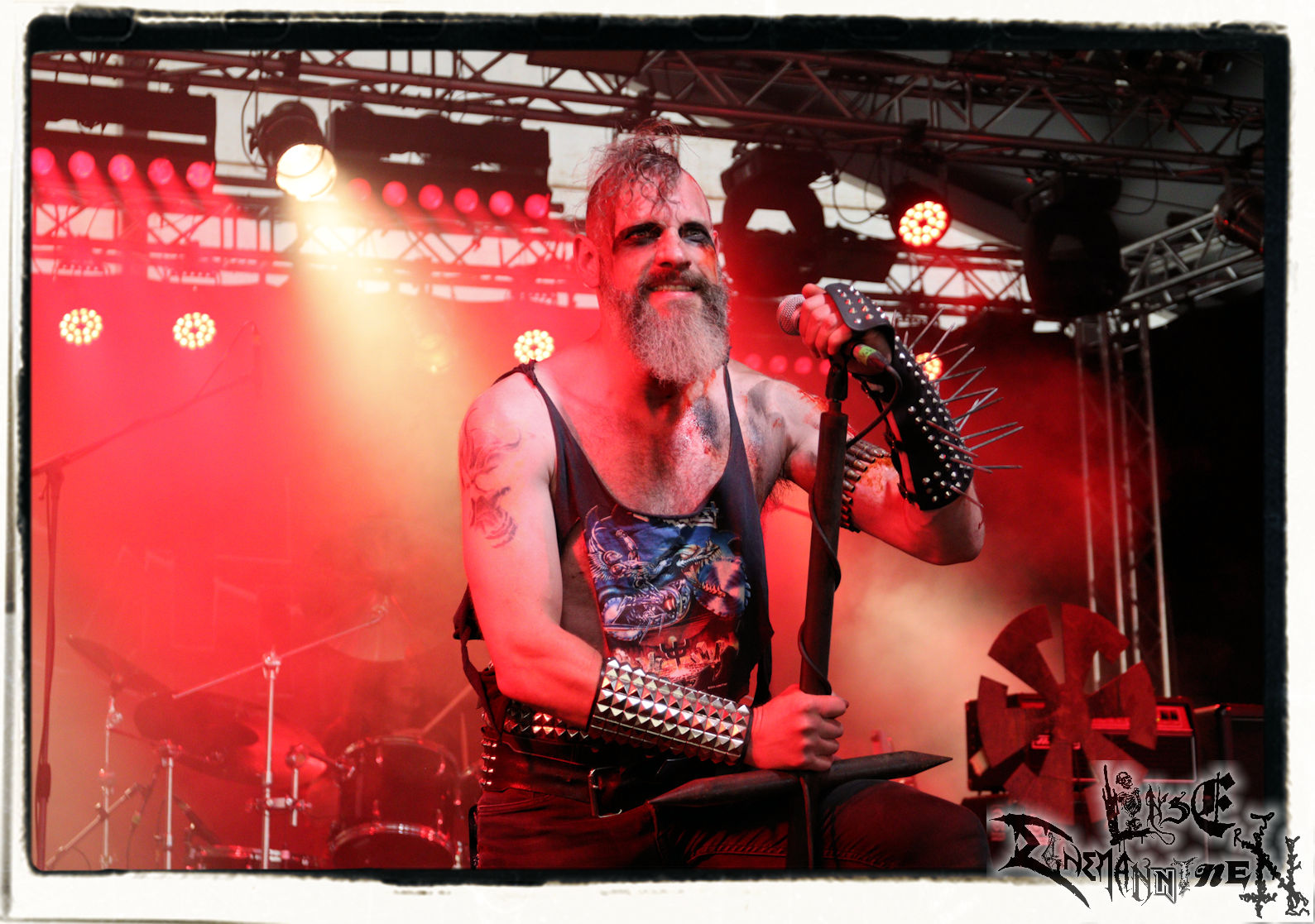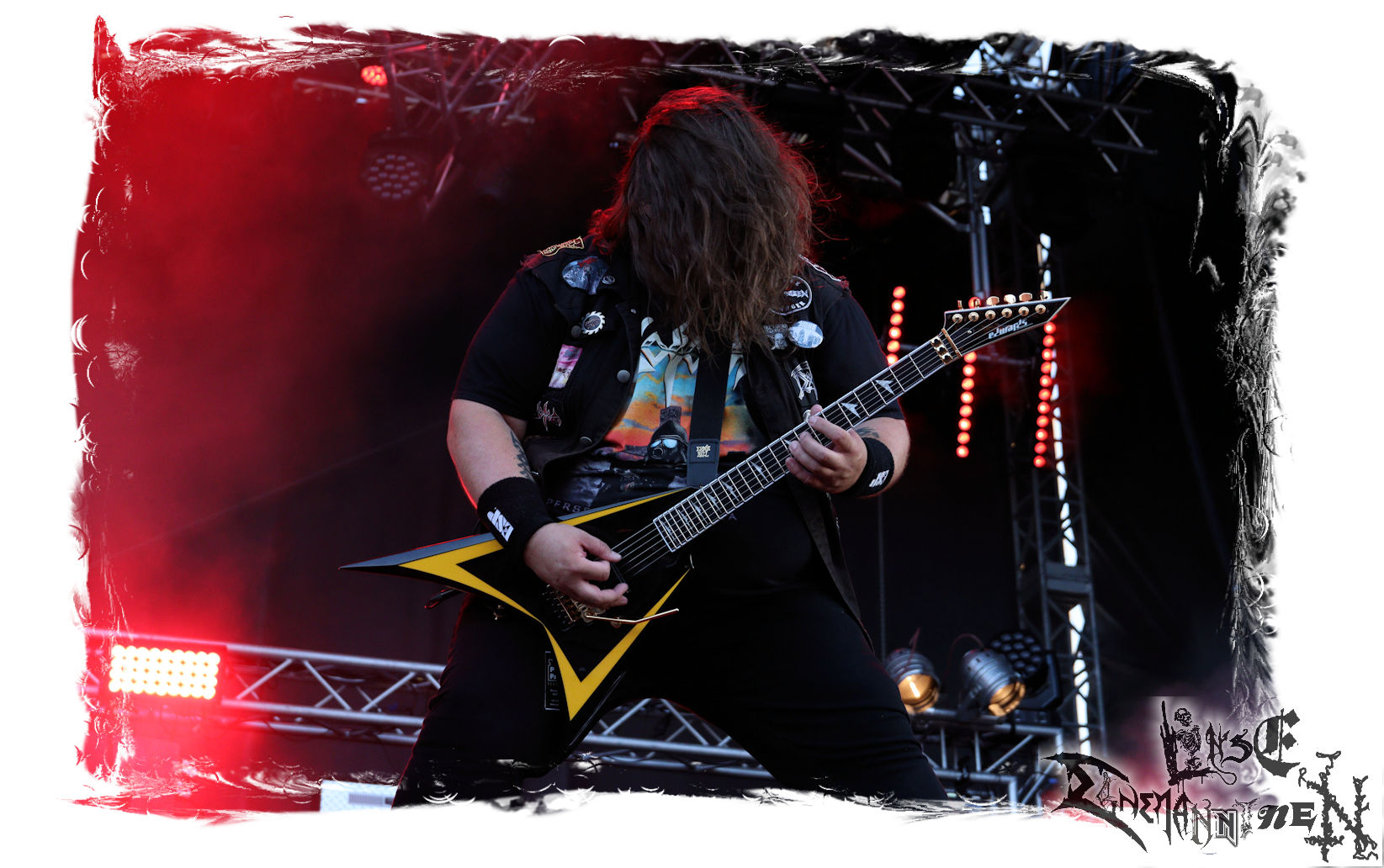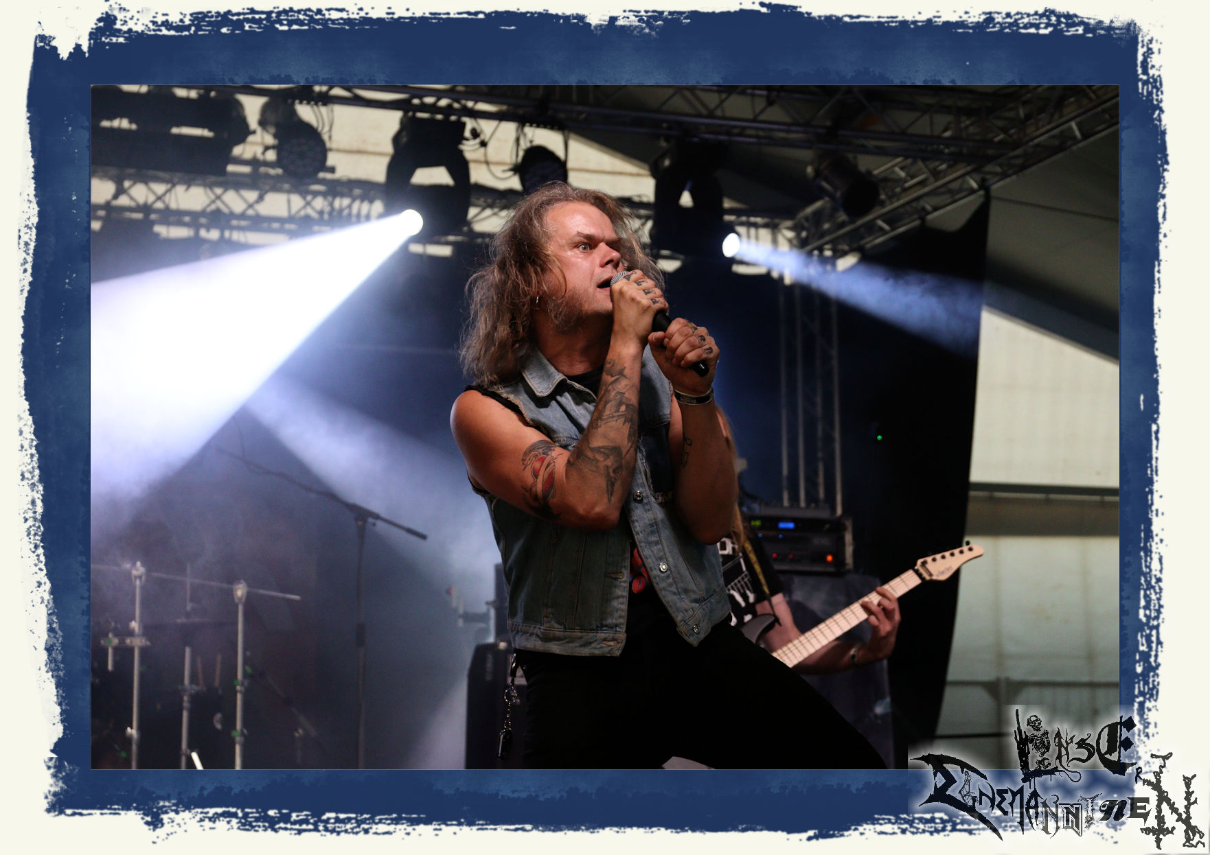 Mit EIS wird der Abend eingeläutet. Die Band aus dem Lupus Lounge – Stall ist wie geschaffen für das Zelt auf dem PARTY.SAN METAL OPEN AIR und beweist eindrucksvoll, wie man Atmosphäre mit mitreißenden Black Metal – Songs kombiniert. Bandkopf Alboin ist gleichzeitig Fan und Vollblutmusiker, der mit den Schwarzmetall-Größen der Neunziger aufgewachsen ist, wobei seine Musik sowohl von diesen, als auch von seiner Bewunderung gegenüber prägenden heimischen Acts wie Helrunar oder auch dem Wirken von Schwadorf mit Sun Of The Sleepless beeinflusst ist. Auch macht er keinen Hehl daraus, dass ihm die Einladung nach Schlotheim mit seiner Band als "Spätberufenem" sehr viel bedeutet. Und diese Haltung schwingt in diesem Konzert mit. Egal, ob Songs vom 2005er-Album "Galeere" ("Durch lichtlose Tiefen", seinerzeit noch unter dem Bandvorgänger Geist veröffentlicht (aus namensrechtlichen Gründen musste man sich danach in Eis umbenennen), vom bisher jüngsten Album "Bannstein" oder vom Klassiker "Wetterkreuz" (2012), der heuer auch schon zehn Jahre auf dem Buckel hat, gespielt werden. Eis zünden ein kleines Highlight, das mir noch lange in Erinnerung bleiben und mich animiert, mir die Scheiben mal wieder zu Gemüte zu führen. Danke!(JD)