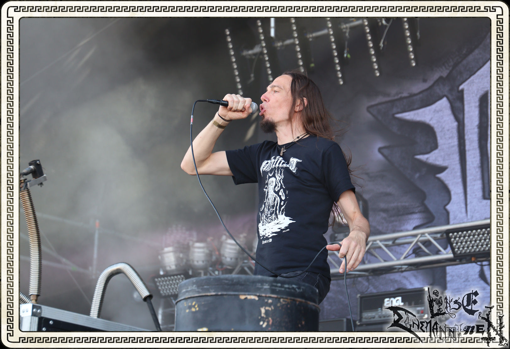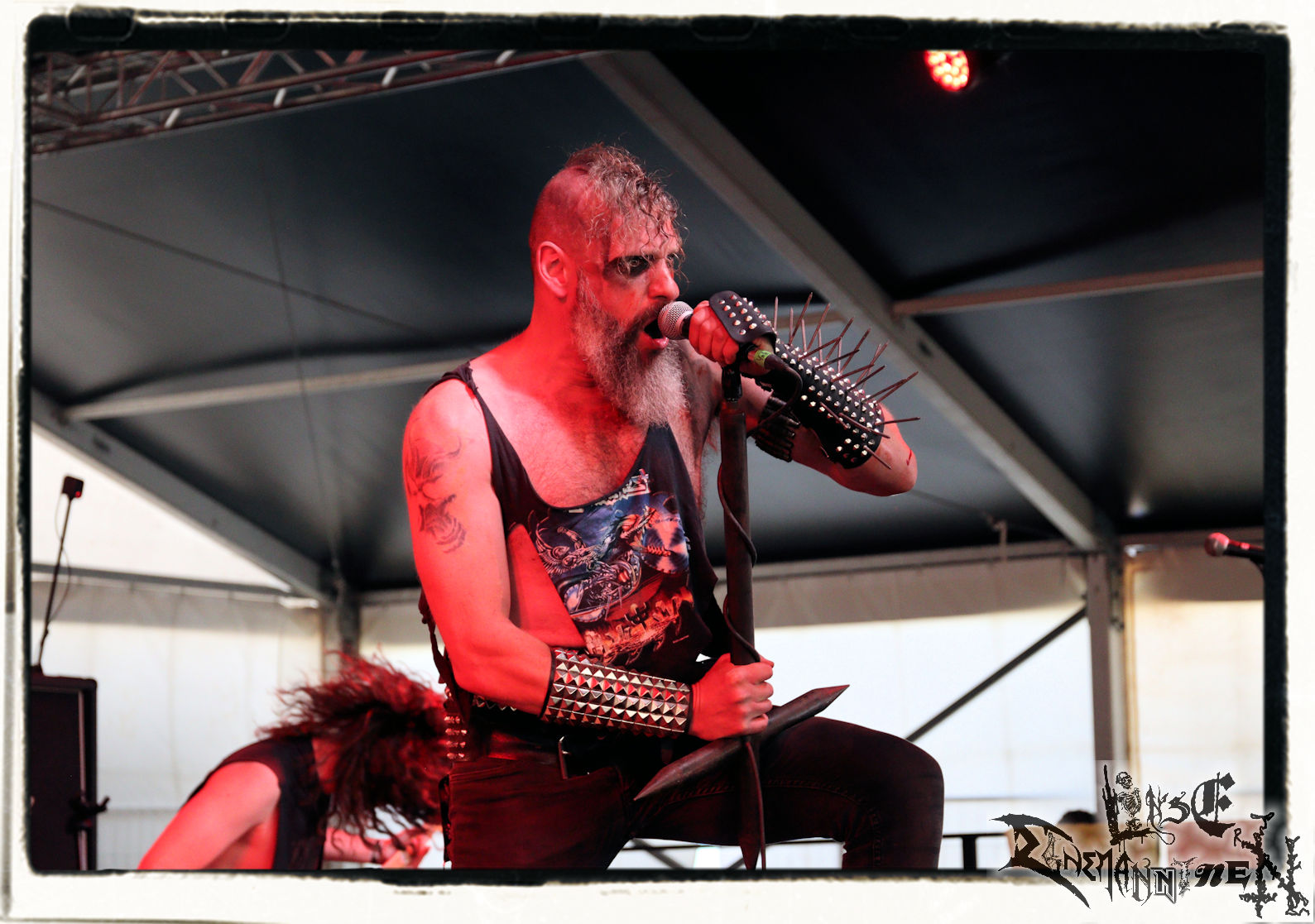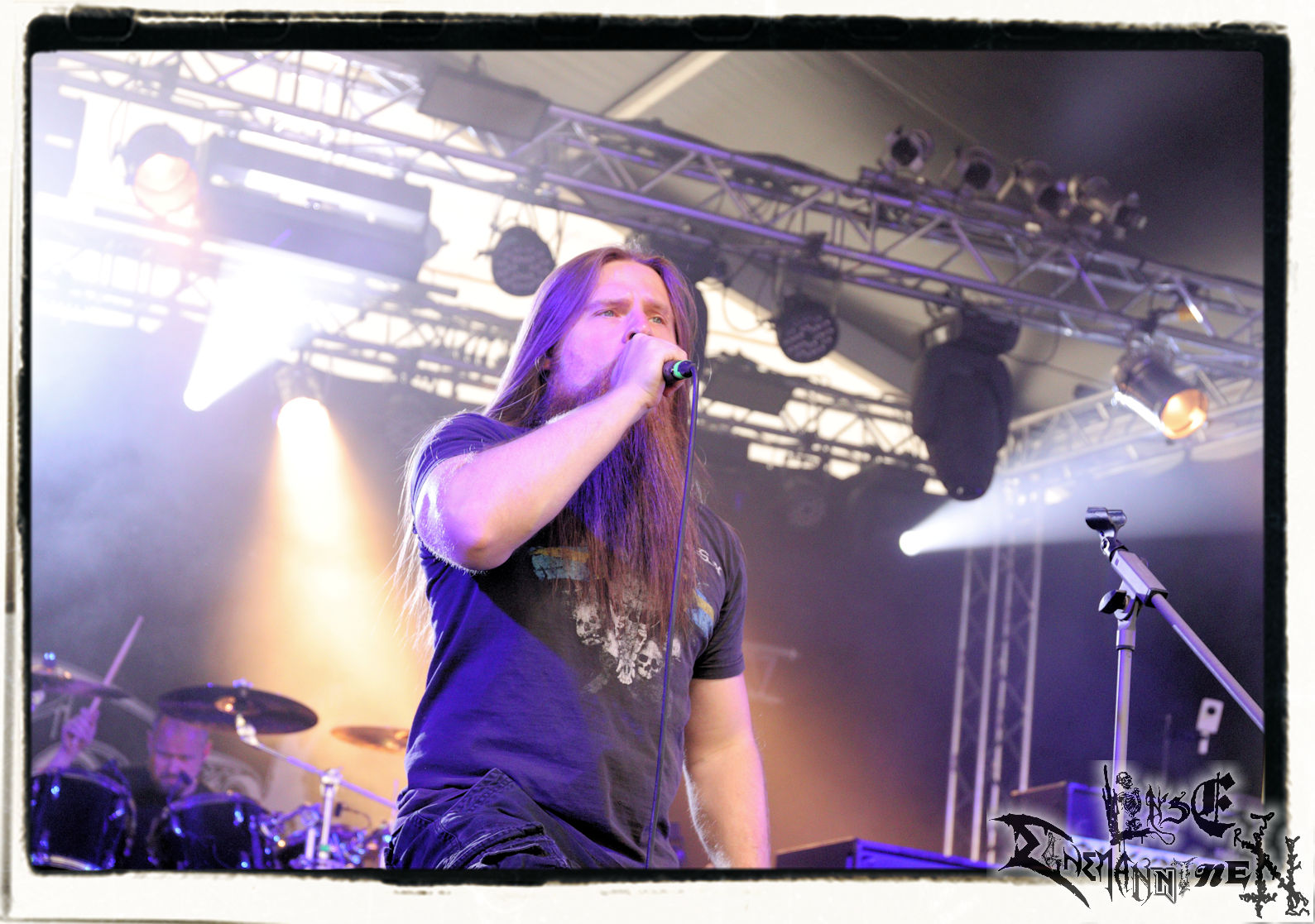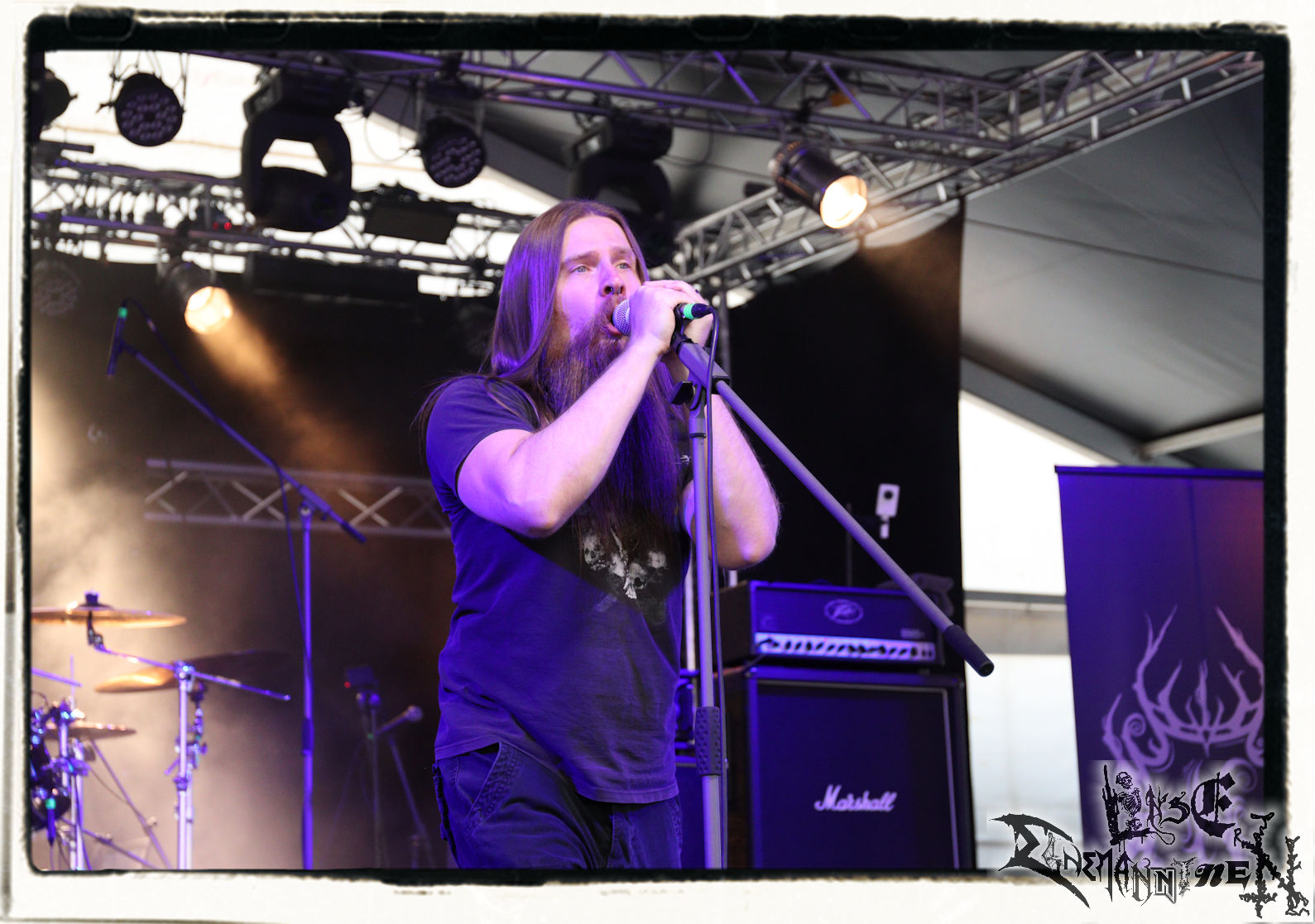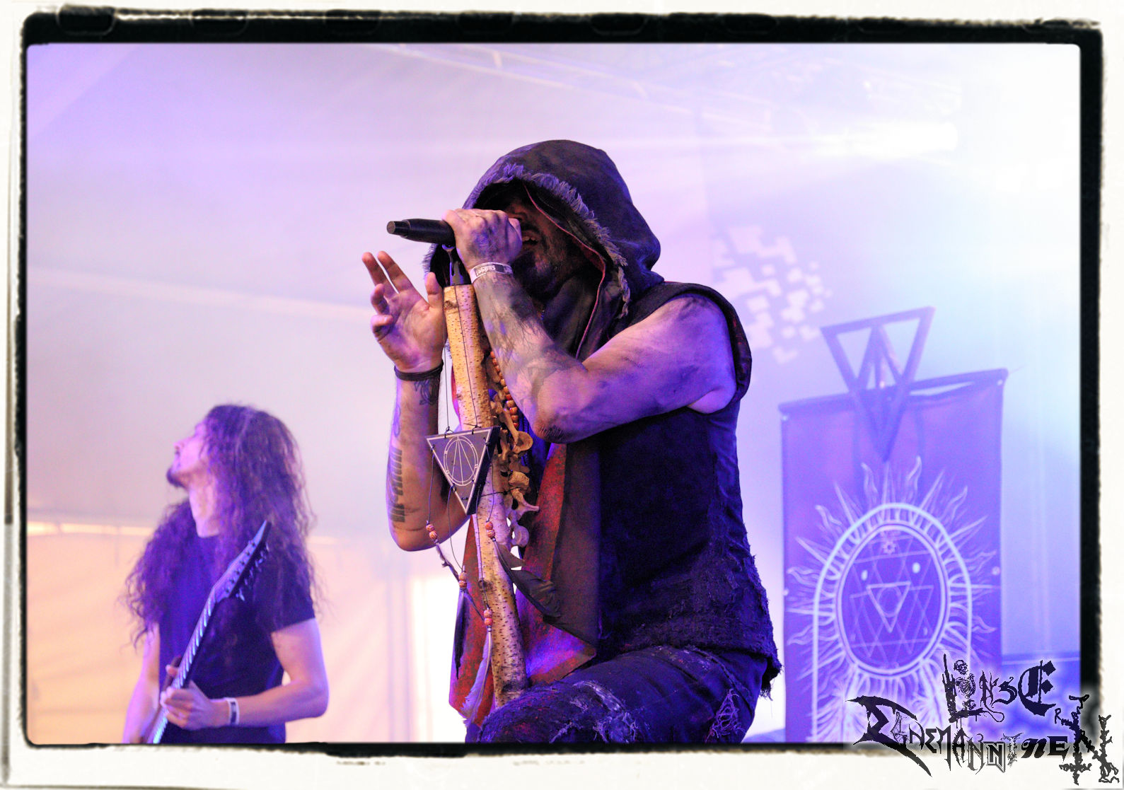 Mit EIS wird der Abend eingeläutet. Die Band aus dem Lupus Lounge – Stall ist wie geschaffen für das Zelt auf dem PARTY.SAN METAL OPEN AIR und beweist eindrucksvoll, wie man Atmosphäre mit mitreißenden Black Metal – Songs kombiniert. Bandkopf Alboin ist gleichzeitig Fan und Vollblutmusiker, der mit den Schwarzmetall-Größen der Neunziger aufgewachsen ist, wobei seine Musik sowohl von diesen, als auch von seiner Bewunderung gegenüber prägenden heimischen Acts wie Helrunar oder auch dem Wirken von Schwadorf mit Sun Of The Sleepless beeinflusst ist. Auch macht er keinen Hehl daraus, dass ihm die Einladung nach Schlotheim mit seiner Band als "Spätberufenem" sehr viel bedeutet. Und diese Haltung schwingt in diesem Konzert mit. Egal, ob Songs vom 2005er-Album "Galeere" ("Durch lichtlose Tiefen", seinerzeit noch unter dem Bandvorgänger Geist veröffentlicht (aus namensrechtlichen Gründen musste man sich danach in Eis umbenennen), vom bisher jüngsten Album "Bannstein" oder vom Klassiker "Wetterkreuz" (2012), der heuer auch schon zehn Jahre auf dem Buckel hat, gespielt werden. Eis zünden ein kleines Highlight, das mir noch lange in Erinnerung bleiben und mich animiert, mir die Scheiben mal wieder zu Gemüte zu führen. Danke!(JD)